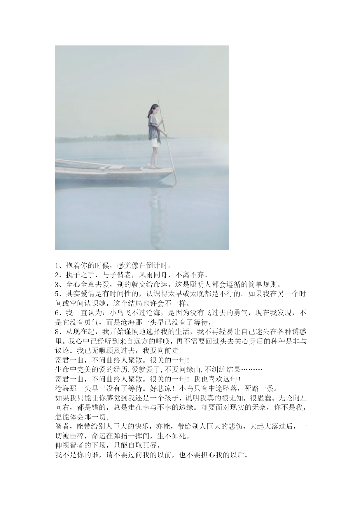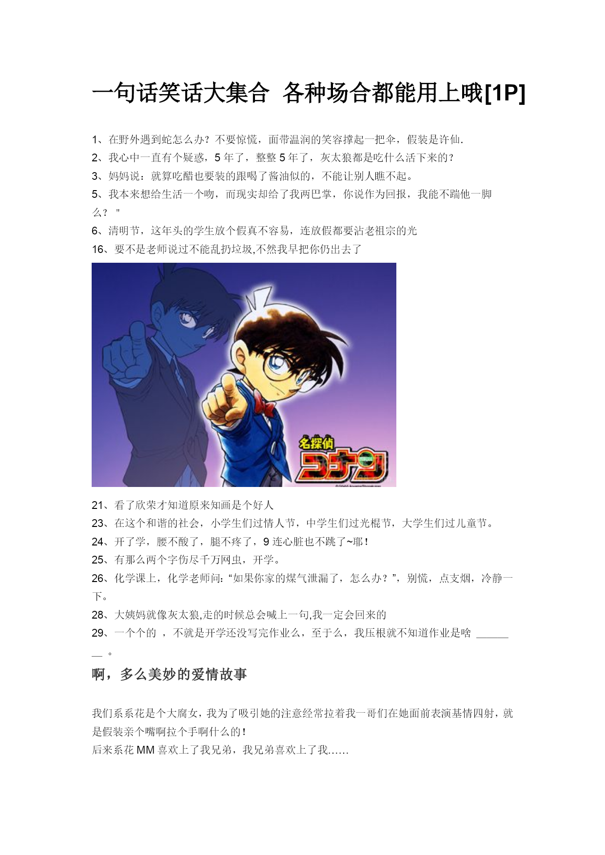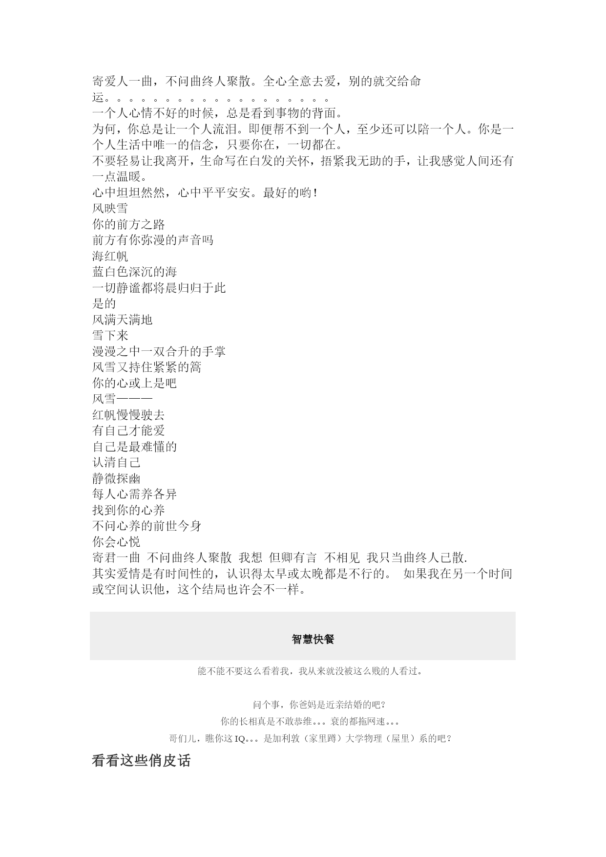2、一次数学晨练,全班都没做完。数学老师面露疑惑的说:我昨天晚上用广告时间就做完了,你们的速度也太慢了。有一同学当场不服,大叫道:老师看的是湖南台的广告吧!全班笑倒。4、为什么不把”你有男朋友吗?”直接说”我想追你”为什么不把”你为什么还没有回家”直接说”我担心你”为什么不把”随便你好了!”直接说”为什么你不站在我角度想一想”为什么不把”你以为我想的吗!”直接说”还不是因为我爱你”为什么不把”你会不会离开我”直接说”我离不开你”。34、一天一女友对其男友说:“你要是象爱足球一样爱我就好了。”男友立即回答:“那不行,我可每星期踢烂一个。”6、如果有个男生在球场上突然有几秒技艺大增,那真的不是他人品爆发。而是他偷瞄到了球场旁边,经过了他喜欢的那个女生。7、今天在女友家吃饭,一大家子人都在教育女友吃得太少盲目追求身材。我其实是很得意的,但是我为了体现自认为相比同龄人与众不同的成熟与稳重,抽风似的来了句:是要多吃点,太瘦了不舒服!满桌人沉默了至少3分钟!6.想完全了解一个男人,最好别做他的恋人,而做他的朋友。49.试金可以用火,试女人可以用金,试男人可以用女人。55.美丽让男人停下,智慧让男人留下。HYPERLINK"http://www.kl688.com/xiaohua/86067.htm"\t"_blank"老问题新回答新交一女友问我:“我和你妈掉水里了,你先救谁?”我说:“我让我妈救你,她小时候能在长江两岸游两个来回。”女友有些不高兴,说:“你为什么不下来救我?”我说:“我要是下来了,你就没救了,因为我不会游泳,我妈肯定先救我。”HYPERLINK"http://www.kl688.com/xiaohua/87370.htm"\t"_blank"你认为他会在家吗王教授按了三下门铃,房门开了,门口站着个10岁左右的小男孩。“小孩子,你爸爸亨利教授在家吗?”小男孩不以为然地看着王教授,取下叼在嘴边的香烟,用手指轻轻弹弹烟灰,接着又猛吸一口,皮笑肉不笑地答:“你认为他会在家吗?”7、虽然你身上喷了古龙水,但我还是能隐约闻到一股人渣味儿。12.一念是地狱,一念是天堂,天堂与地狱的距离就在一念之间。15.柏拉图说:如果,不幸福,如果,不快乐,那就放手吧;如果,舍不得、放不下,那就痛苦吧。18.我希望以后可以不用送你回家,而是一起回我们自己的家。2.距离产生的不是美,是小三。17.不要对我太好,让我分不清你是爱情还是友情。18.爱你,很久了!等你,也很久了!现在,我要离开你了,比很久很久还要久。19.女人,长得漂亮是优势,活得漂亮是本事。21.我年轻,需要你指点,但不需要你指指点点。27.这么不要脸,这么没心没肺,你的体重应该会很轻吧。39.子曾经曰过:不要把我对你的容忍当成你不要脸的资本!1、抱着你的时候,感觉像在倒计时。2、执子之手,与子偕老,风雨同舟,不离不弃。3、全心全意去爱,别的就交给命运,这是聪明人都会遵循的简单规则。5、其实爱情是有时间性的,认识得太早或太晚都是不行的。如果我在另一个时间或空间认识她,这个结局也许会不一样。6、我一直认为:小鸟飞不过沧海,是因为没有飞过去的勇气,现在我发现,不是它没有勇气,而是沧海那一头早已没有了等待。8、从现在起,我开始谨慎地选择我的生活,我不再轻易让自己迷失在各种诱惑里。我心中已经听到来自远方的呼唤,再不需要回过头去关心身后的种种是非与议论。我已无暇顾及过去,我要向前走。寄君一曲,不问曲终人聚散。很美的一句!生命中完美的爱的经历,爱就爱了,不要问缘由,不纠缠结果………寄君一曲,不问曲终人聚散。很美的一句!我也喜欢这句!沧海那一头早已没有了等待。好悲凉!小鸟只有中途坠落,死路一条。如果我只能让你感觉到我还是一个孩子,说明我真的很无知,很愚蠢。无论向左向右,都是错的,总是走在幸与不幸的边缘。却要面对现实的无奈,你不是我,怎能体会那一切。智者,能带给别人巨大的快乐,亦能,带给别人巨大的悲伤,大起大落过后,一切被击碎,命运在弹指一挥间,生不如死。仰视智者的下场,只能自取其辱。我不是你的谁,请不要过问我的以前,也不要担心我的以后。寄爱人一曲,不问曲终人聚散。全心全意去爱,别的就交给命运。。。。。。。。。。。。。。。。。。。一个人心情不好的时候,总是看到事物的背面。为何,你总是让一个人流泪。即便帮不到一个人,至少还可以陪一个人。你是一个人生活中唯一的信念,只要你在,一切都在。不要轻易让我离开,生命写在白发的关怀,捂紧我无助的手,让我感觉人间还有一点温暖。心中坦坦然然,心中平平安安。最好的哟!风映雪你的前方之路前方有你弥漫的声音吗海红帆蓝白色深沉的海一切静谧都将晨归归于此是的风满天满地雪下来漫漫之中一双合升的手掌风雪又持住紧紧的篙你
