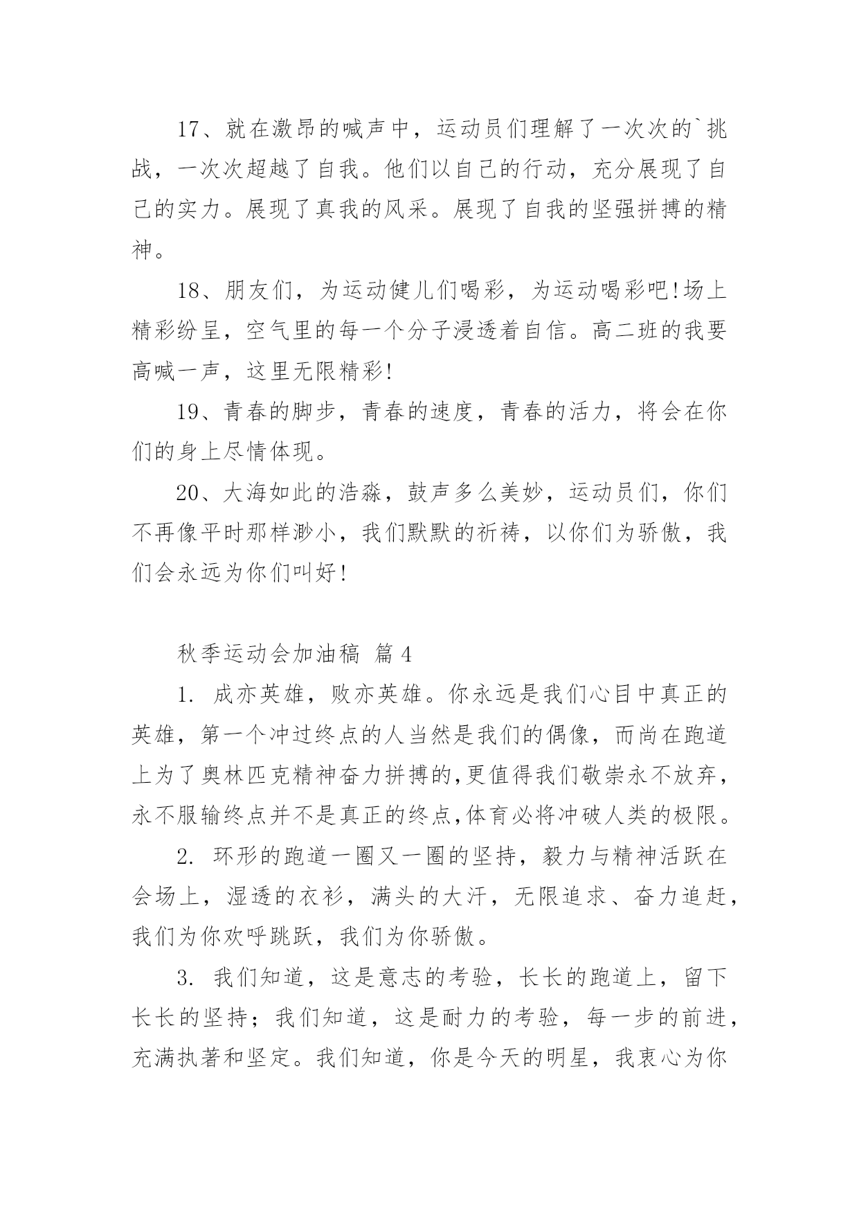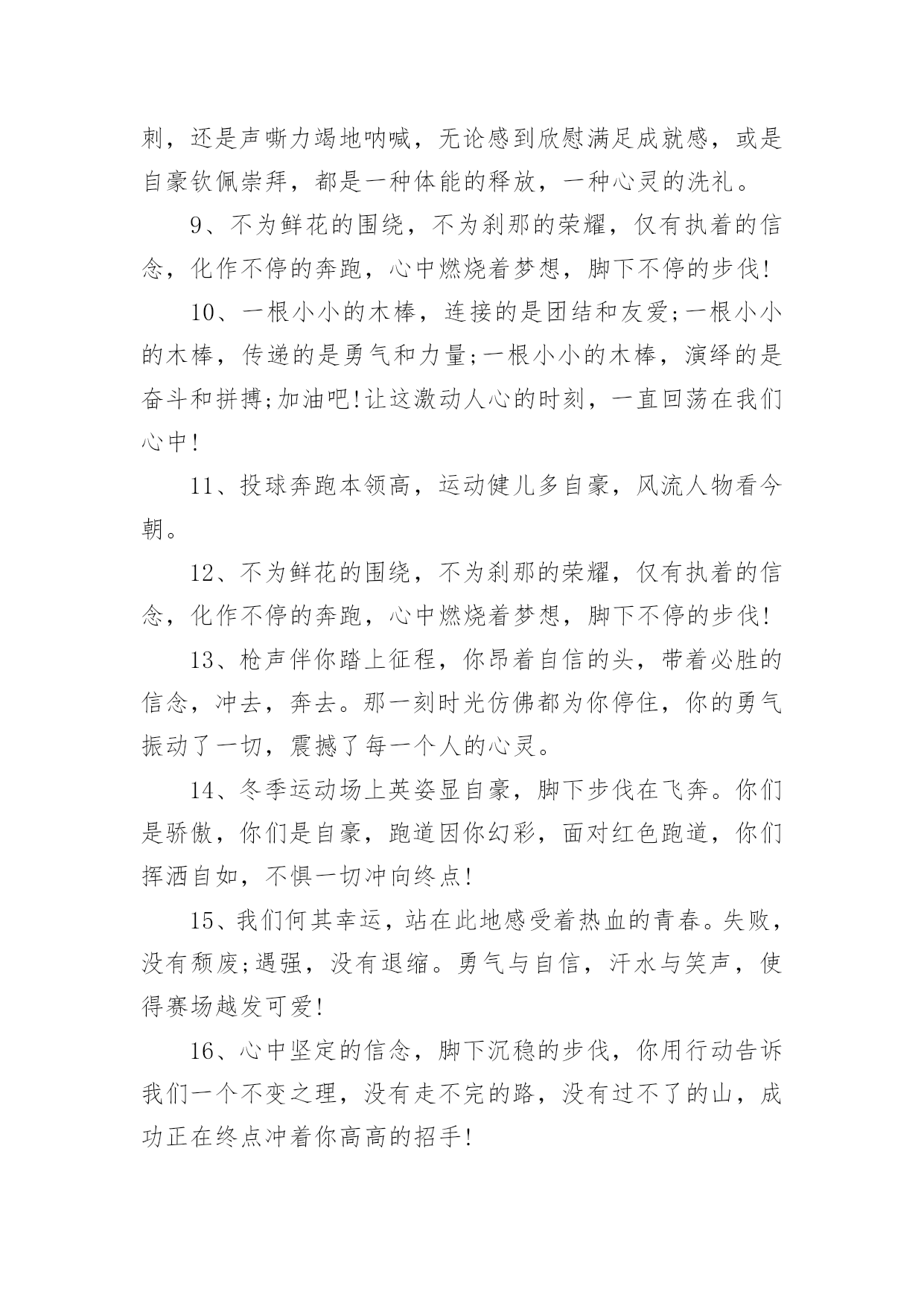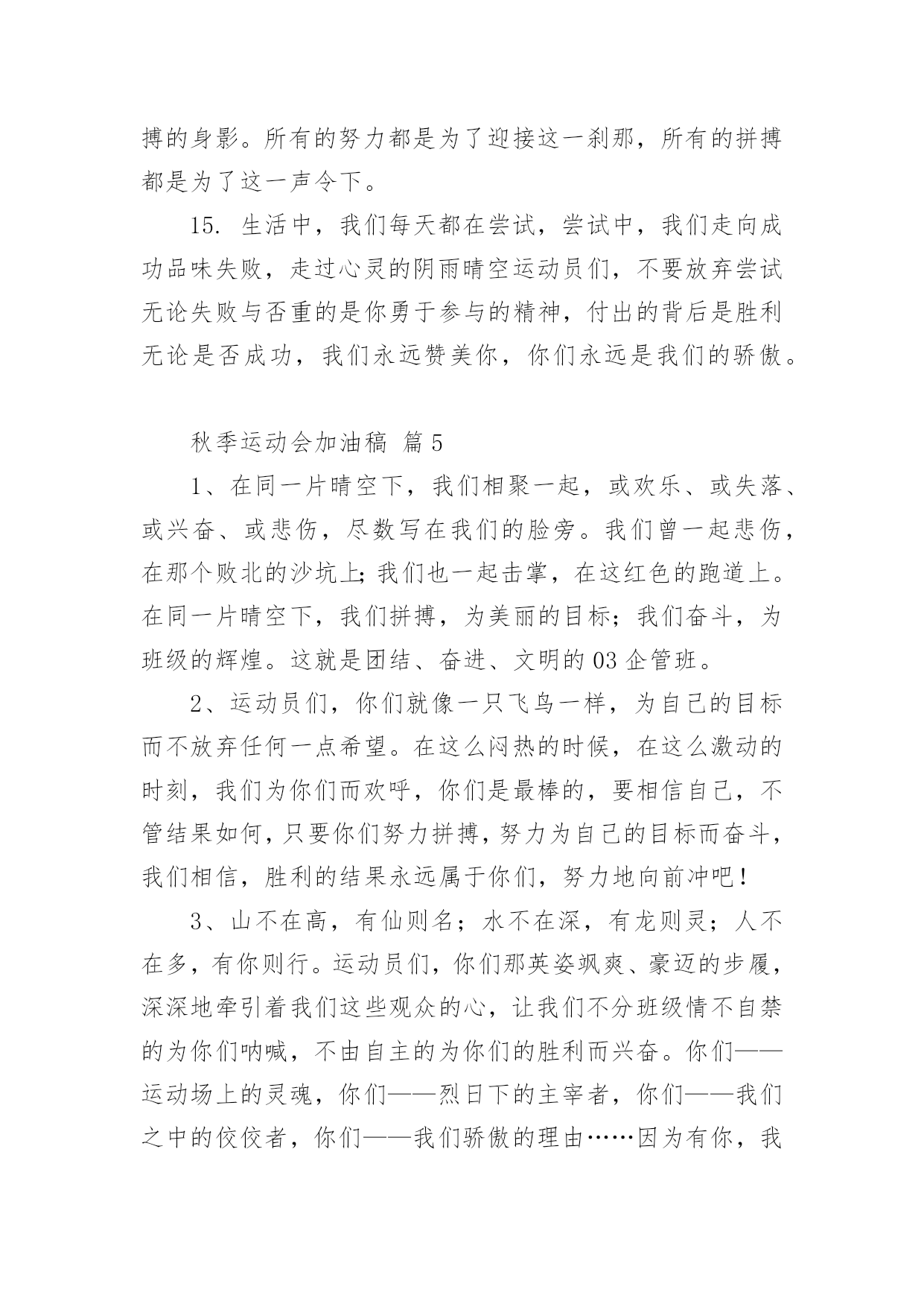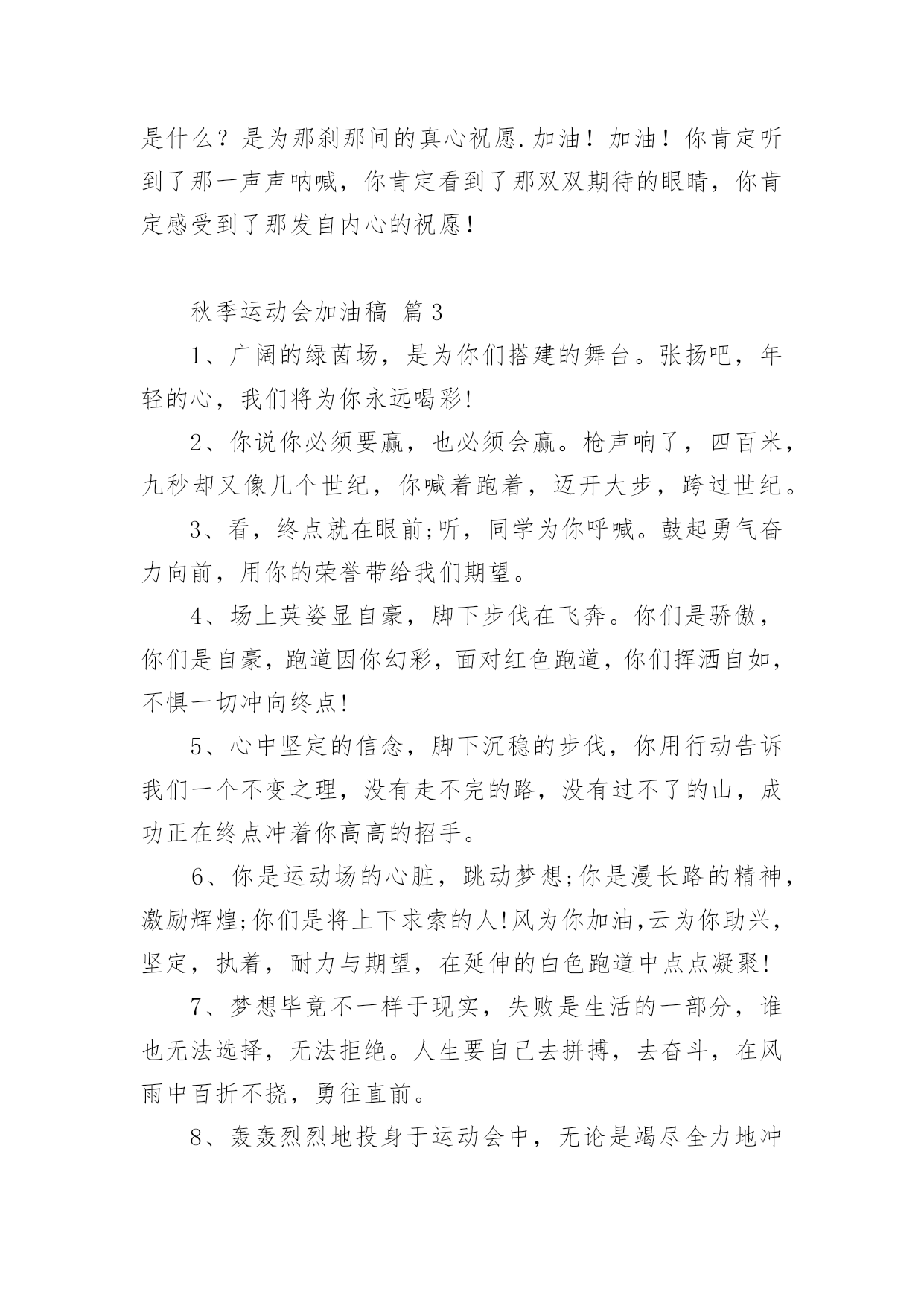 秋季运动会加油稿【必备】秋季运动会加油稿随着社会不断地进步,能够利用到加油稿的场合越来越多,加油稿是鼓励激励对方的文稿。那么问题来了,到底应如何写好一份加油稿呢?下面是小编精心整理的秋季运动会加油稿,仅供参考,大家一起来看看吧。秋季运动会加油稿篇1红色的道路上,有两个弧长的圆圈,绿色的田野上,有你的光辉,画出两个生命轨迹的圆圈,赢得无数发自内心的惊喜。带着不一样的.人生旋律,奏出不平凡的歌!你的表演场,让你自由遨游!你的起飞场,伸展你的翅膀!如果说力量来源于呼吸,呼吸来源于生命,生命的本质诠释了力量的永恒,呼吸的瞬间诠释了生命的价值,那么力量的消退在这一刻就能得到最好的诠释。把这份美好坚持到最后,即使失败,也无怨无悔,永远留在心底,即使被深深锁住,也永不褪色。这一切会像彩虹一样,在我心中留下一个美丽而永恒的瞬间。秋季运动会加油稿篇21.不为掌声的注释不为刻意的征服不为失败的痛苦只有辛勤的汗水化作成功的脚步.2.汗水,疲惫,不止一刻,一圈一圈的跑道似乎永无止尽.但是,前方有你的梦想,你坚持,你执着,掌声为你响起,呐喊为你吼,那是喝彩,为你,加油,胜利,鲜花,属于你.3.挫折是人生道路上的碎石,常会绊的你头破血流,有的人爬起来,拍拍衣服说声不痛,而有的人爬起来,却从此惧怕走路,胜利永远向着爬起来的人,爬不起来的人,总也摆脱不了失败.4.赞百米运动员:百米跑道虽不长,运动健儿志高扬.磨拳擦掌跃欲试,分秒必争勇夺魁.巾帼岂将须眉让.古有木兰冲杀场,今有跑百米.立志创新校记录,勇夺信管第一金.5.萧瑟的秋风,挡不住你们破竹的锐气,广阔的绿茵场,是为你们搭建的舞台.张扬吧,年轻的心,我们将为你永远喝彩!6.泰戈尔在诗中说,天空没有翅膀的影子,但我已飞过;艾青对朋友说,也许有人到达不了彼岸,但我们共同拥有大海.也许你们没有显赫的成绩,但运动场上留下了你们的足迹.也许你们没有奖品,但我们心中留下了你们拼搏的身影.所有的努力都是为了迎接这一刹那,所有的拼搏都是为了这一声令下.7.人生要自己去拼搏,去奋斗,在风雨中百折不饶勇往直前.流泪不是失落,徘徊不是迷惑,成功属于那些战胜失败,坚持不懈,勇于追帮求梦想的人,加油吧!运动健儿们!8.这是速度与毅力的接力,这是期望与祈盼的接力,时间在这里凝固,几分几秒也变得如此漫长.千百双眼睛注视着你那矫健的身影,近了,近了,你可曾听到那山呼海啸般的呐喊声,加油,你们是最棒的.9.挑战就在眼前,在运动会开幕的前一天,谨代表全体支持体育运动的同学和老师们对全体为运动会而付出的同学们道一声:你们辛苦了!10.拼搏者,你是赛场上最亮的点.在你的眼中,不在乎胜利的欢乐和失败的眼泪,完全只是为了展示生命跳跃的节拍.拼搏者,你是生命乐章中最响的音符.在你的心中,只有不停拼搏的信念,用自己坚实的步伐去迈开人生新的旅程.场上的拼搏者,你是我们永远的骄傲!11.虽然你我都已尽力,最终事实却是残酷的,毕竟冠军只有一个,然而我们就这样心灰意冷了不!决不!我们会再次扬起风帆,向着终点冲刺,我们坚信,胜利会再次向我们招手的.12.心中坚定的信念,脚下沉稳的步伐,你用行动告诉我们一个不变之理,没有走不完的路,没有过不了的山,成功正在终点冲着你高高的招手,用你那顽强的意志去努力,去迎接终点的鲜花与掌声,相信成功一定是属于你!13.借着奥运的东风迎着观众的喝彩,我们运动起来,奔跑在的跑道上,让我们共同努力,奔跑奔跑,冲向胜利的终点.14.一条跑道,要四个人去打造一个信念,要四个人去拼搏每次交接都是信任的传递每次交接都是永恒的支持前世的五百次回眸,才能够换来今天的相遇,冲吧!向着终点,向着个四个人的共同目标,前进!15.今天的你们英姿飒爽,今天的你们朝气蓬勃,今天的你们一马当先.相信自己,你是最棒的!不要放弃,不要气馁.成功永远属于你们.米运动员啊!加油啊.16.面对艰苦的'征程,你们毫不畏惧,接力棒在你们手中传递着集体的力量,听,我们在为你呐喊,你们诠释着奥运的精神,你们是我们心中的骄傲,深深的呼吸,等待你的是艰难的800米.相信胜利会属于你们,但在这征途上,需要你勇敢的心去面对.我们在为你加油,你是否听到了我们发自内心的呐喊,困难和胜利都在向你招手,去呀,不要犹豫,快去击败困难,快去夺取胜利,相信你会送给我们一个汗水浸湿的微笑.17.生活中,我们每天都在尝试尝试中,我们走向成功品味失败,走过心灵的阴雨晴空运动员们,不要放弃尝试无论失败与否重要的是你勇于参与的精神,付出的背后是胜利无论是否成功,我们永远赞美你,你们永远是我们的骄傲.18.不为掌声的诠释,不为刻意的征服,只有辛勤的汗水化作追求的脚步,心中坚定的信念,脚下你的汗水洒在跑道,浇灌着成功的花朵开放.你的欢笑飞扬在赛场,为班争光数你最棒.跑吧,追吧在这广阔的赛场上,你似骏马似离铉的箭