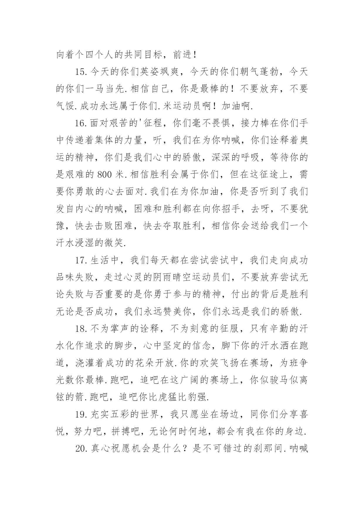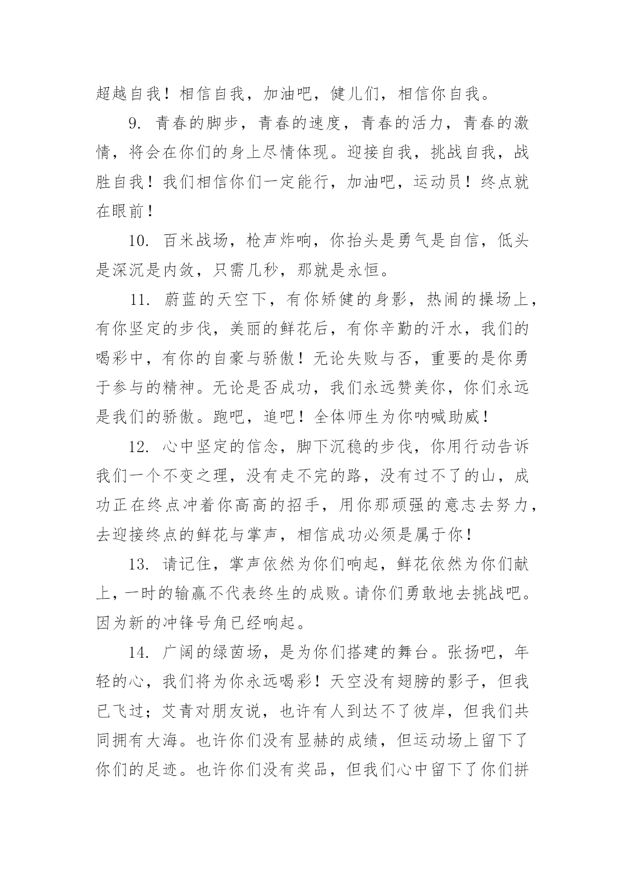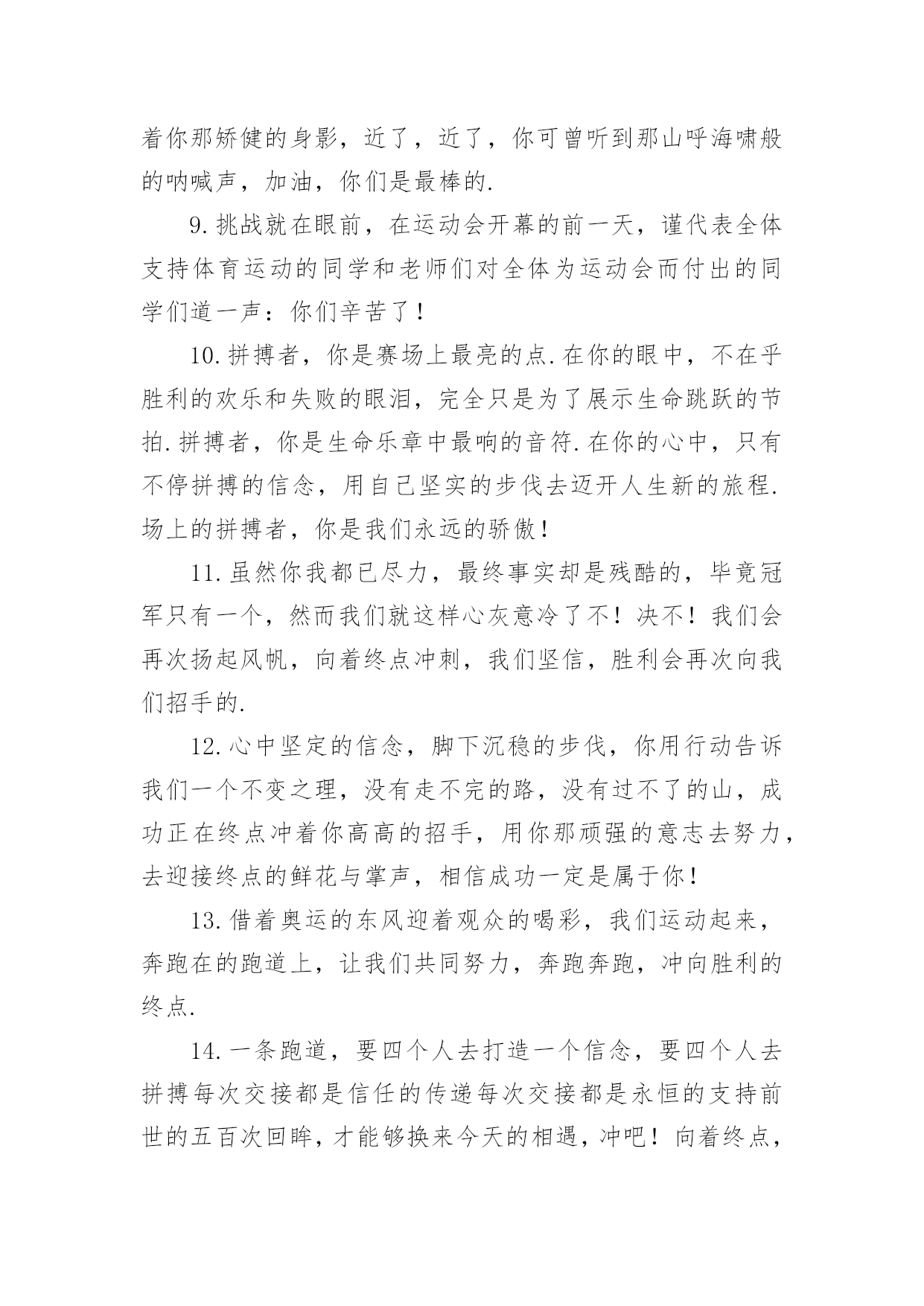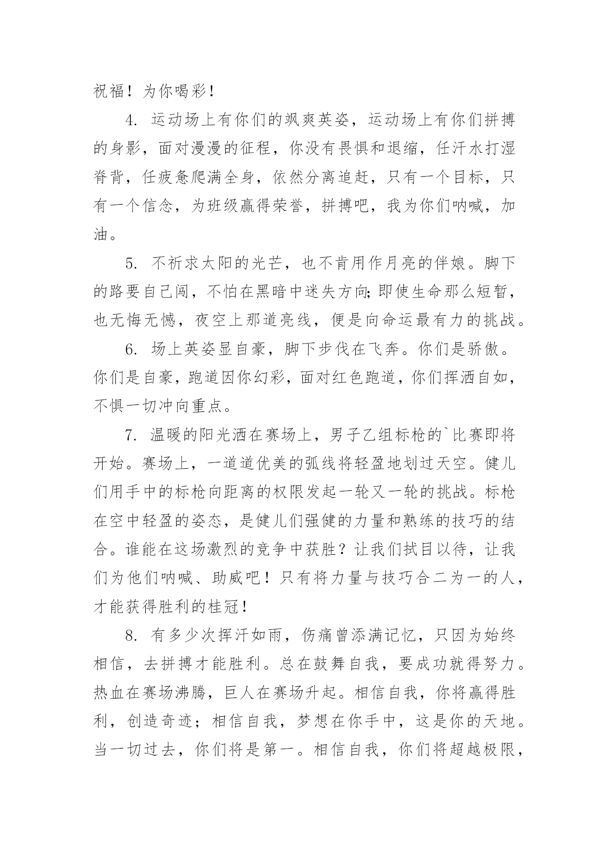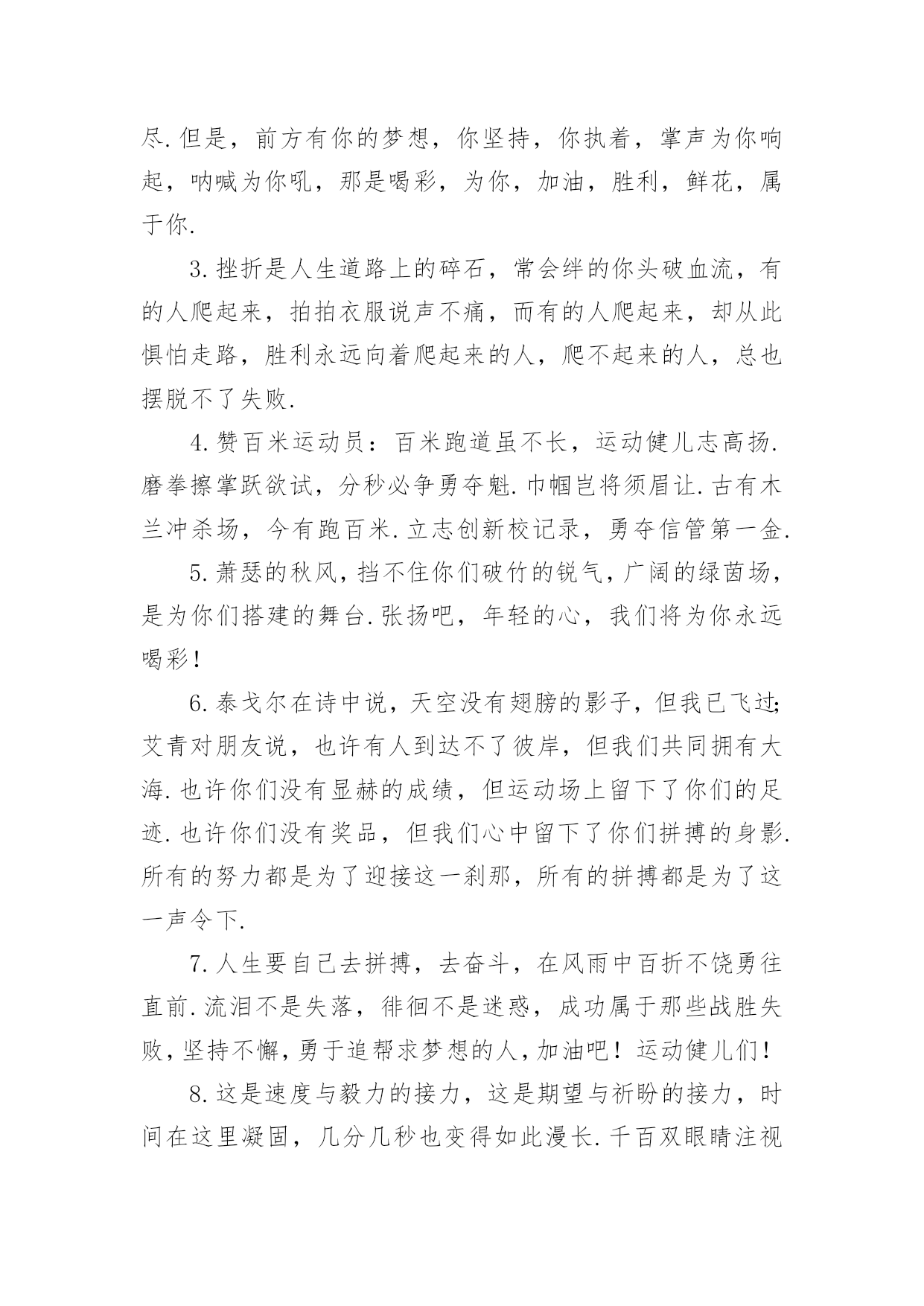 秋季运动会加油稿【必备】秋季运动会加油稿随着社会不断地进步,能够利用到加油稿的场合越来越多,加油稿是鼓励激励对方的文稿。那么问题来了,到底应如何写好一份加油稿呢?下面是小编精心整理的秋季运动会加油稿,仅供参考,大家一起来看看吧。秋季运动会加油稿篇1红色的道路上,有两个弧长的圆圈,绿色的田野上,有你的光辉,画出两个生命轨迹的圆圈,赢得无数发自内心的惊喜。带着不一样的.人生旋律,奏出不平凡的歌!你的表演场,让你自由遨游!你的起飞场,伸展你的翅膀!如果说力量来源于呼吸,呼吸来源于生命,生命的本质诠释了力量的永恒,呼吸的瞬间诠释了生命的价值,那么力量的消退在这一刻就能得到最好的诠释。把这份美好坚持到最后,即使失败,也无怨无悔,永远留在心底,即使被深深锁住,也永不褪色。这一切会像彩虹一样,在我心中留下一个美丽而永恒的瞬间。秋季运动会加油稿篇21.不为掌声的注释不为刻意的征服不为失败的痛苦只有辛勤的汗水化作成功的脚步.2.汗水,疲惫,不止一刻,一圈一圈的跑道似乎永无止尽.但是,前方有你的梦想,你坚持,你执着,掌声为你响起,呐喊为你吼,那是喝彩,为你,加油,胜利,鲜花,属于你.3.挫折是人生道路上的碎石,常会绊的你头破血流,有的人爬起来,拍拍衣服说声不痛,而有的人爬起来,却从此惧怕走路,胜利永远向着爬起来的人,爬不起来的人,总也摆脱不了失败.4.赞百米运动员:百米跑道虽不长,运动健儿志高扬.磨拳擦掌跃欲试,分秒必争勇夺魁.巾帼岂将须眉让.古有木兰冲杀场,今有跑百米.立志创新校记录,勇夺信管第一金.5.萧瑟的秋风,挡不住你们破竹的锐气,广阔的绿茵场,是为你们搭建的舞台.张扬吧,年轻的心,我们将为你永远喝彩!6.泰戈尔在诗中说,天空没有翅膀的影子,但我已飞过;艾青对朋友说,也许有人到达不了彼岸,但我们共同拥有大海.也许你们没有显赫的成绩,但运动场上留下了你们的足迹.也许你们没有奖品,但我们心中留下了你们拼搏的身影.所有的努力都是为了迎接这一刹那,所有的拼搏都是为了这一声令下.7.人生要自己去拼搏,去奋斗,在风雨中百折不饶勇往直前.流泪不是失落,徘徊不是迷惑,成功属于那些战胜失败,坚持不懈,勇于追帮求梦想的人,加油吧!运动健儿们!8.这是速度与毅力的接力,这是期望与祈盼的接力,时间在这里凝固,几分几秒也变得如此漫长.千百双眼睛注视着你那矫健的身影,近了,近了,你可曾听到那山呼海啸般的呐喊声,加油,你们是最棒的.9.挑战就在眼前,在运动会开幕的前一天,谨代表全体支持体育运动的同学和老师们对全体为运动会而付出的同学们道一声:你们辛苦了!10.拼搏者,你是赛场上最亮的点.在你的眼中,不在乎胜利的欢乐和失败的眼泪,完全只是为了展示生命跳跃的节拍.拼搏者,你是生命乐章中最响的音符.在你的心中,只有不停拼搏的信念,用自己坚实的步伐去迈开人生新的旅程.场上的拼搏者,你是我们永远的骄傲!11.虽然你我都已尽力,最终事实却是残酷的,毕竟冠军只有一个,然而我们就这样心灰意冷了不!决不!我们会再次扬起风帆,向着终点冲刺,我们坚信,胜利会再次向我们招手的.12.心中坚定的信念,脚下沉稳的步伐,你用行动告诉我们一个不变之理,没有走不完的路,没有过不了的山,成功正在终点冲着你高高的招手,用你那顽强的意志去努力,去迎接终点的鲜花与掌声,相信成功一定是属于你!13.借着奥运的东风迎着观众的喝彩,我们运动起来,奔跑在的跑道上,让我们共同努力,奔跑奔跑,冲向胜利的终点.14.一条跑道,要四个人去打造一个信念,要四个人去拼搏每次交接都是信任的传递每次交接都是永恒的支持前世的五百次回眸,才能够换来今天的相遇,冲吧!向着终点,向着个四个人的共同目标,前进!15.今天的你们英姿飒爽,今天的你们朝气蓬勃,今天的你们一马当先.相信自己,你是最棒的!不要放弃,不要气馁.成功永远属于你们.米运动员啊!加油啊.16.面对艰苦的'征程,你们毫不畏惧,接力棒在你们手中传递着集体的力量,听,我们在为你呐喊,你们诠释着奥运的精神,你们是我们心中的骄傲,深深的呼吸,等待你的是艰难的800米.相信胜利会属于你们,但在这征途上,需要你勇敢的心去面对.我们在为你加油,你是否听到了我们发自内心的呐喊,困难和胜利都在向你招手,去呀,不要犹豫,快去击败困难,快去夺取胜利,相信你会送给我们一个汗水浸湿的微笑.17.生活中,我们每天都在尝试尝试中,我们走向成功品味失败,走过心灵的阴雨晴空运动员们,不要放弃尝试无论失败与否重要的是你勇于参与的精神,付出的背后是胜利无论是否成功,我们永远赞美你,你们永远是我们的骄傲.18.不为掌声的诠释,不为刻意的征服,只有辛勤的汗水化作追求的脚步,心中坚定的信念,脚下你的汗水洒在跑道,浇灌着成功的花朵开放.你的欢笑飞扬在赛场,为班争光数你最棒.跑吧,追吧在这广阔的赛场上,你似骏马似离铉的箭