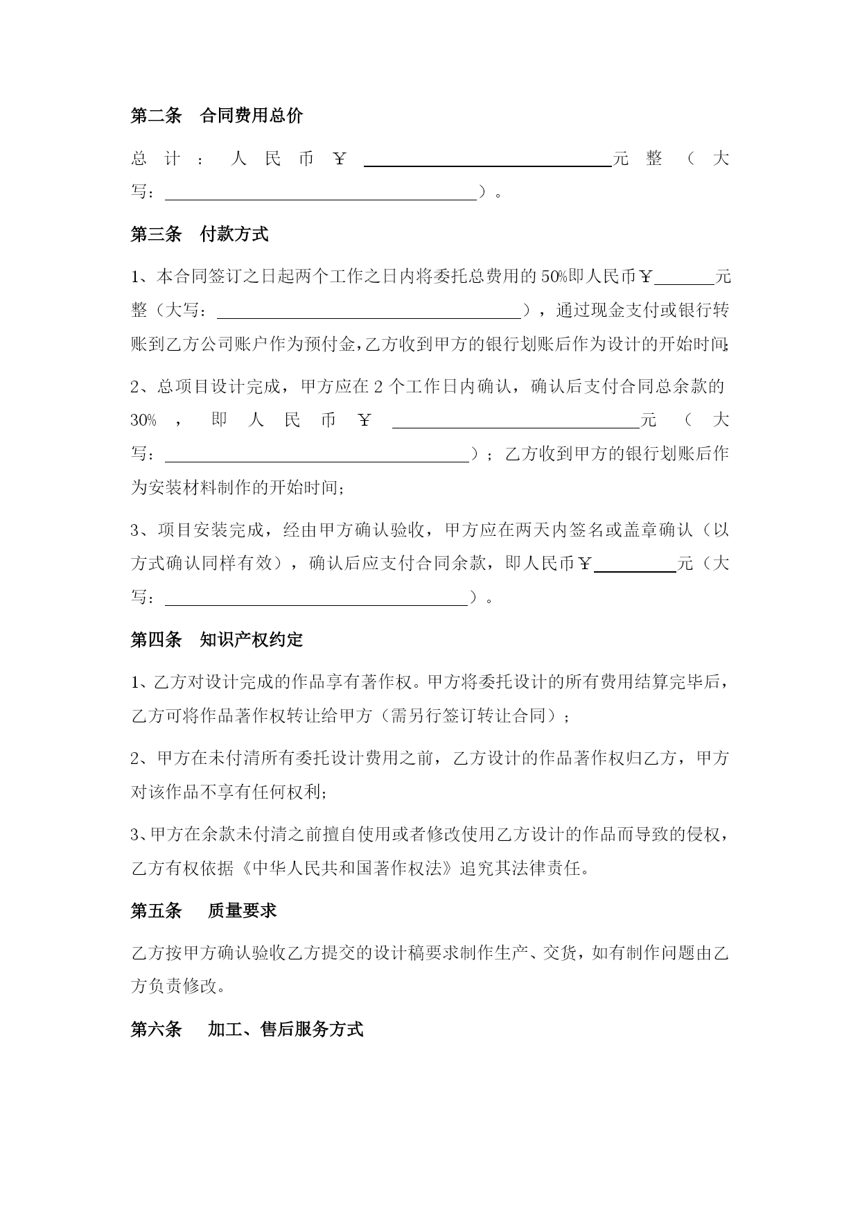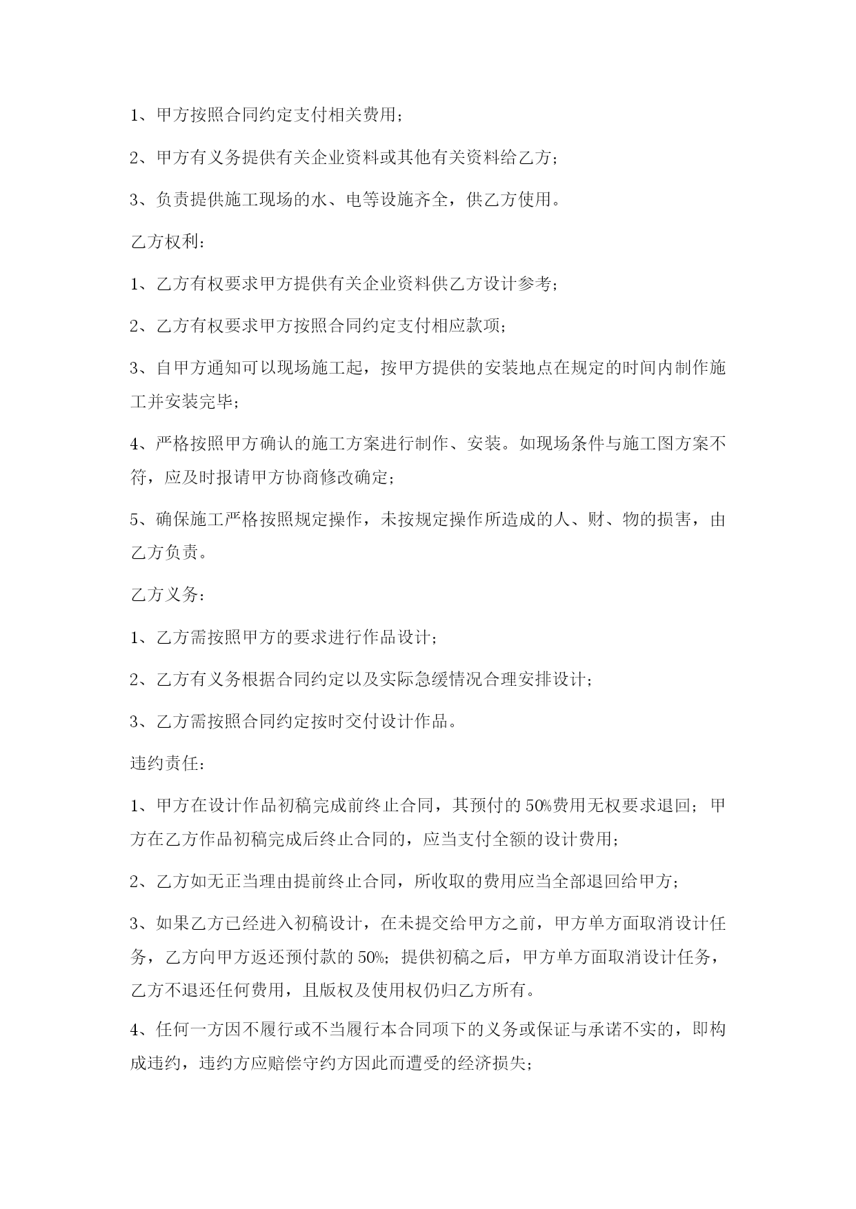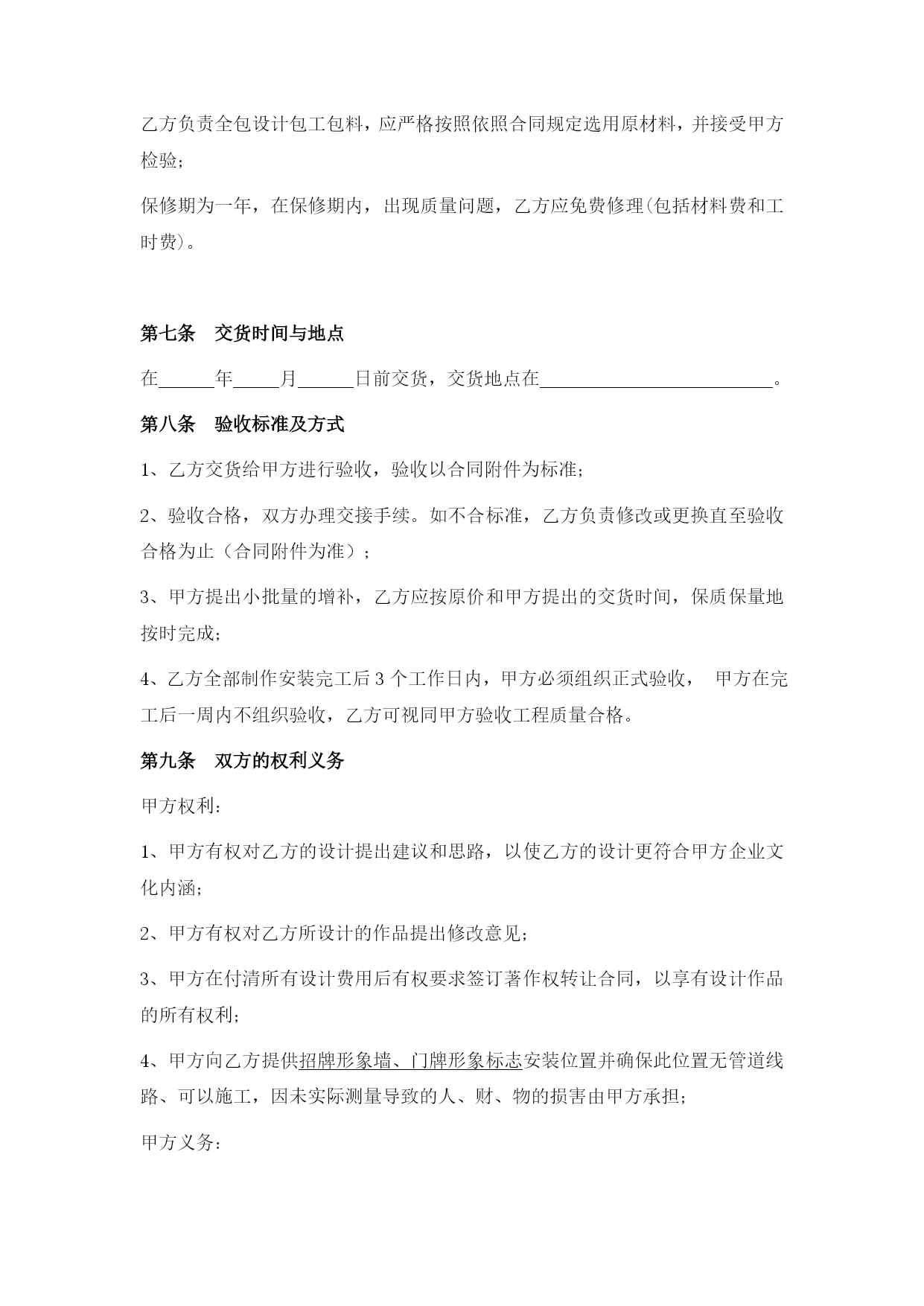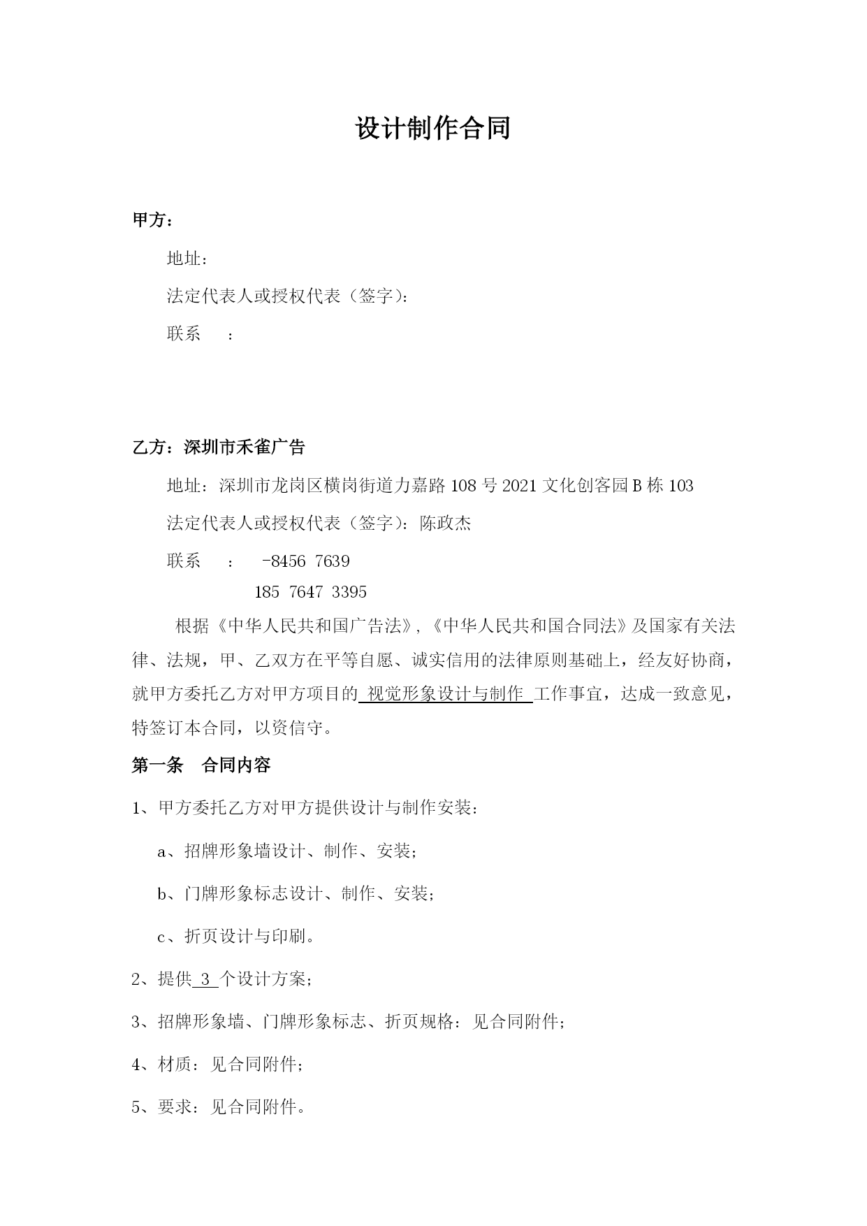 设计制作合同最新文档(可以直接使用,可编辑最新文档,欢迎下载)设计制作合同甲方:地址:法定代表人或授权代表(签字):联系:乙方:深圳市禾雀广告地址:深圳市龙岗区横岗街道力嘉路108号2021文化创客园B栋103法定代表人或授权代表(签字):陈政杰联系:-8456763918576473395根据《中华人民共和国广告法》,《中华人民共和国合同法》及国家有关法律、法规,甲、乙双方在平等自愿、诚实信用的法律原则基础上,经友好协商,就甲方委托乙方对甲方项目的视觉形象设计与制作工作事宜,达成一致意见,特签订本合同,以资信守。合同内容甲方委托乙方对甲方提供设计与制作安装:a、招牌形象墙设计、制作、安装;b、门牌形象标志设计、制作、安装;c、折页设计与印刷。提供3个设计方案;招牌形象墙、门牌形象标志、折页规格:见合同附件;材质:见合同附件;要求:见合同附件。合同费用总价总计:人民币¥元整(大写:)。付款方式1、本合同签订之日起两个工作之日内将委托总费用的50%即人民币¥元整(大写:),通过现金支付或银行转账到乙方公司账户作为预付金,乙方收到甲方的银行划账后作为设计的开始时间;2、总项目设计完成,甲方应在2个工作日内确认,确认后支付合同总余款的30%,即人民币¥元(大写:);乙方收到甲方的银行划账后作为安装材料制作的开始时间;3、项目安装完成,经由甲方确认验收,甲方应在两天内签名或盖章确认(以方式确认同样有效),确认后应支付合同余款,即人民币¥元(大写:)。第四条知识产权约定1、乙方对设计完成的作品享有著作权。甲方将委托设计的所有费用结算完毕后,乙方可将作品著作权转让给甲方(需另行签订转让合同);2、甲方在未付清所有委托设计费用之前,乙方设计的作品著作权归乙方,甲方对该作品不享有任何权利;3、甲方在余款未付清之前擅自使用或者修改使用乙方设计的作品而导致的侵权,乙方有权依据《中华人民共和国著作权法》追究其法律责任。第五条质量要求乙方按甲方确认验收乙方提交的设计稿要求制作生产、交货,如有制作问题由乙方负责修改。第六条加工、售后服务方式乙方负责全包设计包工包料,应严格按照依照合同规定选用原材料,并接受甲方检验;保修期为一年,在保修期内,出现质量问题,乙方应免费修理(包括材料费和工时费)。第七条交货时间与地点在年月日前交货,交货地点在。第八条验收标准及方式1、乙方交货给甲方进行验收,验收以合同附件为标准;2、验收合格,双方办理交接手续。如不合标准,乙方负责修改或更换直至验收合格为止(合同附件为准);3、甲方提出小批量的增补,乙方应按原价和甲方提出的交货时间,保质保量地按时完成;4、乙方全部制作安装完工后3个工作日内,甲方必须组织正式验收,甲方在完工后一周内不组织验收,乙方可视同甲方验收工程质量合格。双方的权利义务甲方权利:甲方有权对乙方的设计提出建议和思路,以使乙方的设计更符合甲方企业文化内涵;甲方有权对乙方所设计的作品提出修改意见;甲方在付清所有设计费用后有权要求签订著作权转让合同,以享有设计作品的所有权利;4、甲方向乙方提供招牌形象墙、门牌形象标志安装位置并确保此位置无管道线路、可以施工,因未实际测量导致的人、财、物的损害由甲方承担;甲方义务:甲方按照合同约定支付相关费用;甲方有义务提供有关企业资料或其他有关资料给乙方;负责提供施工现场的水、电等设施齐全,供乙方使用。乙方权利:乙方有权要求甲方提供有关企业资料供乙方设计参考;乙方有权要求甲方按照合同约定支付相应款项;自甲方通知可以现场施工起,按甲方提供的安装地点在规定的时间内制作施工并安装完毕;严格按照甲方确认的施工方案进行制作、安装。如现场条件与施工图方案不符,应及时报请甲方协商修改确定;确保施工严格按照规定操作,未按规定操作所造成的人、财、物的损害,由乙方负责。乙方义务:乙方需按照甲方的要求进行作品设计;乙方有义务根据合同约定以及实际急缓情况合理安排设计;乙方需按照合同约定按时交付设计作品。违约责任:甲方在设计作品初稿完成前终止合同,其预付的50%费用无权要求退回;甲方在乙方作品初稿完成后终止合同的,应当支付全额的设计费用;2、乙方如无正当理由提前终止合同,所收取的费用应当全部退回给甲方;3、如果乙方已经进入初稿设计,在未提交给甲方之前,甲方单方面取消设计任务,乙方向甲方返还预付款的50%;提供初稿之后,甲方单方面取消设计任务,乙方不退还任何费用,且版权及使用权仍归乙方所有。4、任何一方因不履行或不当履行本合同项下的义务或保证与承诺不实的,即构成违约,违约方应赔偿守约方因此而遭受的经济损失;5、乙方提交的工作成果因涉及内容、资料、信息等侵犯第三方知识