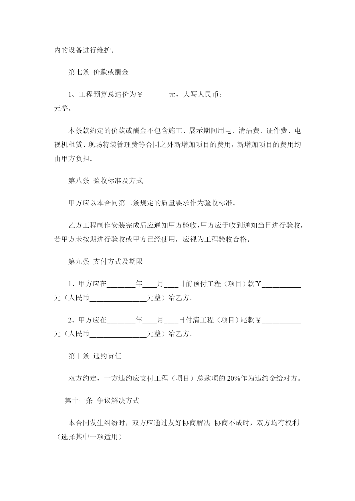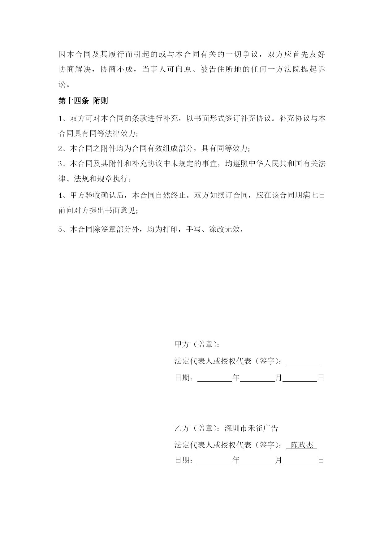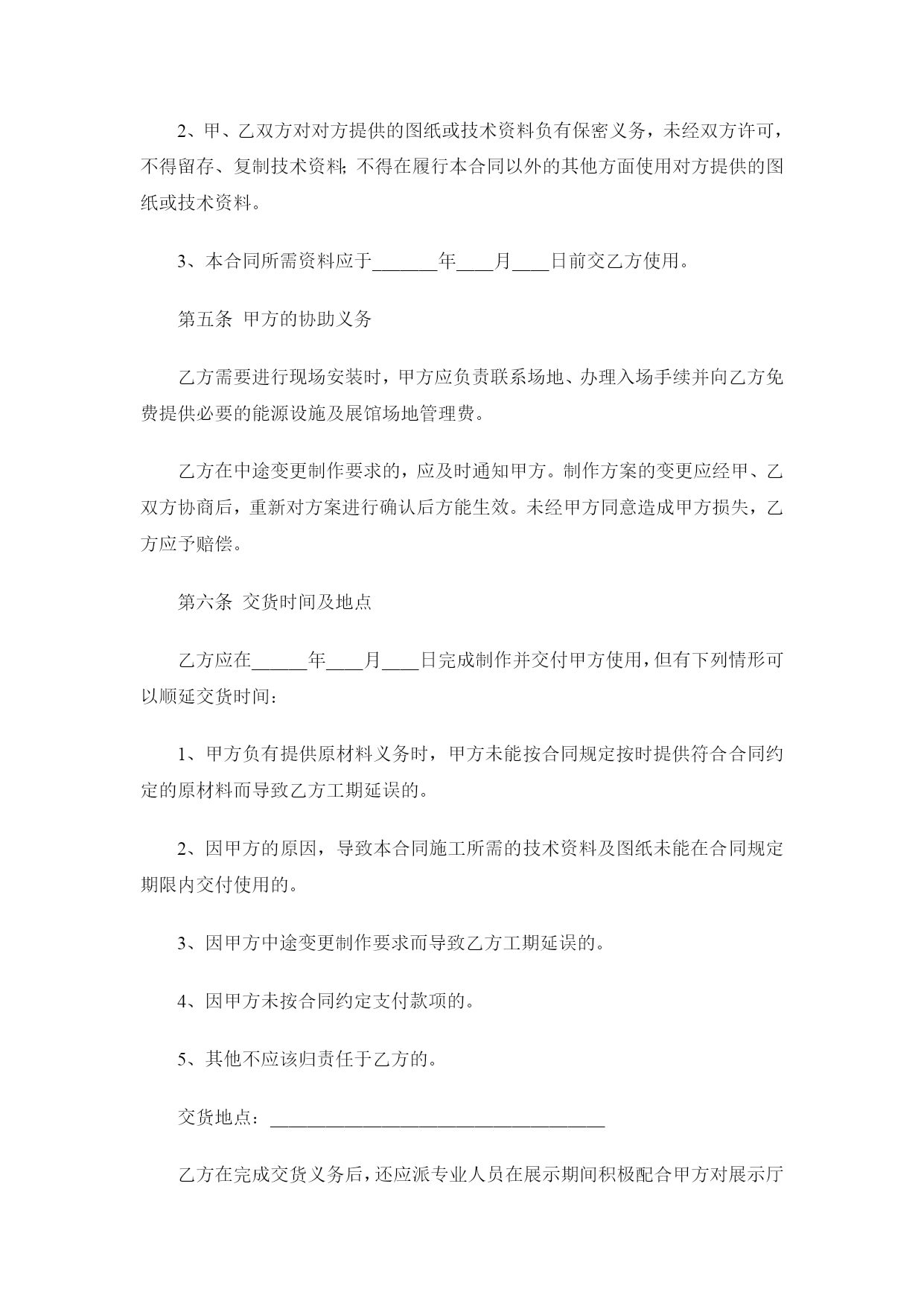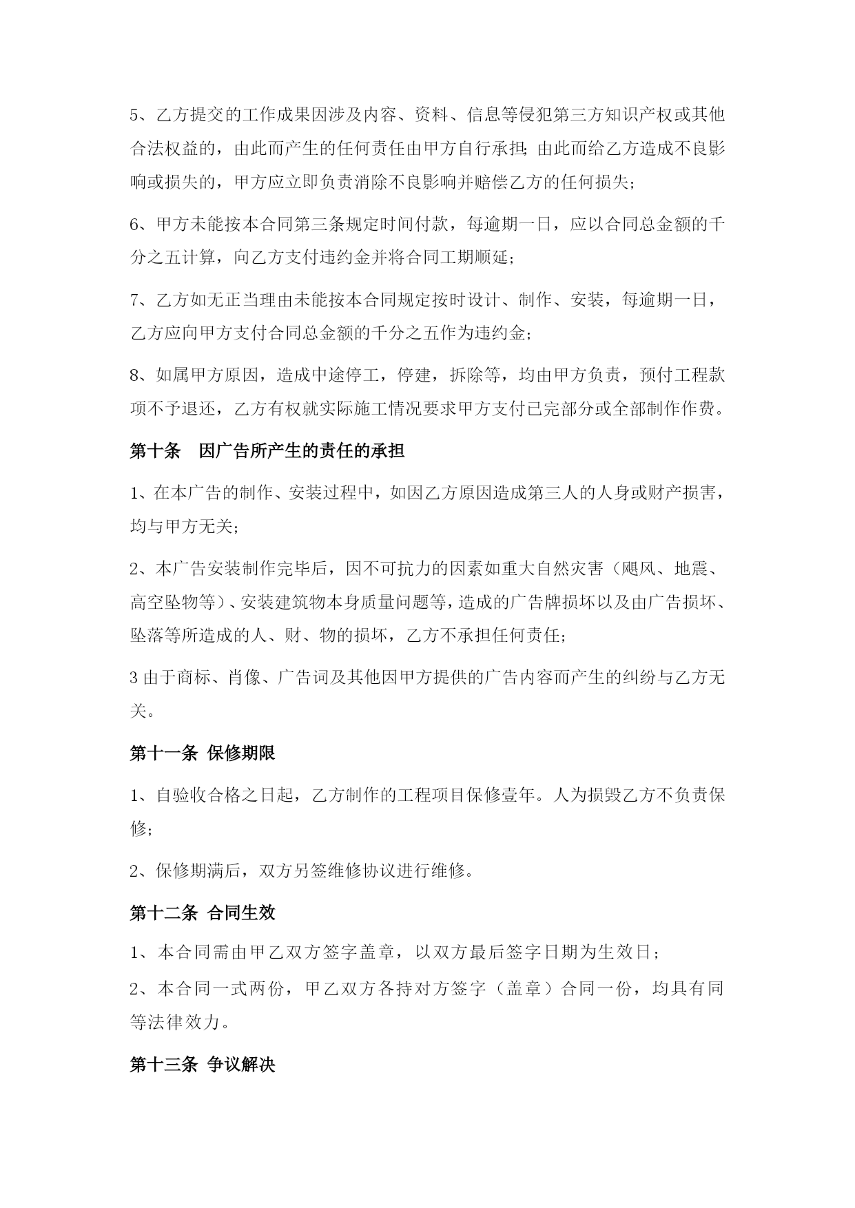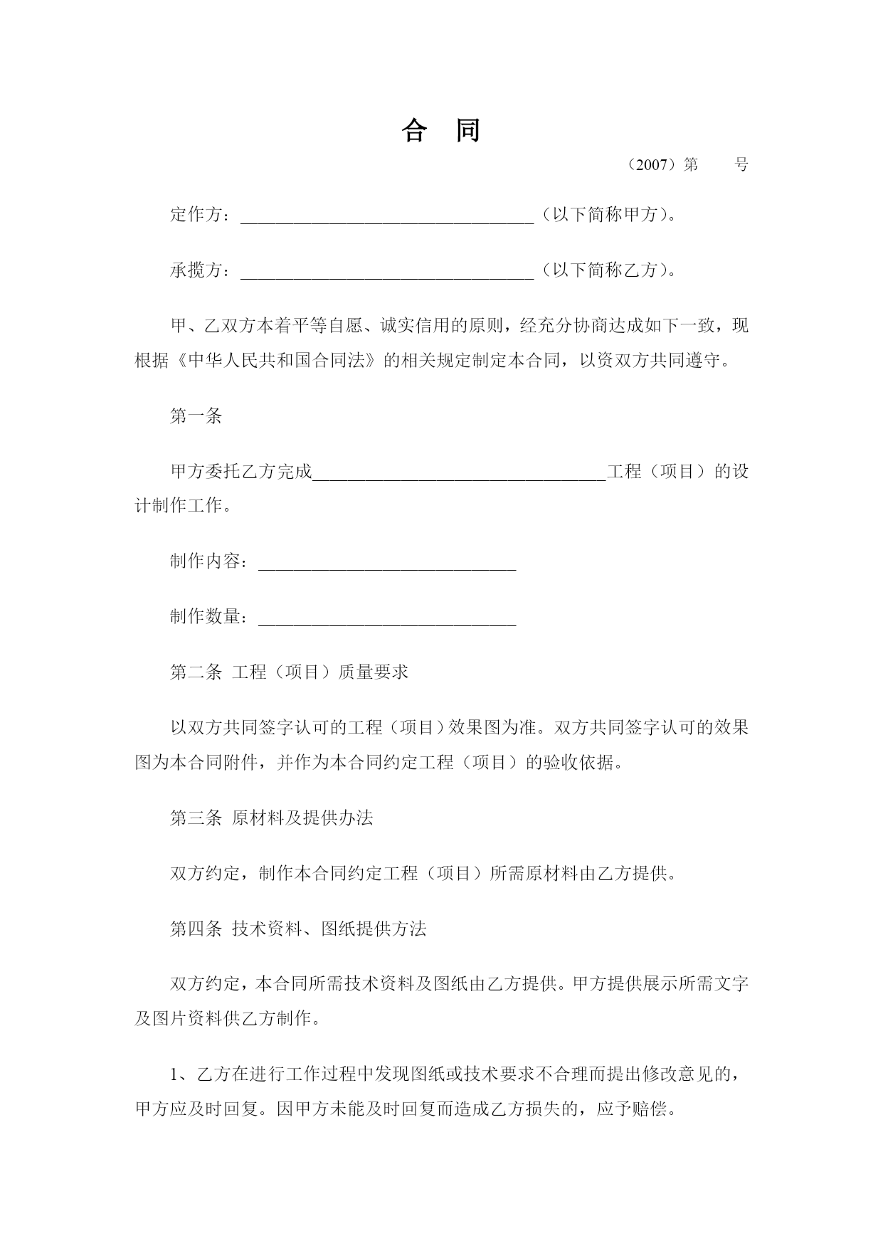 设计制作合同最新文档(可以直接使用,可编辑最新文档,欢迎下载)设计制作合同甲方:地址:法定代表人或授权代表(签字):联系:乙方:深圳市禾雀广告地址:深圳市龙岗区横岗街道力嘉路108号2021文化创客园B栋103法定代表人或授权代表(签字):陈政杰联系:-8456763918576473395根据《中华人民共和国广告法》,《中华人民共和国合同法》及国家有关法律、法规,甲、乙双方在平等自愿、诚实信用的法律原则基础上,经友好协商,就甲方委托乙方对甲方项目的视觉形象设计与制作工作事宜,达成一致意见,特签订本合同,以资信守。合同内容甲方委托乙方对甲方提供设计与制作安装:a、招牌形象墙设计、制作、安装;b、门牌形象标志设计、制作、安装;c、折页设计与印刷。提供3个设计方案;招牌形象墙、门牌形象标志、折页规格:见合同附件;材质:见合同附件;要求:见合同附件。合同费用总价总计:人民币¥元整(大写:)。付款方式1、本合同签订之日起两个工作之日内将委托总费用的50%即人民币¥元整(大写:),通过现金支付或银行转账到乙方公司账户作为预付金,乙方收到甲方的银行划账后作为设计的开始时间;2、总项目设计完成,甲方应在2个工作日内确认,确认后支付合同总余款的30%,即人民币¥元(大写:);乙方收到甲方的银行划账后作为安装材料制作的开始时间;3、项目安装完成,经由甲方确认验收,甲方应在两天内签名或盖章确认(以方式确认同样有效),确认后应支付合同余款,即人民币¥元(大写:)。第四条知识产权约定1、乙方对设计完成的作品享有著作权。甲方将委托设计的所有费用结算完毕后,乙方可将作品著作权转让给甲方(需另行签订转让合同);2、甲方在未付清所有委托设计费用之前,乙方设计的作品著作权归乙方,甲方对该作品不享有任何权利;3、甲方在余款未付清之前擅自使用或者修改使用乙方设计的作品而导致的侵权,乙方有权依据《中华人民共和国著作权法》追究其法律责任。第五条质量要求乙方按甲方确认验收乙方提交的设计稿要求制作生产、交货,如有制作问题由乙方负责修改。第六条加工、售后服务方式乙方负责全包设计包工包料,应严格按照依照合同规定选用原材料,并接受甲方检验;保修期为一年,在保修期内,出现质量问题,乙方应免费修理(包括材料费和工时费)。第七条交货时间与地点在年月日前交货,交货地点在。第八条验收标准及方式1、乙方交货给甲方进行验收,验收以合同附件为标准;2、验收合格,双方办理交接手续。如不合标准,乙方负责修改或更换直至验收合格为止(合同附件为准);3、甲方提出小批量的增补,乙方应按原价和甲方提出的交货时间,保质保量地按时完成;4、乙方全部制作安装完工后3个工作日内,甲方必须组织正式验收,甲方在完工后一周内不组织验收,乙方可视同甲方验收工程质量合格。双方的权利义务甲方权利:甲方有权对乙方的设计提出建议和思路,以使乙方的设计更符合甲方企业文化内涵;甲方有权对乙方所设计的作品提出修改意见;甲方在付清所有设计费用后有权要求签订著作权转让合同,以享有设计作品的所有权利;4、甲方向乙方提供招牌形象墙、门牌形象标志安装位置并确保此位置无管道线路、可以施工,因未实际测量导致的人、财、物的损害由甲方承担;甲方义务:甲方按照合同约定支付相关费用;甲方有义务提供有关企业资料或其他有关资料给乙方;负责提供施工现场的水、电等设施齐全,供乙方使用。乙方权利:乙方有权要求甲方提供有关企业资料供乙方设计参考;乙方有权要求甲方按照合同约定支付相应款项;自甲方通知可以现场施工起,按甲方提供的安装地点在规定的时间内制作施工并安装完毕;严格按照甲方确认的施工方案进行制作、安装。如现场条件与施工图方案不符,应及时报请甲方协商修改确定;确保施工严格按照规定操作,未按规定操作所造成的人、财、物的损害,由乙方负责。乙方义务:乙方需按照甲方的要求进行作品设计;乙方有义务根据合同约定以及实际急缓情况合理安排设计;乙方需按照合同约定按时交付设计作品。违约责任:甲方在设计作品初稿完成前终止合同,其预付的50%费用无权要求退回;甲方在乙方作品初稿完成后终止合同的,应当支付全额的设计费用;2、乙方如无正当理由提前终止合同,所收取的费用应当全部退回给甲方;3、如果乙方已经进入初稿设计,在未提交给甲方之前,甲方单方面取消设计任务,乙方向甲方返还预付款的50%;提供初稿之后,甲方单方面取消设计任务,乙方不退还任何费用,且版权及使用权仍归乙方所有。4、任何一方因不履行或不当履行本合同项下的义务或保证与承诺不实的,即构成违约,违约方应赔偿守约方因此而遭受的经济损失;5、乙方提交的工作成果因涉及内容、资料、信息等侵犯第三方知识