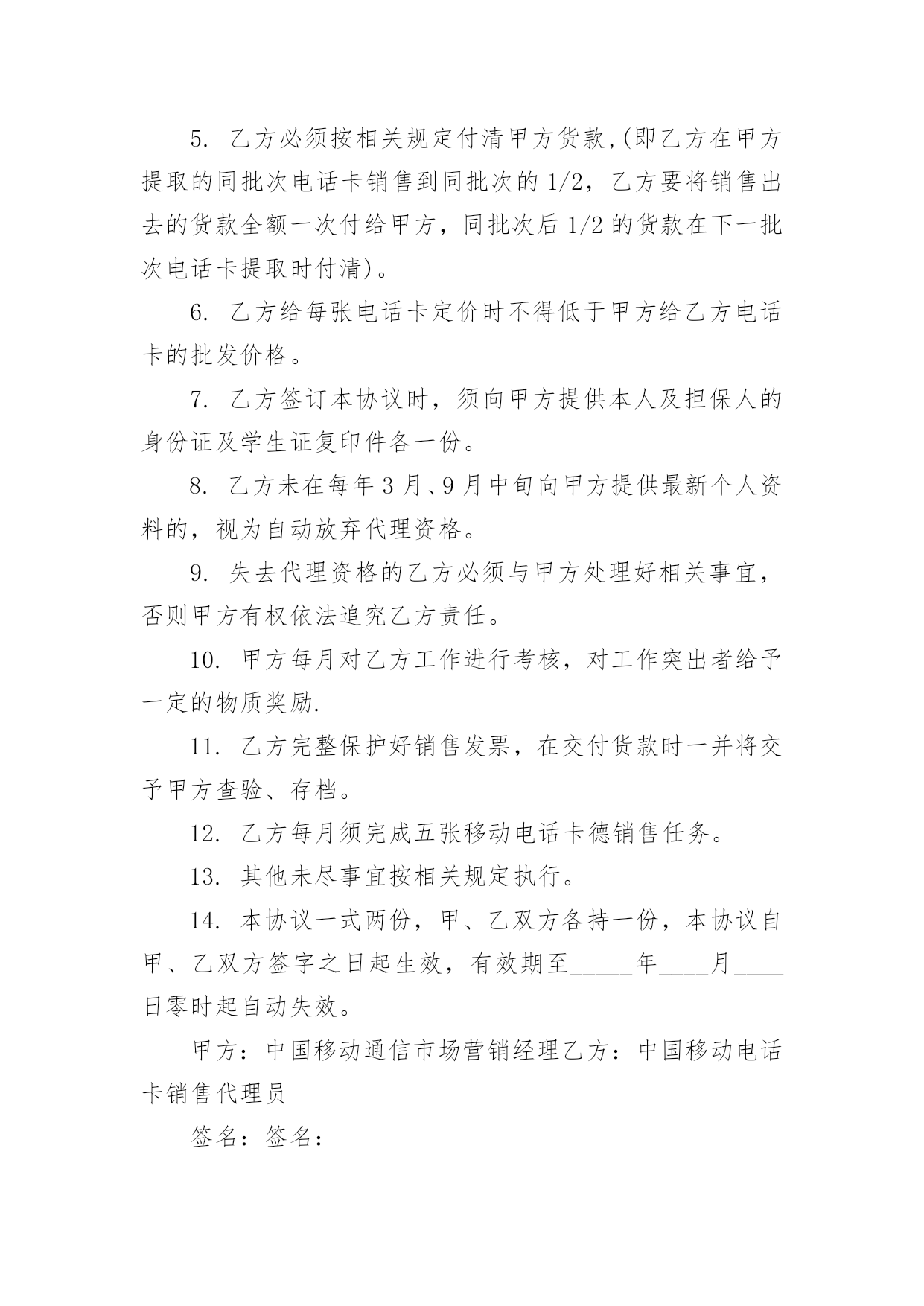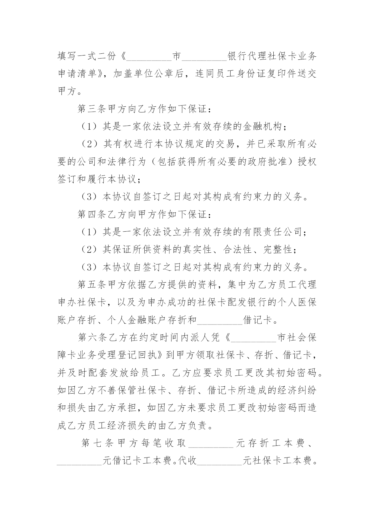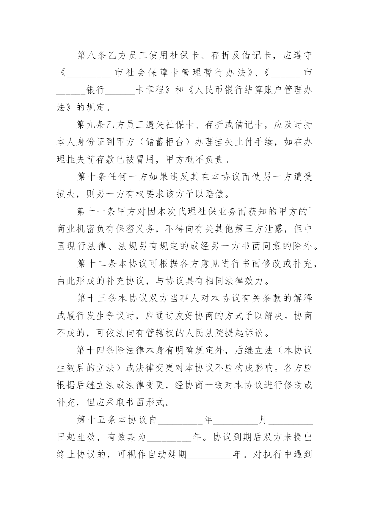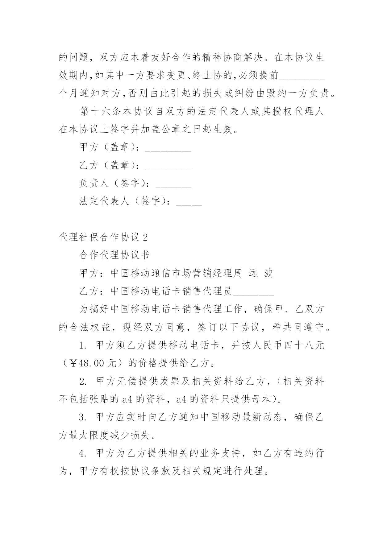 代理社保合作协议在当下社会,很多情况下我们需要用到协议,签订协议能够保证双方合作愉快。那么协议的格式,你掌握了吗以下是小编收集整理的代理社保合作协议,仅供参考,希望能够帮助到大家。代理社保合作协议1甲方:_________银行________支行乙方:_________________________本代理社保业务合作协议由下列各方于_________年_________月_________日在_________市订立:____________甲乙双方本着互利互惠、共同发展的原则,经友好协商,就甲方为乙方员工代办社保卡业务达成以下协议:____________第一条本协议的代办社保卡业务是指甲乙双方在符合法规政策的前提下,乙方委托甲方为本单位员工的社会保障卡代理银行,为乙方员工代办社会保障卡(以下简称社保卡)申办、换领手续的业务。第二条社保卡申请人必须是参加_________市社会保险的在职人员、领取基本养老金的退(离)休人员、领取最低生活保障金人员。乙方根据《_________市社会保障卡管理暂行办法》要求,在征得员工同意基础上,给员工申办社会保障卡。申办时,乙方收集本单位员工身份证,审核无误后,填写一式二份《_________市_________银行代理社保卡业务申请清单》,加盖单位公章后,连同员工身份证复印件送交甲方。第三条甲方向乙方作如下保证:(1)其是一家依法设立并有效存续的金融机构;(2)其有权进行本协议规定的交易,并已采取所有必要的公司和法律行为(包括获得所有必要的政府批准)授权签订和履行本协议;(3)本协议自签订之日起对其构成有约束力的义务。第四条乙方向甲方作如下保证:(1)其是一家依法设立并有效存续的有限责任公司;(2)其保证所供资料的真实性、合法性、完整性;(3)本协议自签订之日起对其构成有约束力的义务。第五条甲方依据乙方提供的资料,集中为乙方员工代理申办社保卡,以及为申办成功的社保卡配发银行的个人医保账户存折、个人金融账户存折和_________借记卡。第六条乙方在约定时间内派人凭《_________市社会保障卡业务受理登记回执》到甲方领取社保卡、存折、借记卡,并及时配套发放给员工。乙方应要求员工更改其初始密码。如因乙方不善保管社保卡、存折、借记卡所造成的经济纠纷和损失由乙方承担,如因乙方未要求员工更改初始密码而造成乙方员工经济损失的由乙方负责。第七条甲方每笔收取_________元存折工本费、_________元借记卡工本费。代收_________元社保卡工本费。第八条乙方员工使用社保卡、存折及借记卡,应遵守《_________市社会保障卡管理暂行办法》、《______市______银行______卡章程》和《人民币银行结算账户管理办法》的规定。第九条乙方员工遗失社保卡、存折或借记卡,应及时持本人身份证到甲方(储蓄柜台)办理挂失止付手续,如在办理挂失前存款已被冒用,甲方概不负责。第十条任何一方如果违反其在本协议而使另一方遭受损失,则另一方有权要求该方予以赔偿。第十一条甲方对因本次代理社保业务而获知的甲方的`商业机密负有保密义务,不得向有关其他第三方泄露,但中国现行法律、法规另有规定的或经另一方书面同意的除外。第十二条本协议可根据各方意见进行书面修改或补充,由此形成的补充协议,与协议具有相同法律效力。第十三条本协议双方当事人对本协议有关条款的解释或履行发生争议时,应通过友好协商的方式予以解决。协商不成的,可依法向有管辖权的人民法院提起诉讼。第十四条除法律本身有明确规定外,后继立法(本协议生效后的立法)或法律变更对本协议不应构成影响。各方应根据后继立法或法律变更,经协商一致对本协议进行修改或补充,但应采取书面形式。第十五条本协议自_________年_________月_________日起生效,有效期为_________年。协议到期后双方未提出终止协议的,可视作自动延期_________年。对执行中遇到的问题,双方应本着友好合作的精神协商解决。在本协议生效期内,如其中一方要求变更、终止协的,必须提前_________个月通知对方,否则由此引起的损失或纠纷由毁约一方负责。第十六条本协议自双方的法定代表人或其授权代理人在本协议上签字并加盖公章之日起生效。甲方(盖章):_________乙方(盖章):_________负责人(签字):_______法定代表人(签字):_____代理社保合作协议2合作代理协议书甲方:中国移动通信市场营销经理周远波乙方:中国移动电话卡销售代理员________为搞好中国移动电话卡销售代理工作,确保甲、乙双方的合法权益,现经双方同意,签订以下协议,希共同遵守。1.甲方须乙方提供移动电话卡,并按人民币四十八元(¥48.00元)的价格提供给乙方。2.甲方无偿提供发票及相关资料给乙方,