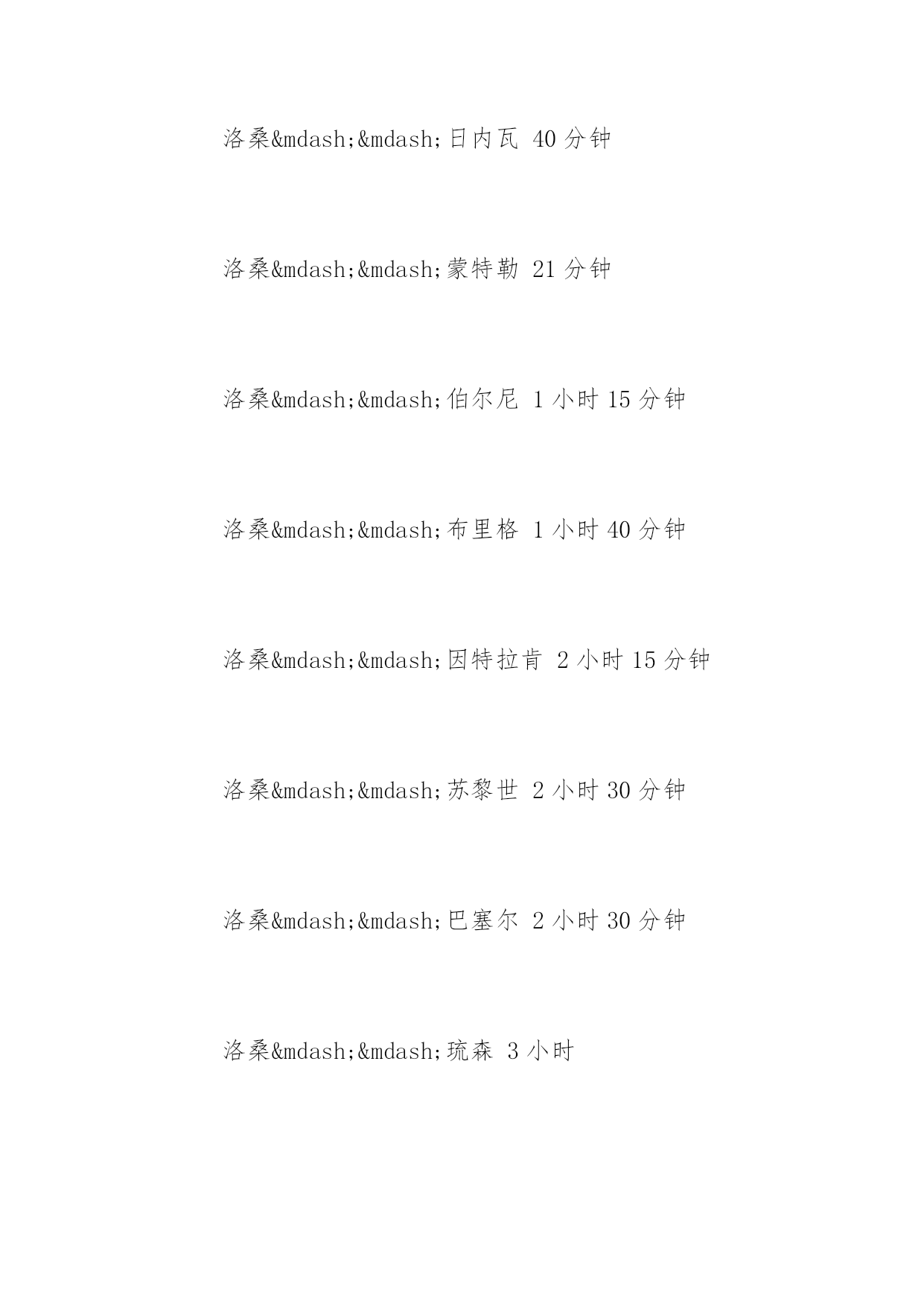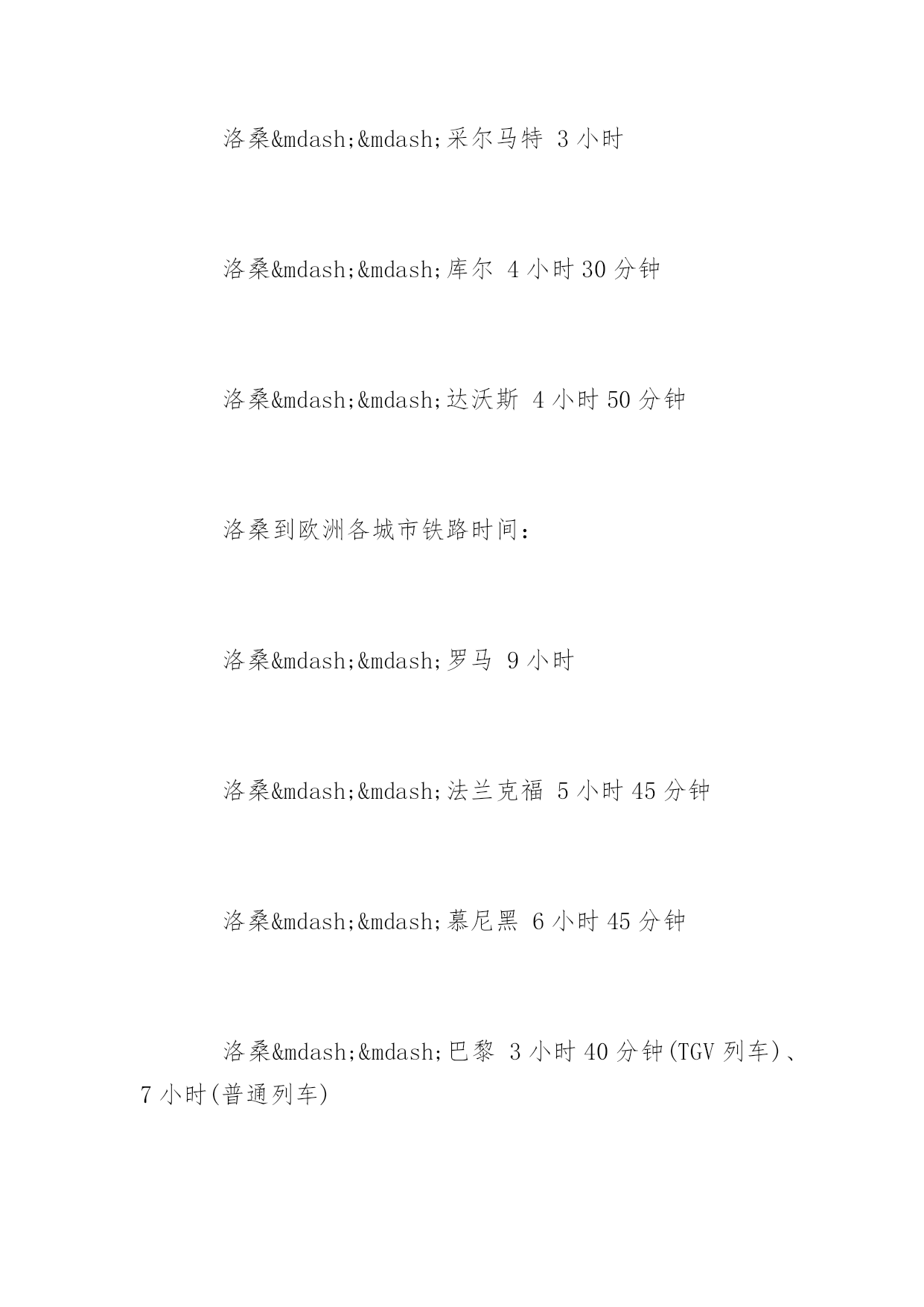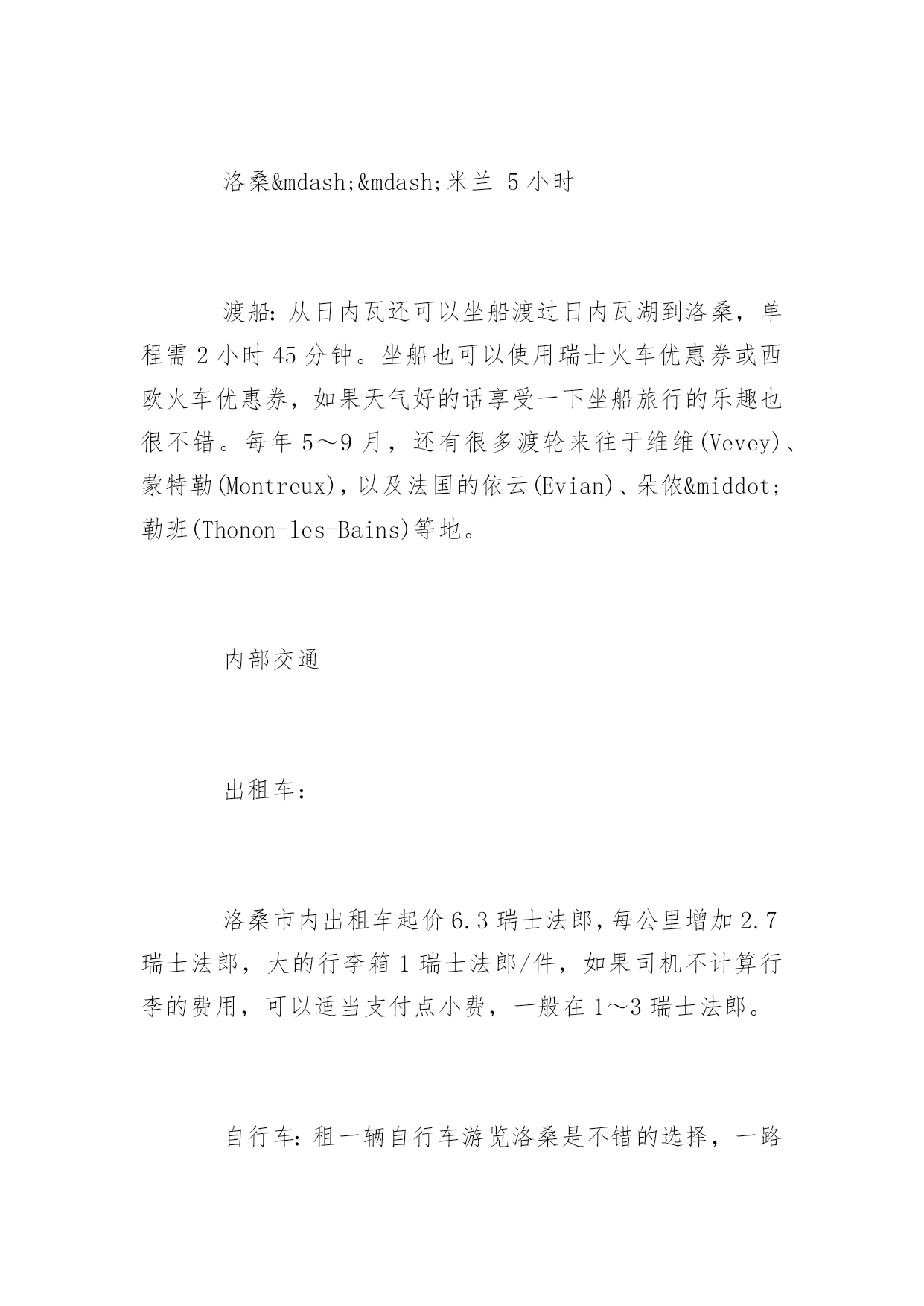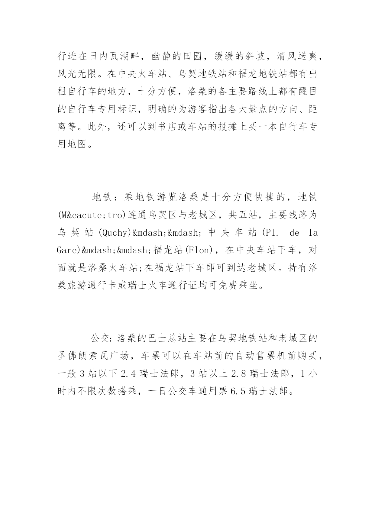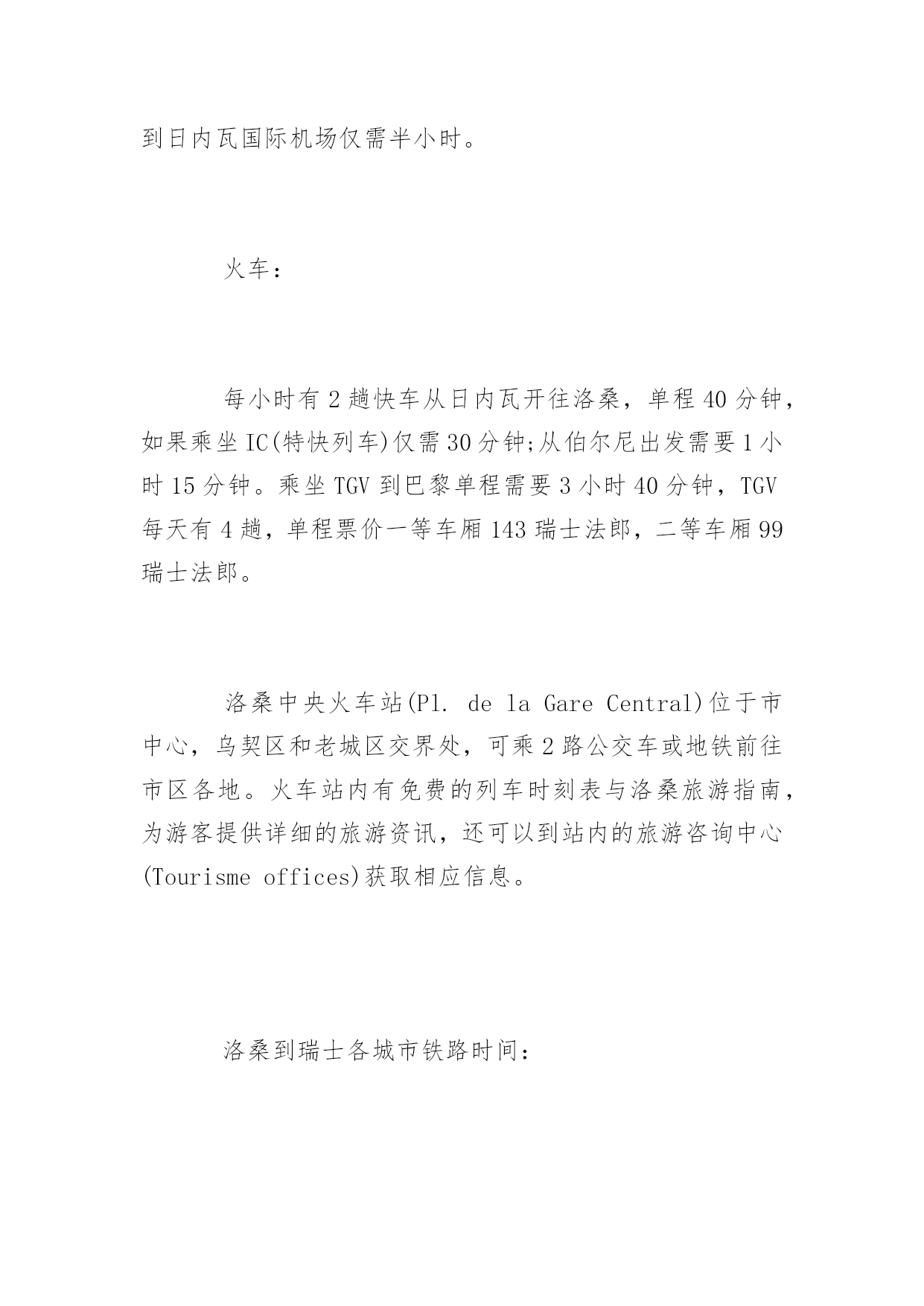 洛桑旅游超详细交通攻略洛桑的原意为石头,源于这里遍布大街小巷的崎岖不平的石板路。洛桑的交通情况怎么样呢?今天,YJBYS小编特意为大家搜集整理了洛桑旅游超详细交通攻略,希望能帮上大家!交通介绍瑞士交通网络四通八达十分方便,且有着强大的公交系统,实时同步火车、邮政巴士、登山火车、缆车以及胡上游船等信息。你需要做的就是买一张适用于全国20,000多公里的瑞士交通系统通票而已,这样在洛桑就基本畅通无阻了。到达和离开飞机:洛桑没有机场,但铁路、公路发达,可迅速通达瑞士及周边的法国、德国、意大利等城市,乘火车或汽车到日内瓦国际机场仅需半小时。火车:每小时有2趟快车从日内瓦开往洛桑,单程40分钟,如果乘坐IC(特快列车)仅需30分钟;从伯尔尼出发需要1小时15分钟。乘坐TGV到巴黎单程需要3小时40分钟,TGV每天有4趟,单程票价一等车厢143瑞士法郎,二等车厢99瑞士法郎。洛桑中央火车站(Pl.delaGareCentral)位于市中心,乌契区和老城区交界处,可乘2路公交车或地铁前往市区各地。火车站内有免费的列车时刻表与洛桑旅游指南,为游客提供详细的旅游资讯,还可以到站内的旅游咨询中心(Tourismeoffices)获取相应信息。洛桑到瑞士各城市铁路时间:洛桑——日内瓦40分钟洛桑——蒙特勒21分钟洛桑——伯尔尼1小时15分钟洛桑——布里格1小时40分钟洛桑——因特拉肯2小时15分钟洛桑——苏黎世2小时30分钟洛桑——巴塞尔2小时30分钟洛桑——琉森3小时洛桑——采尔马特3小时洛桑——库尔4小时30分钟洛桑——达沃斯4小时50分钟洛桑到欧洲各城市铁路时间:洛桑——罗马9小时洛桑——法兰克福5小时45分钟洛桑——慕尼黑6小时45分钟洛桑——巴黎3小时40分钟(TGV列车)、7小时(普通列车)洛桑——米兰5小时渡船:从日内瓦还可以坐船渡过日内瓦湖到洛桑,单程需2小时45分钟。坐船也可以使用瑞士火车优惠券或西欧火车优惠券,如果天气好的话享受一下坐船旅行的乐趣也很不错。每年5~9月,还有很多渡轮来往于维维(Vevey)、蒙特勒(Montreux),以及法国的依云(Evian)、朵侬·勒班(Thonon-les-Bains)等地。内部交通出租车:洛桑市内出租车起价6.3瑞士法郎,每公里增加2.7瑞士法郎,大的行李箱1瑞士法郎/件,如果司机不计算行李的费用,可以适当支付点小费,一般在1~3瑞士法郎。自行车:租一辆自行车游览洛桑是不错的选择,一路行进在日内瓦湖畔,幽静的田园,缓缓的斜坡,清风送爽,风光无限。在中央火车站、乌契地铁站和福龙地铁站都有出租自行车的地方,十分方便,洛桑的各主要路线上都有醒目的自行车专用标识,明确的为游客指出各大景点的方向、距离等。此外,还可以到书店或车站的报摊上买一本自行车专用地图。地铁:乘地铁游览洛桑是十分方便快捷的,地铁(Métro)连通乌契区与老城区,共五站,主要线路为乌契站(Quchy)——中央车站(Pl.delaGare)——福龙站(Flon),在中央车站下车,对面就是洛桑火车站;在福龙站下车即可到达老城区。持有洛桑旅游通行卡或瑞士火车通行证均可免费乘坐。公交:洛桑的巴士总站主要在乌契地铁站和老城区的圣佛朗索瓦广场,车票可以在车站前的自动售票机前购买,一般3站以下2.4瑞士法郎,3站以上2.8瑞士法郎,1小时内不限次数搭乘,一日公交车通用票6.5瑞士法郎。