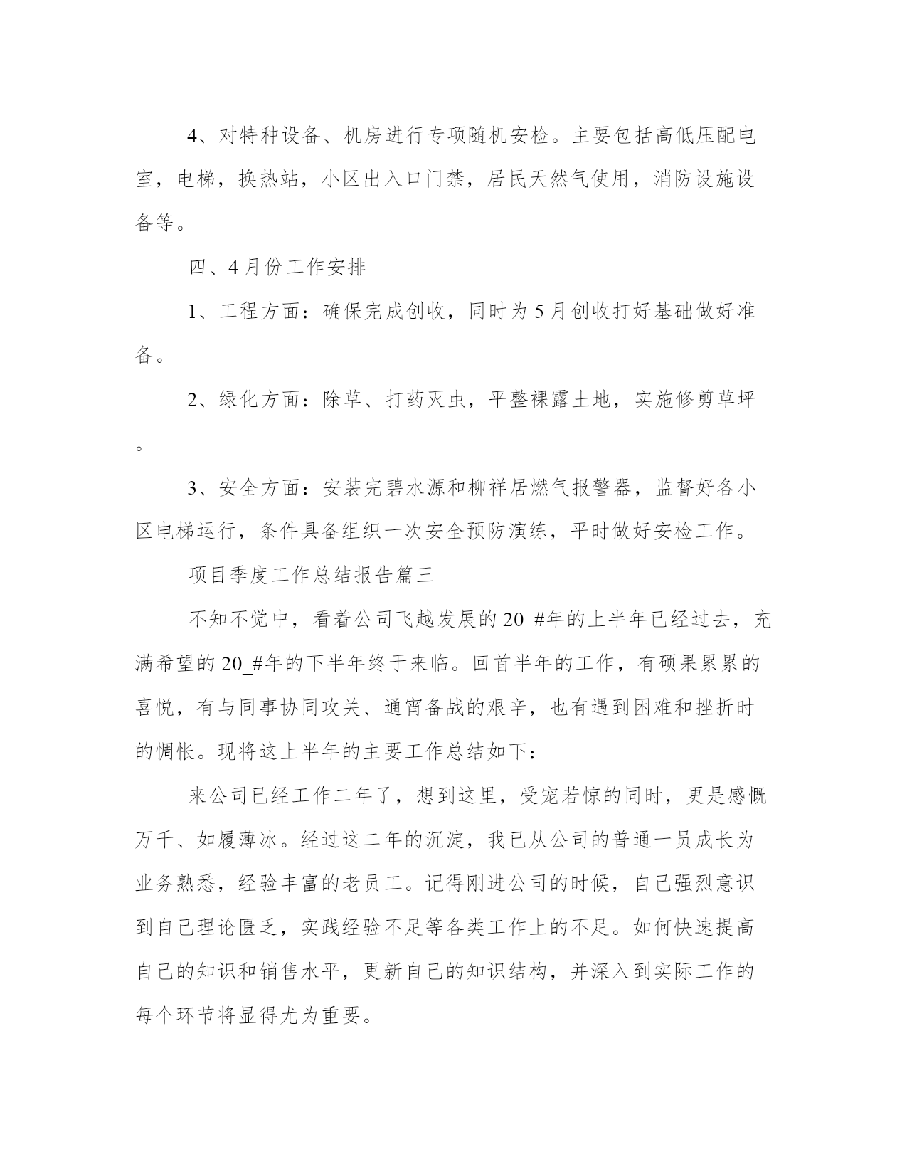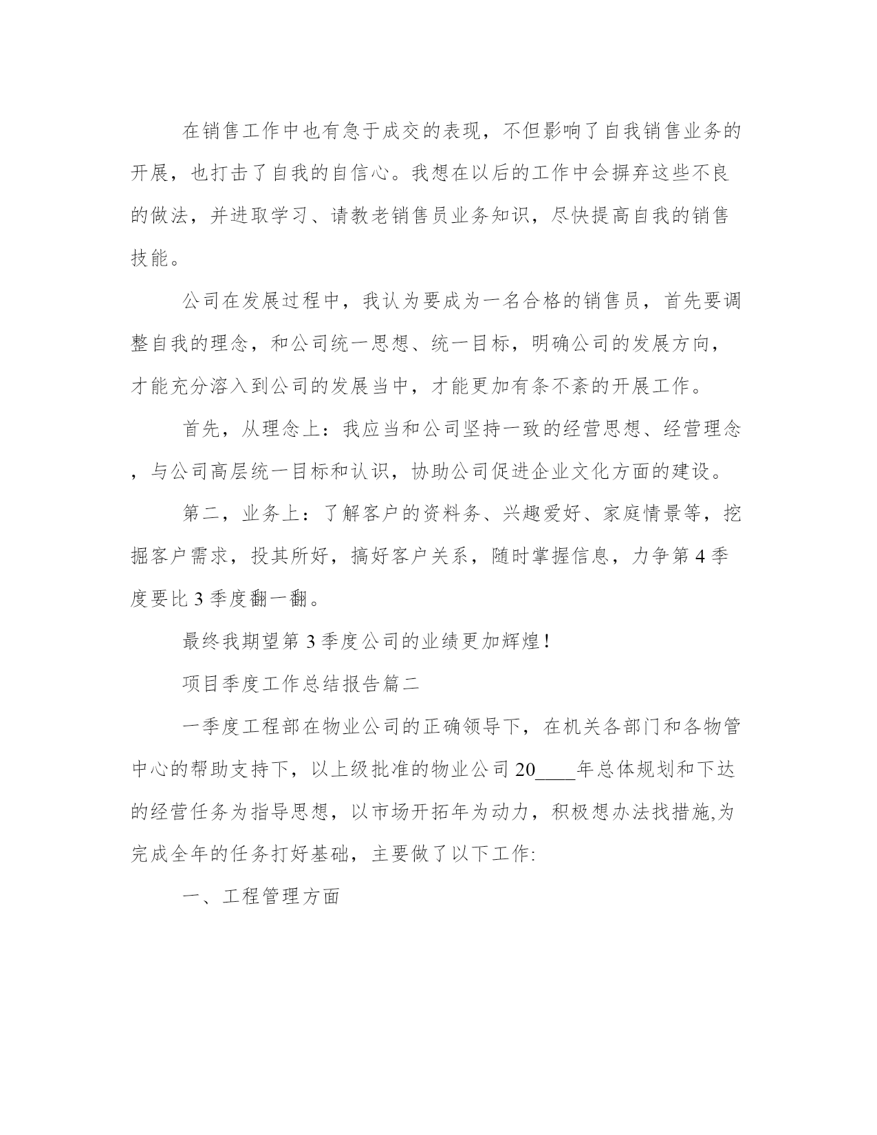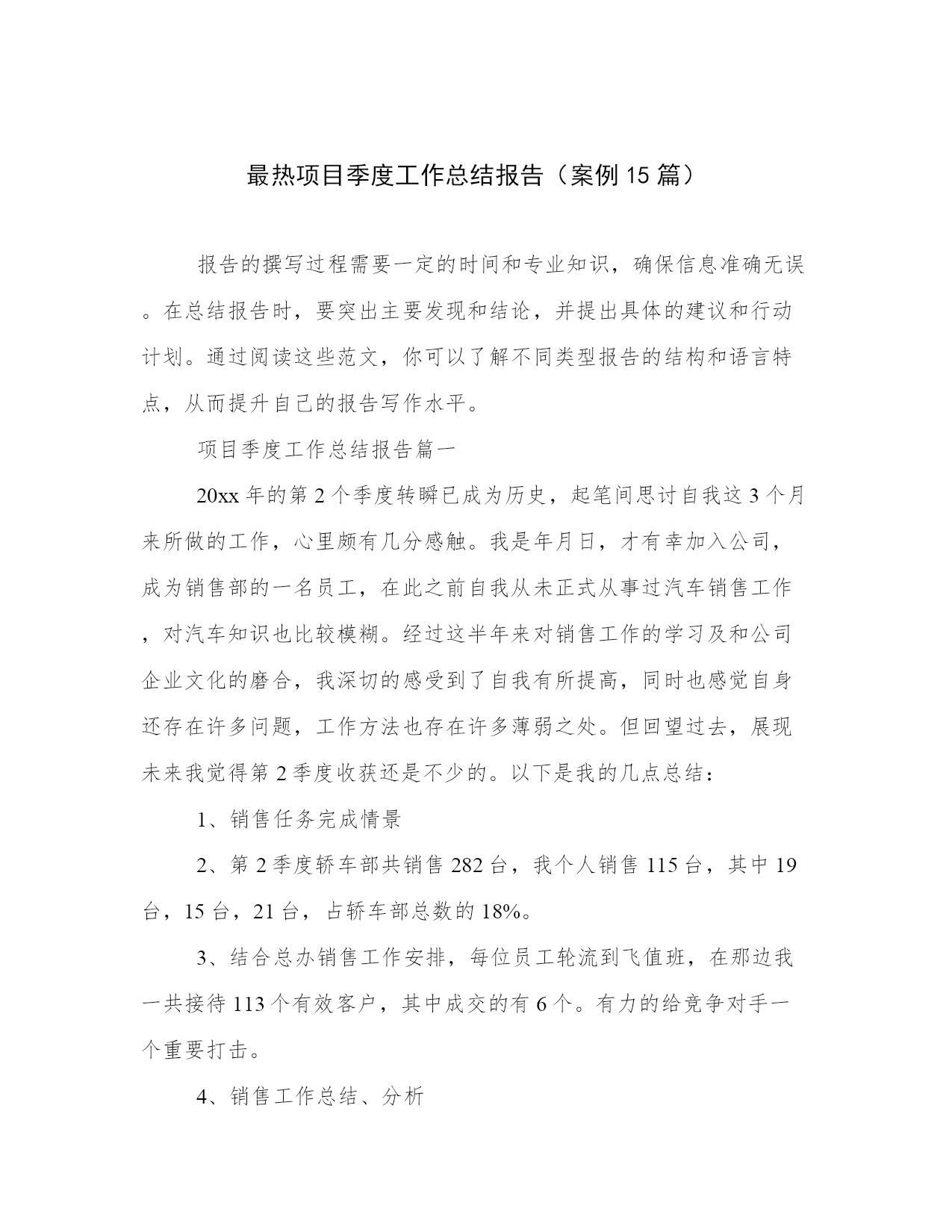 最热项目季度工作总结报告(案例15篇)报告的撰写过程需要一定的时间和专业知识,确保信息准确无误。在总结报告时,要突出主要发现和结论,并提出具体的建议和行动计划。通过阅读这些范文,你可以了解不同类型报告的结构和语言特点,从而提升自己的报告写作水平。项目季度工作总结报告篇一20xx年的第2个季度转瞬已成为历史,起笔间思讨自我这3个月来所做的工作,心里颇有几分感触。我是年月日,才有幸加入公司,成为销售部的一名员工,在此之前自我从未正式从事过汽车销售工作,对汽车知识也比较模糊。经过这半年来对销售工作的学习及和公司企业文化的磨合,我深切的感受到了自我有所提高,同时也感觉自身还存在许多问题,工作方法也存在许多薄弱之处。但回望过去,展现未来我觉得第2季度收获还是不少的。以下是我的几点总结:1、销售任务完成情景2、第2季度轿车部共销售282台,我个人销售115台,其中19台,15台,21台,占轿车部总数的18%。3、结合总办销售工作安排,每位员工轮流到飞值班,在那边我一共接待113个有效客户,其中成交的有6个。有力的给竞争对手一个重要打击。4、销售工作总结、分析(1)入职感言。在销售岗位上,首先我要提到两个人一个是总办林总监和销售部经理,我要十分感激他们俩人在工作上对我的帮忙。我在接触汽车销售时,对汽车知识和销售知识十分缺乏,我的工作能够说是很难入手的。前两个月,我都是在总监和经理的带领下进行客户谈判、分析客户情景的、所以在销售中遇到难谈下来的客户或比较车型优势比较的时候我总想到他们。正因为有了他们在销售技巧、谈判工作中的帮忙,还有前期这些经验做铺垫,所以八月份我才能顺利的在岗位中独立开展工作,整个学习的过程,能够说完全是两个领导言传身教的结果。(2)职业心态的调整销售员的一天应当从清晨睁开第一眼开始,每一天早上我都会从自我定的欢快激进的闹铃声中醒来,然后以精神充沛、欢乐的心态迎接一天的工作。如果我没有别人经验多,那么我和别人比诚信;如果我没有别人单子多,那么我和别人比服务。(3)重点客户的开展。我在那里想说一下:我们要把b类的客户当成a类来接待,就这样我们才比其他人多一个a类,多一个a类就多一个机会。拜访,对客户做到每周至少三次的拜访。我认为攻客户和制定目标是一样的,首先要集中精力去做一个客户,仅有这样才能有收效,等重点客户认可了,我再将精力转移到第二重点客户上。(4)自我工作中的不足:在销售工作中也有急于成交的表现,不但影响了自我销售业务的开展,也打击了自我的自信心。我想在以后的工作中会摒弃这些不良的做法,并进取学习、请教老销售员业务知识,尽快提高自我的销售技能。公司在发展过程中,我认为要成为一名合格的销售员,首先要调整自我的理念,和公司统一思想、统一目标,明确公司的发展方向,才能充分溶入到公司的发展当中,才能更加有条不紊的开展工作。首先,从理念上:我应当和公司坚持一致的经营思想、经营理念,与公司高层统一目标和认识,协助公司促进企业文化方面的建设。第二,业务上:了解客户的资料务、兴趣爱好、家庭情景等,挖掘客户需求,投其所好,搞好客户关系,随时掌握信息,力争第4季度要比3季度翻一翻。最终我期望第3季度公司的业绩更加辉煌!项目季度工作总结报告篇二一季度工程部在物业公司的正确领导下,在机关各部门和各物管中心的帮助支持下,以上级批准的物业公司20____年总体规划和下达的经营任务为指导思想,以市场开拓年为动力,积极想办法找措施,为完成全年的任务打好基础,主要做了以下工作:一、工程管理方面面对今年严峻的经营形势和对外创收150万元的经营任务,我们工程部面对困难迎难而上,在房地产内部维修工程大幅压缩的情况下,积极拓展外部市场,寻找生存和发展的机会。对房地产内部,只要有一线生机我们就积极争取。年初我们对房地产内部维修工程列了约220万元的项目,结果形势发生了不可想象的变化——房地产的维修项目必须由物业公司自己的职工干才给,否则不许转包或者说:是活就不给。6.1万元,完全打破了我们的计划,可以说剩余的144万元成了空气在此情况下我们只能把这144万元放到市场上去找。面对市场我们做了以下的工作:1、调整思路、调整心态,确定盈利办法盈利模式——利用我们的绿化专业优势寻找合作伙伴,打造合作平台,打造共赢,实现创收。目前经与外部三家单位联系洽谈已有两家单位与我们达成了合作绿化工程的意向,估计产值在50-60万元之间,这样20____年二季度产值就有了希望。2、利用个人的人脉关系承揽工程与大公司合作,实现资源共享收入分成,实现创收。目前正与胜利油田测井公司联系着做着工作,下来准备与胜利建设合作,利用其资质、力量、油田入网证承揽工程实现创收。下一步再寻机开拓油田其他单位以及地方政府和各大房地产开发商。二、绿化管理