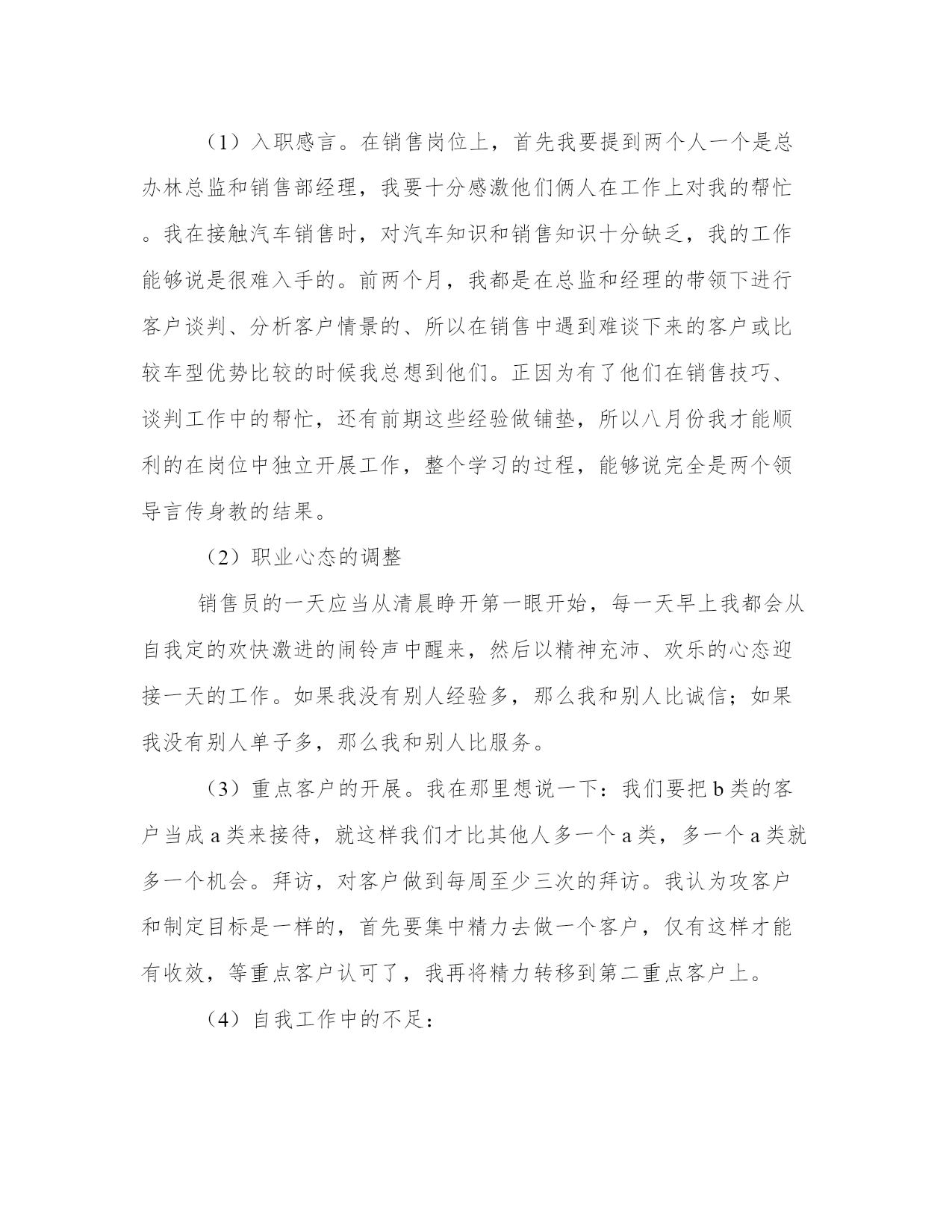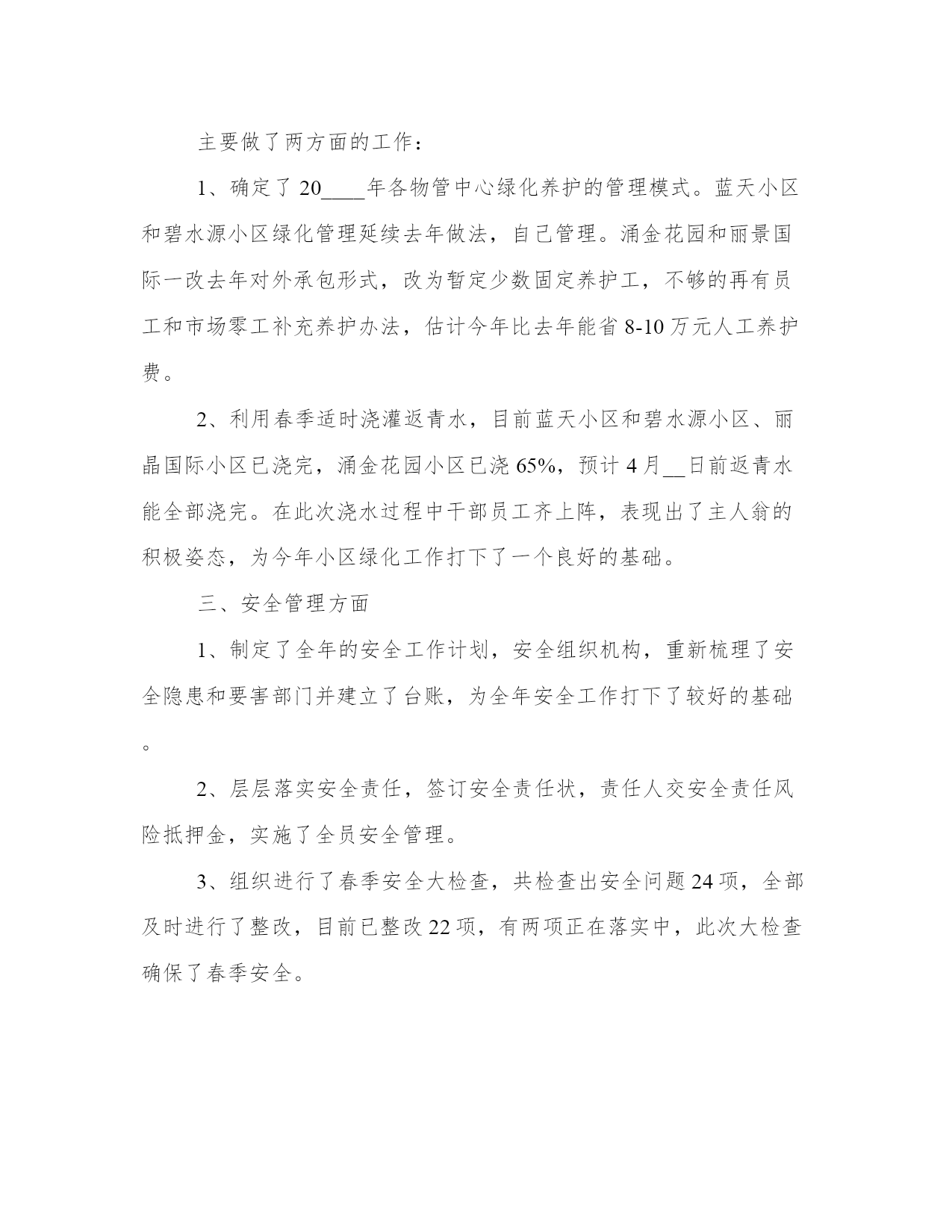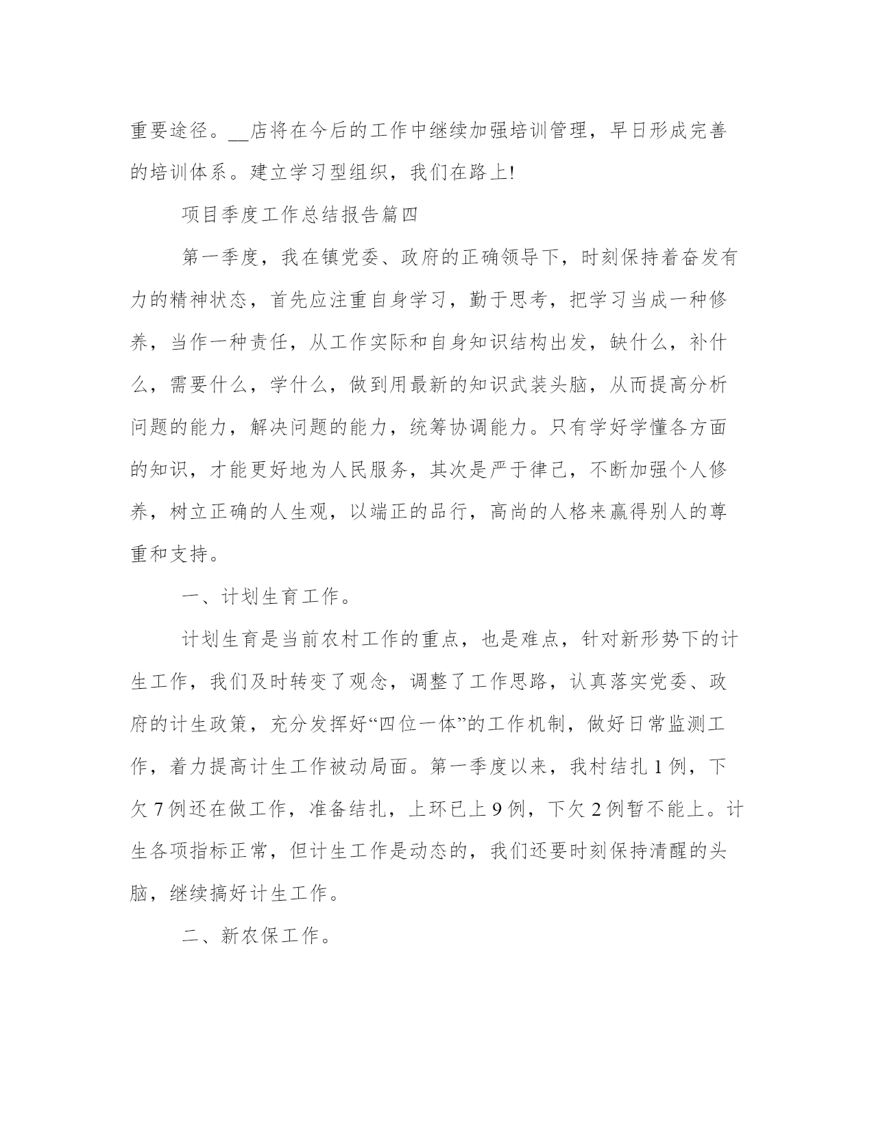 最热项目季度工作总结报告(案例15篇)报告的撰写过程需要一定的时间和专业知识,确保信息准确无误。在总结报告时,要突出主要发现和结论,并提出具体的建议和行动计划。通过阅读这些范文,你可以了解不同类型报告的结构和语言特点,从而提升自己的报告写作水平。项目季度工作总结报告篇一20xx年的第2个季度转瞬已成为历史,起笔间思讨自我这3个月来所做的工作,心里颇有几分感触。我是年月日,才有幸加入公司,成为销售部的一名员工,在此之前自我从未正式从事过汽车销售工作,对汽车知识也比较模糊。经过这半年来对销售工作的学习及和公司企业文化的磨合,我深切的感受到了自我有所提高,同时也感觉自身还存在许多问题,工作方法也存在许多薄弱之处。但回望过去,展现未来我觉得第2季度收获还是不少的。以下是我的几点总结:1、销售任务完成情景2、第2季度轿车部共销售282台,我个人销售115台,其中19台,15台,21台,占轿车部总数的18%。3、结合总办销售工作安排,每位员工轮流到飞值班,在那边我一共接待113个有效客户,其中成交的有6个。有力的给竞争对手一个重要打击。4、销售工作总结、分析(1)入职感言。在销售岗位上,首先我要提到两个人一个是总办林总监和销售部经理,我要十分感激他们俩人在工作上对我的帮忙。我在接触汽车销售时,对汽车知识和销售知识十分缺乏,我的工作能够说是很难入手的。前两个月,我都是在总监和经理的带领下进行客户谈判、分析客户情景的、所以在销售中遇到难谈下来的客户或比较车型优势比较的时候我总想到他们。正因为有了他们在销售技巧、谈判工作中的帮忙,还有前期这些经验做铺垫,所以八月份我才能顺利的在岗位中独立开展工作,整个学习的过程,能够说完全是两个领导言传身教的结果。(2)职业心态的调整销售员的一天应当从清晨睁开第一眼开始,每一天早上我都会从自我定的欢快激进的闹铃声中醒来,然后以精神充沛、欢乐的心态迎接一天的工作。如果我没有别人经验多,那么我和别人比诚信;如果我没有别人单子多,那么我和别人比服务。(3)重点客户的开展。我在那里想说一下:我们要把b类的客户当成a类来接待,就这样我们才比其他人多一个a类,多一个a类就多一个机会。拜访,对客户做到每周至少三次的拜访。我认为攻客户和制定目标是一样的,首先要集中精力去做一个客户,仅有这样才能有收效,等重点客户认可了,我再将精力转移到第二重点客户上。(4)自我工作中的不足:在销售工作中也有急于成交的表现,不但影响了自我销售业务的开展,也打击了自我的自信心。我想在以后的工作中会摒弃这些不良的做法,并进取学习、请教老销售员业务知识,尽快提高自我的销售技能。公司在发展过程中,我认为要成为一名合格的销售员,首先要调整自我的理念,和公司统一思想、统一目标,明确公司的发展方向,才能充分溶入到公司的发展当中,才能更加有条不紊的开展工作。首先,从理念上:我应当和公司坚持一致的经营思想、经营理念,与公司高层统一目标和认识,协助公司促进企业文化方面的建设。第二,业务上:了解客户的资料务、兴趣爱好、家庭情景等,挖掘客户需求,投其所好,搞好客户关系,随时掌握信息,力争第4季度要比3季度翻一翻。最终我期望第3季度公司的业绩更加辉煌!项目季度工作总结报告篇二一季度工程部在物业公司的正确领导下,在机关各部门和各物管中心的帮助支持下,以上级批准的物业公司20____年总体规划和下达的经营任务为指导思想,以市场开拓年为动力,积极想办法找措施,为完成全年的任务打好基础,主要做了以下工作:一、工程管理方面面对今年严峻的经营形势和对外创收150万元的经营任务,我们工程部面对困难迎难而上,在房地产内部维修工程大幅压缩的情况下,积极拓展外部市场,寻找生存和发展的机会。对房地产内部,只要有一线生机我们就积极争取。年初我们对房地产内部维修工程列了约220万元的项目,结果形势发生了不可想象的变化——房地产的维修项目必须由物业公司自己的职工干才给,否则不许转包或者说:是活就不给。6.1万元,完全打破了我们的计划,可以说剩余的144万元成了空气在此情况下我们只能把这144万元放到市场上去找。面对市场我们做了以下的工作:1、调整思路、调整心态,确定盈利办法盈利模式——利用我们的绿化专业优势寻找合作伙伴,打造合作平台,打造共赢,实现创收。目前经与外部三家单位联系洽谈已有两家单位与我们达成了合作绿化工程的意向,估计产值在50-60万元之间,这样20____年二季度产值就有了希望。2、利用个人的人脉关系承揽工程与大公司合作,实现资源共享收入分成,实现创收。目前正与胜利油田测井公司联系着做着工作,下来准备与胜利建设合作,利用其资质、力量、油田入网证承揽工程实现创收。下一步再寻机开拓油田其他单位以及地方政府和各大房地产开发商。二、绿化管理