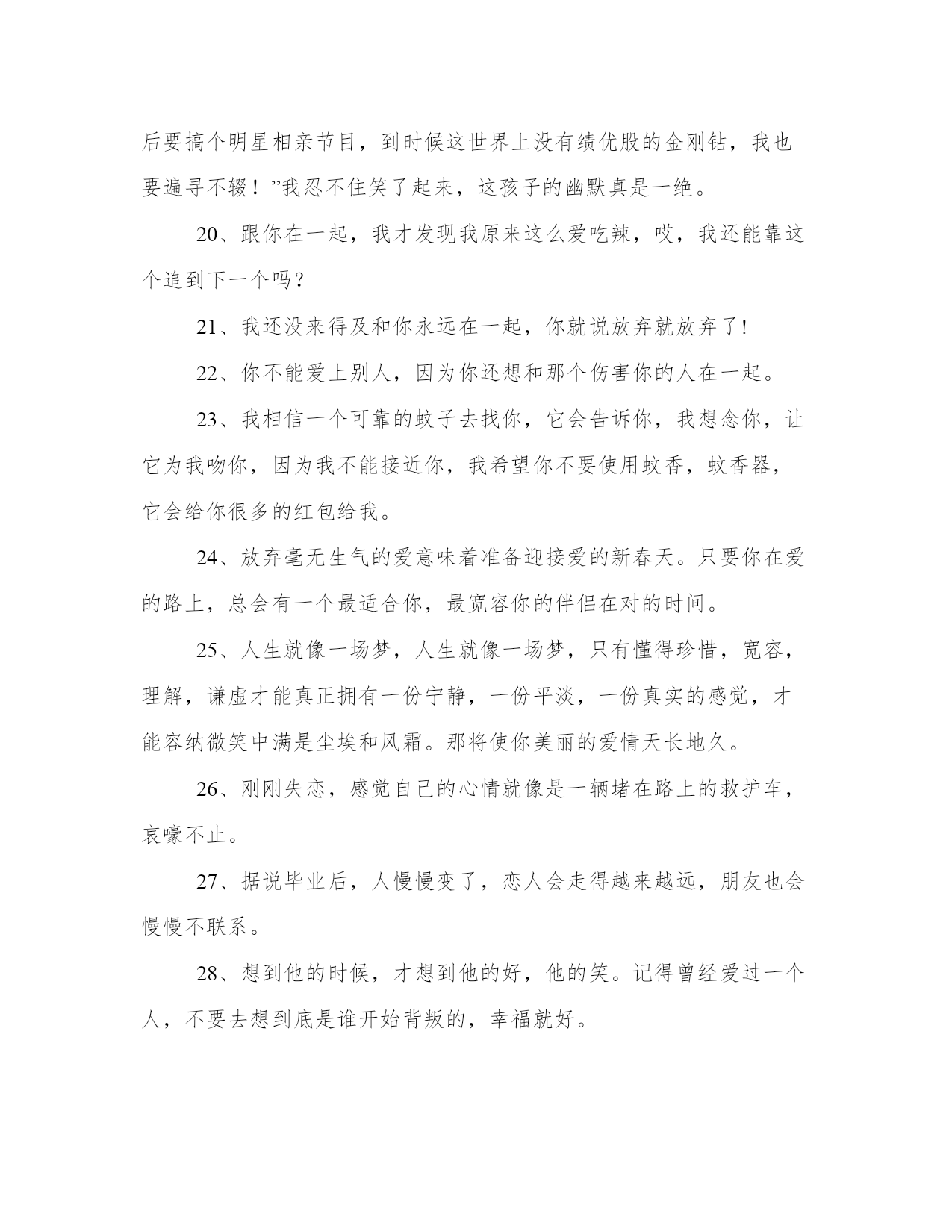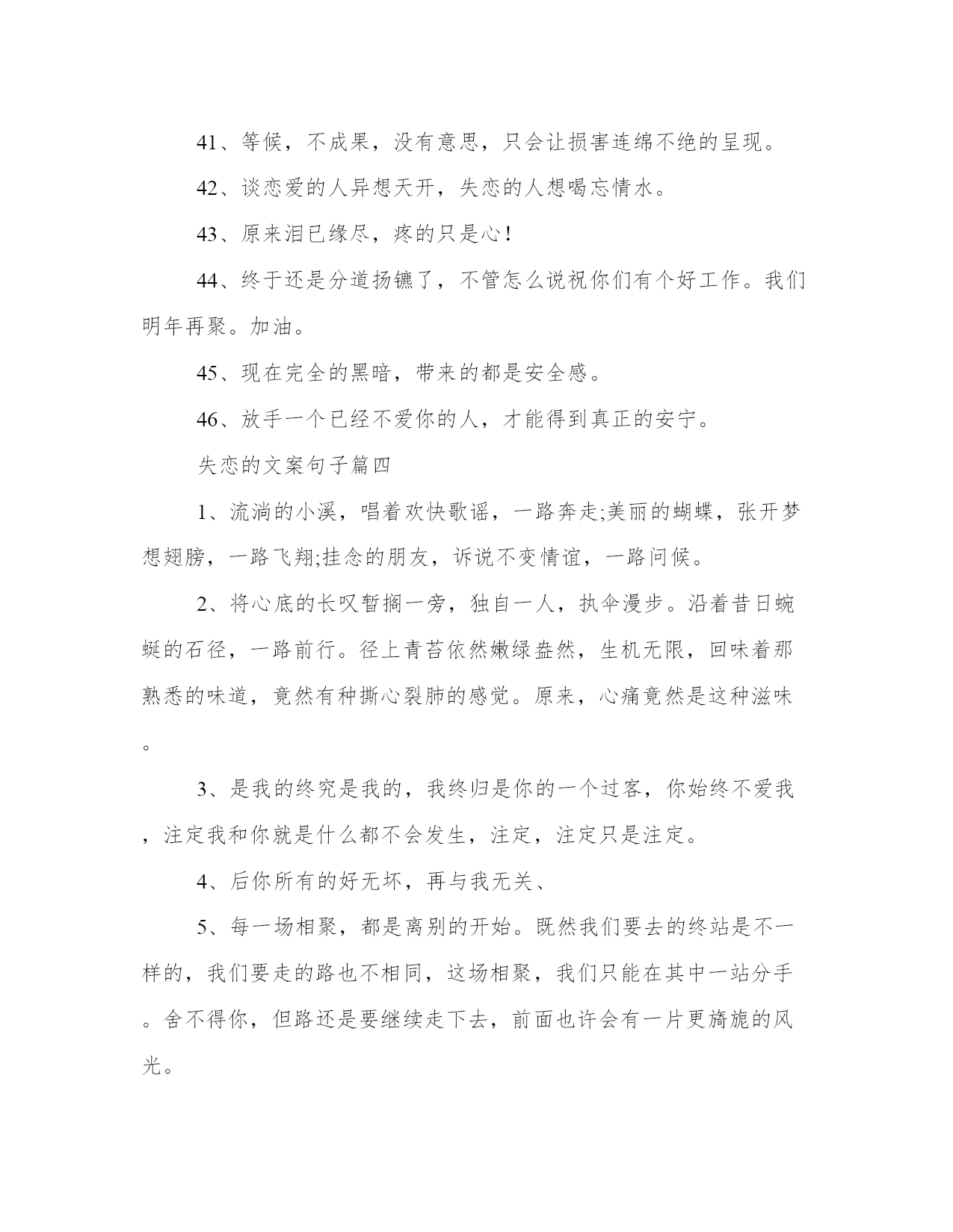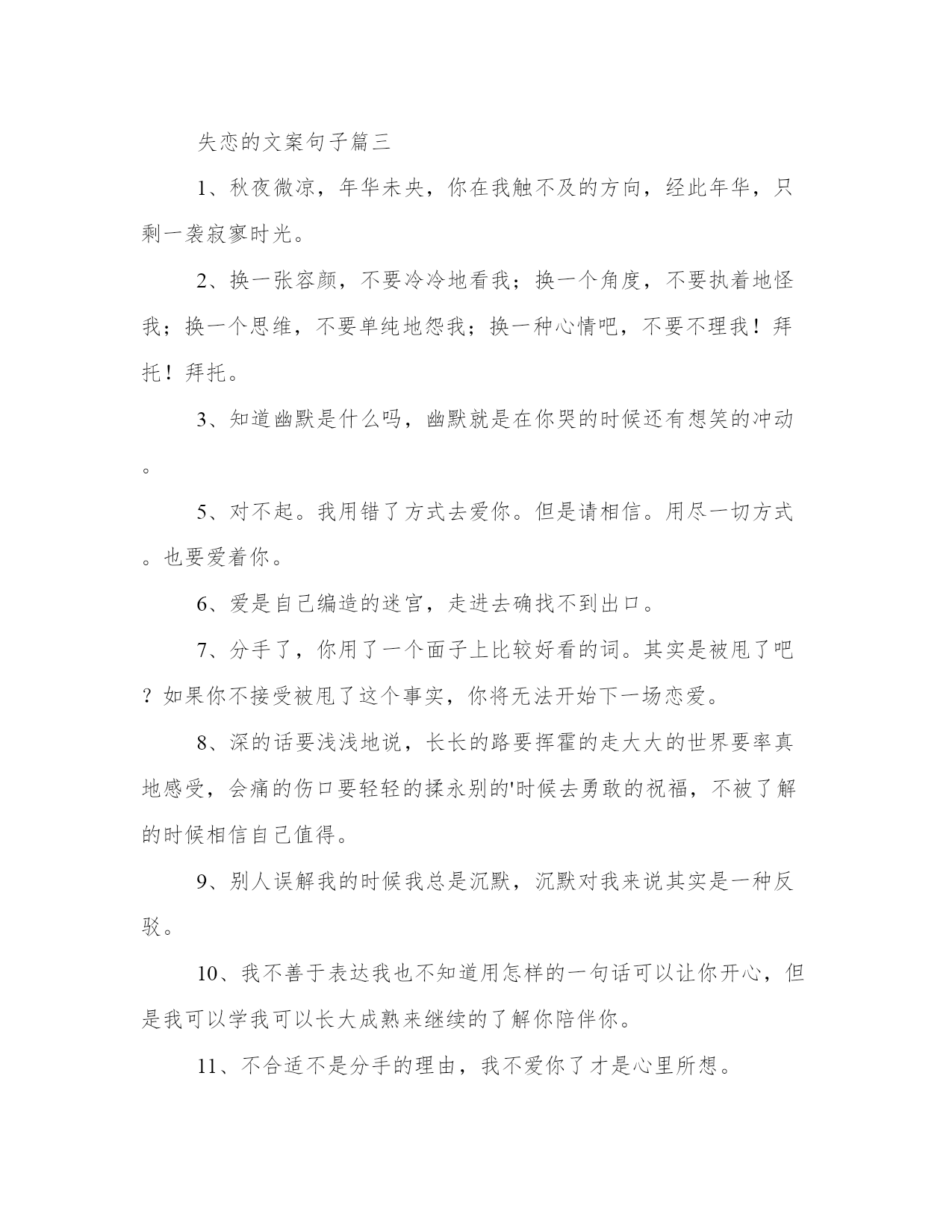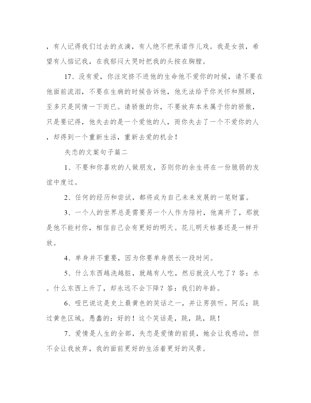 最新失恋的文案句子(通用19篇)无论是身处学校还是步入社会,大家都尝试过写作吧,借助写作也可以提高我们的语言组织能力。那么我们该如何写一篇较为完美的范文呢?下面是小编帮大家整理的优质范文,仅供参考,大家一起来看看吧。失恋的文案句子篇一1、爱情就是这样,她让我们何时何地都惦念着对方,如果惦念淡没了,消失了,爱情也就结束了。2、情断了,绑不住,试着放手,走与不走,留与不留,我不想懂。4、幸福,不是长生不老,不是大鱼大肉,不是权倾朝野。幸福是每一个微小的生活愿望达成。当你想吃的时候有得吃,想被爱的时候有人来爱你。5、如果可以选择的话,不要用恨来结束一段爱。6、如果一个人必须完成一件自己不喜欢的事,最好的办法就是尽快做好,然后结束。7、能牵手的时候,请别肩并肩,能拥抱的时候,请别手牵手,能相爱的时候,请别说分开;拥有了爱情,请别去碰暧昧。8、如果一个人感觉到自己已经饱和,已经胜券在握,就麻烦了。9、你的时间有限,所以不要为别人而活。不要被教条所限,不要活在别人的观念里。不要让别人的意见左右自己内心的声音。最重要的是,勇敢的去追随自己的心灵和直觉,只有自己的心灵和直觉才知道你自己的真实想法,其他一切都是次要。10、我想每个人刚刚来到这个世界的时候,都是单纯而善良的。不是我们不能坚守最初的纯净和美好,只是更多时候没有任何掩饰和防护的我们,被伤害了,知道痛了,才发现原来不是所有的微笑都能够换得尊重和拥抱。于是我们学着去适应,或者说学着改变,变的不再单纯,变的学会伪装,变得不再是最初的自己。11、我的世界有了你,我的生活一定会更加精彩。12、只有在爱情里面,女人才活得真正像个女人。13、爱情其实是一种习惯,你习惯生活中有他,他习惯生活中有你。拥有的时候不觉得什么,一旦失去,却仿佛失去了所有。14、快乐其实很简单:你和我,坐在一起说说笑笑,外加干点小傻事。15、茶喝三道,第一道,苦若生命;第二道,甜似爱情;第三道,淡若轻风。16、我是女孩,希望有人疼爱,有人包容,有人让我撒娇,有人能陪在我身边,有人喜欢带我逛街,有人乐意带我去他去的各种场合,并把我介绍给他的朋友。我是女孩,希望有人记得每天和我说晚安,有人记得我们过去的点滴,有人绝不把承诺作儿戏。我是女孩,希望有人惦记我,在我郁闷大哭时把我的头按在胸膛。17、没有爱,你注定挤不进他的生命他不爱你的时候,请不要在他面前流泪,不要在生病的时候告诉他,他无法给予你关怀和照顾,至多只是同情一下而已。请骄傲的你,不要放弃本来属于你的骄傲,只是要记得,他失去的是一个爱他的人,而你失去了一个不爱你的人,却得到一个重新生活,重新去爱的机会!失恋的文案句子篇二1、不要和你喜欢的人做朋友,否则你的余生将在一份脆弱的友谊中度过。2、任何的经历和尝试,都将成为自己未来发展的一笔财富。3、一个人的世界总是需要另一个人作为陪衬,他离开了,那就是他不能衬你,相信自己会有更好的明天。花儿明天枯萎还是一样开放。4、单身并不重要,因为你要单身很长一段时间。5、什么东西越洗越脏,就越有人吃,然后就没人吃了?答:水。什么东西上升了,却永远不会下降?答:我们的年龄。6、哑巴说这是史上最黄色的笑话之一,并让男孩听。阿瓜:跳过黄色区域。愚蠢的:好的!这个笑话是,跳,跳,跳!7、爱情是人生的全部,失恋是爱情的前提,她会让我感动,但不会让我放弃,我的面前更好的生活着更好的风景。8、你有这个能力么,有蓝翔技工学校的美发专业毕业证书么…。10、美丽的邂逅??一个失恋的'朋友说:其实不需要什么结果,有一场美丽的邂逅也会很幸福。11、没什么,难看分手很正常啊,再说你也没钱。12、神与怪物的区别不在于大小的权力、俊美与丑陋的外表、是否作恶,而在于存在着一种固定的身份。那些从玉皇大帝那里得到一份固定工作的人是神仙。相反,那些在临时工制度之外的人,必然是怪物。14、为什么暗恋那么好,因为暗恋从不失败。15、今天下雨,开车出去玩,路边一个水池,开快一点,溅兄弟一套水,我停了下来,想回到道歉,水泼他的西装,我有点不好意思,准备好了,溅他衣服的水,我看到货物拿起砖头,我跑开了。16、分手就分手,反正长得丑,不要做单身狗,做好同志朋友。17、失恋后最大的收获:我发现了自己原来已经瘦成了闪电侠了。18、失恋是每个人在生活中去体验,你现在应该很高兴就失去了旅行的生活而不是亲戚朋友,珍惜你所拥有的,不珍惜的记忆过去的情感,否则你只会在过去的记忆同时失去更多的命运。19、孩子失恋后,我安慰他说:“不要难过,感情的路上你还年轻,以后还有更好的机会。”他抬头看着我,满脸笑容:“没错,我以后要搞个明星相亲节目,到时候这世界上没有绩优股的金刚钻,我也要遍寻不辍!”我忍不住笑了起来,这孩子的幽默真是一绝。20