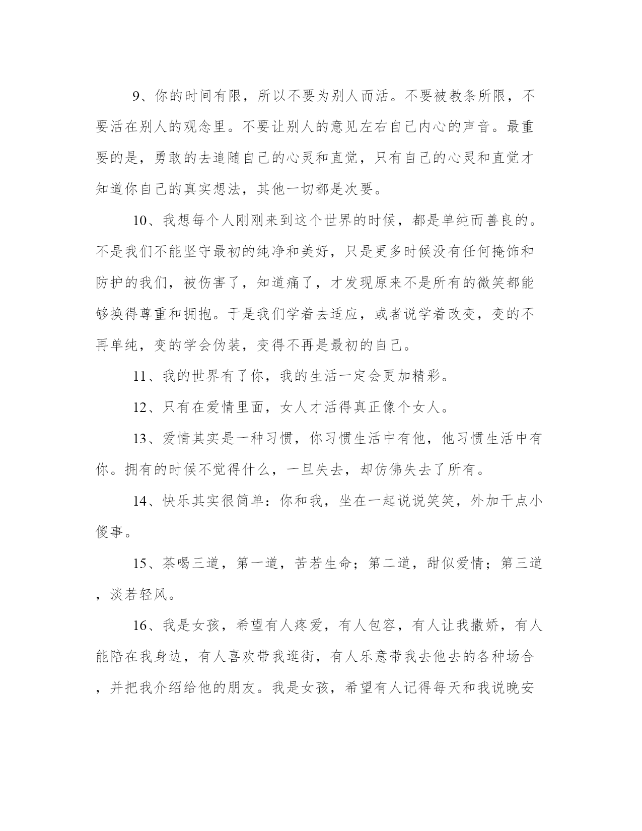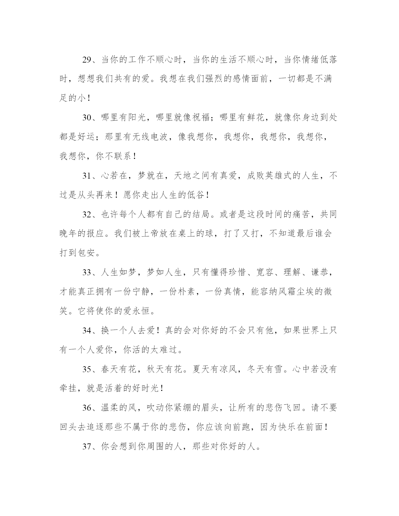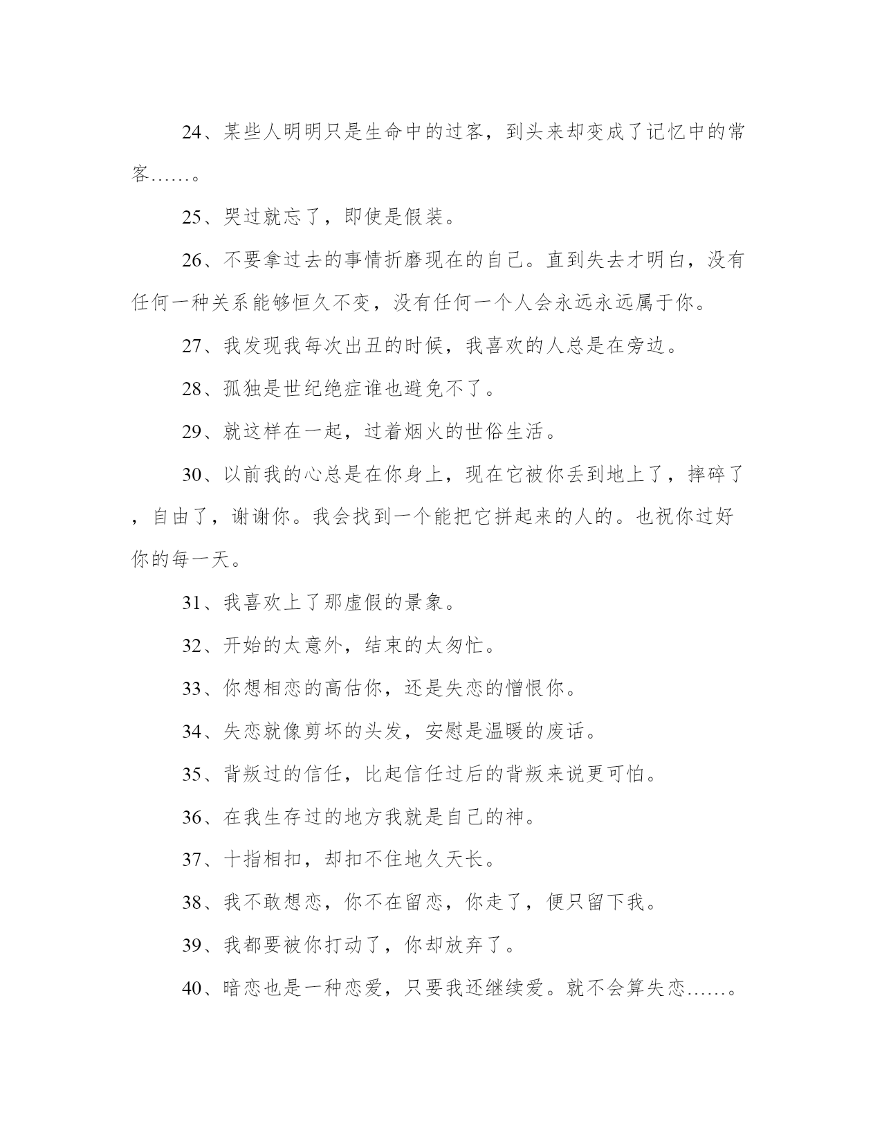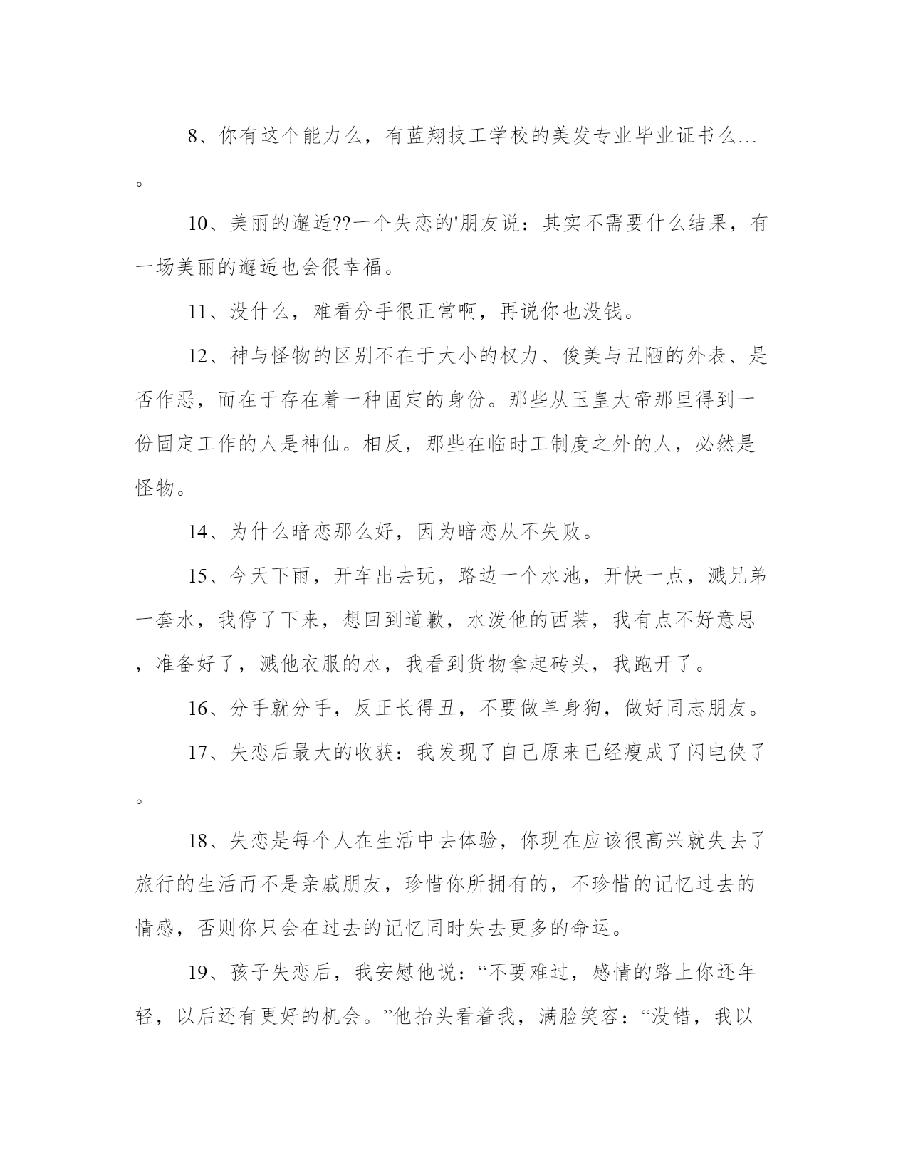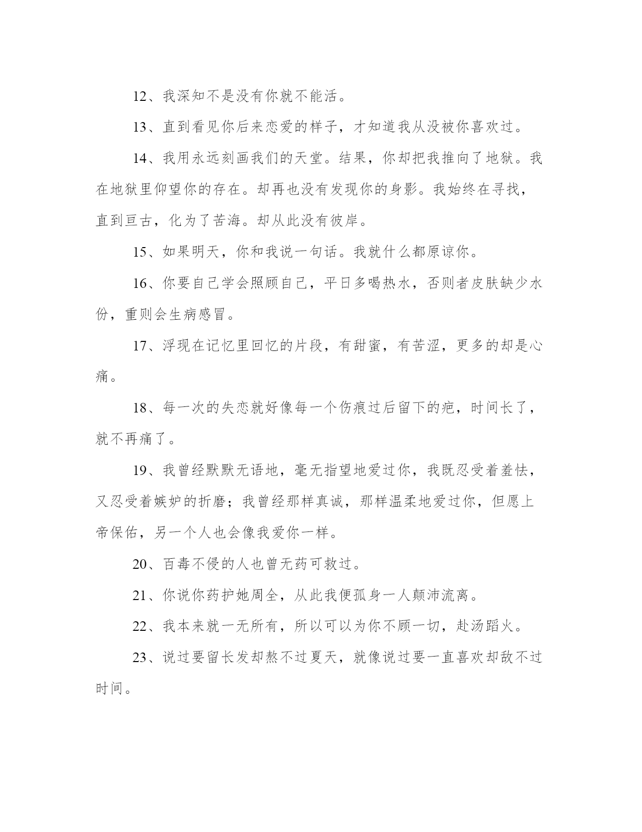 最新失恋的文案句子(通用19篇)无论是身处学校还是步入社会,大家都尝试过写作吧,借助写作也可以提高我们的语言组织能力。那么我们该如何写一篇较为完美的范文呢?下面是小编帮大家整理的优质范文,仅供参考,大家一起来看看吧。失恋的文案句子篇一1、爱情就是这样,她让我们何时何地都惦念着对方,如果惦念淡没了,消失了,爱情也就结束了。2、情断了,绑不住,试着放手,走与不走,留与不留,我不想懂。4、幸福,不是长生不老,不是大鱼大肉,不是权倾朝野。幸福是每一个微小的生活愿望达成。当你想吃的时候有得吃,想被爱的时候有人来爱你。5、如果可以选择的话,不要用恨来结束一段爱。6、如果一个人必须完成一件自己不喜欢的事,最好的办法就是尽快做好,然后结束。7、能牵手的时候,请别肩并肩,能拥抱的时候,请别手牵手,能相爱的时候,请别说分开;拥有了爱情,请别去碰暧昧。8、如果一个人感觉到自己已经饱和,已经胜券在握,就麻烦了。9、你的时间有限,所以不要为别人而活。不要被教条所限,不要活在别人的观念里。不要让别人的意见左右自己内心的声音。最重要的是,勇敢的去追随自己的心灵和直觉,只有自己的心灵和直觉才知道你自己的真实想法,其他一切都是次要。10、我想每个人刚刚来到这个世界的时候,都是单纯而善良的。不是我们不能坚守最初的纯净和美好,只是更多时候没有任何掩饰和防护的我们,被伤害了,知道痛了,才发现原来不是所有的微笑都能够换得尊重和拥抱。于是我们学着去适应,或者说学着改变,变的不再单纯,变的学会伪装,变得不再是最初的自己。11、我的世界有了你,我的生活一定会更加精彩。12、只有在爱情里面,女人才活得真正像个女人。13、爱情其实是一种习惯,你习惯生活中有他,他习惯生活中有你。拥有的时候不觉得什么,一旦失去,却仿佛失去了所有。14、快乐其实很简单:你和我,坐在一起说说笑笑,外加干点小傻事。15、茶喝三道,第一道,苦若生命;第二道,甜似爱情;第三道,淡若轻风。16、我是女孩,希望有人疼爱,有人包容,有人让我撒娇,有人能陪在我身边,有人喜欢带我逛街,有人乐意带我去他去的各种场合,并把我介绍给他的朋友。我是女孩,希望有人记得每天和我说晚安,有人记得我们过去的点滴,有人绝不把承诺作儿戏。我是女孩,希望有人惦记我,在我郁闷大哭时把我的头按在胸膛。17、没有爱,你注定挤不进他的生命他不爱你的时候,请不要在他面前流泪,不要在生病的时候告诉他,他无法给予你关怀和照顾,至多只是同情一下而已。请骄傲的你,不要放弃本来属于你的骄傲,只是要记得,他失去的是一个爱他的人,而你失去了一个不爱你的人,却得到一个重新生活,重新去爱的机会!失恋的文案句子篇二1、不要和你喜欢的人做朋友,否则你的余生将在一份脆弱的友谊中度过。2、任何的经历和尝试,都将成为自己未来发展的一笔财富。3、一个人的世界总是需要另一个人作为陪衬,他离开了,那就是他不能衬你,相信自己会有更好的明天。花儿明天枯萎还是一样开放。4、单身并不重要,因为你要单身很长一段时间。5、什么东西越洗越脏,就越有人吃,然后就没人吃了?答:水。什么东西上升了,却永远不会下降?答:我们的年龄。6、哑巴说这是史上最黄色的笑话之一,并让男孩听。阿瓜:跳过黄色区域。愚蠢的:好的!这个笑话是,跳,跳,跳!7、爱情是人生的全部,失恋是爱情的前提,她会让我感动,但不会让我放弃,我的面前更好的生活着更好的风景。8、你有这个能力么,有蓝翔技工学校的美发专业毕业证书么…。10、美丽的邂逅??一个失恋的'朋友说:其实不需要什么结果,有一场美丽的邂逅也会很幸福。11、没什么,难看分手很正常啊,再说你也没钱。12、神与怪物的区别不在于大小的权力、俊美与丑陋的外表、是否作恶,而在于存在着一种固定的身份。那些从玉皇大帝那里得到一份固定工作的人是神仙。相反,那些在临时工制度之外的人,必然是怪物。14、为什么暗恋那么好,因为暗恋从不失败。15、今天下雨,开车出去玩,路边一个水池,开快一点,溅兄弟一套水,我停了下来,想回到道歉,水泼他的西装,我有点不好意思,准备好了,溅他衣服的水,我看到货物拿起砖头,我跑开了。16、分手就分手,反正长得丑,不要做单身狗,做好同志朋友。17、失恋后最大的收获:我发现了自己原来已经瘦成了闪电侠了。18、失恋是每个人在生活中去体验,你现在应该很高兴就失去了旅行的生活而不是亲戚朋友,珍惜你所拥有的,不珍惜的记忆过去的情感,否则你只会在过去的记忆同时失去更多的命运。19、孩子失恋后,我安慰他说:“不要难过,感情的路上你还年轻,以后还有更好的机会。”他抬头看着我,满脸笑容:“没错,我以后要搞个明星相亲节目,到时候这世界上没有绩优股的金刚钻,我也要遍寻不辍!”我忍不住笑了起来,这孩子的幽默真是一绝。20