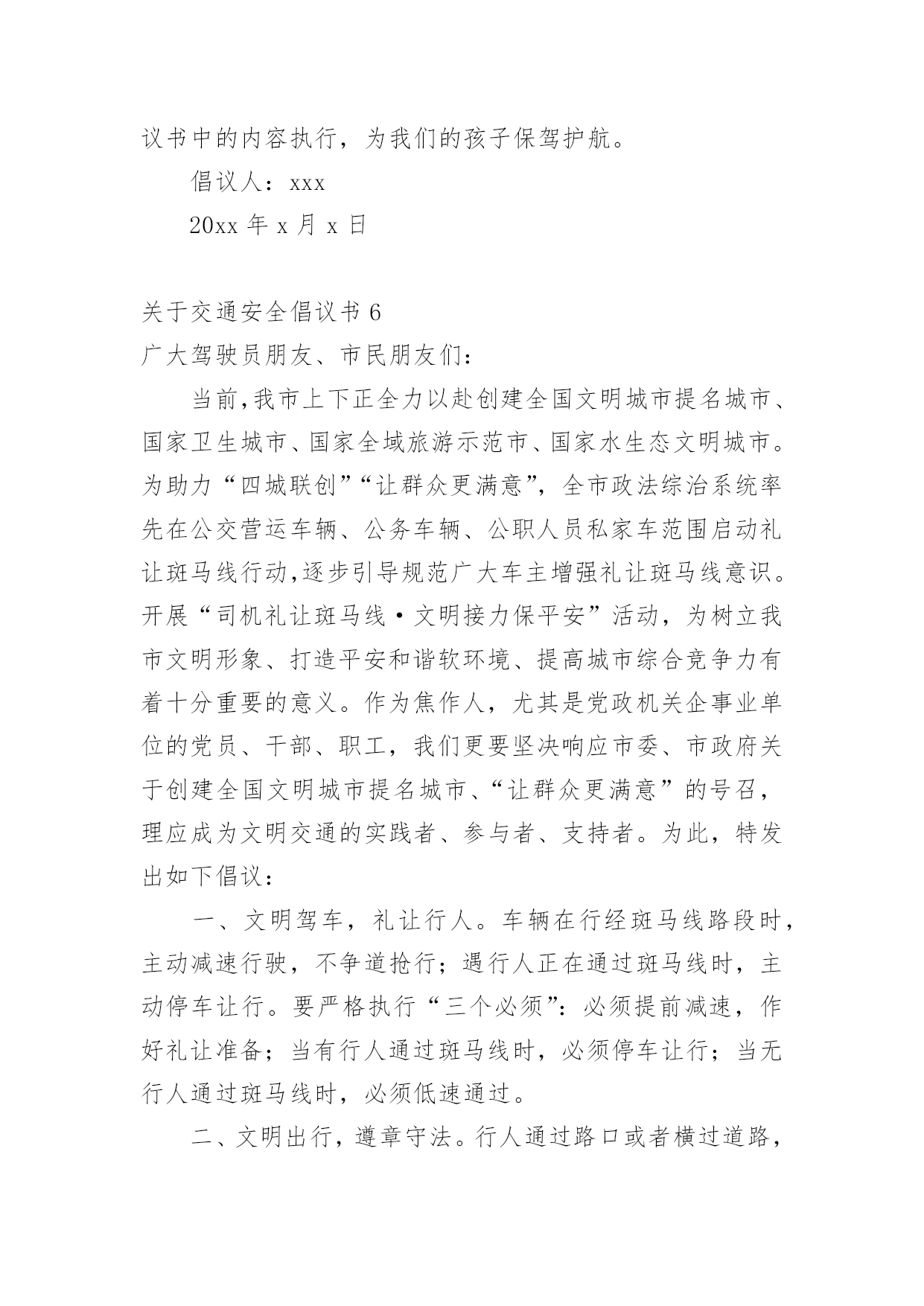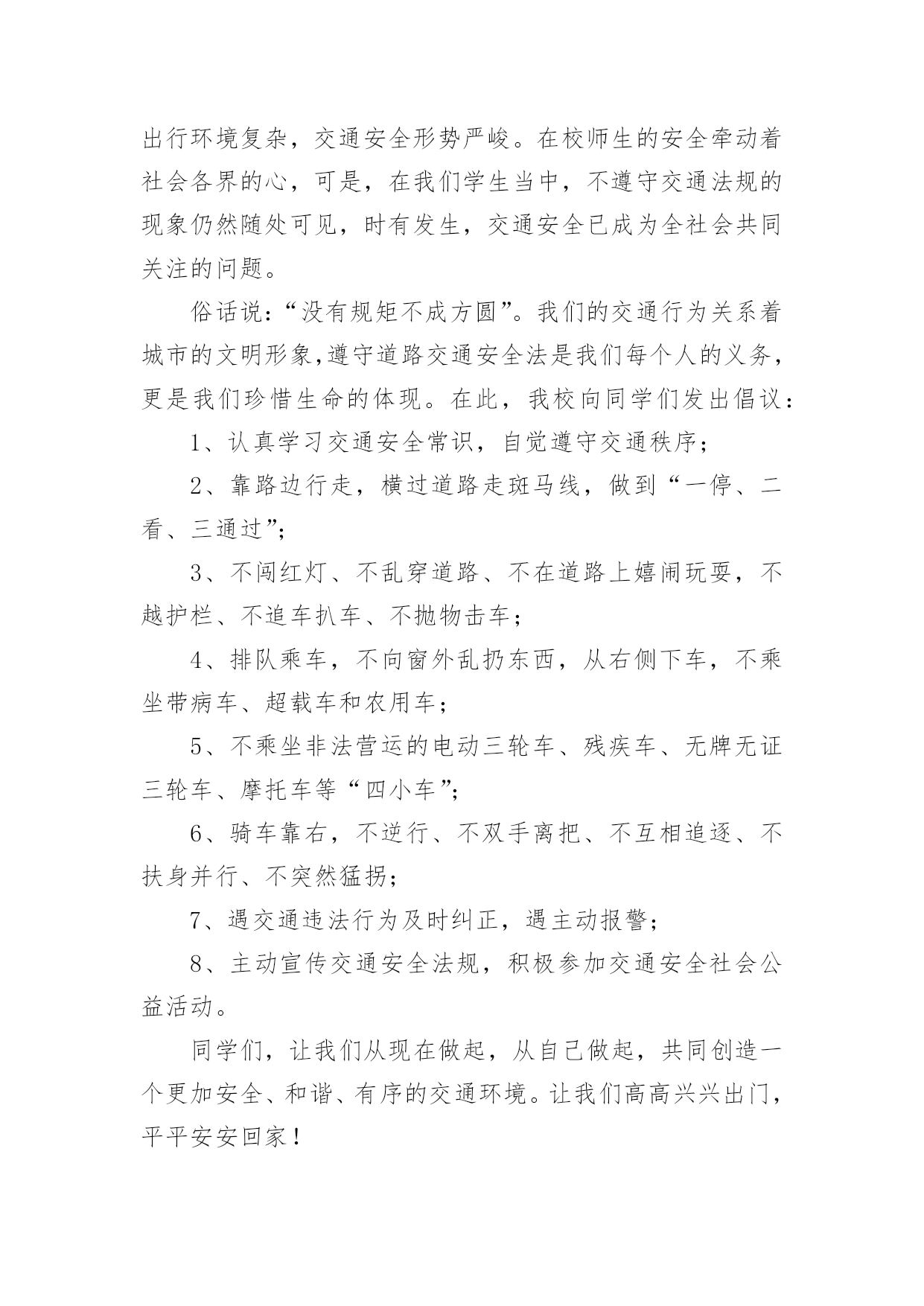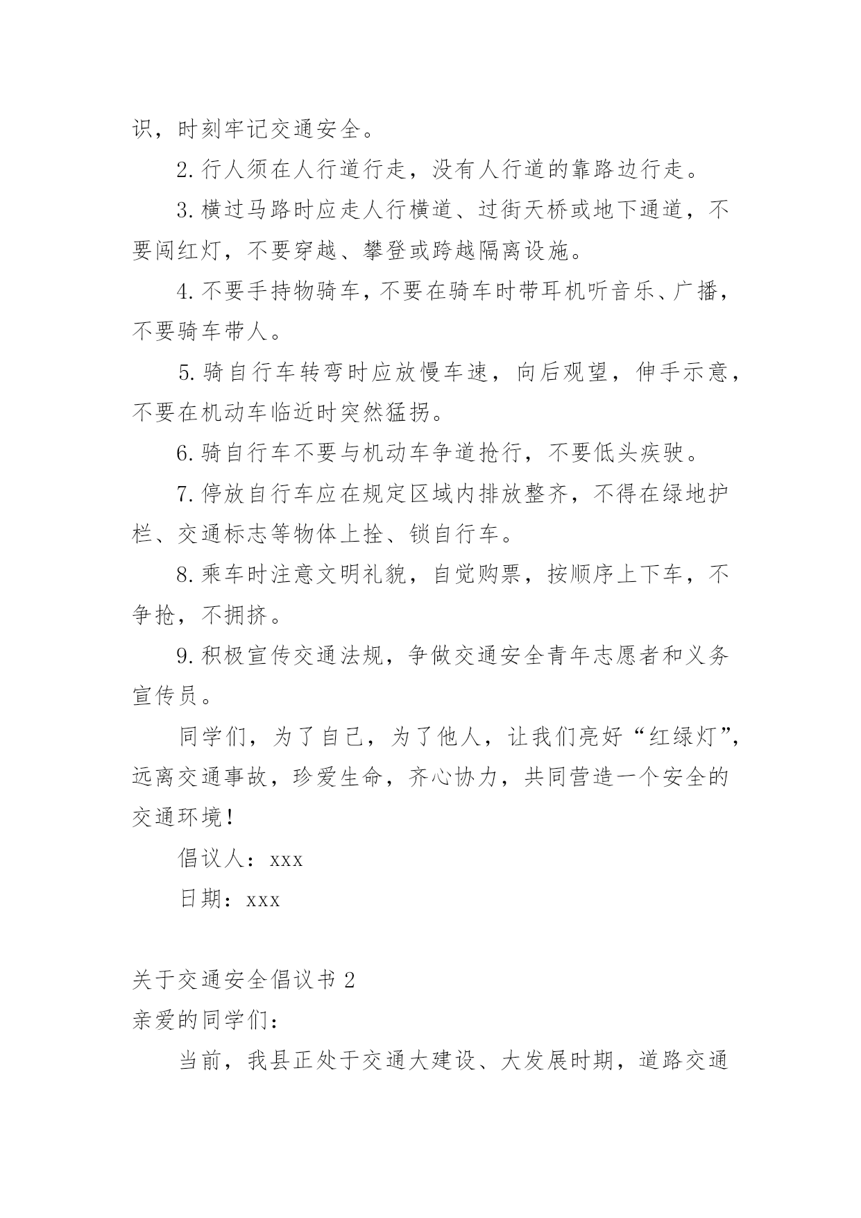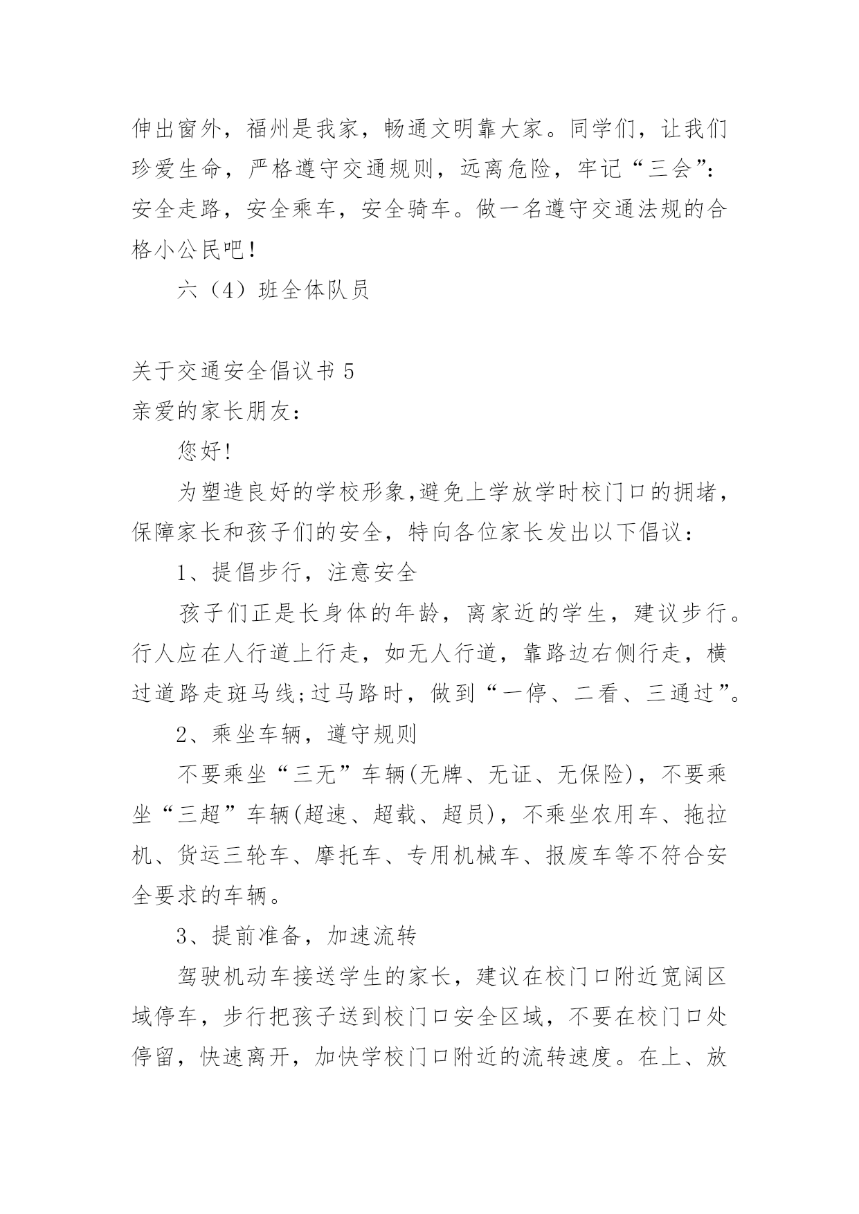 交通安全倡议书关于交通安全倡议书(集合15篇)在社会一步步向前发展的今天,倡议书与我们的生活息息相关,倡议书是由某一组织或社团拟定、就某事向社会提出建议或提议社会成员共同去做某事的书面文章。相信许多人会觉得倡议书很难写吧,以下是小编帮大家整理的关于交通安全倡议书,欢迎阅读与收藏。关于交通安全倡议书1亲爱的同学们:当我们背起行囊,肩负着家人的希望,怀揣着对未来的美好蓝图,从五湖四海汇聚到祖国的首都北京时,当我们漫步于人来人往的宽阔街道时,常会慨叹这座城市的美丽与繁华。但您是否注意到隐藏在交通线上的危险呢?一组组惊人的数字、一幕幕惨不忍睹的画面、一个个载着锥心伤痛却又一去不返的年轻生命,这一切的矛头不约而同地指向了共同的事实,不遵守交通法规等同于不珍爱自己的生命。我们拥有年轻的身躯、远大的志向,却往往会忽略交通安全这种“小事”;我们谈理想、谈报国,却常常忽视“珍爱生命”这一底线。遵守交通规则不仅仅是我们所有人的义务,更是我们不可推卸的责任。为了远离血腥和悲痛,远离伤痕和担忧,我们发出如下倡议:1.来源:范文大全认真学习交通法规,增强交通安全意识,时刻牢记交通安全。2.行人须在人行道行走,没有人行道的靠路边行走。3.横过马路时应走人行横道、过街天桥或地下通道,不要闯红灯,不要穿越、攀登或跨越隔离设施。4.不要手持物骑车,不要在骑车时带耳机听音乐、广播,不要骑车带人。5.骑自行车转弯时应放慢车速,向后观望,伸手示意,不要在机动车临近时突然猛拐。6.骑自行车不要与机动车争道抢行,不要低头疾驶。7.停放自行车应在规定区域内排放整齐,不得在绿地护栏、交通标志等物体上拴、锁自行车。8.乘车时注意文明礼貌,自觉购票,按顺序上下车,不争抢,不拥挤。9.积极宣传交通法规,争做交通安全青年志愿者和义务宣传员。同学们,为了自己,为了他人,让我们亮好“红绿灯”,远离交通事故,珍爱生命,齐心协力,共同营造一个安全的交通环境!倡议人:xxx日期:xxx关于交通安全倡议书2亲爱的同学们:当前,我县正处于交通大建设、大发展时期,道路交通出行环境复杂,交通安全形势严峻。在校师生的安全牵动着社会各界的心,可是,在我们学生当中,不遵守交通法规的现象仍然随处可见,时有发生,交通安全已成为全社会共同关注的问题。俗话说:“没有规矩不成方圆”。我们的交通行为关系着城市的文明形象,遵守道路交通安全法是我们每个人的义务,更是我们珍惜生命的体现。在此,我校向同学们发出倡议:1、认真学习交通安全常识,自觉遵守交通秩序;2、靠路边行走,横过道路走斑马线,做到“一停、二看、三通过”;3、不闯红灯、不乱穿道路、不在道路上嬉闹玩耍,不越护栏、不追车扒车、不抛物击车;4、排队乘车,不向窗外乱扔东西,从右侧下车,不乘坐带病车、超载车和农用车;5、不乘坐非法营运的电动三轮车、残疾车、无牌无证三轮车、摩托车等“四小车”;6、骑车靠右,不逆行、不双手离把、不互相追逐、不扶身并行、不突然猛拐;7、遇交通违法行为及时纠正,遇主动报警;8、主动宣传交通安全法规,积极参加交通安全社会公益活动。同学们,让我们从现在做起,从自己做起,共同创造一个更加安全、和谐、有序的交通环境。让我们高高兴兴出门,平平安安回家!关于交通安全倡议书3为了进一步推动“关爱生命,文明出行”文明交通行动,增强公司广大干部职工的文明交通意识,公司决定向广大干部职工发出如下倡议:1、交通事关上海这座大都市形象,事关市民群众的切身利益,公司广大干部职工要认真学习《道路交通安全法》及相关法规,主动做好身边亲属、朋友的宣传引导工作,争做学法懂法的表率。2、整治交通拥堵是实实在在排民忧、解民难,提高市民群众幸福指数的具体行动,公司广大干部职工要不开“英雄车”、“堵气车”,不开无证无牌车、报废车、非法拼装车,不酒后驾车、疲劳驾驶、违规停车、违规超车、闯灯逆行,自觉遵守道路交通安全法规,争做遵法守法的表率。3、交通安全关系千家万户,文明交通靠大家共同维护。公司广大干部职工要以身作则,倡导节能环保、低碳生活的绿色健康生活理念,少开车、多走路、不添堵。积极加入文明交通志愿者队伍,参与文明交通公益活动;热情劝阻不文明交通行为,主动纠正交通违法者,叫响“跟我排”,争当志愿者服务的表率。治堵缓堵是考量一个城市管理水平和文明程度的重要标志,而保持良好的交通秩序则是上海这座国际化大都市的重要内容。相信拥有安全、畅通、和谐、有序的交通环境是大家的共同心愿。文明礼让,从我先行。让我们携起手来,从我做起,从现在做起,关爱生命,文明出行,对自己负责,对他人负责,对社会负责,发挥公司广大干部职工的示范带动作用,共同打造文明安全、畅通有序的交通环境,为徐汇区早日迈入全国文明城区行列争做贡献。倡议人:xxx20xx年xx月xx日关于交通安全倡议书4同学们:你们知道吗,近年来,中