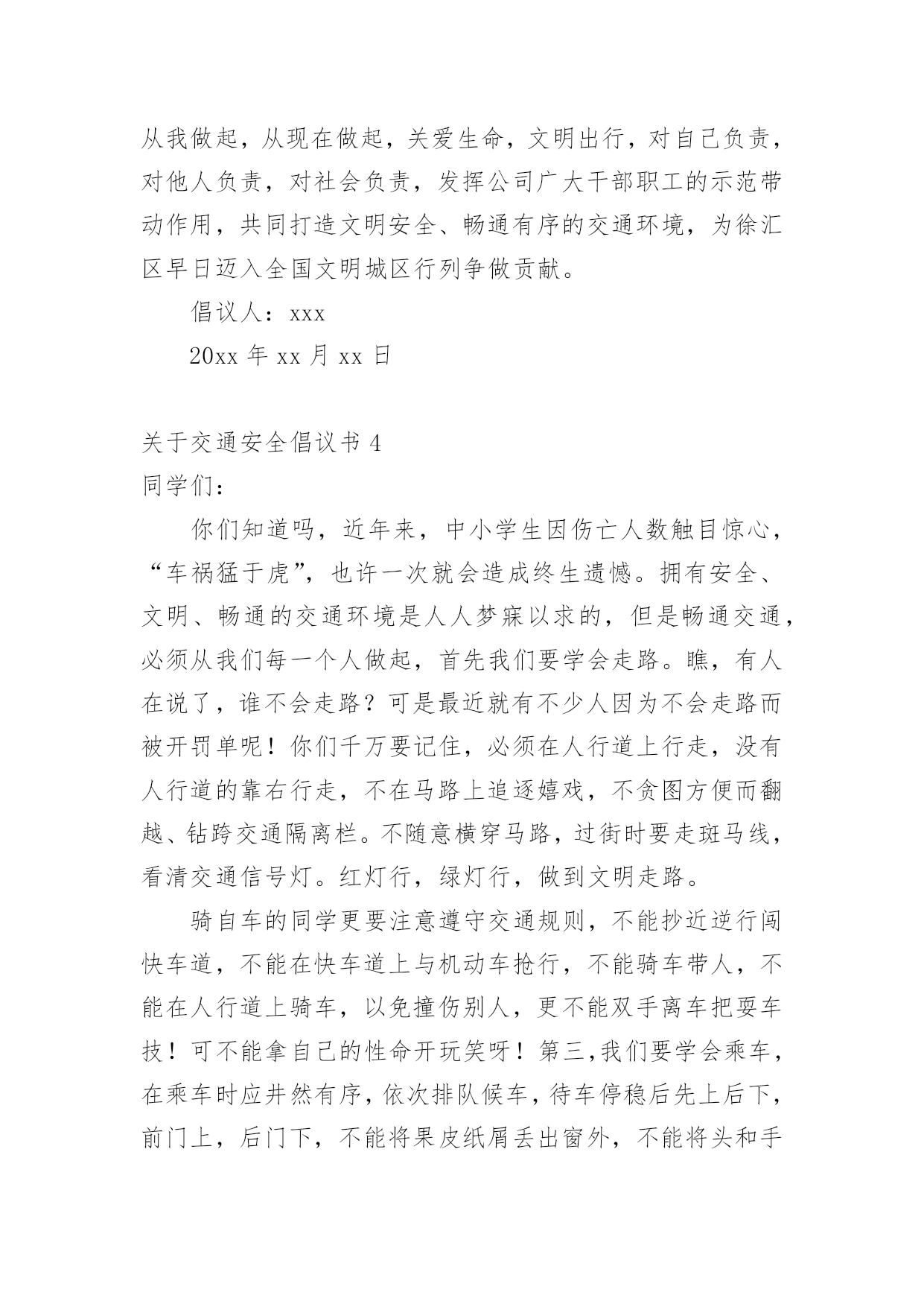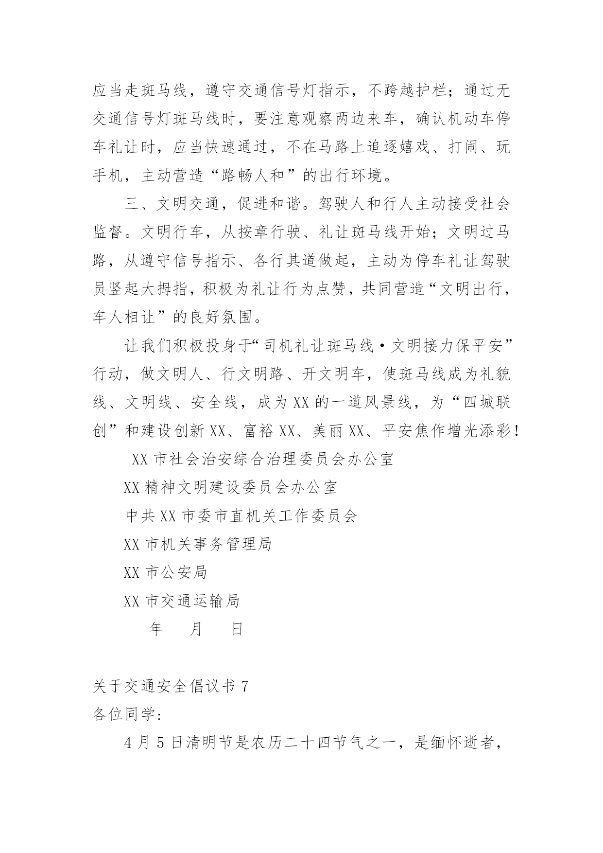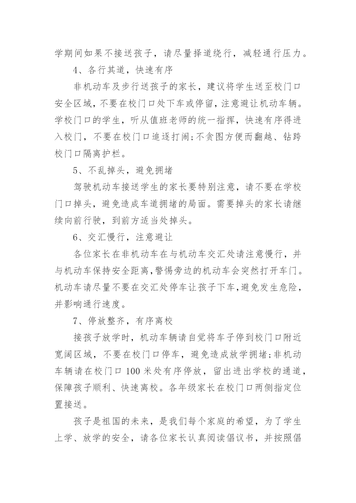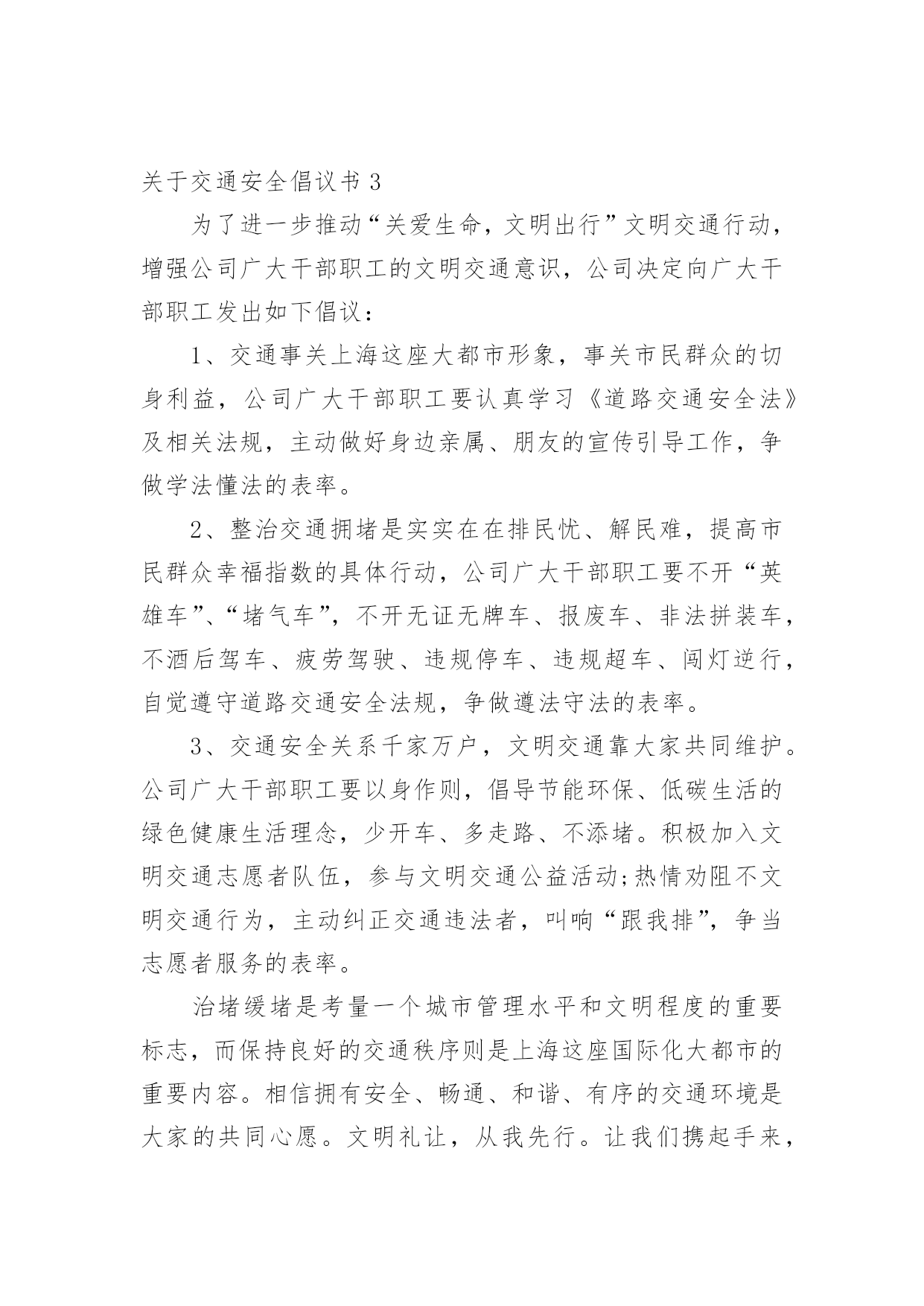 交通安全倡议书关于交通安全倡议书(集合15篇)在社会一步步向前发展的今天,倡议书与我们的生活息息相关,倡议书是由某一组织或社团拟定、就某事向社会提出建议或提议社会成员共同去做某事的书面文章。相信许多人会觉得倡议书很难写吧,以下是小编帮大家整理的关于交通安全倡议书,欢迎阅读与收藏。关于交通安全倡议书1亲爱的同学们:当我们背起行囊,肩负着家人的希望,怀揣着对未来的美好蓝图,从五湖四海汇聚到祖国的首都北京时,当我们漫步于人来人往的宽阔街道时,常会慨叹这座城市的美丽与繁华。但您是否注意到隐藏在交通线上的危险呢?一组组惊人的数字、一幕幕惨不忍睹的画面、一个个载着锥心伤痛却又一去不返的年轻生命,这一切的矛头不约而同地指向了共同的事实,不遵守交通法规等同于不珍爱自己的生命。我们拥有年轻的身躯、远大的志向,却往往会忽略交通安全这种“小事”;我们谈理想、谈报国,却常常忽视“珍爱生命”这一底线。遵守交通规则不仅仅是我们所有人的义务,更是我们不可推卸的责任。为了远离血腥和悲痛,远离伤痕和担忧,我们发出如下倡议:1.来源:范文大全认真学习交通法规,增强交通安全意识,时刻牢记交通安全。2.行人须在人行道行走,没有人行道的靠路边行走。3.横过马路时应走人行横道、过街天桥或地下通道,不要闯红灯,不要穿越、攀登或跨越隔离设施。4.不要手持物骑车,不要在骑车时带耳机听音乐、广播,不要骑车带人。5.骑自行车转弯时应放慢车速,向后观望,伸手示意,不要在机动车临近时突然猛拐。6.骑自行车不要与机动车争道抢行,不要低头疾驶。7.停放自行车应在规定区域内排放整齐,不得在绿地护栏、交通标志等物体上拴、锁自行车。8.乘车时注意文明礼貌,自觉购票,按顺序上下车,不争抢,不拥挤。9.积极宣传交通法规,争做交通安全青年志愿者和义务宣传员。同学们,为了自己,为了他人,让我们亮好“红绿灯”,远离交通事故,珍爱生命,齐心协力,共同营造一个安全的交通环境!倡议人:xxx日期:xxx关于交通安全倡议书2亲爱的同学们:当前,我县正处于交通大建设、大发展时期,道路交通出行环境复杂,交通安全形势严峻。在校师生的安全牵动着社会各界的心,可是,在我们学生当中,不遵守交通法规的现象仍然随处可见,时有发生,交通安全已成为全社会共同关注的问题。俗话说:“没有规矩不成方圆”。我们的交通行为关系着城市的文明形象,遵守道路交通安全法是我们每个人的义务,更是我们珍惜生命的体现。在此,我校向同学们发出倡议:1、认真学习交通安全常识,自觉遵守交通秩序;2、靠路边行走,横过道路走斑马线,做到“一停、二看、三通过”;3、不闯红灯、不乱穿道路、不在道路上嬉闹玩耍,不越护栏、不追车扒车、不抛物击车;4、排队乘车,不向窗外乱扔东西,从右侧下车,不乘坐带病车、超载车和农用车;5、不乘坐非法营运的电动三轮车、残疾车、无牌无证三轮车、摩托车等“四小车”;6、骑车靠右,不逆行、不双手离把、不互相追逐、不扶身并行、不突然猛拐;7、遇交通违法行为及时纠正,遇主动报警;8、主动宣传交通安全法规,积极参加交通安全社会公益活动。同学们,让我们从现在做起,从自己做起,共同创造一个更加安全、和谐、有序的交通环境。让我们高高兴兴出门,平平安安回家!关于交通安全倡议书3为了进一步推动“关爱生命,文明出行”文明交通行动,增强公司广大干部职工的文明交通意识,公司决定向广大干部职工发出如下倡议:1、交通事关上海这座大都市形象,事关市民群众的切身利益,公司广大干部职工要认真学习《道路交通安全法》及相关法规,主动做好身边亲属、朋友的宣传引导工作,争做学法懂法的表率。2、整治交通拥堵是实实在在排民忧、解民难,提高市民群众幸福指数的具体行动,公司广大干部职工要不开“英雄车”、“堵气车”,不开无证无牌车、报废车、非法拼装车,不酒后驾车、疲劳驾驶、违规停车、违规超车、闯灯逆行,自觉遵守道路交通安全法规,争做遵法守法的表率。3、交通安全关系千家万户,文明交通靠大家共同维护。公司广大干部职工要以身作则,倡导节能环保、低碳生活的绿色健康生活理念,少开车、多走路、不添堵。积极加入文明交通志愿者队伍,参与文明交通公益活动;热情劝阻不文明交通行为,主动纠正交通违法者,叫响“跟我排”,争当志愿者服务的表率。治堵缓堵是考量一个城市管理水平和文明程度的重要标志,而保持良好的交通秩序则是上海这座国际化大都市的重要内容。相信拥有安全、畅通、和谐、有序的交通环境是大家的共同心愿。文明礼让,从我先行。让我们携起手来,从我做起,从现在做起,关爱生命,文明出行,对自己负责,对他人负责,对社会负责,发挥公司广大干部职工的示范带动作用,共同打造文明安全、畅通有序的交通环境,为徐汇区早日迈入全国文明城区行列争做贡献。倡议人:xxx20xx年xx月xx日关于交通安全倡议书4同学们:你们知道吗,近年来,中