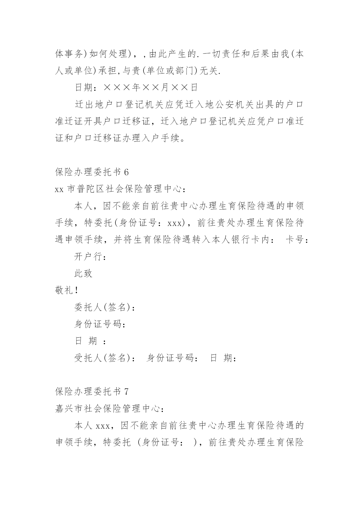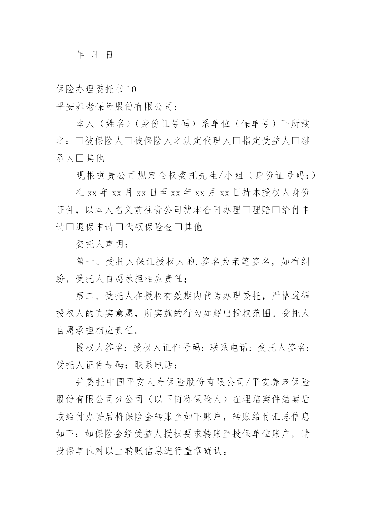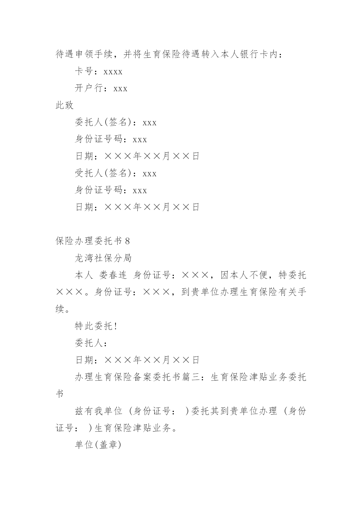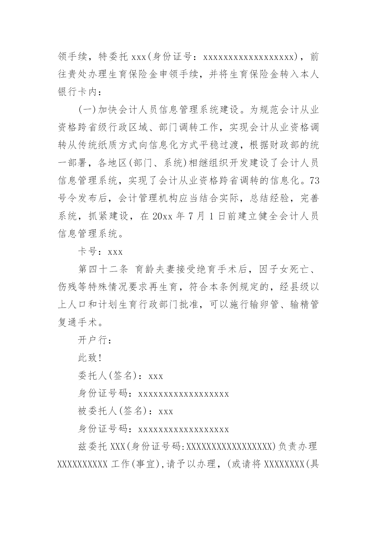 保险办理委托书被委托人如果没有做出违背国家法律的任何权益,委托人无有权终止委托协议。在社会发展不断提速的今天,我们在许多事务中都可能会用到委托书,相信很多朋友都对写委托书感到非常苦恼吧,以下是小编为大家收集的保险办理委托书,希望对大家有所帮助。保险办理委托书1市社会保险基金管理中心:兹委托同志前来办理参保人(姓名:,身份证号码:,保险编号:)的有关社会保险待遇(待遇项目:)申领手续。委托人签名:身份证号码:联系人电话:与参保人关系:20xx年xx月xx日注:受托人需同时携带身份证原件、委托人身份证复印件和相关业务材料。保险办理委托书2尊敬的`太平人寿保险股份有限公司________分公司:本人________委托________(*号码:__________________)在____年__月__日至____年__月__日期间代为办理保险退保事宜(保单号:____________________)本人同意款项通过银行转账方式进行领取和支付,转账账户信息如下:开户银行_____________________账户名______________________结算账号_________________________________________________本人/本公司已知晓,委托第三方办理退保事宜可能产生资金安全及其他法律风险,本人/本公司在此确认,受托人在贵公司为本人/本公司代办的退保、收款业务及受托人签字的任何协议均视为本人的行为,由此产生的一切后果和责任均由本人承担。授权人签名:_________________________*件类型:_________有效*件号码:________________________保险办理委托书3xx市社会保险基金管理中心:兹委托xx同事前来办理参保人(姓名:xx,身份证号码:xx,保险编号:xxxx)的有关社会保险待遇(待遇项目:xx)申领手续。委托人签名:身份证号码:联系人电话:与参保人关系:xx年xx月xx日保险办理委托书4嘉兴市社会保险管理中心:本人,因不能亲自前往贵中心办理生育保险待遇的申领手续,特委托________,身份证号:________,前往贵处办理生育保险待遇申领手续,并将生育保险待遇转入本人银行卡内:卡号:________开户行:________此致敬礼委托人(签名):________身份证号码:________日期:____年____月____日受托人(签名):________身份证号码:________日期:____年____月____日保险办理委托书5xx区社会保险管理中心:本人xx,因不能亲自前往贵中心办理生育保险待遇的申领手续,特委托xxx(身份证号:xxxxxxxxxxxxxxxxxx),前往贵处办理生育保险金申领手续,并将生育保险金转入本人银行卡内:(一)加快会计人员信息管理系统建设。为规范会计从业资格跨省级行政区域、部门调转工作,实现会计从业资格调转从传统纸质方式向信息化方式平稳过渡,根据财政部的统一部署,各地区(部门、系统)相继组织开发建设了会计人员信息管理系统,实现了会计从业资格跨省调转的信息化。73号令发布后,会计管理机构应当结合实际,总结经验,完善系统,抓紧建设,在20xx年7月1日前建立健全会计人员信息管理系统。卡号:xxx第四十二条育龄夫妻接受绝育手术后,因子女死亡、伤残等特殊情况要求再生育,符合本条例规定的,经县级以上人口和计划生育行政部门批准,可以施行输卵管、输精管复通手术。开户行:此致!委托人(签名):xxx身份证号码:xxxxxxxxxxxxxxxxxx被委托人(签名):xxx身份证号码:xxxxxxxxxxxxxxxxxx兹委托XXX(身份证号码:XXXXXXXXXXXXXXXXX)负责办理XXXXXXXXXX工作(事宜),请予以办理,(或请将XXXXXXXX(具体事务)如何处理),,由此产生的.一切责任和后果由我(本人或单位)承担,与贵(单位或部门)无关.日期:×××年××月××日迁出地户口登记机关应凭迁入地公安机关出具的户口准迁证开具户口迁移证,迁入地户口登记机关应凭户口准迁证和户口迁移证办理入户手续。保险办理委托书6xx市普陀区社会保险管理中心:本人,因不能亲自前往贵中心办理生育保险待遇的申领手续,特委托(身份证号:xxx),前往贵处办理生育保险待遇申领手续,并将生育保险待遇转入本人银行卡内:卡号:开户行:此致敬礼!委托人(签名):身份证号码:日期:受托人(签名):身份证号码:日期:保险办理委托书7嘉兴市社会保险管理中心:本人xxx,因不能亲自前往贵中心办理生育保险待遇的申领手续,特委托(身份证号:),前往贵处办理生育保险待遇申领手续,并将生育保险待遇转入本人银行卡内:卡号:xxxx开户行:xxx此致委托人(签
