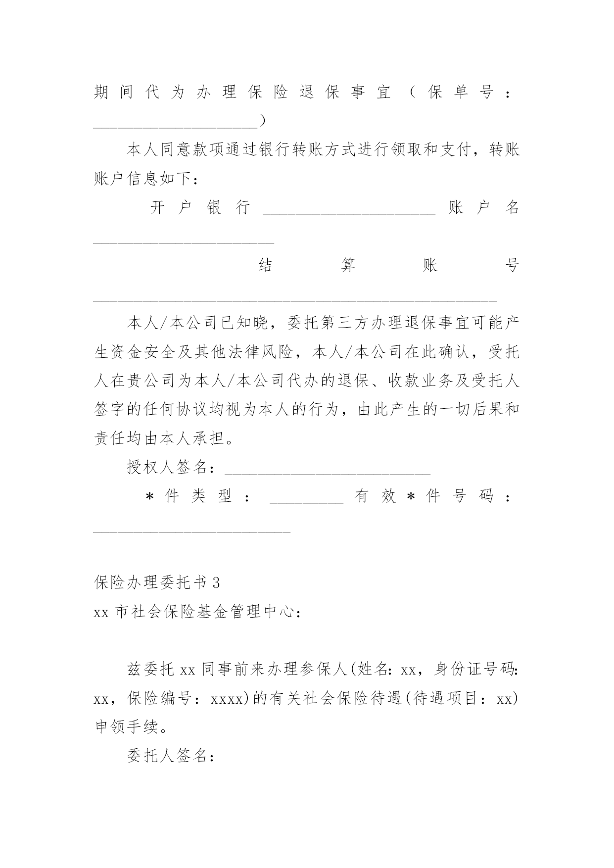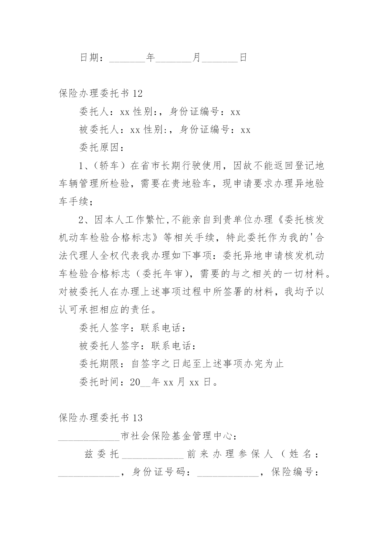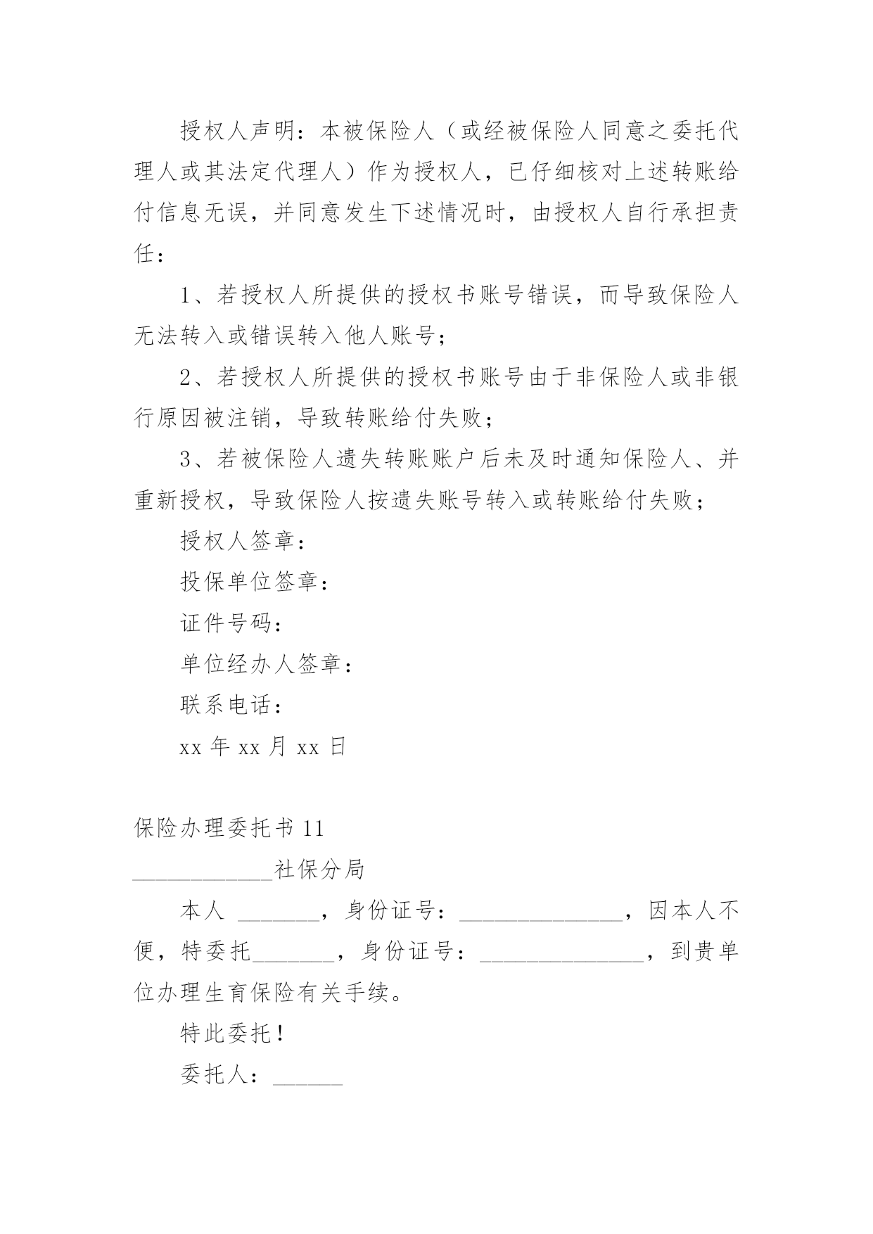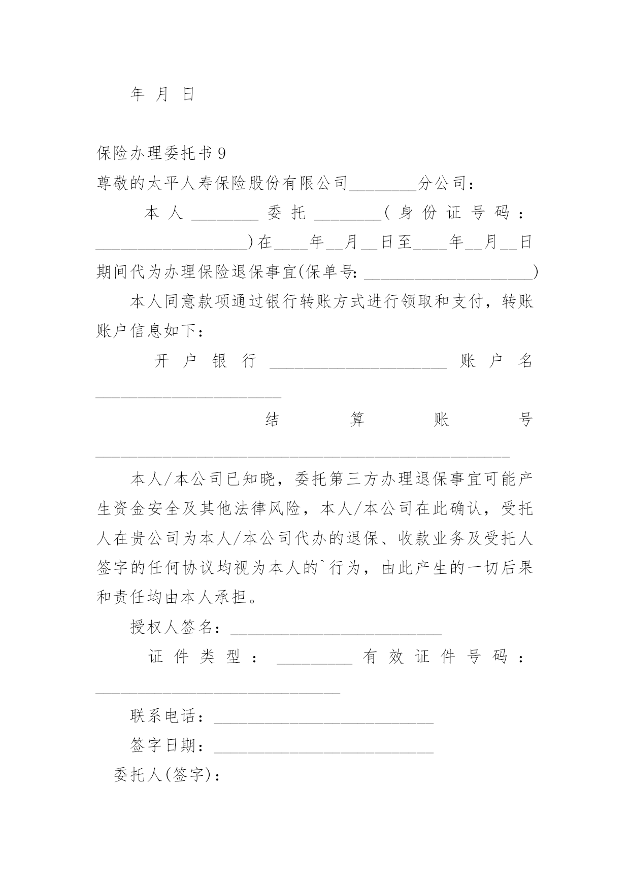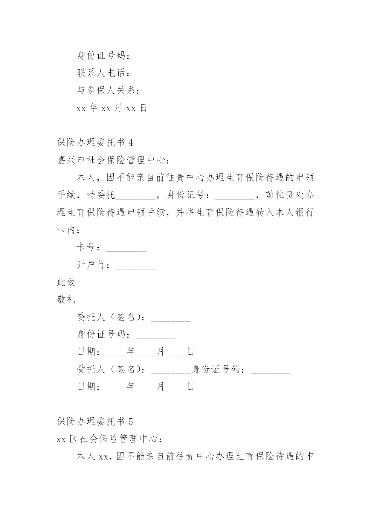 保险办理委托书被委托人如果没有做出违背国家法律的任何权益,委托人无有权终止委托协议。在社会发展不断提速的今天,我们在许多事务中都可能会用到委托书,相信很多朋友都对写委托书感到非常苦恼吧,以下是小编为大家收集的保险办理委托书,希望对大家有所帮助。保险办理委托书1市社会保险基金管理中心:兹委托同志前来办理参保人(姓名:,身份证号码:,保险编号:)的有关社会保险待遇(待遇项目:)申领手续。委托人签名:身份证号码:联系人电话:与参保人关系:20xx年xx月xx日注:受托人需同时携带身份证原件、委托人身份证复印件和相关业务材料。保险办理委托书2尊敬的`太平人寿保险股份有限公司________分公司:本人________委托________(*号码:__________________)在____年__月__日至____年__月__日期间代为办理保险退保事宜(保单号:____________________)本人同意款项通过银行转账方式进行领取和支付,转账账户信息如下:开户银行_____________________账户名______________________结算账号_________________________________________________本人/本公司已知晓,委托第三方办理退保事宜可能产生资金安全及其他法律风险,本人/本公司在此确认,受托人在贵公司为本人/本公司代办的退保、收款业务及受托人签字的任何协议均视为本人的行为,由此产生的一切后果和责任均由本人承担。授权人签名:_________________________*件类型:_________有效*件号码:________________________保险办理委托书3xx市社会保险基金管理中心:兹委托xx同事前来办理参保人(姓名:xx,身份证号码:xx,保险编号:xxxx)的有关社会保险待遇(待遇项目:xx)申领手续。委托人签名:身份证号码:联系人电话:与参保人关系:xx年xx月xx日保险办理委托书4嘉兴市社会保险管理中心:本人,因不能亲自前往贵中心办理生育保险待遇的申领手续,特委托________,身份证号:________,前往贵处办理生育保险待遇申领手续,并将生育保险待遇转入本人银行卡内:卡号:________开户行:________此致敬礼委托人(签名):________身份证号码:________日期:____年____月____日受托人(签名):________身份证号码:________日期:____年____月____日保险办理委托书5xx区社会保险管理中心:本人xx,因不能亲自前往贵中心办理生育保险待遇的申领手续,特委托xxx(身份证号:xxxxxxxxxxxxxxxxxx),前往贵处办理生育保险金申领手续,并将生育保险金转入本人银行卡内:(一)加快会计人员信息管理系统建设。为规范会计从业资格跨省级行政区域、部门调转工作,实现会计从业资格调转从传统纸质方式向信息化方式平稳过渡,根据财政部的统一部署,各地区(部门、系统)相继组织开发建设了会计人员信息管理系统,实现了会计从业资格跨省调转的信息化。73号令发布后,会计管理机构应当结合实际,总结经验,完善系统,抓紧建设,在20xx年7月1日前建立健全会计人员信息管理系统。卡号:xxx第四十二条育龄夫妻接受绝育手术后,因子女死亡、伤残等特殊情况要求再生育,符合本条例规定的,经县级以上人口和计划生育行政部门批准,可以施行输卵管、输精管复通手术。开户行:此致!委托人(签名):xxx身份证号码:xxxxxxxxxxxxxxxxxx被委托人(签名):xxx身份证号码:xxxxxxxxxxxxxxxxxx兹委托XXX(身份证号码:XXXXXXXXXXXXXXXXX)负责办理XXXXXXXXXX工作(事宜),请予以办理,(或请将XXXXXXXX(具体事务)如何处理),,由此产生的.一切责任和后果由我(本人或单位)承担,与贵(单位或部门)无关.日期:×××年××月××日迁出地户口登记机关应凭迁入地公安机关出具的户口准迁证开具户口迁移证,迁入地户口登记机关应凭户口准迁证和户口迁移证办理入户手续。保险办理委托书6xx市普陀区社会保险管理中心:本人,因不能亲自前往贵中心办理生育保险待遇的申领手续,特委托(身份证号:xxx),前往贵处办理生育保险待遇申领手续,并将生育保险待遇转入本人银行卡内:卡号:开户行:此致敬礼!委托人(签名):身份证号码:日期:受托人(签名):身份证号码:日期:保险办理委托书7嘉兴市社会保险管理中心:本人xxx,因不能亲自前往贵中心办理生育保险待遇的申领手续,特委托(身份证号:),前往贵处办理生育保险待遇申领手续,并将生育保险待遇转入本人银行卡内:卡号:xxxx开户行:xxx此致委托人(签