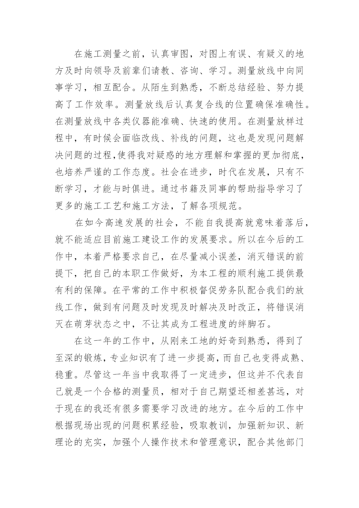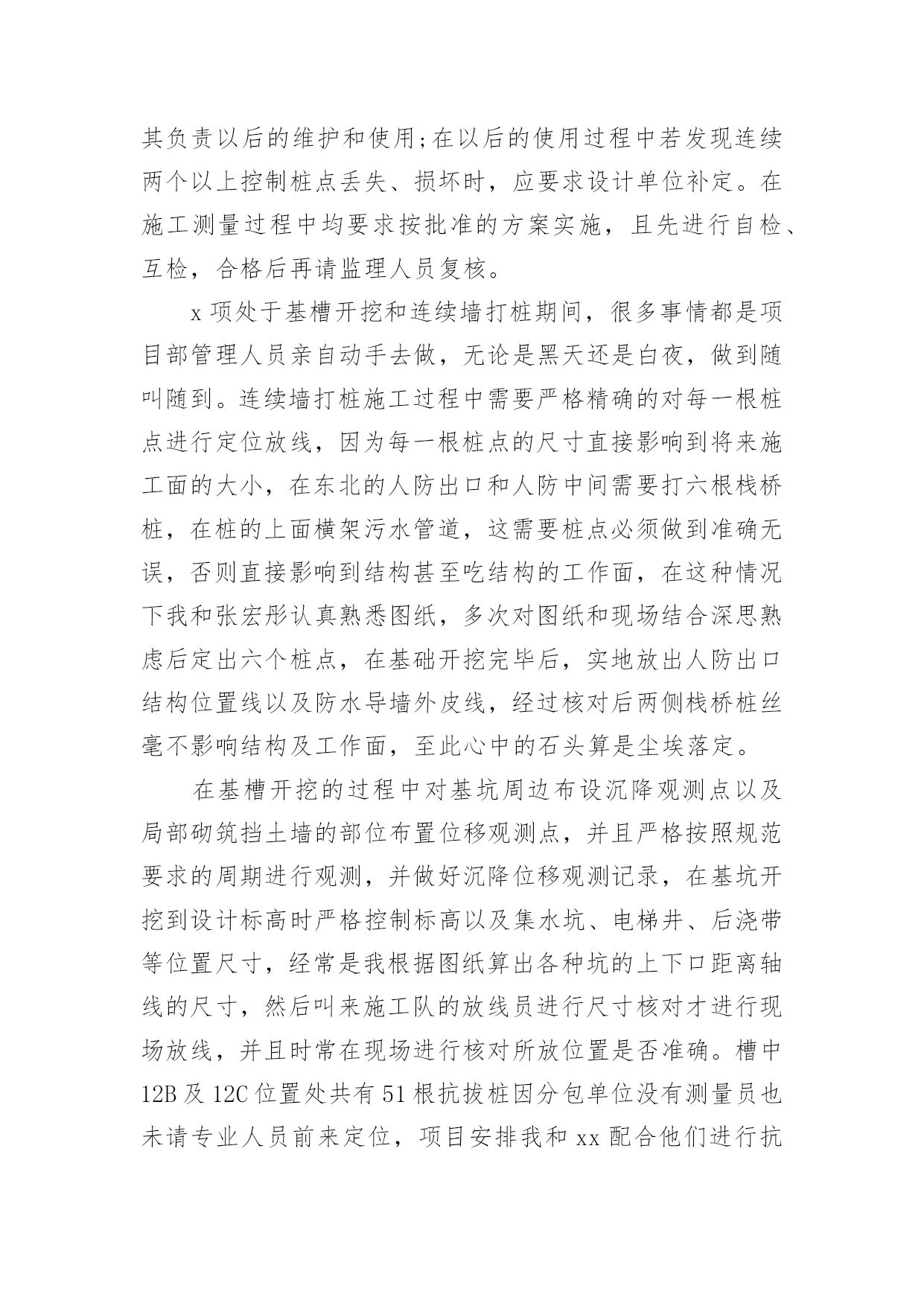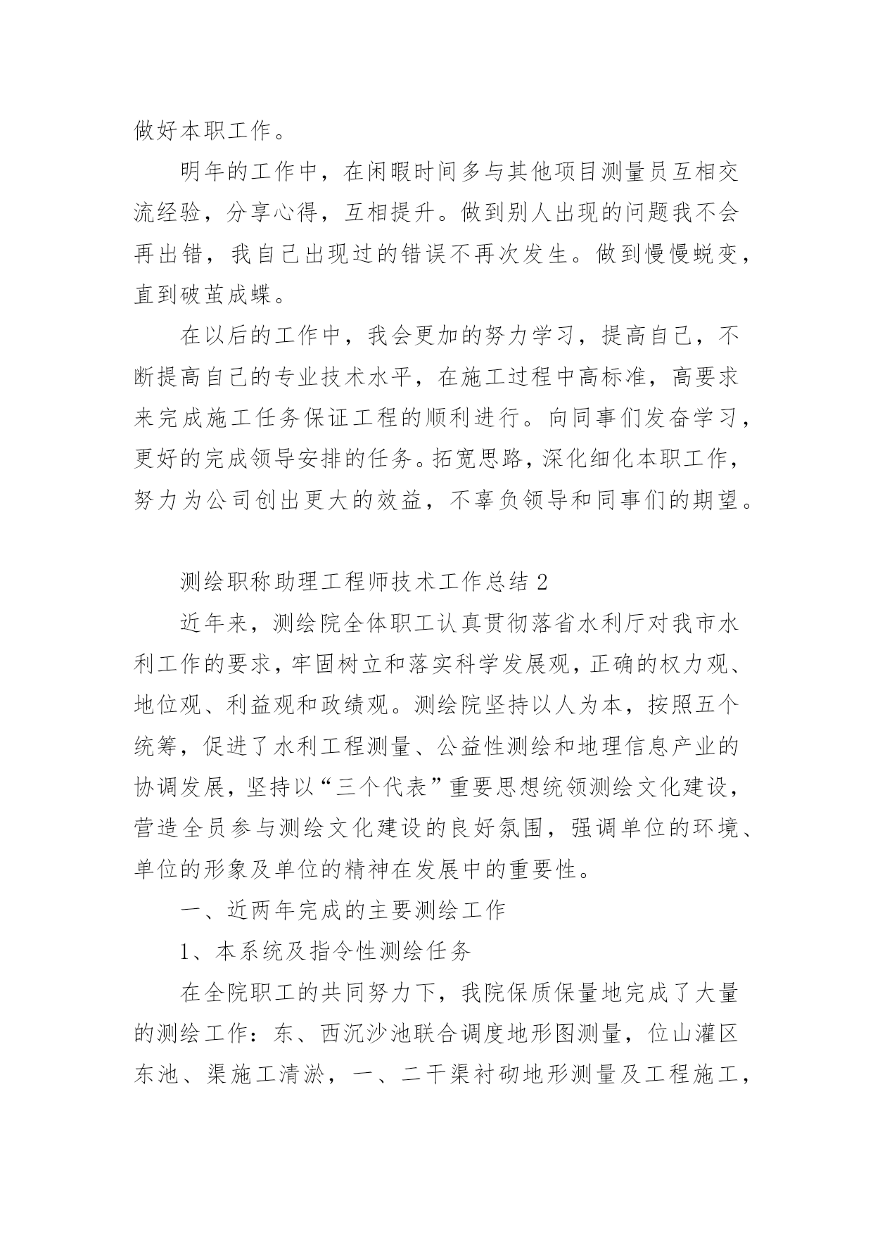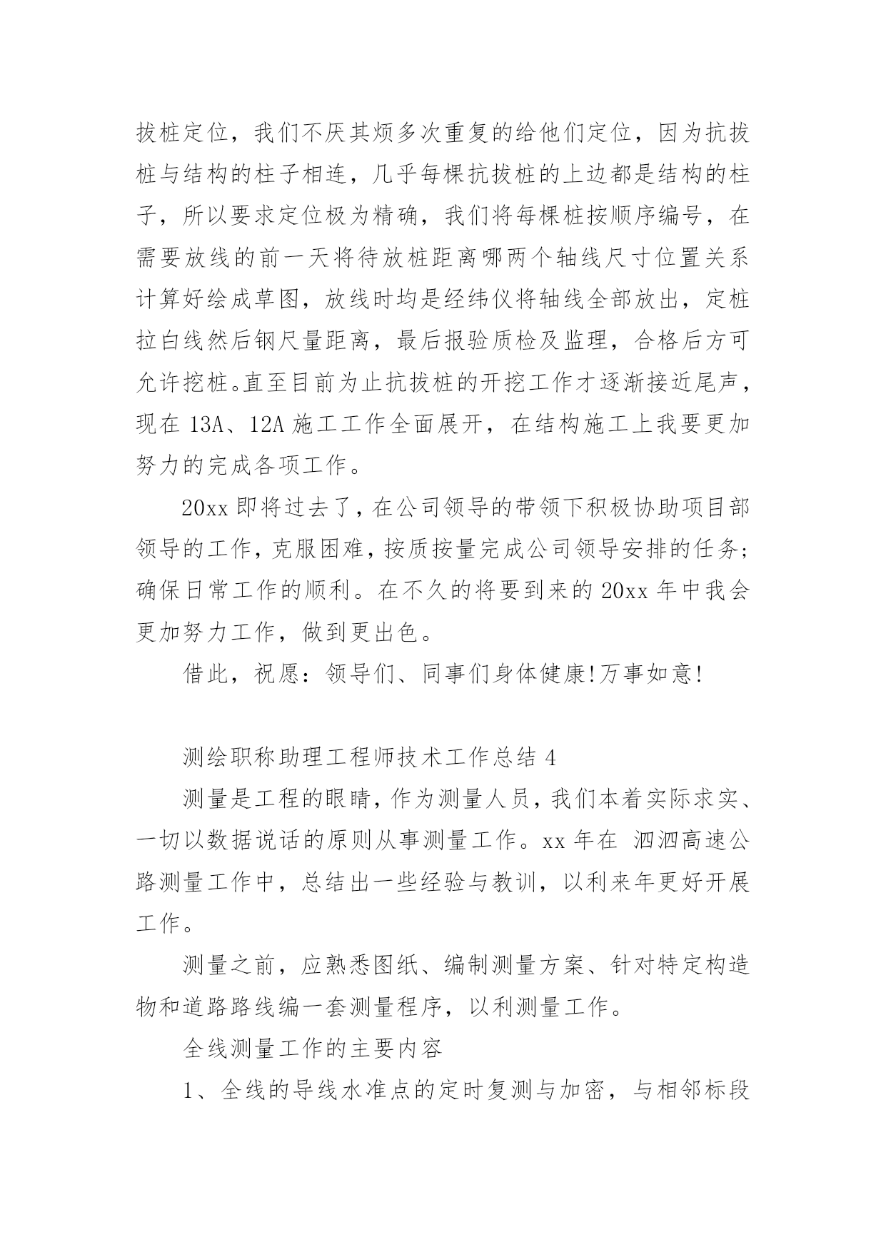 测绘职称助理工程师技术工作总结测绘职称助理工程师技术工作总结范文(精选12篇)时光荏苒,白驹过隙,一段时间的工作已经结束了,过去这段时间的辛苦拼搏,一定让你在工作中有了更多的提升!该好好写一份工作总结,分析一下过去这段时间的工作了。可是怎样写工作总结才能出彩呢?下面是小编为大家收集的测绘职称助理工程师技术工作总结范文(精选12篇),希望能够帮助到大家。测绘职称助理工程师技术工作总结1时光飞逝,转眼间20xx年又到尾声了。测量是工程的眼睛,作为测量人员,我本着实事求是、一切以数据说话的原则从事测量工作。我静心回想这一年的工作生活,感受很多,收获颇丰。现将我这一年来的工作学习情况总结如下:俗语说得好“无规矩不成方圆”。测量是建筑工程之本,是工程中的各工种的标尺。没有它我们的工作就没了目标,就是盲目的工作,就成了盲人骑瞎马,就会出现不应该出现的错误。刚开始我以为测量放线是个很简单的工作,后来在工作中慢慢发现,其实不然,它也有好多要学习的地方。在这一年的工作中时刻严格要求自己,不断加强自己的工作能力,和项目部技术人员互相交流,互相学习,扬长避短,对测量工作做到严格控制,和同事一起努力完成每一项测量任务。在施工测量之前,认真审图,对图上有误、有疑义的地方及时向领导及前辈们请教、咨询、学习。测量放线中向同事学习,相互配合。从陌生到熟悉,不断总结经验、努力提高了工作效率。测量放线后认真复合线的位置确保准确性。在测量放线中各类仪器能准确、快速的使用。在测量放样过程中,有时候会面临改线、补线的问题,这也是发现问题解决问题的过程,使得我对疑惑的地方理解和掌握的更加彻底,也培养严谨的工作态度。社会在进步,时代在发展,只有不断学习,才能与时俱进。通过书籍及同事的帮助指导学习了更多的施工工艺和施工方法,了解各项规范。在如今高速发展的社会,不能自我提高就意味着落后,就不能适应目前施工建设工作的发展要求。所以在今后的工作中,本着严格要求自己,在尽量减小误差,消灭错误的前提下,把自己的本职工作做好,为本工程的顺利施工提供最有利的保障。在平常的工作中积极督促劳务队配合我们的放线工作,做到有问题及时发现及时解决及时改正,将错误消灭在萌芽状态之中,不让其成为工程进度的绊脚石。在这一年的工作中,从刚来工地的好奇到熟悉,得到了至深的锻炼,专业知识有了进一步提高,而自己也变得成熟、稳重。尽管这一年当中我取得了一定进步,但这并不代表自己就是一个合格的测量员,相对于自己期望还相差甚远,对于现在的我还有很多需要学习改进的地方。在今后的工作中根据现场出现的问题积累经验,吸取教训,加强新知识、新理论的充实,加强个人操作技术和管理意识,配合其他部门做好本职工作。明年的工作中,在闲暇时间多与其他项目测量员互相交流经验,分享心得,互相提升。做到别人出现的问题我不会再出错,我自己出现过的错误不再次发生。做到慢慢蜕变,直到破茧成蝶。在以后的工作中,我会更加的努力学习,提高自己,不断提高自己的专业技术水平,在施工过程中高标准,高要求来完成施工任务保证工程的顺利进行。向同事们发奋学习,更好的完成领导安排的任务。拓宽思路,深化细化本职工作,努力为公司创出更大的效益,不辜负领导和同事们的期望。测绘职称助理工程师技术工作总结2近年来,测绘院全体职工认真贯彻落省水利厅对我市水利工作的要求,牢固树立和落实科学发展观,正确的权力观、地位观、利益观和政绩观。测绘院坚持以人为本,按照五个统筹,促进了水利工程测量、公益性测绘和地理信息产业的协调发展,坚持以“三个代表”重要思想统领测绘文化建设,营造全员参与测绘文化建设的良好氛围,强调单位的环境、单位的形象及单位的精神在发展中的重要性。一、近两年完成的主要测绘工作1、本系统及指令性测绘任务在全院职工的共同努力下,我院保质保量地完成了大量的测绘工作:东、西沉沙池联合调度地形图测量,位山灌区东池、渠施工清淤,一、二干渠衬砌地形测量及工程施工,东三号池导流沟施竣工地形、断面测量;位山灌区续建配套与节水改造工程,东渠、西渠、一、二干渠纵、横断面及建筑物调查测量;引xx工程五号池、六号池清淤施工、竣工测量,东、西沉沙池联合调度规划设计地形图测量,引xx工程三干渠衬砌地形测量、施工放线及竣工测量,三干渠王铺闸至高庄桥排水闸施工三等水准测量,三干渠衬砌清淤放线、堤顶平整测量,西渠清淤竣工测量,谭庄水库大坝竣工测量及大坝变形观测等工程。二、默默无闻无私奉献野外工作的艰苦造就了测绘工作者特别能战斗,特别能吃苦,特别能忍耐,特别能奉献,特别能团结,测绘工作需要工作人员有很强的团结协作能力,任何一个环节疏忽都可能出现错误。博x地形测量,工程量大,时间短,任务重,十二月份入驻,天寒地冻,在野外埋标石,冻土太深,铁锨没法用,同志们就用镐轮番挖埋,在滴水成冰、雪花纷飞的冬季,个个满头大汗