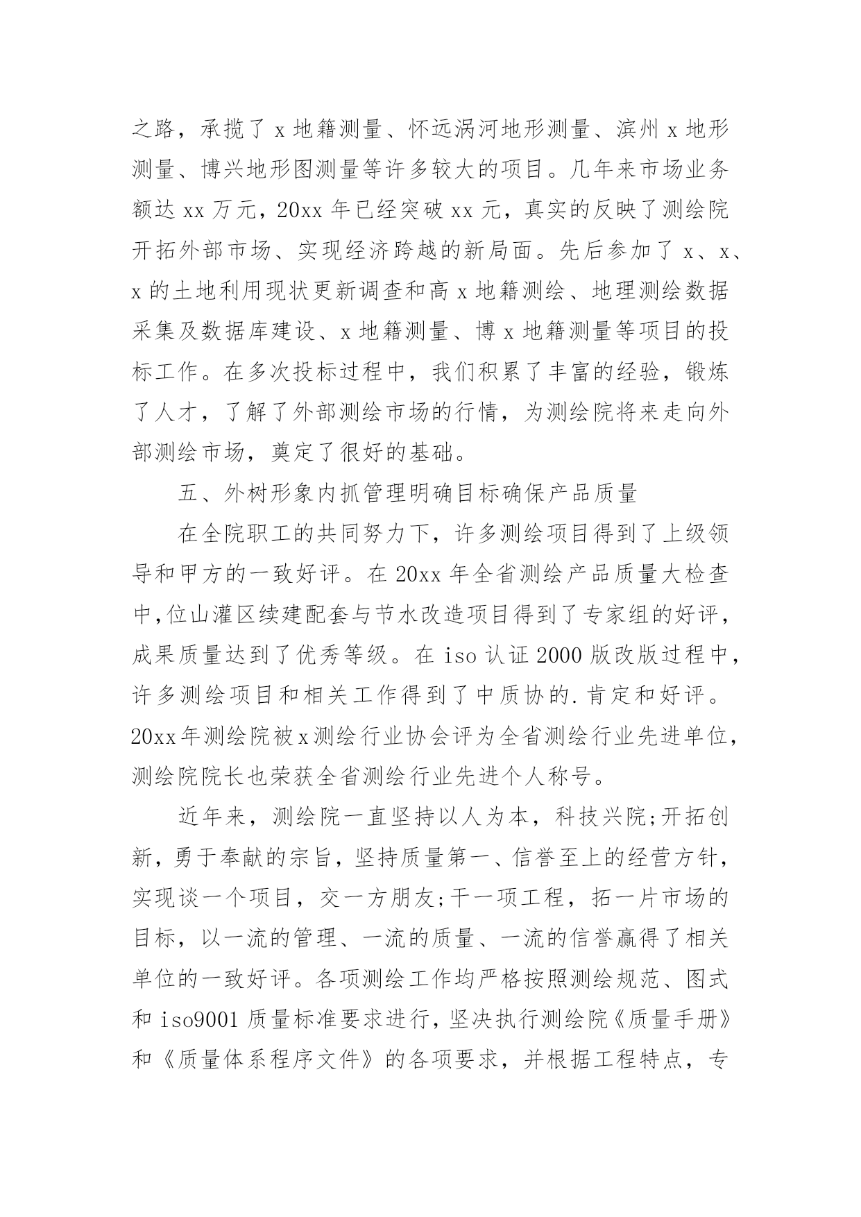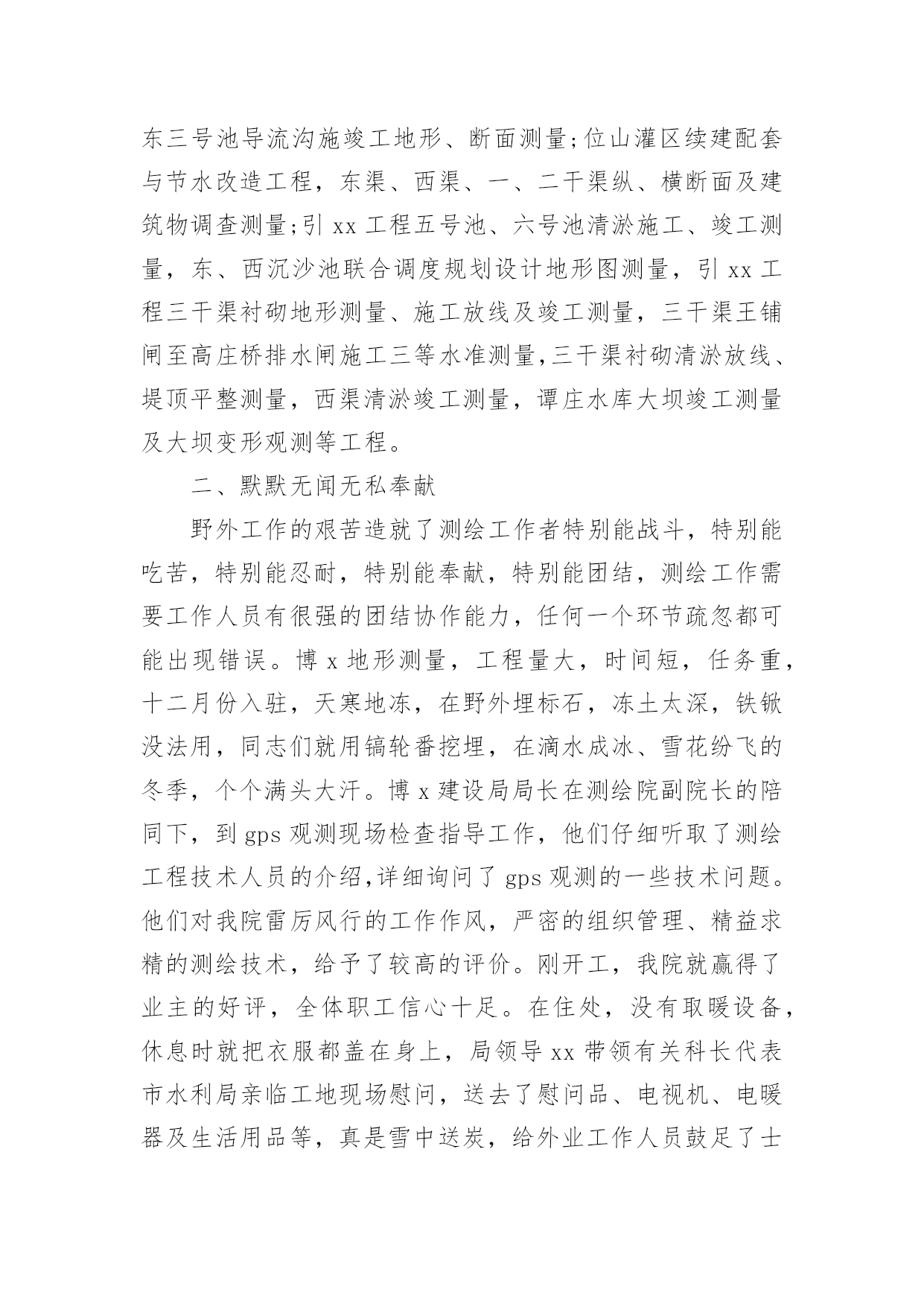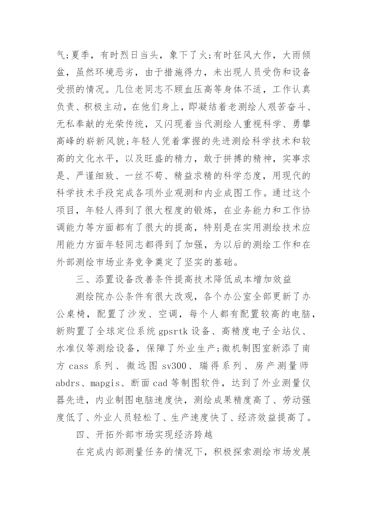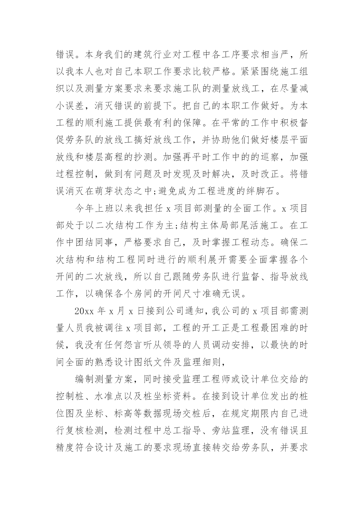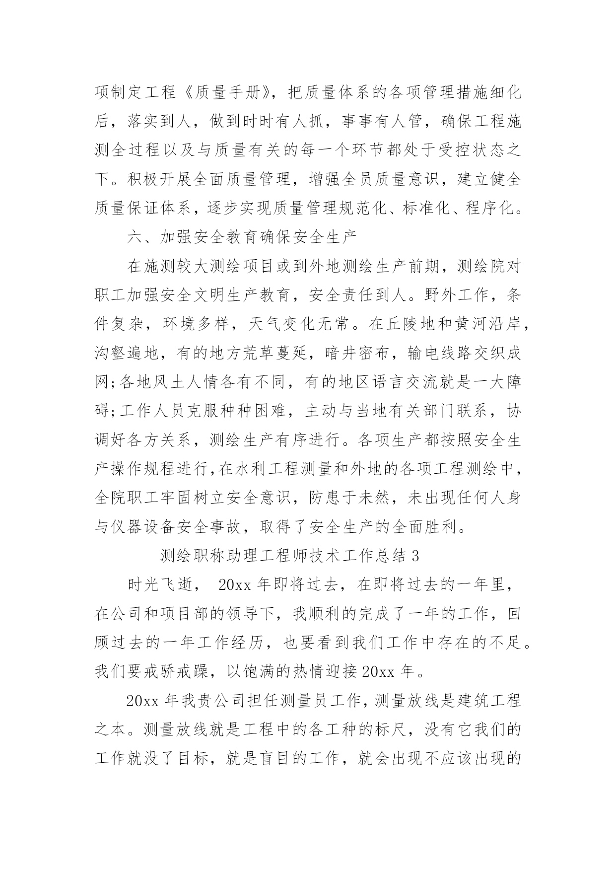 测绘职称助理工程师技术工作总结测绘职称助理工程师技术工作总结范文(精选12篇)时光荏苒,白驹过隙,一段时间的工作已经结束了,过去这段时间的辛苦拼搏,一定让你在工作中有了更多的提升!该好好写一份工作总结,分析一下过去这段时间的工作了。可是怎样写工作总结才能出彩呢?下面是小编为大家收集的测绘职称助理工程师技术工作总结范文(精选12篇),希望能够帮助到大家。测绘职称助理工程师技术工作总结1时光飞逝,转眼间20xx年又到尾声了。测量是工程的眼睛,作为测量人员,我本着实事求是、一切以数据说话的原则从事测量工作。我静心回想这一年的工作生活,感受很多,收获颇丰。现将我这一年来的工作学习情况总结如下:俗语说得好“无规矩不成方圆”。测量是建筑工程之本,是工程中的各工种的标尺。没有它我们的工作就没了目标,就是盲目的工作,就成了盲人骑瞎马,就会出现不应该出现的错误。刚开始我以为测量放线是个很简单的工作,后来在工作中慢慢发现,其实不然,它也有好多要学习的地方。在这一年的工作中时刻严格要求自己,不断加强自己的工作能力,和项目部技术人员互相交流,互相学习,扬长避短,对测量工作做到严格控制,和同事一起努力完成每一项测量任务。在施工测量之前,认真审图,对图上有误、有疑义的地方及时向领导及前辈们请教、咨询、学习。测量放线中向同事学习,相互配合。从陌生到熟悉,不断总结经验、努力提高了工作效率。测量放线后认真复合线的位置确保准确性。在测量放线中各类仪器能准确、快速的使用。在测量放样过程中,有时候会面临改线、补线的问题,这也是发现问题解决问题的过程,使得我对疑惑的地方理解和掌握的更加彻底,也培养严谨的工作态度。社会在进步,时代在发展,只有不断学习,才能与时俱进。通过书籍及同事的帮助指导学习了更多的施工工艺和施工方法,了解各项规范。在如今高速发展的社会,不能自我提高就意味着落后,就不能适应目前施工建设工作的发展要求。所以在今后的工作中,本着严格要求自己,在尽量减小误差,消灭错误的前提下,把自己的本职工作做好,为本工程的顺利施工提供最有利的保障。在平常的工作中积极督促劳务队配合我们的放线工作,做到有问题及时发现及时解决及时改正,将错误消灭在萌芽状态之中,不让其成为工程进度的绊脚石。在这一年的工作中,从刚来工地的好奇到熟悉,得到了至深的锻炼,专业知识有了进一步提高,而自己也变得成熟、稳重。尽管这一年当中我取得了一定进步,但这并不代表自己就是一个合格的测量员,相对于自己期望还相差甚远,对于现在的我还有很多需要学习改进的地方。在今后的工作中根据现场出现的问题积累经验,吸取教训,加强新知识、新理论的充实,加强个人操作技术和管理意识,配合其他部门做好本职工作。明年的工作中,在闲暇时间多与其他项目测量员互相交流经验,分享心得,互相提升。做到别人出现的问题我不会再出错,我自己出现过的错误不再次发生。做到慢慢蜕变,直到破茧成蝶。在以后的工作中,我会更加的努力学习,提高自己,不断提高自己的专业技术水平,在施工过程中高标准,高要求来完成施工任务保证工程的顺利进行。向同事们发奋学习,更好的完成领导安排的任务。拓宽思路,深化细化本职工作,努力为公司创出更大的效益,不辜负领导和同事们的期望。测绘职称助理工程师技术工作总结2近年来,测绘院全体职工认真贯彻落省水利厅对我市水利工作的要求,牢固树立和落实科学发展观,正确的权力观、地位观、利益观和政绩观。测绘院坚持以人为本,按照五个统筹,促进了水利工程测量、公益性测绘和地理信息产业的协调发展,坚持以“三个代表”重要思想统领测绘文化建设,营造全员参与测绘文化建设的良好氛围,强调单位的环境、单位的形象及单位的精神在发展中的重要性。一、近两年完成的主要测绘工作1、本系统及指令性测绘任务在全院职工的共同努力下,我院保质保量地完成了大量的测绘工作:东、西沉沙池联合调度地形图测量,位山灌区东池、渠施工清淤,一、二干渠衬砌地形测量及工程施工,东三号池导流沟施竣工地形、断面测量;位山灌区续建配套与节水改造工程,东渠、西渠、一、二干渠纵、横断面及建筑物调查测量;引xx工程五号池、六号池清淤施工、竣工测量,东、西沉沙池联合调度规划设计地形图测量,引xx工程三干渠衬砌地形测量、施工放线及竣工测量,三干渠王铺闸至高庄桥排水闸施工三等水准测量,三干渠衬砌清淤放线、堤顶平整测量,西渠清淤竣工测量,谭庄水库大坝竣工测量及大坝变形观测等工程。二、默默无闻无私奉献野外工作的艰苦造就了测绘工作者特别能战斗,特别能吃苦,特别能忍耐,特别能奉献,特别能团结,测绘工作需要工作人员有很强的团结协作能力,任何一个环节疏忽都可能出现错误。博x地形测量,工程量大,时间短,任务重,十二月份入驻,天寒地冻,在野外埋标石,冻土太深,铁锨没法用,同志们就用镐轮番挖埋,在滴水成冰、雪花纷飞的冬季,个个满头大汗