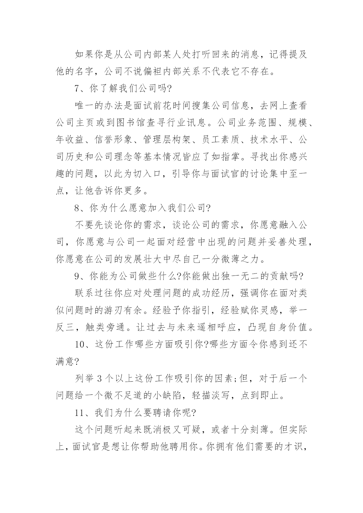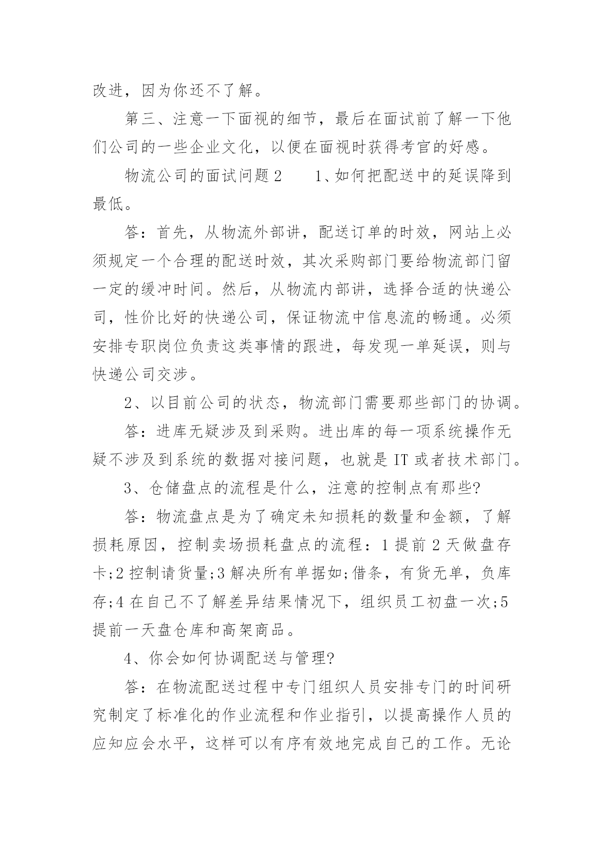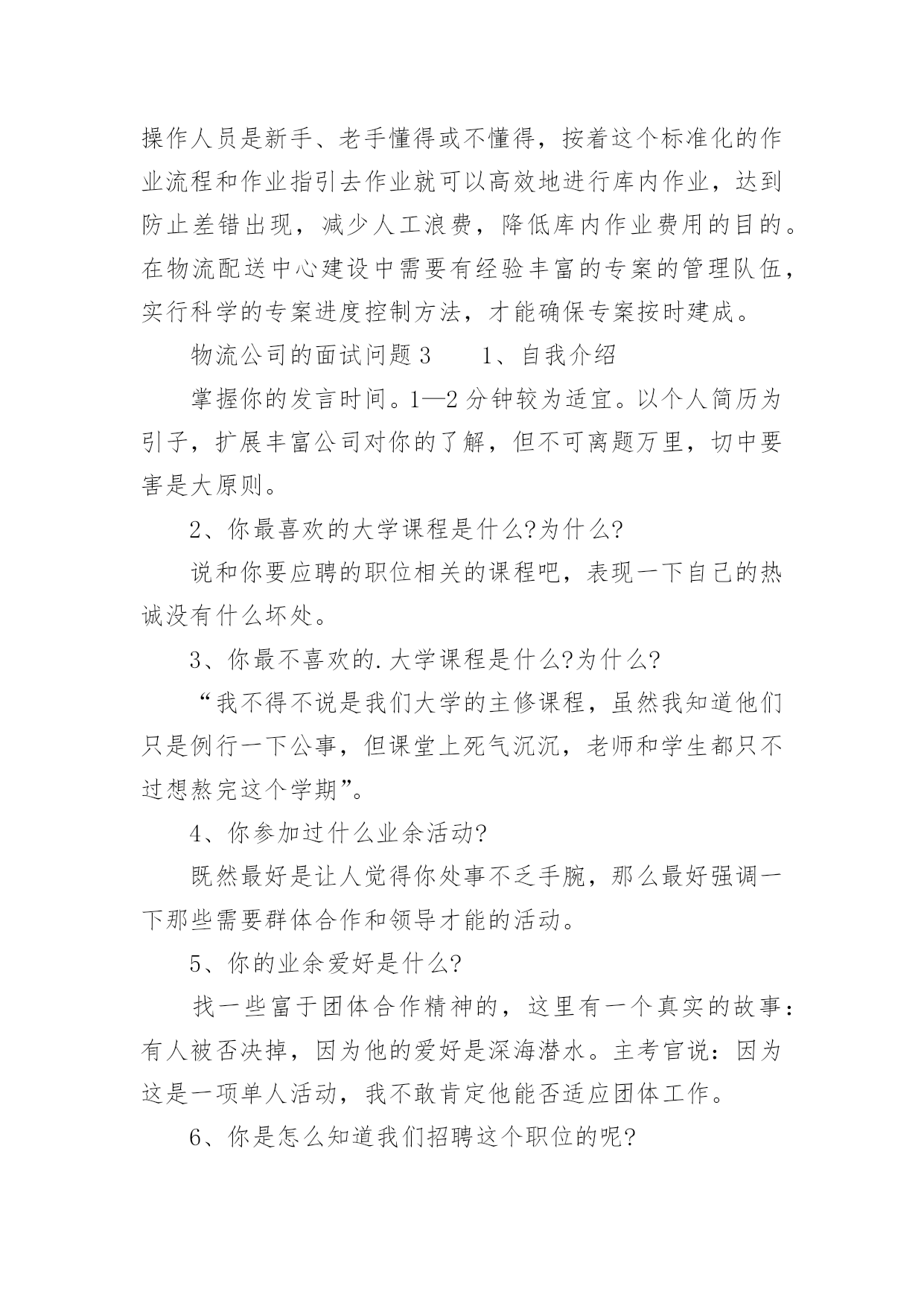 物流公司的面试问题物流公司的面试问题面试是通过书面、面谈或线上交流(视频、电话)的形式来考察一个人的工作能力与综合素质,通过面试可以初步判断应聘者是否可以融入自己的团队。以下是小编整理的物流公司的面试问题,欢迎大家借鉴与参考,希望对大家有所帮助。物流公司的面试问题1为何想要转换跑道,进入物流行业?第一、我在进入这个行业前,已经对这个行业做了一定的了解,我之所以选择进入这个行业是因为我认为这个行业是一个朝阳产业,贵公司在物流行业....(怎么的,怎么的,说点这个公司的优点),而且我也认为我通过在贵公司工作会让我得到更广阔的个人发展空间。第二、着重介绍一下你在过往行业取得的成绩,最好有一定的佐证,同时表明自己是一个学习能力很强的人,因为在跨行业后很多东西都要重新学,公司在录用你前会在一定程度上在意你的学习能力。接着谈一下你对这个行业的一些看法,不要光说好的,适当的说一下公司的一些缺点(注意把握度,说缺点不要太过)顺带发表一下你的看法,让主考觉得你是一个有思想的人,能看到问题,至于解决问题在面试的时候主考不会太在意,也不要急者去谈你想如何如何的改进,因为你还不了解。第三、注意一下面视的细节,最后在面试前了解一下他们公司的一些企业文化,以便在面视时获得考官的好感。物流公司的面试问题21、如何把配送中的延误降到最低。答:首先,从物流外部讲,配送订单的时效,网站上必须规定一个合理的配送时效,其次采购部门要给物流部门留一定的缓冲时间。然后,从物流内部讲,选择合适的快递公司,性价比好的快递公司,保证物流中信息流的畅通。必须安排专职岗位负责这类事情的跟进,每发现一单延误,则与快递公司交涉。2、以目前公司的状态,物流部门需要那些部门的协调。答:进库无疑涉及到采购。进出库的每一项系统操作无疑不涉及到系统的数据对接问题,也就是IT或者技术部门。3、仓储盘点的流程是什么,注意的控制点有那些?答:物流盘点是为了确定未知损耗的数量和金额,了解损耗原因,控制卖场损耗盘点的流程:1提前2天做盘存卡;2控制请货量;3解决所有单据如;借条,有货无单,负库存;4在自己不了解差异结果情况下,组织员工初盘一次;5提前一天盘仓库和高架商品。4、你会如何协调配送与管理?答:在物流配送过程中专门组织人员安排专门的时间研究制定了标准化的作业流程和作业指引,以提高操作人员的应知应会水平,这样可以有序有效地完成自己的工作。无论操作人员是新手、老手懂得或不懂得,按着这个标准化的作业流程和作业指引去作业就可以高效地进行库内作业,达到防止差错出现,减少人工浪费,降低库内作业费用的目的。在物流配送中心建设中需要有经验丰富的专案的管理队伍,实行科学的专案进度控制方法,才能确保专案按时建成。物流公司的面试问题31、自我介绍掌握你的发言时间。1—2分钟较为适宜。以个人简历为引子,扩展丰富公司对你的了解,但不可离题万里,切中要害是大原则。2、你最喜欢的大学课程是什么?为什么?说和你要应聘的职位相关的课程吧,表现一下自己的热诚没有什么坏处。3、你最不喜欢的.大学课程是什么?为什么?“我不得不说是我们大学的主修课程,虽然我知道他们只是例行一下公事,但课堂上死气沉沉,老师和学生都只不过想熬完这个学期”。4、你参加过什么业余活动?既然最好是让人觉得你处事不乏手腕,那么最好强调一下那些需要群体合作和领导才能的活动。5、你的业余爱好是什么?找一些富于团体合作精神的,这里有一个真实的故事:有人被否决掉,因为他的爱好是深海潜水。主考官说:因为这是一项单人活动,我不敢肯定他能否适应团体工作。6、你是怎么知道我们招聘这个职位的呢?如果你是从公司内部某人处打听回来的消息,记得提及他的名字,公司不说偏袒内部关系不代表它不存在。7、你了解我们公司吗?唯一的办法是面试前花时间搜集公司信息,去网上查看公司主页或到图书馆查寻行业讯息。公司业务范围、规模、年收益、信誉形象、管理层构架、员工素质、技术水平、公司历史和公司理念等基本情况皆应了如指掌。寻找出你感兴趣的问题,以此为切入口,引导你与面试官的讨论集中至一点,让他告诉你更多。8、你为什么愿意加入我们公司?不要先谈论你的需求,谈论公司的需求,你愿意融入公司,你愿意与公司一起面对经营中出现的问题并妥善处理,你愿意在公司的发展壮大中尽自己一分微薄之力。9、你能为公司做些什么?你能做出独一无二的贡献吗?联系过往你应对处理问题的成功经历,强调你在面对类似问题时的游刃有余。经验予你指引,经验赋你灵感,举一反三,触类旁通。让过去与未来遥相呼应,凸现自身价值。10、这份工作哪些方面吸引你?哪些方面令你感到还不满意?列举3个以上这份工作吸引你的因素;但,对于后一个问题给一个微不足道的小缺陷,轻描淡写,点到即止。11、我们为什么要聘请你呢?这个问题听起来既消极又可疑,或者十分刻薄。但实际上,面