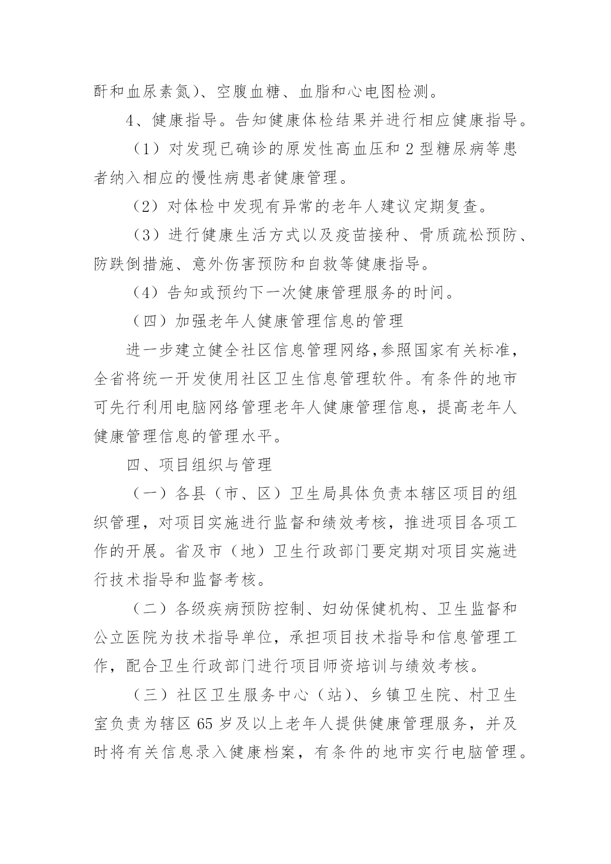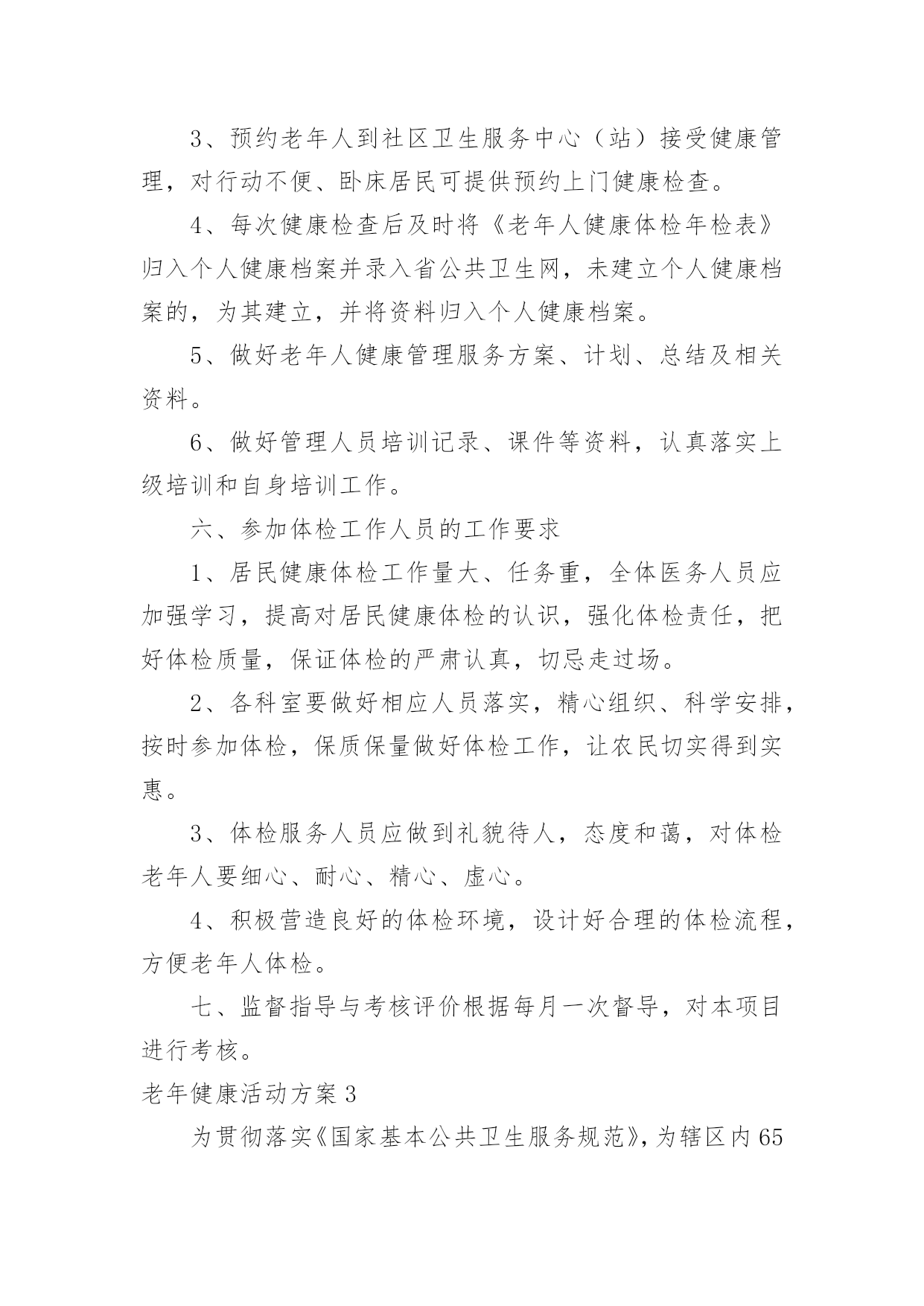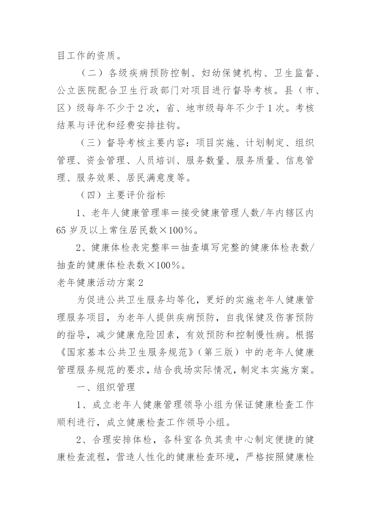老年健康活动方案老年健康活动方案为了确保事情或工作科学有序进行,往往需要预先制定好方案,方案是解决一个问题或者一项工程,一个课题的详细过程。制定方案需要注意哪些问题呢?以下是小编整理的老年健康活动方案,欢迎大家分享。老年健康活动方案1根据卫生部、财政部、国家人口计生委《关于促进基本公共卫生服务均等化的意见》和卫生部《国家基本公共卫生服务规范(20xx年版)》要求,结合我省实际,制定本实施方案。一、项目目标通过实施老年人健康管理服务项目,对城乡老年人进行健康危险因素调查和一般体格检查,提供疾病预防、自我保健及伤害预防、自救等健康指导,减少主要健康危险因素,有效预防和控制慢性病和伤害,逐步使老年人享有均等化的基本公共卫生服务。二、项目实施范围和人群在全省范围内65岁及以上常驻居民。三、项目服务内容(一)严格执行国家项目相关规定。按照卫生部《国家基本公共卫生服务规范(20xx年版)》中《老年人健康管理服务规范》,认真做好老年人健康管理各项工作。(二)控制老年人健康管理技术培训。对从事老年人健康管理人员进行培训,重点加强社区卫生服务中心和乡镇卫生院老年健康管理人员的培训,县(市、区)卫生部门要在3年内对社区卫生服务中心、乡镇卫生院老年健康管理技术人员应轮训一遍。培训内容按卫生部《老年人健康管理服务规范》要求进行。(三)免费提供老年人健康管理服务内容及其流程。按照卫生部《老年人健康管理服务规范》要求,确定老年人服务对象,每年免费为老年人提供1次健康管理服务,包括生活方式和毫克状况评估、体格检查、辅助检查和健康指导。1、生活方式和健康状况评估。通过问诊及老年人健康状态自评了解其基本健康状况、体育锻炼、饮食、吸烟、饮酒、慢性疾病常见症状、既往所患疾病、治疗及目前用药和生活自理能力等情况。2、体格检查。包括体温、脉搏、呼吸、血压、身高、体重、腰围、皮肤、浅表淋巴结、心脏、肺部、腹部等常规体格检查,并对口腔、视力、听力和运动功能等进行粗测判断。3、辅助检查。包括血常规、尿常规、肝功能(血清谷草转氨酶、血清谷丙转氨酶和总胆红素)、肾功能(血清肌酐和血尿素氮)、空腹血糖、血脂和心电图检测。4、健康指导。告知健康体检结果并进行相应健康指导。(1)对发现已确诊的原发性高血压和2型糖尿病等患者纳入相应的慢性病患者健康管理。(2)对体检中发现有异常的老年人建议定期复查。(3)进行健康生活方式以及疫苗接种、骨质疏松预防、防跌倒措施、意外伤害预防和自救等健康指导。(4)告知或预约下一次健康管理服务的时间。(四)加强老年人健康管理信息的管理进一步建立健全社区信息管理网络,参照国家有关标准,全省将统一开发使用社区卫生信息管理软件。有条件的地市可先行利用电脑网络管理老年人健康管理信息,提高老年人健康管理信息的管理水平。四、项目组织与管理(一)各县(市、区)卫生局具体负责本辖区项目的组织管理,对项目实施进行监督和绩效考核,推进项目各项工作的开展。省及市(地)卫生行政部门要定期对项目实施进行技术指导和监督考核。(二)各级疾病预防控制、妇幼保健机构、卫生监督和公立医院为技术指导单位,承担项目技术指导和信息管理工作,配合卫生行政部门进行项目师资培训与绩效考核。(三)社区卫生服务中心(站)、乡镇卫生院、村卫生室负责为辖区65岁及以上老年人提供健康管理服务,并及时将有关信息录入健康档案,有条件的地市实行电脑管理。社区卫生服务中心(站)、乡镇卫生院分别负责辖区内社区卫生服务站、村卫生室建档工作的指导与管理。五、项目实施要求(一)开展老年人健康管理服务的乡镇卫生院和社区卫生服务中心应当具备服务内容所需的疾病设备和条件。(二)加强与街道办事处、村(居)委会、派出所等相关部门的联系,掌握辖区内老年人口信息变化。加强宣传,告知服务内容,使更多的老年人愿意接受服务。(三)预约65岁及以上城乡居民到乡镇卫生院、村卫生室、社区卫生服务中心(站)接受健康管理。对行动不便、卧床居民可提供预约上门健康检查。(四)每次健康检查后接受将相关信息记入健康档案。具体内容见《城乡居民健康档案管理服务规范》健康体检表。对于已纳入相应慢性病健康管理的老年人,本次健康管理服务可作为一次随访服务。(五)积极应用中医药方法为老年人提供养生保健、基本预防等健康指导。六、项目执行时间每年4月1日至次年3月31日为一个周期年度。七、项目监督评价(一)在当地政府的`领导下,各级卫生行政部门要将老年人健康管理项目作为重点卫生工作年度目标考核项目,纳入基层医疗机构的工作绩效考核内容。对考核不达标者限期整改,如限期整改仍不达标者,取消定点服务机构从事项目工作的资质。(二)各级疾病预防控制、妇幼保健机构、卫生监督、公立医院配合卫生行政部门对项目进行督导考核。县(市、区)级每年不少于2次,省、地市级每年不少于1次。考核结果与评优和经