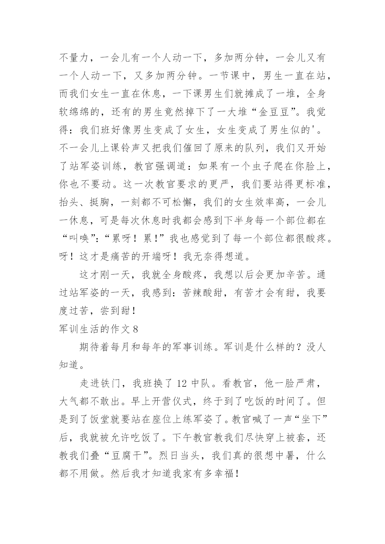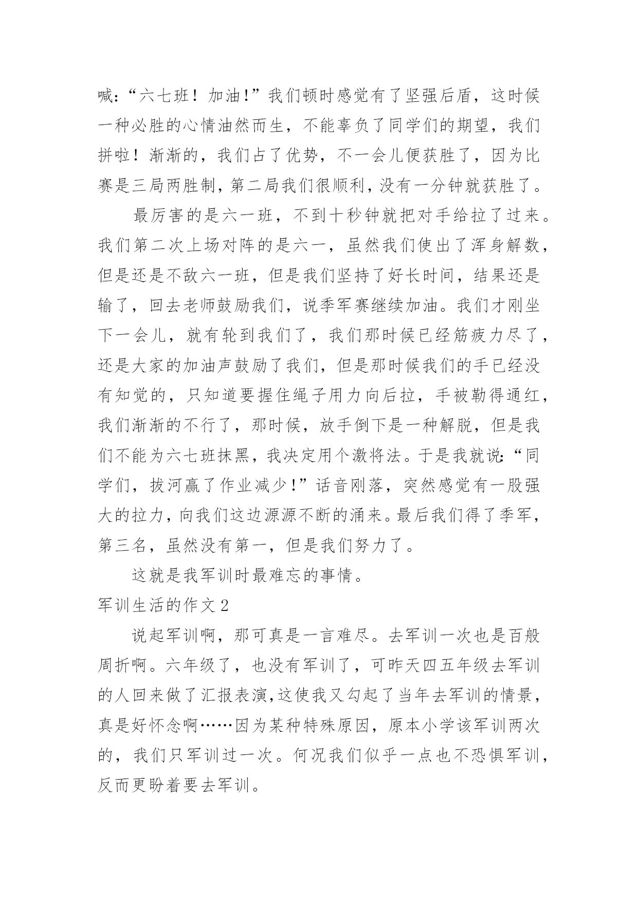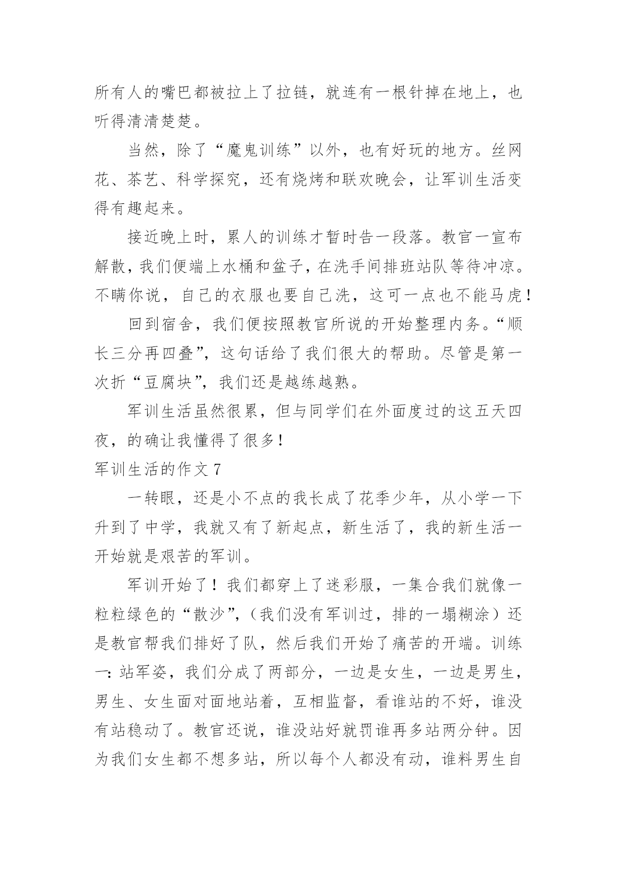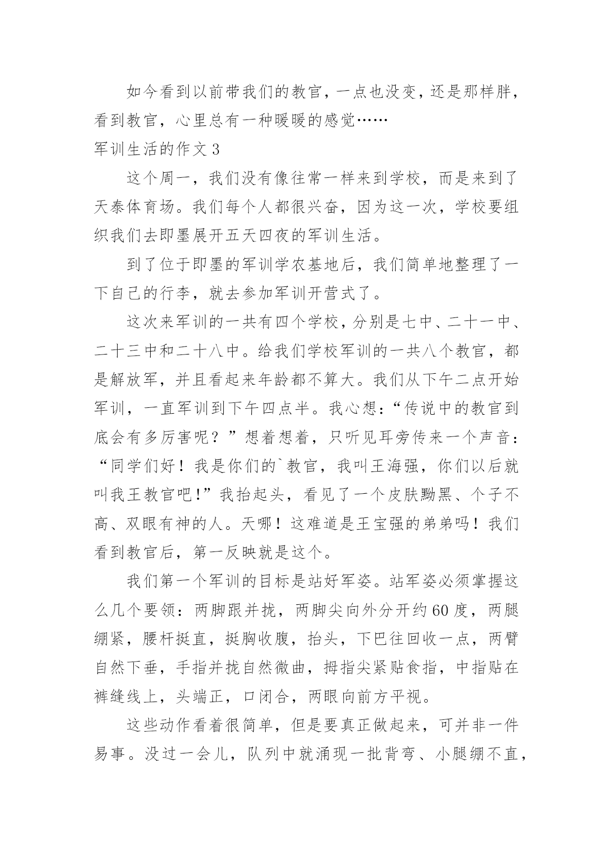 军训生活的作文军训生活的作文在学习、工作乃至生活中,大家都跟作文打过交道吧,作文根据体裁的不同可以分为记叙文、说明文、应用文、议论文。那么你有了解过作文吗?以下是小编为大家整理的军训生活的作文,供大家参考借鉴,希望可以帮助到有需要的朋友。军训生活的作文1说起军训,在我的脑海中有太多太多的回忆了。一起在寝室里吃零食;在晚上一起分享好故事;教官和我们开的小玩笑……这都永远铭记在我的心中。可是,最后一天举行的拔河比赛是我最难忘的。那一天下午,我们每个人都发一个小板凳,摆成了长方形擂台,各个班都选出十几名代表,我们班当然要选强壮的,我们选了好几个男的,还有好几个个子高的女生,我们班的代表都选好了。由我们班的体育班长去抽签决定和哪个班对抗。与我们对阵的班级对我们的实力略逊一筹,但是他们很有气势,他们的'班级加油声很高,从气势上想压到我们,我们不能服输,立刻准备好了。也不知道是他们实力真的很强还是他们班级的加油声让他们实力大增,我们渐渐支持不住了,但是我听见了一股爆发声,听起来是我们班的同学在喊:“六七班!加油!”我们顿时感觉有了坚强后盾,这时候一种必胜的心情油然而生,不能辜负了同学们的期望,我们拼啦!渐渐的,我们占了优势,不一会儿便获胜了,因为比赛是三局两胜制,第二局我们很顺利,没有一分钟就获胜了。最厉害的是六一班,不到十秒钟就把对手给拉了过来。我们第二次上场对阵的是六一,虽然我们使出了浑身解数,但是还是不敌六一班,但是我们坚持了好长时间,结果还是输了,回去老师鼓励我们,说季军赛继续加油。我们才刚坐下一会儿,就有轮到我们了,我们那时候已经筋疲力尽了,还是大家的加油声鼓励了我们,但是那时候我们的手已经没有知觉的,只知道要握住绳子用力向后拉,手被勒得通红,我们渐渐的不行了,那时候,放手倒下是一种解脱,但是我们不能为六七班抹黑,我决定用个激将法。于是我就说:“同学们,拔河赢了作业减少!”话音刚落,突然感觉有一股强大的拉力,向我们这边源源不断的涌来。最后我们得了季军,第三名,虽然没有第一,但是我们努力了。这就是我军训时最难忘的事情。军训生活的作文2说起军训啊,那可真是一言难尽。去军训一次也是百般周折啊。六年级了,也没有军训了,可昨天四五年级去军训的人回来做了汇报表演,这使我又勾起了当年去军训的情景,真是好怀念啊……因为某种特殊原因,原本小学该军训两次的,我们只军训过一次。何况我们似乎一点也不恐惧军训,反而更盼着要去军训。当时发下了通知单,上面写了很多军训时可以体验的项目,例如汽车模拟驾驶、烧烤、看电影、做丝网花等一些好玩的。可谁知,去到那里才知道“上当”了。看电影,电影还是黑白的,这还能理解吧。烧烤,还以为自己可以烧,原来都是他们烧好的。这还算好,这鸡腿其实根本就不是烤的,很普通的`烹饪方法就可以做出来。做丝网花还以为全班都可以做,没想到只有几个人可以做,其他人就去看书。最让我感兴趣的是汽车模拟驾驶,可压根就没有,教官连提都没有提。真的是有点抠得慌。我们也还是算幸运的,我们是唯一一个女教官带的班。都以为女的很为顺,可结果呢——两面性。有时好,有时坏,真的让人捉摸不定。最让我们犯难的就是内务,真的是好严格啊!有一点点皱纹,掀乱,重叠。为了这整理内务,花了好长时间,还有几天是专门抽查我们的内务的。由于内务原因,一个总教官当场表扬了我们的309寝室,呵呵,挺高兴的,等会又说,好不到哪去,只是比别的寝室好那么一点点点点,真是幸灾乐祸。我们去军训也不是时候,老下雨。有一次,下瓢泼大雨,我们躲到饭堂里去。正在吃饭时,突然停电,吓的我们魂都飞了。不过,不都说,下雨后会出现彩虹吗?别说,还真是,彩虹在那天边挂着。不知怎么回事,有一次晚上睡觉前,寝室突然停电,伸手不见五指,好像鬼找上门来了一样。如今看到以前带我们的教官,一点也没变,还是那样胖,看到教官,心里总有一种暖暖的感觉……军训生活的作文3这个周一,我们没有像往常一样来到学校,而是来到了天泰体育场。我们每个人都很兴奋,因为这一次,学校要组织我们去即墨展开五天四夜的军训生活。到了位于即墨的军训学农基地后,我们简单地整理了一下自己的行李,就去参加军训开营式了。这次来军训的一共有四个学校,分别是七中、二十一中、二十三中和二十八中。给我们学校军训的一共八个教官,都是解放军,并且看起来年龄都不算大。我们从下午二点开始军训,一直军训到下午四点半。我心想:“传说中的教官到底会有多厉害呢?”想着想着,只听见耳旁传来一个声音:“同学们好!我是你们的`教官,我叫王海强,你们以后就叫我王教官吧!”我抬起头,看见了一个皮肤黝黑、个子不高、双眼有神的人。天哪!这难道是王宝强的弟弟吗!我们看到教官后,第一反映就是这个。我们第一个军训的目标是站好军姿。站军姿必须掌握这么几个要领:两脚跟并拢,两脚尖向外分开约60度,两腿绷紧,腰杆挺直