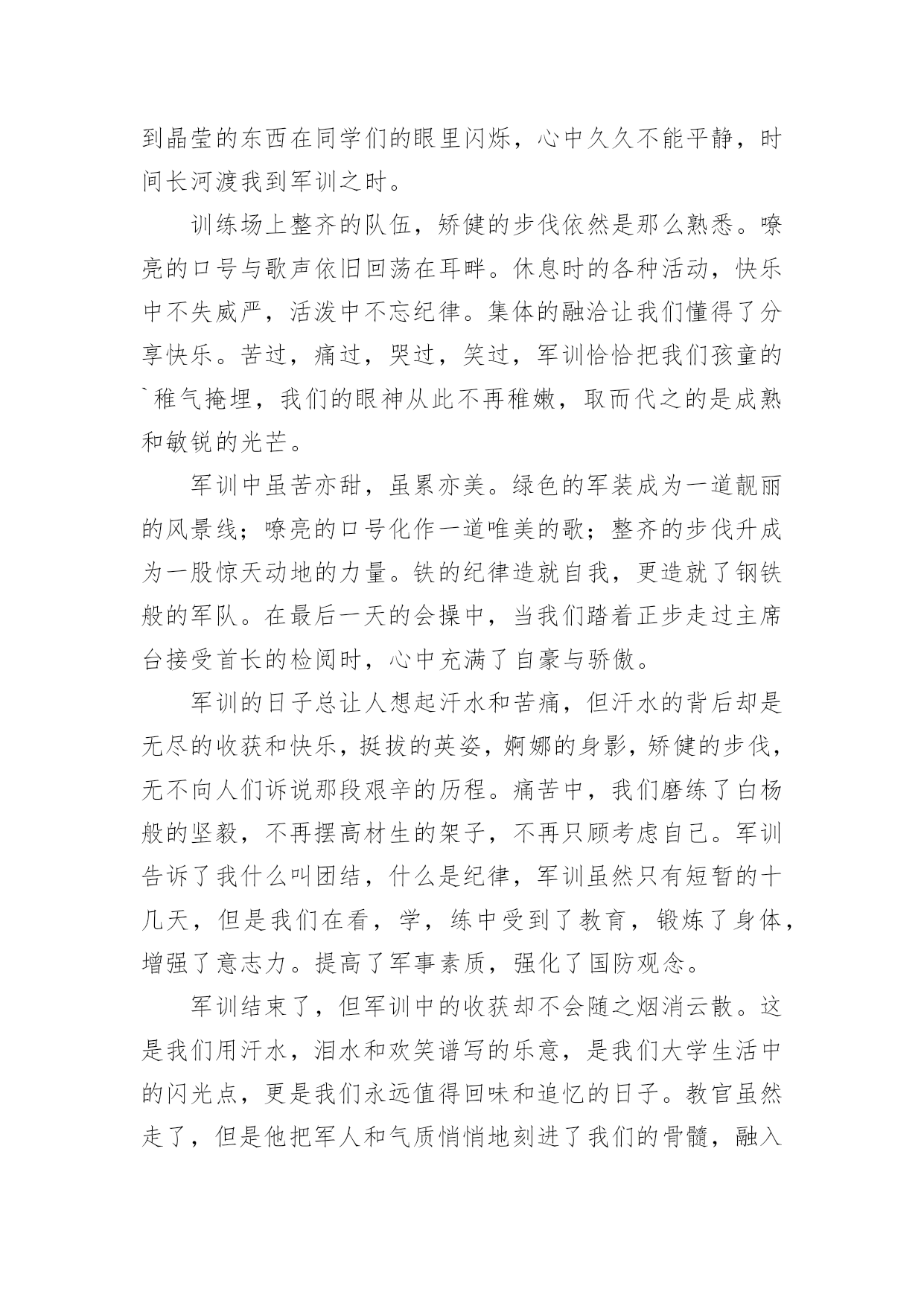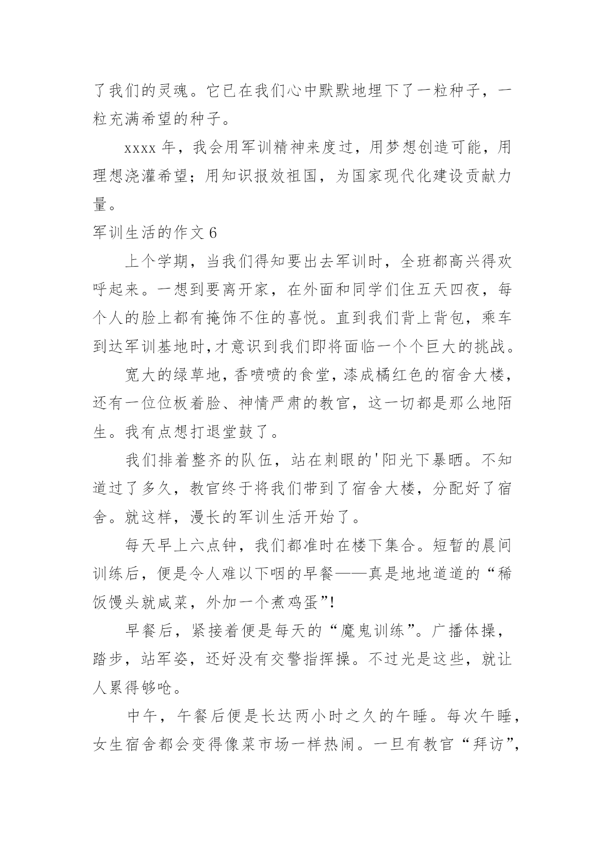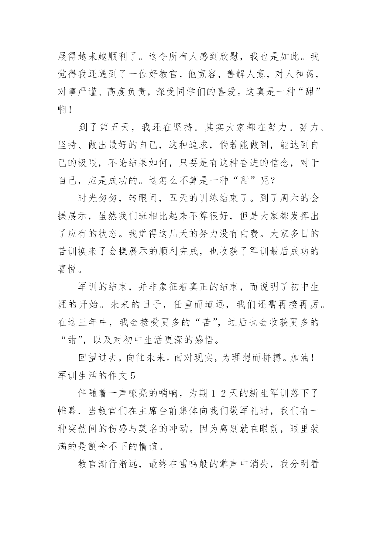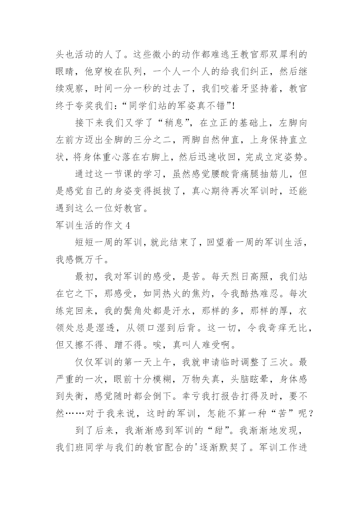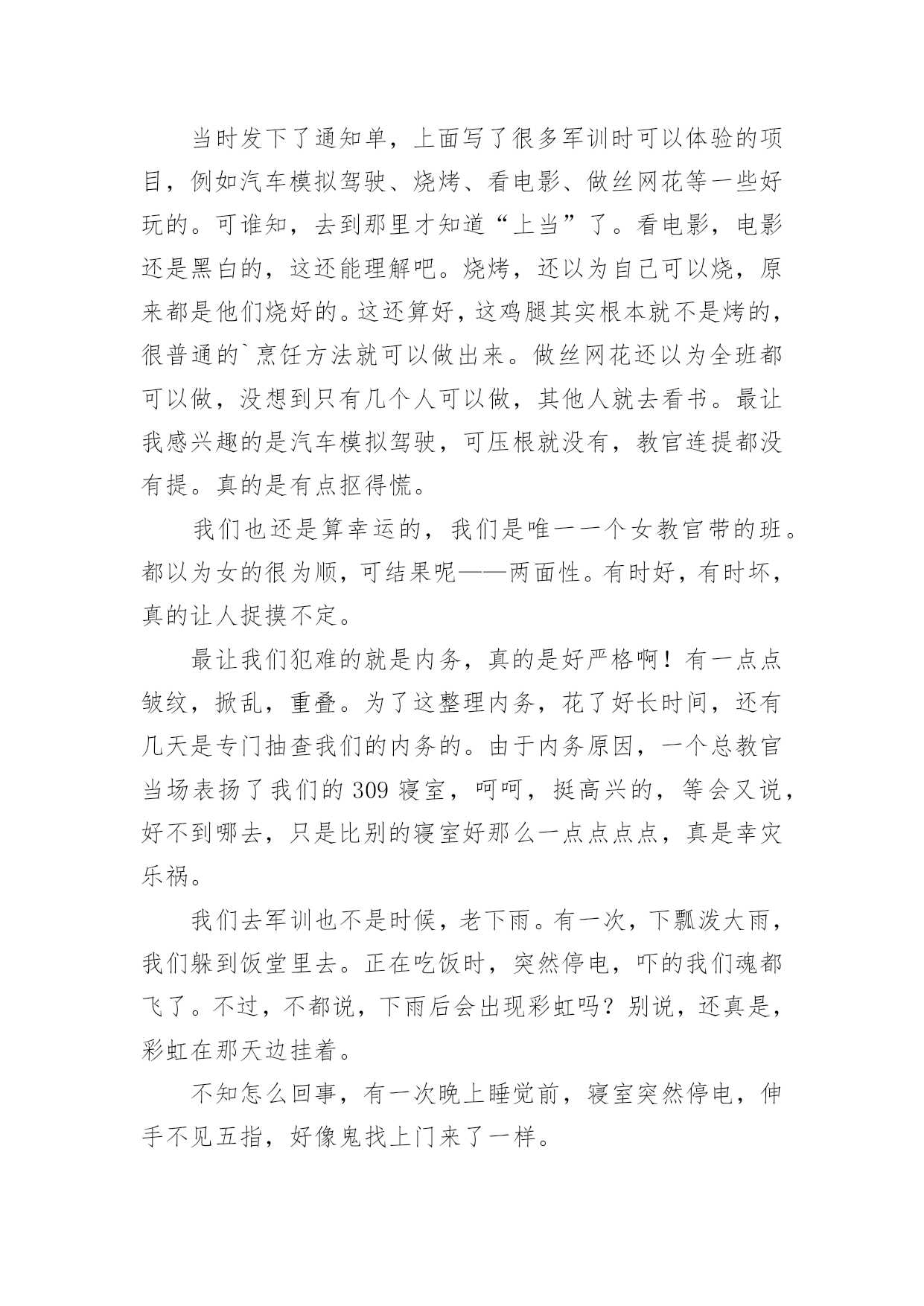 军训生活的作文军训生活的作文在学习、工作乃至生活中,大家都跟作文打过交道吧,作文根据体裁的不同可以分为记叙文、说明文、应用文、议论文。那么你有了解过作文吗?以下是小编为大家整理的军训生活的作文,供大家参考借鉴,希望可以帮助到有需要的朋友。军训生活的作文1说起军训,在我的脑海中有太多太多的回忆了。一起在寝室里吃零食;在晚上一起分享好故事;教官和我们开的小玩笑……这都永远铭记在我的心中。可是,最后一天举行的拔河比赛是我最难忘的。那一天下午,我们每个人都发一个小板凳,摆成了长方形擂台,各个班都选出十几名代表,我们班当然要选强壮的,我们选了好几个男的,还有好几个个子高的女生,我们班的代表都选好了。由我们班的体育班长去抽签决定和哪个班对抗。与我们对阵的班级对我们的实力略逊一筹,但是他们很有气势,他们的'班级加油声很高,从气势上想压到我们,我们不能服输,立刻准备好了。也不知道是他们实力真的很强还是他们班级的加油声让他们实力大增,我们渐渐支持不住了,但是我听见了一股爆发声,听起来是我们班的同学在喊:“六七班!加油!”我们顿时感觉有了坚强后盾,这时候一种必胜的心情油然而生,不能辜负了同学们的期望,我们拼啦!渐渐的,我们占了优势,不一会儿便获胜了,因为比赛是三局两胜制,第二局我们很顺利,没有一分钟就获胜了。最厉害的是六一班,不到十秒钟就把对手给拉了过来。我们第二次上场对阵的是六一,虽然我们使出了浑身解数,但是还是不敌六一班,但是我们坚持了好长时间,结果还是输了,回去老师鼓励我们,说季军赛继续加油。我们才刚坐下一会儿,就有轮到我们了,我们那时候已经筋疲力尽了,还是大家的加油声鼓励了我们,但是那时候我们的手已经没有知觉的,只知道要握住绳子用力向后拉,手被勒得通红,我们渐渐的不行了,那时候,放手倒下是一种解脱,但是我们不能为六七班抹黑,我决定用个激将法。于是我就说:“同学们,拔河赢了作业减少!”话音刚落,突然感觉有一股强大的拉力,向我们这边源源不断的涌来。最后我们得了季军,第三名,虽然没有第一,但是我们努力了。这就是我军训时最难忘的事情。军训生活的作文2说起军训啊,那可真是一言难尽。去军训一次也是百般周折啊。六年级了,也没有军训了,可昨天四五年级去军训的人回来做了汇报表演,这使我又勾起了当年去军训的情景,真是好怀念啊……因为某种特殊原因,原本小学该军训两次的,我们只军训过一次。何况我们似乎一点也不恐惧军训,反而更盼着要去军训。当时发下了通知单,上面写了很多军训时可以体验的项目,例如汽车模拟驾驶、烧烤、看电影、做丝网花等一些好玩的。可谁知,去到那里才知道“上当”了。看电影,电影还是黑白的,这还能理解吧。烧烤,还以为自己可以烧,原来都是他们烧好的。这还算好,这鸡腿其实根本就不是烤的,很普通的`烹饪方法就可以做出来。做丝网花还以为全班都可以做,没想到只有几个人可以做,其他人就去看书。最让我感兴趣的是汽车模拟驾驶,可压根就没有,教官连提都没有提。真的是有点抠得慌。我们也还是算幸运的,我们是唯一一个女教官带的班。都以为女的很为顺,可结果呢——两面性。有时好,有时坏,真的让人捉摸不定。最让我们犯难的就是内务,真的是好严格啊!有一点点皱纹,掀乱,重叠。为了这整理内务,花了好长时间,还有几天是专门抽查我们的内务的。由于内务原因,一个总教官当场表扬了我们的309寝室,呵呵,挺高兴的,等会又说,好不到哪去,只是比别的寝室好那么一点点点点,真是幸灾乐祸。我们去军训也不是时候,老下雨。有一次,下瓢泼大雨,我们躲到饭堂里去。正在吃饭时,突然停电,吓的我们魂都飞了。不过,不都说,下雨后会出现彩虹吗?别说,还真是,彩虹在那天边挂着。不知怎么回事,有一次晚上睡觉前,寝室突然停电,伸手不见五指,好像鬼找上门来了一样。如今看到以前带我们的教官,一点也没变,还是那样胖,看到教官,心里总有一种暖暖的感觉……军训生活的作文3这个周一,我们没有像往常一样来到学校,而是来到了天泰体育场。我们每个人都很兴奋,因为这一次,学校要组织我们去即墨展开五天四夜的军训生活。到了位于即墨的军训学农基地后,我们简单地整理了一下自己的行李,就去参加军训开营式了。这次来军训的一共有四个学校,分别是七中、二十一中、二十三中和二十八中。给我们学校军训的一共八个教官,都是解放军,并且看起来年龄都不算大。我们从下午二点开始军训,一直军训到下午四点半。我心想:“传说中的教官到底会有多厉害呢?”想着想着,只听见耳旁传来一个声音:“同学们好!我是你们的`教官,我叫王海强,你们以后就叫我王教官吧!”我抬起头,看见了一个皮肤黝黑、个子不高、双眼有神的人。天哪!这难道是王宝强的弟弟吗!我们看到教官后,第一反映就是这个。我们第一个军训的目标是站好军姿。站军姿必须掌握这么几个要领:两脚跟并拢,两脚尖向外分开约60度,两腿绷紧,腰杆挺直