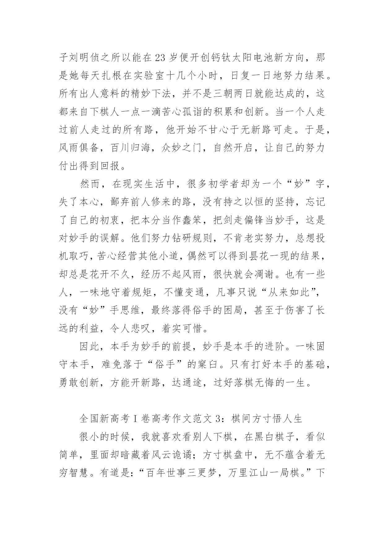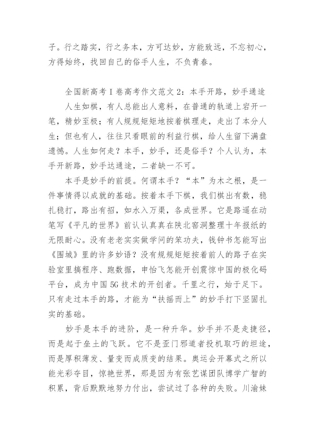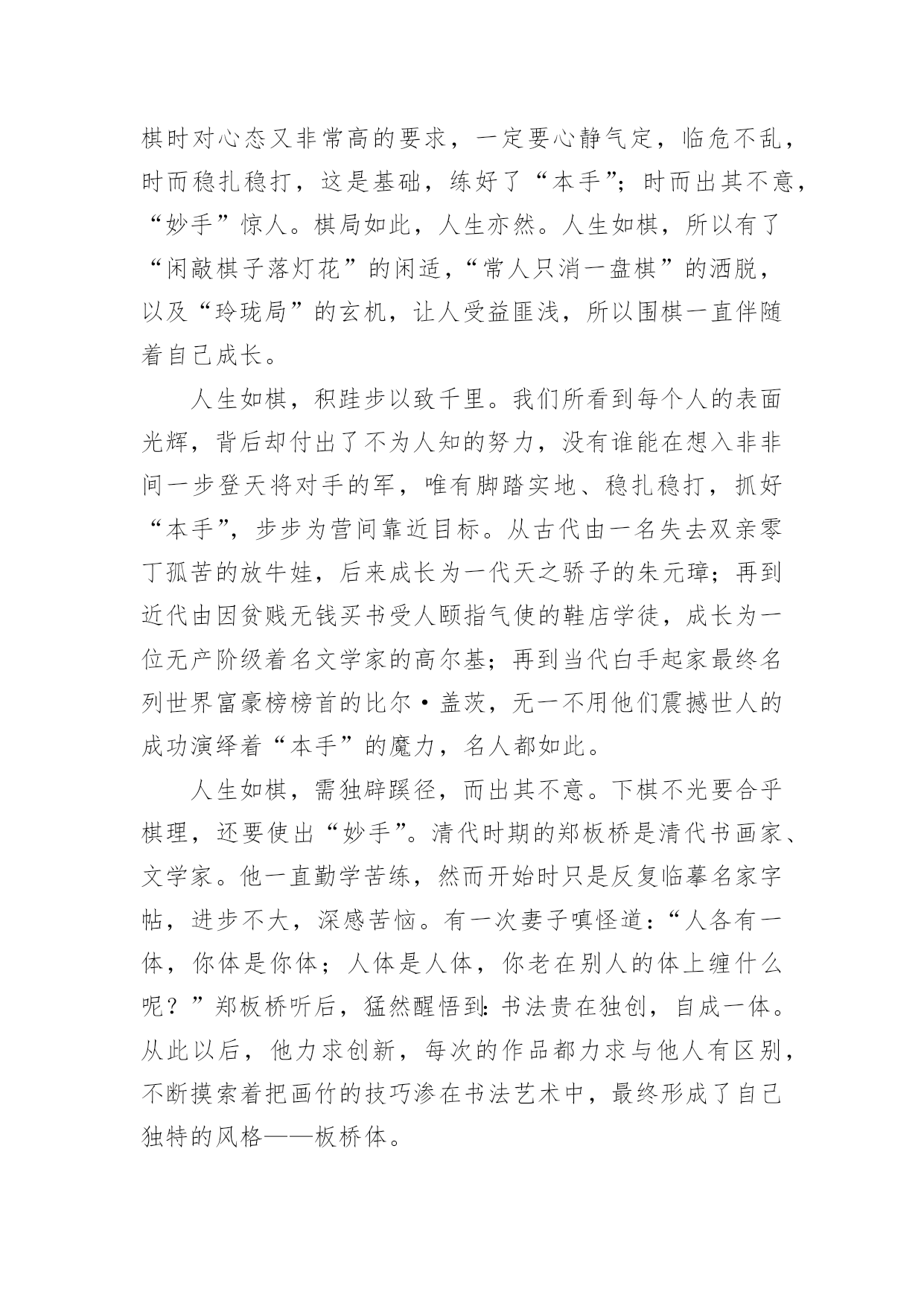 2022优秀高考语文作文在现实生活或工作学习中,说到作文,大家肯定都不陌生吧,借助作文可以提高我们的语言组织能力。相信许多人会觉得作文很难写吧,下面是小编精心整理的2022优秀高考语文作文,仅供参考,希望能够帮助到大家。2022年全国新高考I卷高考作文题目:本手、妙手、俗手作文材料:阅读下面的材料,根据要求写作。“本手、妙手、俗手”是围棋的三个术语。本手是指合乎棋理的正规下法;妙手是指出人意料的精妙下法;俗手是指貌似合理,而从全局看通常会受损的下法。对于初学者而言,应该从本手开始,本手的功夫扎实了,棋力才会提高。一些初学者热衷于追求妙手,而忽视更为常用的本手。本手是基础,妙手是创造。一般来说,对本手理解深刻,才可能出现妙手;否则,难免下出俗手,水平也不易提升。以上材料对我们颇具启示意义。请结合材料写一篇文章,体现你的感悟与思考。要求:选准角度,确定立意,明确文体,自拟标题;不要套作,不得抄袭;不得泄露个人信息;不少于800字。全国新高考I卷高考作文范文1:品棋道,悟人生本手是开始,是走向妙手的起点,而没有妙手的过程,也难以达到俗手的境界,我们生活与学习的历练过程何尝又不是这样呢?人生宛若一盘纵横的棋局,每一颗黑白棋子的落定,正如我们人生的每一步前行,一步一个脚印,在于黑白棋子间穿梭,我们可以感悟到人生的棋道与棋法。围棋中“本手、妙手、俗手”的术语,三种不同的棋法,或是合乎棋理的正规,或是出人意料的精妙,又或是貌似合理实则有损的局限,都是态度与思想的映射,是对我们自己的一种历练,是不同的人生行走之道。那么作为掌棋者的我们,又应如何落下自己的人生棋子呢?在现实的生活之中,面对人生纵横繁杂的棋盘,当以务本求妙之心落脱俗无悔之子。所以,毫无疑问,作为掌棋者的我们,每个人都渴望棋盘上妙手生花的创造。何以达到如此境界呢?唯有本手的一次次功夫筑基,脚踏实地一步一个脚印。可有些人却只看到了每一次妙手的出乎意料、精妙绝伦,却忽视了全局落棋的内在的关联,忽视了妙手背后是无数次本手的历练与考量,所以导致最终不仅失了妙手,反落得俗手的结局,棋艺平平不起,一败涂地。这似乎看起来很简单的道理,但究其根本,是我们只看得见眼前而看不到长远的认知,是急于追求而忽视基础的“欲速则不达”。只热衷于追求妙手,而忽视了更为常用的本手,就好像是空有好皮囊的汽车,内部却净是破损脆弱的零件,所以不堪受用、走不长远;即使确实下出几次妙手,却也只是停留在表象的妙,达不到深层次的妙手招数,貌似合理甚至精妙,但又以全局观之,却自损前路,导致早早败下阵来,妙手最终成俗手。人生未尝不是如此呢,忽视了基础、不想着如何提升自身的硬实力基础,而一味追求外在的表面包装、一瞬的惊艳,许多人只看得到眼前的利益,而忽视了长远,忘记了如何走得踏实端正,忘了初心,最终自己走向了失败的泥沼,处处受损的棋局,最终悔恨不已,难以展现出俗手的风范。所以,“本手”这一功夫基础的重要性不言而喻。我们不仅是人生的掌棋者,更是正处于青春之际的人生初学者,从本手开始,秉承务本之心尤为关键。本手是合乎棋理的正规下法,是棋道的入门功。但本手绝不仅仅是机械的简单重复,在本手的学习过程中,我们观学基本步法,由生涩到娴熟,这才是开始;掌握正规合制的基础后,我们在不断练习中扎实功夫,求索经验最终灵活运用,这是积极上进;但我们绝不仅仅止步于此,熟练掌握后,怀揣着求妙之心,我们要开始思考每一步本手的所在意义,考量每一步本手对全棋局的贡献,通过不断的深入理解中,才是对棋道的不断丰富的认识。在这样一种回环往复中,我们的才能一步步地夯实基础、提升技艺,深刻理解“棋法”本身,在平常中观其联系,在小步间洞见全局,只有这样,我们才有助力全局、妙手生花的创造可能,才可免于急功近利之俗手。“本手是基础,妙手是创造”,人生的棋道正应如此,在基础中求创造,在务实中求脱俗之妙。品棋道,悟人生。在当今世界日新月异的变化中,面对人生纵横繁杂的棋盘,我们当以务本求妙之心落脱俗无悔之子。行之踏实,行之务本,方可达妙,方能致远,不忘初心,方得始终,找回自己的俗手人生,不负青春。全国新高考I卷高考作文范文2:本手开路,妙手通途人生如棋,有人总能出人意料,在普通的轨道上宕开一笔,精妙至极;有人规规矩矩地按着棋理走,走出了本分人生;但也有人,往往只看眼前的利益行棋,给人生留下满盘遗憾。人生如何走?本手,妙手,还是俗手?个人认为,本手开新路,妙手达通途,二者缺一不可。本手是妙手的前提。何谓本手?“本”为木之根,是一件事情得以成就的基础。按着本手下棋,我们棋出有数,稳扎稳打,路出有招,如水入万渠,各成世界。它是路遥在动笔写《平凡的世界》前认认真真在陕北窑洞整理十年报纸的无限耐心。没有老老实实做学问的笨功夫,钱钟书怎能写出《围城》里的许多妙语?没有规规矩矩按着前人的路子在实验