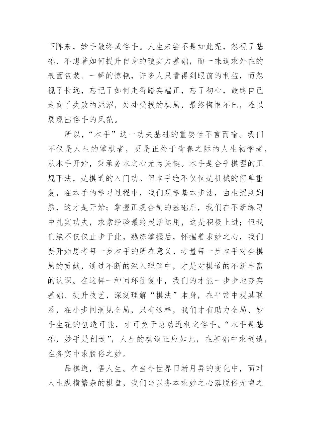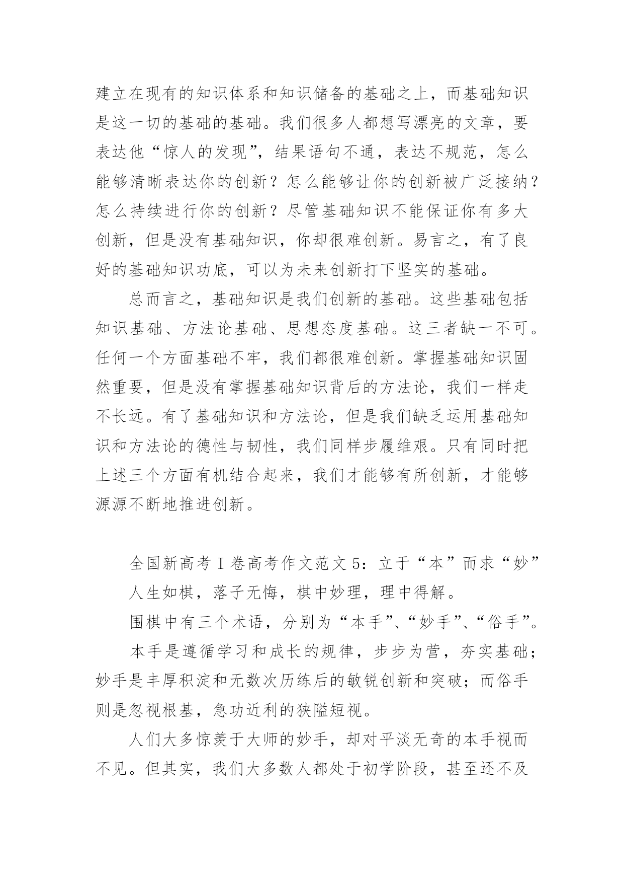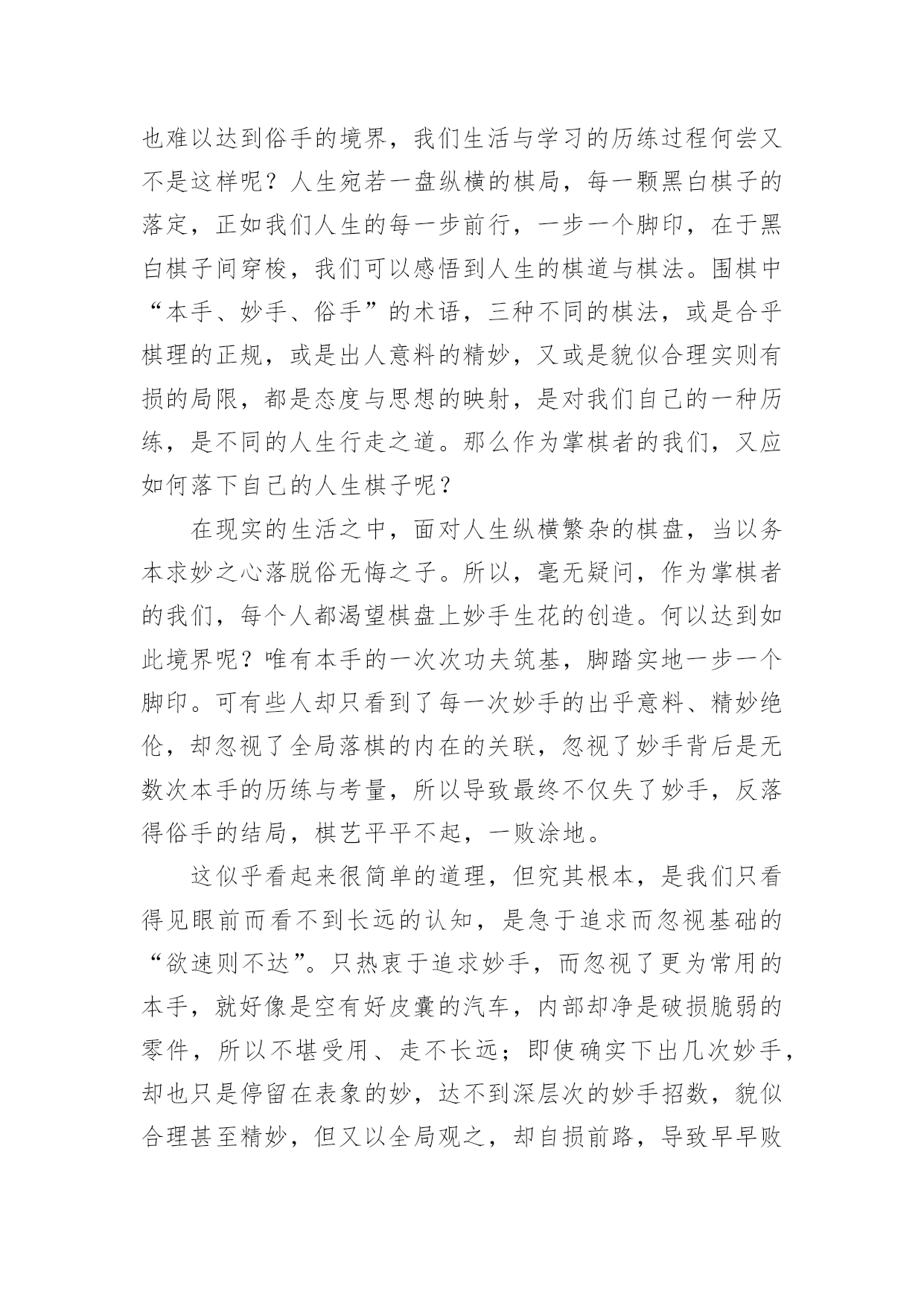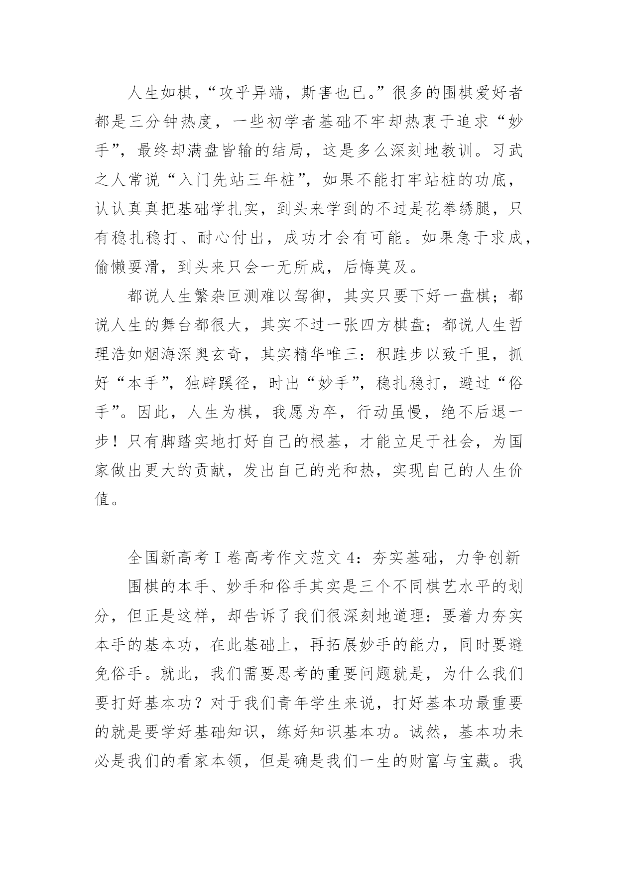 2022优秀高考语文作文在现实生活或工作学习中,说到作文,大家肯定都不陌生吧,借助作文可以提高我们的语言组织能力。相信许多人会觉得作文很难写吧,下面是小编精心整理的2022优秀高考语文作文,仅供参考,希望能够帮助到大家。2022年全国新高考I卷高考作文题目:本手、妙手、俗手作文材料:阅读下面的材料,根据要求写作。“本手、妙手、俗手”是围棋的三个术语。本手是指合乎棋理的正规下法;妙手是指出人意料的精妙下法;俗手是指貌似合理,而从全局看通常会受损的下法。对于初学者而言,应该从本手开始,本手的功夫扎实了,棋力才会提高。一些初学者热衷于追求妙手,而忽视更为常用的本手。本手是基础,妙手是创造。一般来说,对本手理解深刻,才可能出现妙手;否则,难免下出俗手,水平也不易提升。以上材料对我们颇具启示意义。请结合材料写一篇文章,体现你的感悟与思考。要求:选准角度,确定立意,明确文体,自拟标题;不要套作,不得抄袭;不得泄露个人信息;不少于800字。全国新高考I卷高考作文范文1:品棋道,悟人生本手是开始,是走向妙手的起点,而没有妙手的过程,也难以达到俗手的境界,我们生活与学习的历练过程何尝又不是这样呢?人生宛若一盘纵横的棋局,每一颗黑白棋子的落定,正如我们人生的每一步前行,一步一个脚印,在于黑白棋子间穿梭,我们可以感悟到人生的棋道与棋法。围棋中“本手、妙手、俗手”的术语,三种不同的棋法,或是合乎棋理的正规,或是出人意料的精妙,又或是貌似合理实则有损的局限,都是态度与思想的映射,是对我们自己的一种历练,是不同的人生行走之道。那么作为掌棋者的我们,又应如何落下自己的人生棋子呢?在现实的生活之中,面对人生纵横繁杂的棋盘,当以务本求妙之心落脱俗无悔之子。所以,毫无疑问,作为掌棋者的我们,每个人都渴望棋盘上妙手生花的创造。何以达到如此境界呢?唯有本手的一次次功夫筑基,脚踏实地一步一个脚印。可有些人却只看到了每一次妙手的出乎意料、精妙绝伦,却忽视了全局落棋的内在的关联,忽视了妙手背后是无数次本手的历练与考量,所以导致最终不仅失了妙手,反落得俗手的结局,棋艺平平不起,一败涂地。这似乎看起来很简单的道理,但究其根本,是我们只看得见眼前而看不到长远的认知,是急于追求而忽视基础的“欲速则不达”。只热衷于追求妙手,而忽视了更为常用的本手,就好像是空有好皮囊的汽车,内部却净是破损脆弱的零件,所以不堪受用、走不长远;即使确实下出几次妙手,却也只是停留在表象的妙,达不到深层次的妙手招数,貌似合理甚至精妙,但又以全局观之,却自损前路,导致早早败下阵来,妙手最终成俗手。人生未尝不是如此呢,忽视了基础、不想着如何提升自身的硬实力基础,而一味追求外在的表面包装、一瞬的惊艳,许多人只看得到眼前的利益,而忽视了长远,忘记了如何走得踏实端正,忘了初心,最终自己走向了失败的泥沼,处处受损的棋局,最终悔恨不已,难以展现出俗手的风范。所以,“本手”这一功夫基础的重要性不言而喻。我们不仅是人生的掌棋者,更是正处于青春之际的人生初学者,从本手开始,秉承务本之心尤为关键。本手是合乎棋理的正规下法,是棋道的入门功。但本手绝不仅仅是机械的简单重复,在本手的学习过程中,我们观学基本步法,由生涩到娴熟,这才是开始;掌握正规合制的基础后,我们在不断练习中扎实功夫,求索经验最终灵活运用,这是积极上进;但我们绝不仅仅止步于此,熟练掌握后,怀揣着求妙之心,我们要开始思考每一步本手的所在意义,考量每一步本手对全棋局的贡献,通过不断的深入理解中,才是对棋道的不断丰富的认识。在这样一种回环往复中,我们的才能一步步地夯实基础、提升技艺,深刻理解“棋法”本身,在平常中观其联系,在小步间洞见全局,只有这样,我们才有助力全局、妙手生花的创造可能,才可免于急功近利之俗手。“本手是基础,妙手是创造”,人生的棋道正应如此,在基础中求创造,在务实中求脱俗之妙。品棋道,悟人生。在当今世界日新月异的变化中,面对人生纵横繁杂的棋盘,我们当以务本求妙之心落脱俗无悔之子。行之踏实,行之务本,方可达妙,方能致远,不忘初心,方得始终,找回自己的俗手人生,不负青春。全国新高考I卷高考作文范文2:本手开路,妙手通途人生如棋,有人总能出人意料,在普通的轨道上宕开一笔,精妙至极;有人规规矩矩地按着棋理走,走出了本分人生;但也有人,往往只看眼前的利益行棋,给人生留下满盘遗憾。人生如何走?本手,妙手,还是俗手?个人认为,本手开新路,妙手达通途,二者缺一不可。本手是妙手的前提。何谓本手?“本”为木之根,是一件事情得以成就的基础。按着本手下棋,我们棋出有数,稳扎稳打,路出有招,如水入万渠,各成世界。它是路遥在动笔写《平凡的世界》前认认真真在陕北窑洞整理十年报纸的无限耐心。没有老老实实做学问的笨功夫,钱钟书怎能写出《围城》里的许多妙语?没有规规矩矩按着前人的路子在实验