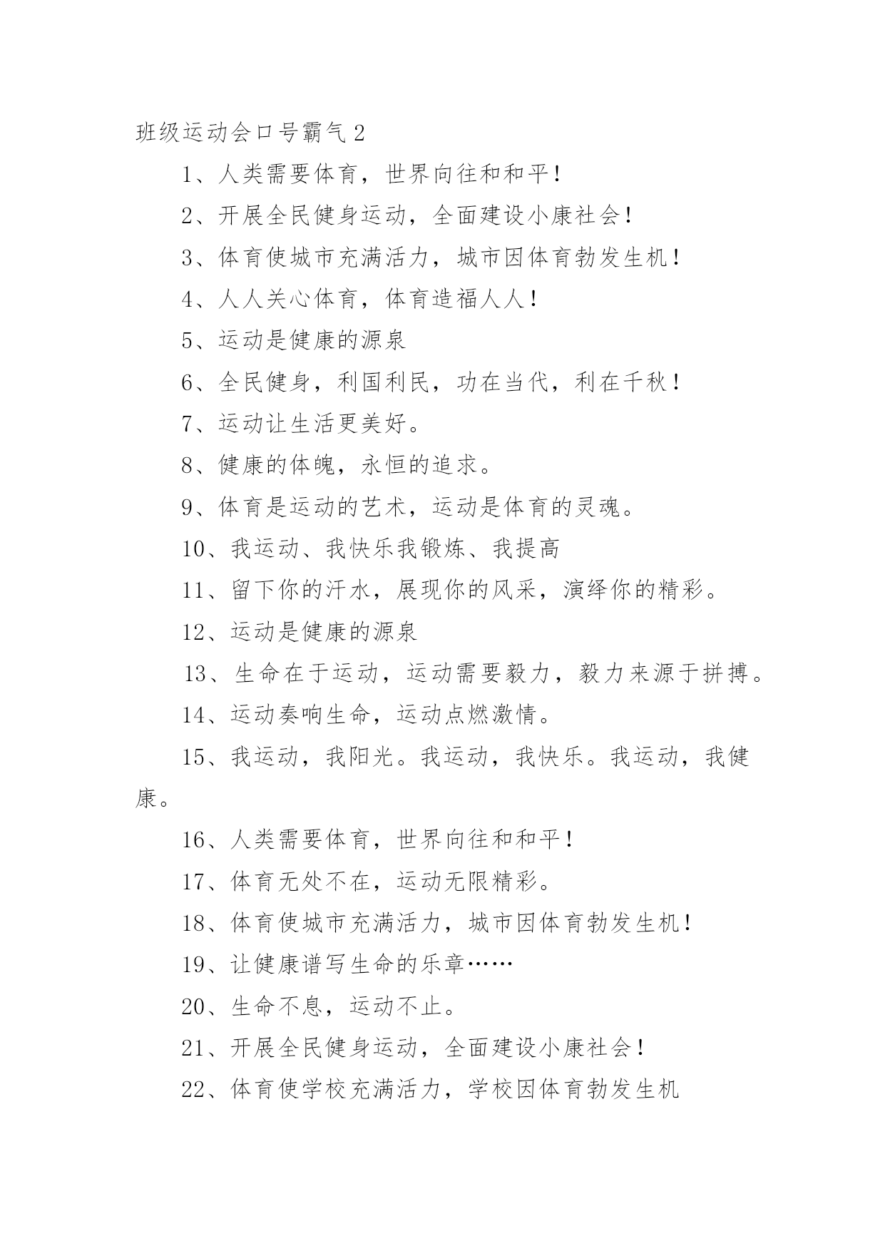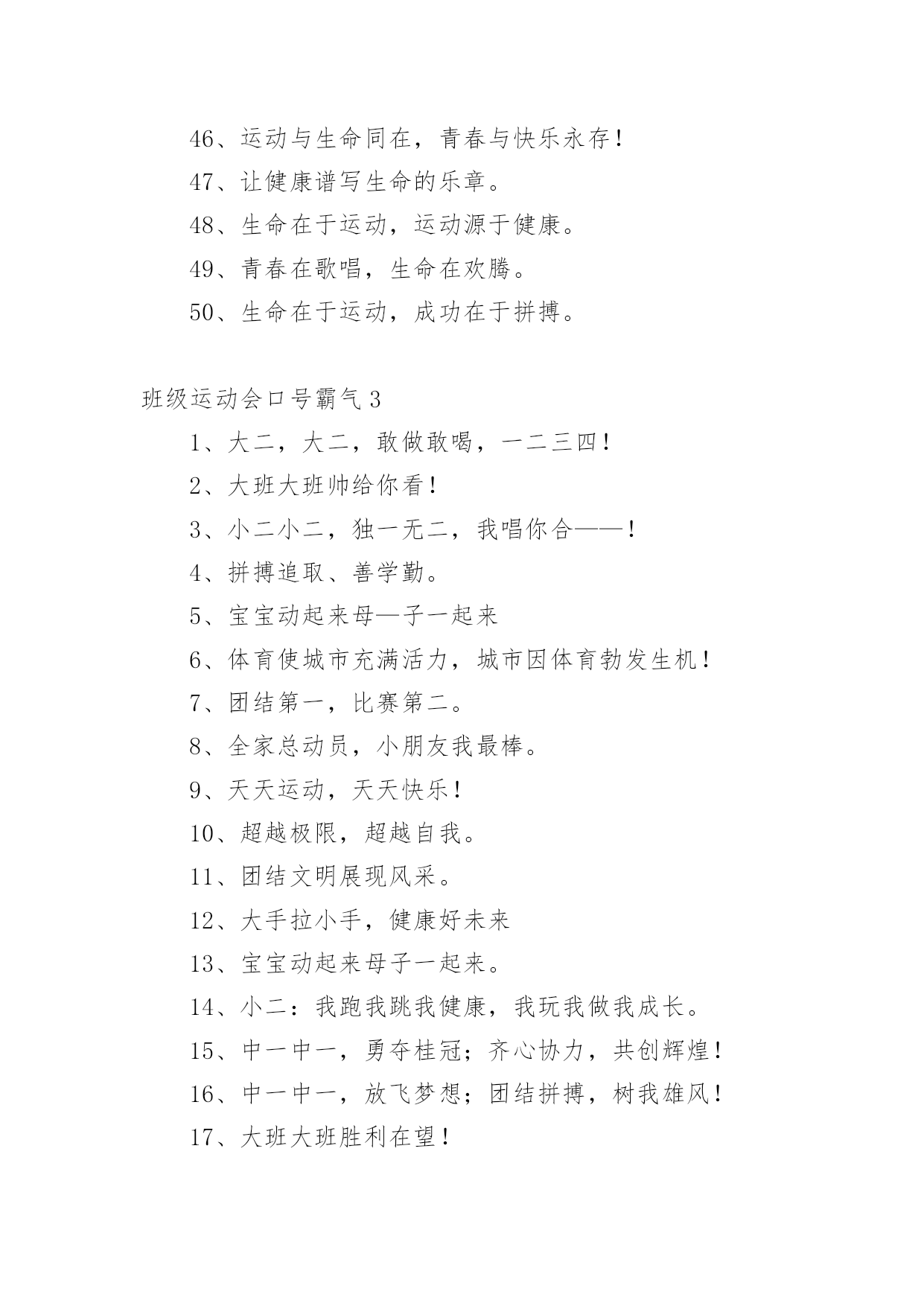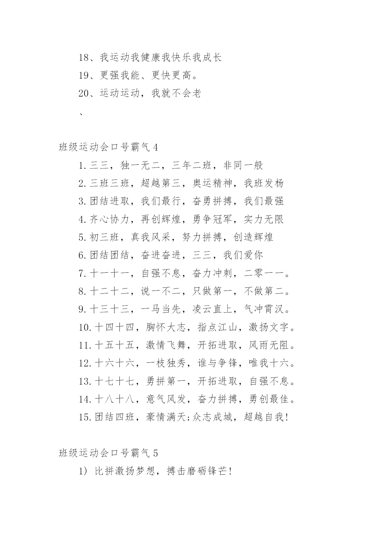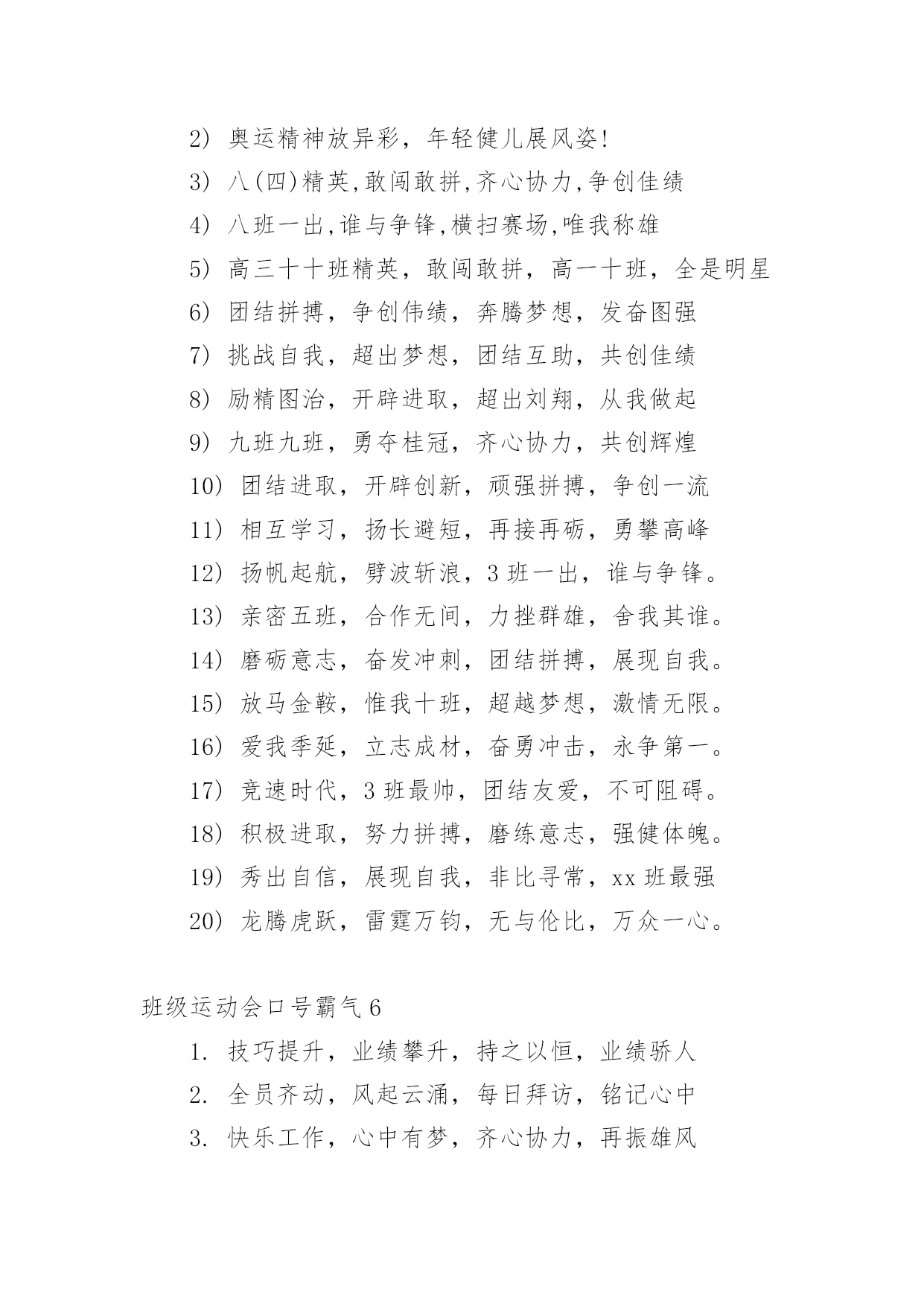 班级运动会口号霸气在日常学习、工作抑或是生活中,大家都不可避免地会接触到口号吧,口号是指挥一个团队共同行为的指令。那些被广泛运用的口号都是什么样子的呢?以下是小编为大家收集的班级运动会口号霸气,欢迎阅读与收藏。班级运动会口号霸气11.十班十班独一无二2.策马金安为我十班3.互帮互助团结友爱4.疯狂学习活泼玩耍5.艰苦风斗铁杵成针6.矢志不移滴水穿石7.不骄不馁迈向成功8.脚踏实地早日圆梦9.十班十班沉舟破釜10.零八佳绩非我莫属11.斗志昂扬三五最强12.十班十班非同一般13.勇往直前大干一番14.山不厌高海不厌深15.养怡之福可得永年班级运动会口号霸气21、人类需要体育,世界向往和和平!2、开展全民健身运动,全面建设小康社会!3、体育使城市充满活力,城市因体育勃发生机!4、人人关心体育,体育造福人人!5、运动是健康的源泉6、全民健身,利国利民,功在当代,利在千秋!7、运动让生活更美好。8、健康的体魄,永恒的追求。9、体育是运动的艺术,运动是体育的灵魂。10、我运动、我快乐我锻炼、我提高11、留下你的汗水,展现你的风采,演绎你的精彩。12、运动是健康的源泉13、生命在于运动,运动需要毅力,毅力来源于拼搏。14、运动奏响生命,运动点燃激情。15、我运动,我阳光。我运动,我快乐。我运动,我健康。16、人类需要体育,世界向往和和平!17、体育无处不在,运动无限精彩。18、体育使城市充满活力,城市因体育勃发生机!19、让健康谱写生命的乐章……20、生命不息,运动不止。21、开展全民健身运动,全面建设小康社会!22、体育使学校充满活力,学校因体育勃发生机23、运动是快乐的源泉,快乐是生命的财富。24、音符让音乐有了旋律,运动让生命充满健康。25、更强我能、更快更高。26、运动使我们充满活力,活力让生命变得美丽。27、青春无畏,逐梦扬威。28、我运动,我健康;我快乐,我阳光。29、努力拼搏,永夺第一。30、比出风采、超越自我31、生命无止境,运动无极限32、人人关心体育,体育造福人人!33、谱写生命之歌,弘杨运动精神。34、发展体育运动,增强人民体质!35、每天锻炼一小时,健康工作五十年,幸福生活一辈子。36、缔造阳光校园,促进和谐发展运动让生活更美好。37、生命不息,运动不止。38、体育是运动的艺术,运动是体育的灵魂。39、生命无止境,运动无极限40、谱写生命之歌,弘杨运动精神。41、健康的体魄,永恒的追求。42、搏生命之极限,铸青春之辉煌。43、运动是快乐的源泉,快乐是生命的财富。44、生命在于运动,运动需要毅力,毅力来源与拼搏。45、我运动,我快乐,争做时代好少年!46、运动与生命同在,青春与快乐永存!47、让健康谱写生命的乐章。48、生命在于运动,运动源于健康。49、青春在歌唱,生命在欢腾。50、生命在于运动,成功在于拼搏。班级运动会口号霸气31、大二,大二,敢做敢喝,一二三四!2、大班大班帅给你看!3、小二小二,独一无二,我唱你合——!4、拼搏追取、善学勤。5、宝宝动起来母—子一起来6、体育使城市充满活力,城市因体育勃发生机!7、团结第一,比赛第二。8、全家总动员,小朋友我最棒。9、天天运动,天天快乐!10、超越极限,超越自我。11、团结文明展现风采。12、大手拉小手,健康好未来13、宝宝动起来母子一起来。14、小二:我跑我跳我健康,我玩我做我成长。15、中一中一,勇夺桂冠;齐心协力,共创辉煌!16、中一中一,放飞梦想;团结拼搏,树我雄风!17、大班大班胜利在望!18、我运动我健康我快乐我成长19、更强我能、更快更高。20、运动运动,我就不会老、班级运动会口号霸气41.三三,独一无二,三年二班,非同一般2.三班三班,超越第三,奥运精神,我班发杨3.团结进取,我们最行,奋勇拼搏,我们最强4.齐心协力,再创辉煌,勇争冠军,实力无限5.初三班,真我风采,努力拼搏,创造辉煌6.团结团结,奋进奋进,三三,我们爱你7.十一十一,自强不息,奋力冲刺,二零一一。8.十二十二,说一不二,只做第一,不做第二。9.十三十三,一马当先,凌云直上,气冲霄汉。10.十四十四,胸怀大志,指点江山,激扬文字。11.十五十五,激情飞舞,开拓进取,风雨无阻。12.十六十六,一枝独秀,谁与争锋,唯我十六。13.十七十七,勇拼第一,开拓进取,自强不息。14.十八十八,意气风发,奋力拼搏,勇创最佳。15.团结四班,豪情满天;众志成城,超越自我!班级运动会口号霸气51)比拼激扬梦想,搏击磨砺锋芒!2)奥运精神放异彩,年轻健儿展风姿!3)八(四)精英,敢闯敢拼,齐心协力,争创佳绩4)八班一出,谁与争锋,横扫赛场,唯我称雄5)高三十十班精英,敢闯敢拼,高一十班,全是明星6)团结拼搏,争创伟绩,奔腾梦想,发奋图强7)挑战自我,超出梦想,团结互助,共创佳绩8)励精图治,开辟进