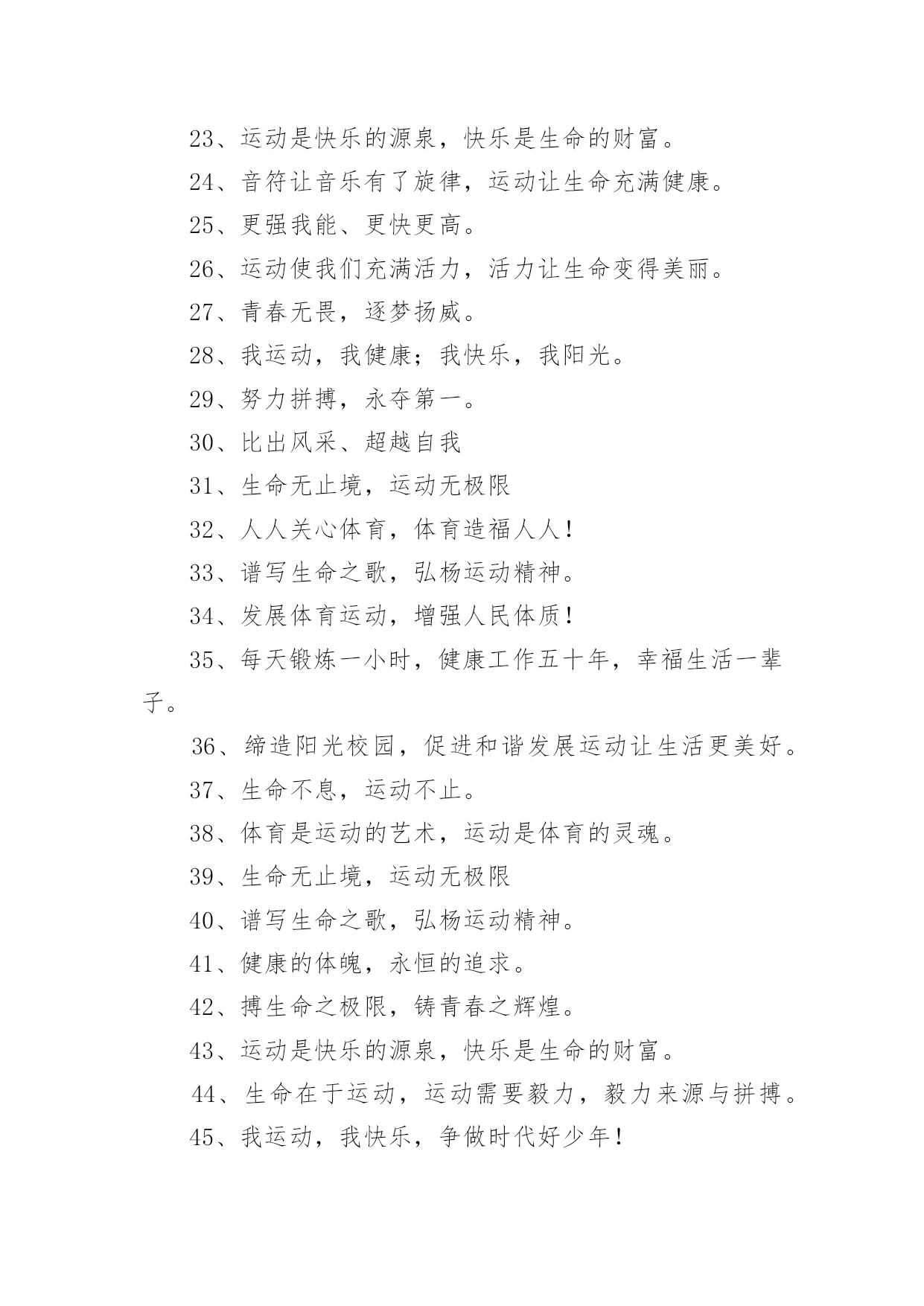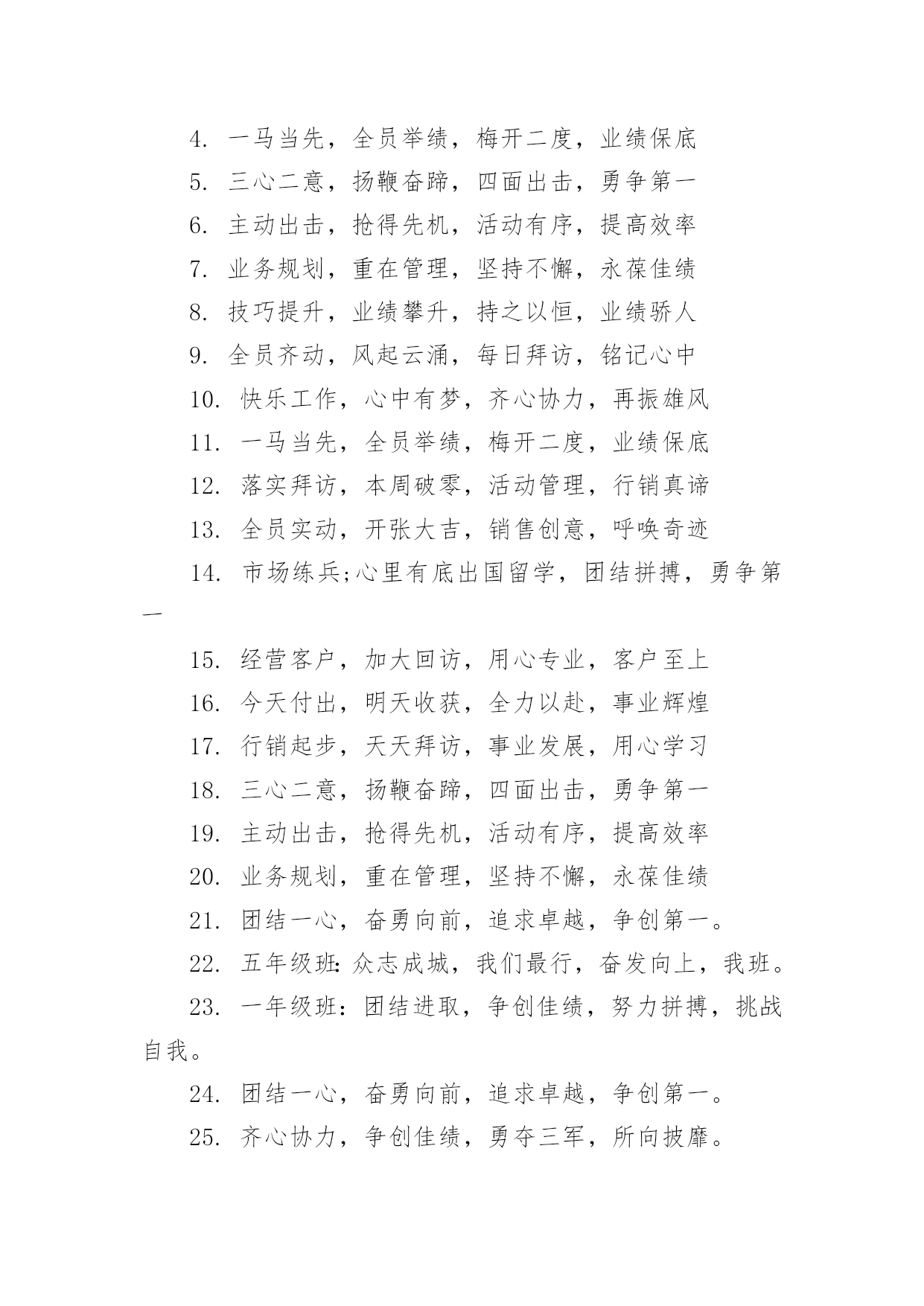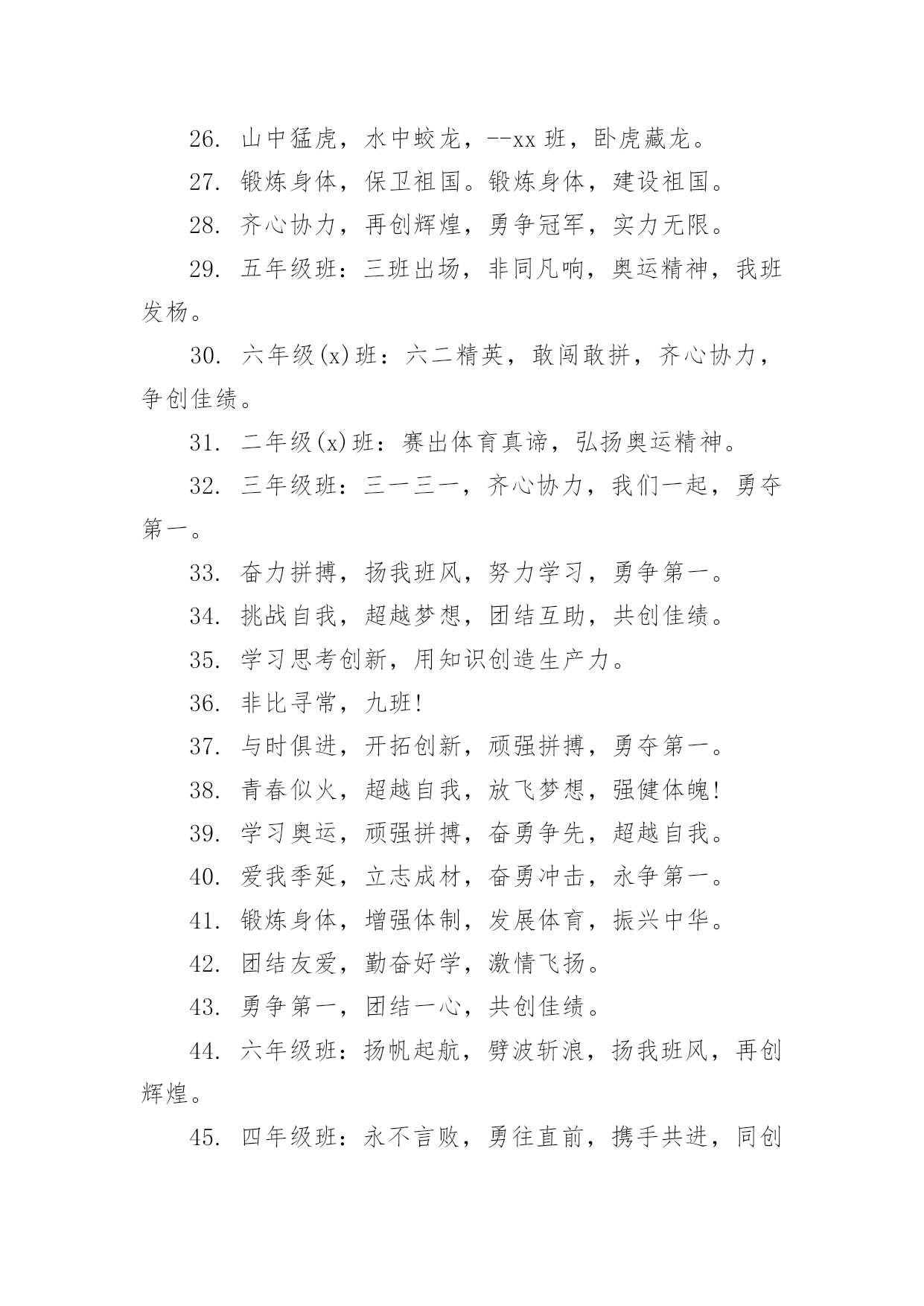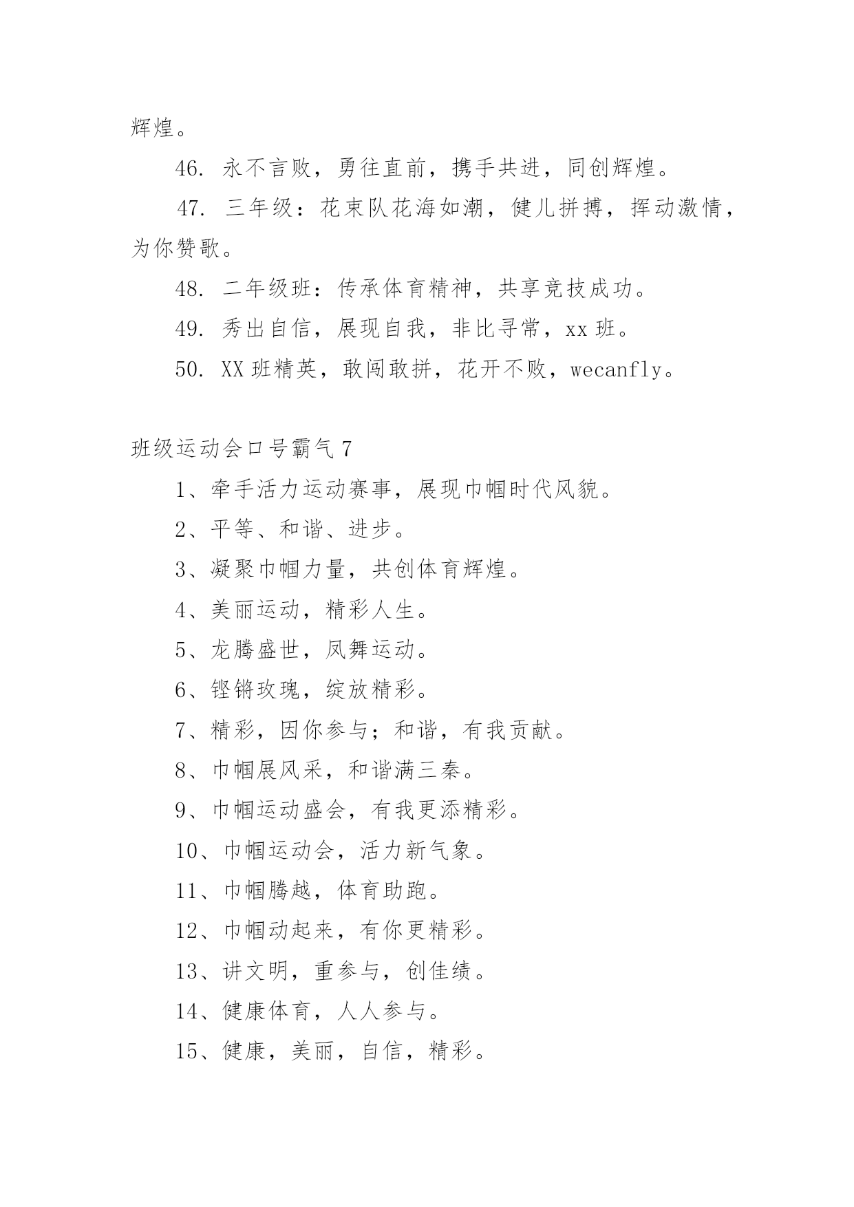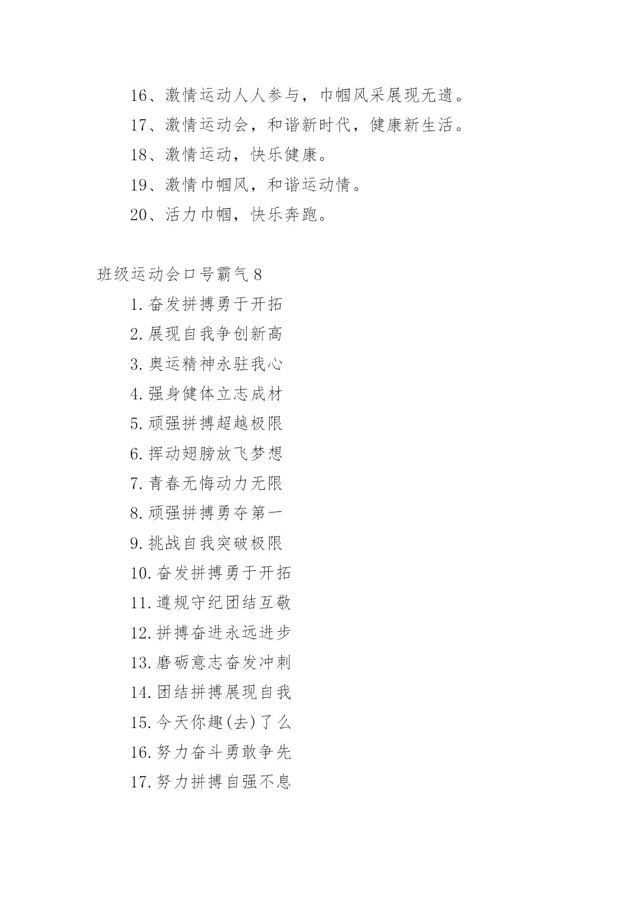 班级运动会口号霸气在日常学习、工作抑或是生活中,大家都不可避免地会接触到口号吧,口号是指挥一个团队共同行为的指令。那些被广泛运用的口号都是什么样子的呢?以下是小编为大家收集的班级运动会口号霸气,欢迎阅读与收藏。班级运动会口号霸气11.十班十班独一无二2.策马金安为我十班3.互帮互助团结友爱4.疯狂学习活泼玩耍5.艰苦风斗铁杵成针6.矢志不移滴水穿石7.不骄不馁迈向成功8.脚踏实地早日圆梦9.十班十班沉舟破釜10.零八佳绩非我莫属11.斗志昂扬三五最强12.十班十班非同一般13.勇往直前大干一番14.山不厌高海不厌深15.养怡之福可得永年班级运动会口号霸气21、人类需要体育,世界向往和和平!2、开展全民健身运动,全面建设小康社会!3、体育使城市充满活力,城市因体育勃发生机!4、人人关心体育,体育造福人人!5、运动是健康的源泉6、全民健身,利国利民,功在当代,利在千秋!7、运动让生活更美好。8、健康的体魄,永恒的追求。9、体育是运动的艺术,运动是体育的灵魂。10、我运动、我快乐我锻炼、我提高11、留下你的汗水,展现你的风采,演绎你的精彩。12、运动是健康的源泉13、生命在于运动,运动需要毅力,毅力来源于拼搏。14、运动奏响生命,运动点燃激情。15、我运动,我阳光。我运动,我快乐。我运动,我健康。16、人类需要体育,世界向往和和平!17、体育无处不在,运动无限精彩。18、体育使城市充满活力,城市因体育勃发生机!19、让健康谱写生命的乐章……20、生命不息,运动不止。21、开展全民健身运动,全面建设小康社会!22、体育使学校充满活力,学校因体育勃发生机23、运动是快乐的源泉,快乐是生命的财富。24、音符让音乐有了旋律,运动让生命充满健康。25、更强我能、更快更高。26、运动使我们充满活力,活力让生命变得美丽。27、青春无畏,逐梦扬威。28、我运动,我健康;我快乐,我阳光。29、努力拼搏,永夺第一。30、比出风采、超越自我31、生命无止境,运动无极限32、人人关心体育,体育造福人人!33、谱写生命之歌,弘杨运动精神。34、发展体育运动,增强人民体质!35、每天锻炼一小时,健康工作五十年,幸福生活一辈子。36、缔造阳光校园,促进和谐发展运动让生活更美好。37、生命不息,运动不止。38、体育是运动的艺术,运动是体育的灵魂。39、生命无止境,运动无极限40、谱写生命之歌,弘杨运动精神。41、健康的体魄,永恒的追求。42、搏生命之极限,铸青春之辉煌。43、运动是快乐的源泉,快乐是生命的财富。44、生命在于运动,运动需要毅力,毅力来源与拼搏。45、我运动,我快乐,争做时代好少年!46、运动与生命同在,青春与快乐永存!47、让健康谱写生命的乐章。48、生命在于运动,运动源于健康。49、青春在歌唱,生命在欢腾。50、生命在于运动,成功在于拼搏。班级运动会口号霸气31、大二,大二,敢做敢喝,一二三四!2、大班大班帅给你看!3、小二小二,独一无二,我唱你合——!4、拼搏追取、善学勤。5、宝宝动起来母—子一起来6、体育使城市充满活力,城市因体育勃发生机!7、团结第一,比赛第二。8、全家总动员,小朋友我最棒。9、天天运动,天天快乐!10、超越极限,超越自我。11、团结文明展现风采。12、大手拉小手,健康好未来13、宝宝动起来母子一起来。14、小二:我跑我跳我健康,我玩我做我成长。15、中一中一,勇夺桂冠;齐心协力,共创辉煌!16、中一中一,放飞梦想;团结拼搏,树我雄风!17、大班大班胜利在望!18、我运动我健康我快乐我成长19、更强我能、更快更高。20、运动运动,我就不会老、班级运动会口号霸气41.三三,独一无二,三年二班,非同一般2.三班三班,超越第三,奥运精神,我班发杨3.团结进取,我们最行,奋勇拼搏,我们最强4.齐心协力,再创辉煌,勇争冠军,实力无限5.初三班,真我风采,努力拼搏,创造辉煌6.团结团结,奋进奋进,三三,我们爱你7.十一十一,自强不息,奋力冲刺,二零一一。8.十二十二,说一不二,只做第一,不做第二。9.十三十三,一马当先,凌云直上,气冲霄汉。10.十四十四,胸怀大志,指点江山,激扬文字。11.十五十五,激情飞舞,开拓进取,风雨无阻。12.十六十六,一枝独秀,谁与争锋,唯我十六。13.十七十七,勇拼第一,开拓进取,自强不息。14.十八十八,意气风发,奋力拼搏,勇创最佳。15.团结四班,豪情满天;众志成城,超越自我!班级运动会口号霸气51)比拼激扬梦想,搏击磨砺锋芒!2)奥运精神放异彩,年轻健儿展风姿!3)八(四)精英,敢闯敢拼,齐心协力,争创佳绩4)八班一出,谁与争锋,横扫赛场,唯我称雄5)高三十十班精英,敢闯敢拼,高一十班,全是明星6)团结拼搏,争创伟绩,奔腾梦想,发奋图强7)挑战自我,超出梦想,团结互助,共创佳绩8)励精图治,开辟进