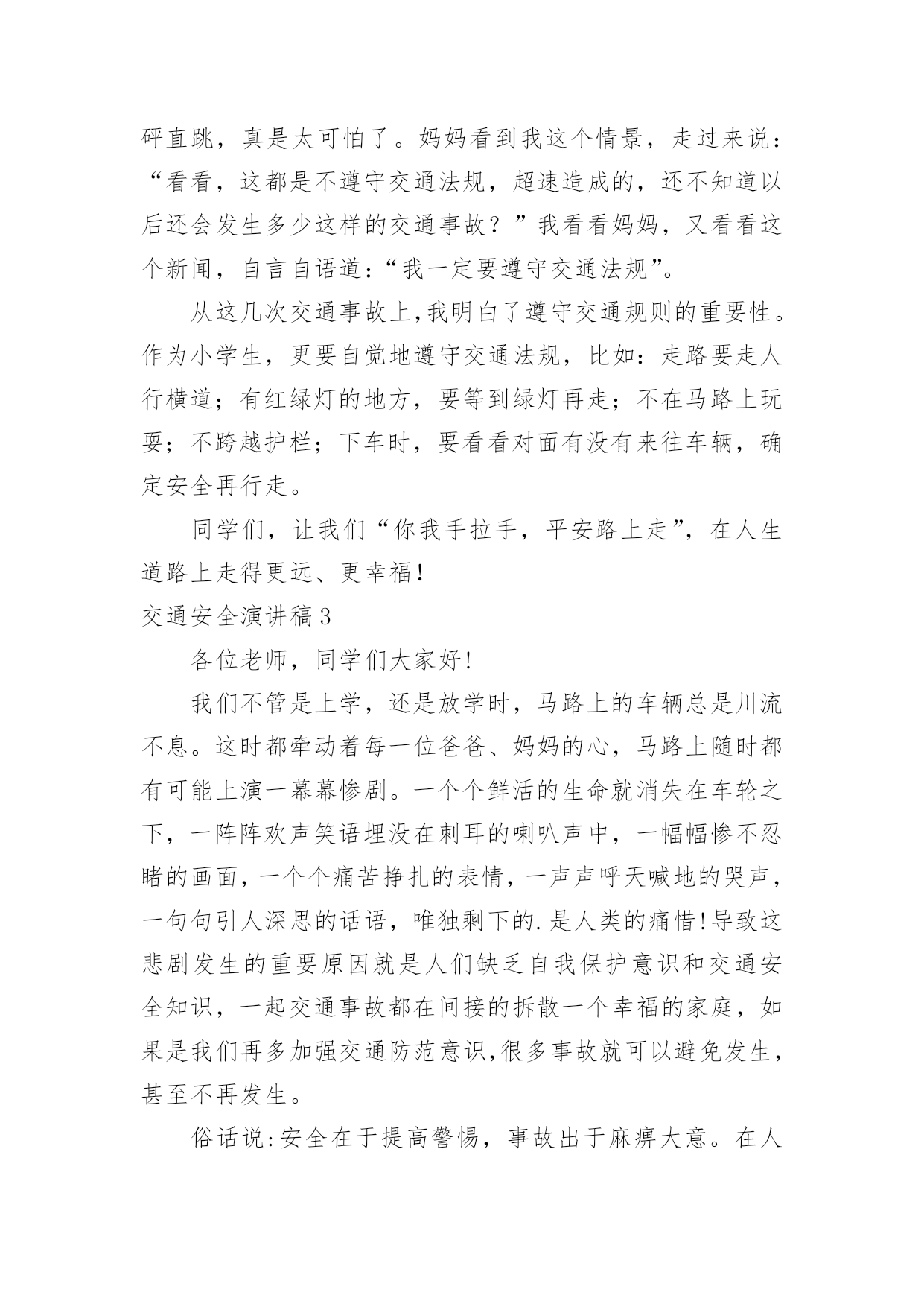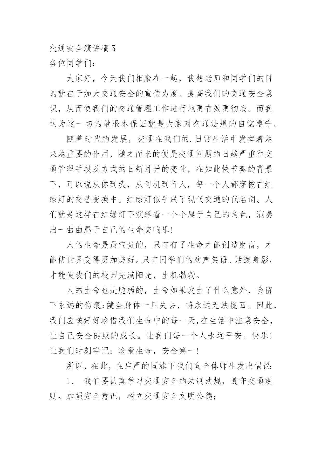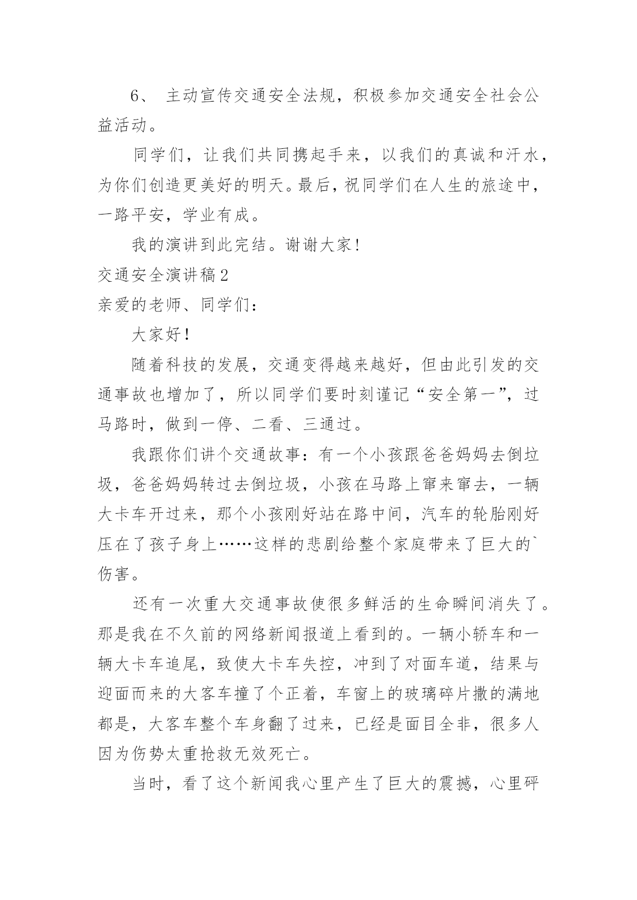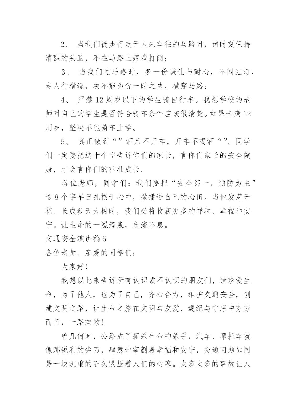 交通安全演讲稿交通安全演讲稿(共15篇)好的演讲稿可以引导听众,使听众能更好地理解演讲的内容。在学习、工作生活中,演讲稿对我们的作用越来越大,你写演讲稿时总是没有新意?以下是小编为大家收集的交通安全演讲稿,仅供参考,希望能够帮助到大家。交通安全演讲稿1亲爱的同学们:大家好!借着今天早自习的时间,我向同学们讲讲交通安全方面的知识以及有关如何提高未成年人自我保护能力的问题。同学们,你们目前承担着繁重的学习任务,将来还要肩负起比我们现在更为艰巨的建设祖国的神圣使命,因此,我作为老师,更作为你们的长辈,我能为你们做到的就是要给予你们更多更细的关爱,关心你们的健康成长,维护你们的合法权益。根据社会发展以及当前形势的'需要,学校一直把搞好交通安全工作当做我们的神圣职责。但是,我们应该清醒的认识到,由于经济的发展和车辆的猛增,我们面临的交通安全形势仍然是相当严峻和复杂的,不安全的因素时时在威胁着同学们的安全。大量的车祸让人触目惊心,血的教训在提醒着我们。每当看到小学生出现交通违法行为时,我们就会感到十分不安;每当看到小学生发生交通意外时,我们就会感到万分痛心。同学们,对于交通事故的危害,我们千万不能掉以轻心,如果我们把这样的交通事故当成交通故事来听的时候,那么同样的危险也将离我们不远了。我们强调交通安全的重要并不是让同学们感到危机四伏,惊慌失措。恰恰相反,我们要通过加强交通安全宣传教育工作来提高同学们的交通安全意识和自我保护能力,以健全的素质和充分的自信面临复杂的环境,适应社会的发展,这也是我们当前提倡素质教育的一项重要内容。我们小学生虽然还不是社会活动的主要参与者,但却是社会交通的重要参与者。作为未成年人,学会基本的交通安全知识,学会好好保护自己、避免交通意外的危害和消除危害交通安全的行为,就是对社会、对学校、对家庭最大的贡献。老师希望同学们能认真学习交通法规,不断增强交通安全意识,告别不文明的交通行为,树立良好的道德风尚。做到以下几点:1、认真学习交通安全常识,自觉遵守交通秩序;2、靠路边行走,横过道路走斑马线。做到“一停、二看、三通过”;3、不闯红灯、不乱穿道路、不在道路上嬉闹玩耍,不越护栏、不追车扒车、不抛物击车;4、排队乘车、不向窗外乱扔东西,从右侧下车,不乘坐带病车、超载车和农用车;5、遇交通违法行为及时纠正,遇交通事故主动报警;6、主动宣传交通安全法规,积极参加交通安全社会公益活动。同学们,让我们共同携起手来,以我们的真诚和汗水,为你们创造更美好的明天。最后,祝同学们在人生的旅途中,一路平安,学业有成。我的演讲到此完结。谢谢大家!交通安全演讲稿2亲爱的老师、同学们:大家好!随着科技的发展,交通变得越来越好,但由此引发的交通事故也增加了,所以同学们要时刻谨记“安全第一”,过马路时,做到一停、二看、三通过。我跟你们讲个交通故事:有一个小孩跟爸爸妈妈去倒垃圾,爸爸妈妈转过去倒垃圾,小孩在马路上窜来窜去,一辆大卡车开过来,那个小孩刚好站在路中间,汽车的轮胎刚好压在了孩子身上……这样的悲剧给整个家庭带来了巨大的`伤害。还有一次重大交通事故使很多鲜活的生命瞬间消失了。那是我在不久前的网络新闻报道上看到的。一辆小轿车和一辆大卡车追尾,致使大卡车失控,冲到了对面车道,结果与迎面而来的大客车撞了个正着,车窗上的玻璃碎片撒的满地都是,大客车整个车身翻了过来,已经是面目全非,很多人因为伤势太重抢救无效死亡。当时,看了这个新闻我心里产生了巨大的震撼,心里砰砰直跳,真是太可怕了。妈妈看到我这个情景,走过来说:“看看,这都是不遵守交通法规,超速造成的,还不知道以后还会发生多少这样的交通事故?”我看看妈妈,又看看这个新闻,自言自语道:“我一定要遵守交通法规”。从这几次交通事故上,我明白了遵守交通规则的重要性。作为小学生,更要自觉地遵守交通法规,比如:走路要走人行横道;有红绿灯的地方,要等到绿灯再走;不在马路上玩耍;不跨越护栏;下车时,要看看对面有没有来往车辆,确定安全再行走。同学们,让我们“你我手拉手,平安路上走”,在人生道路上走得更远、更幸福!交通安全演讲稿3各位老师,同学们大家好!我们不管是上学,还是放学时,马路上的车辆总是川流不息。这时都牵动着每一位爸爸、妈妈的心,马路上随时都有可能上演一幕幕惨剧。一个个鲜活的生命就消失在车轮之下,一阵阵欢声笑语埋没在刺耳的喇叭声中,一幅幅惨不忍睹的画面,一个个痛苦挣扎的表情,一声声呼天喊地的哭声,一句句引人深思的话语,唯独剩下的.是人类的痛惜!导致这悲剧发生的重要原因就是人们缺乏自我保护意识和交通安全知识,一起交通事故都在间接的拆散一个幸福的家庭,如果是我们再多加强交通防范意识,很多事故就可以避免发生,甚至不再发生。俗话说:安全在于提高警惕,事故出于麻痹大意。在人们的眼中,造成悲剧的发生,就是开车不谨慎,不然就