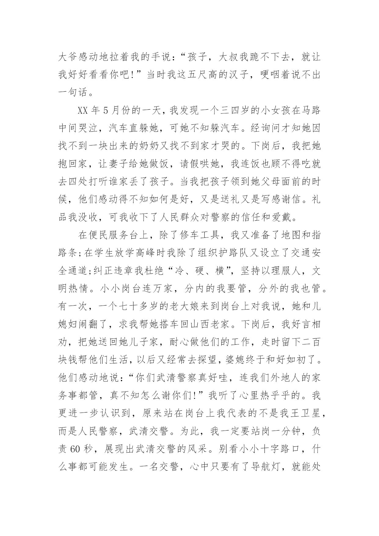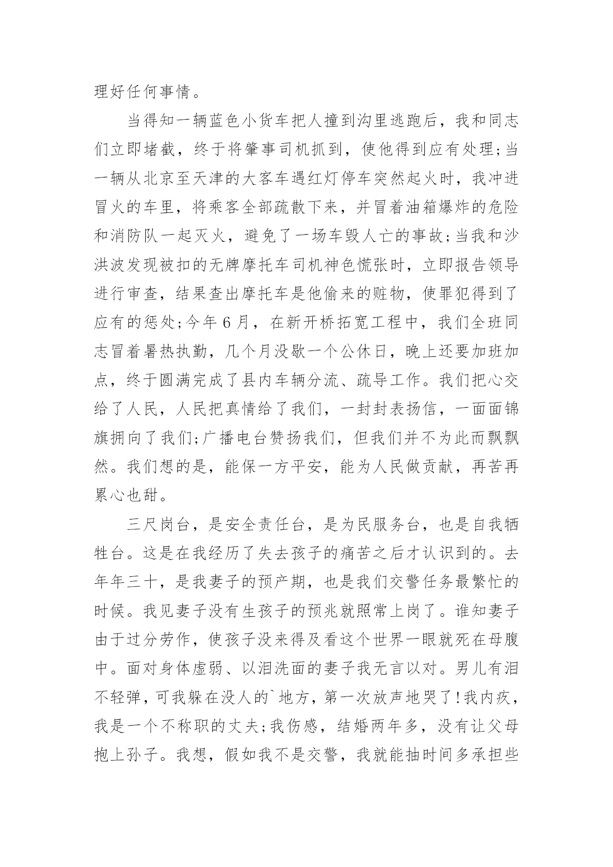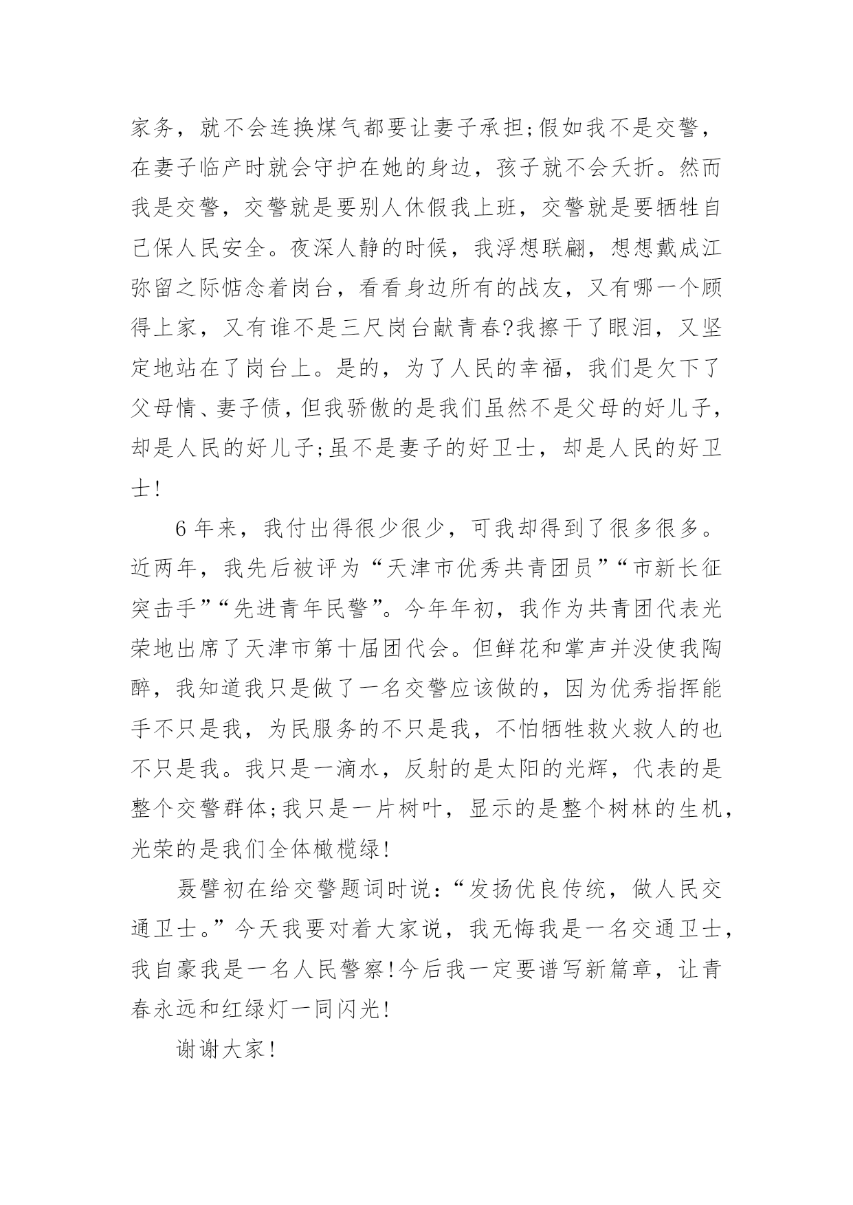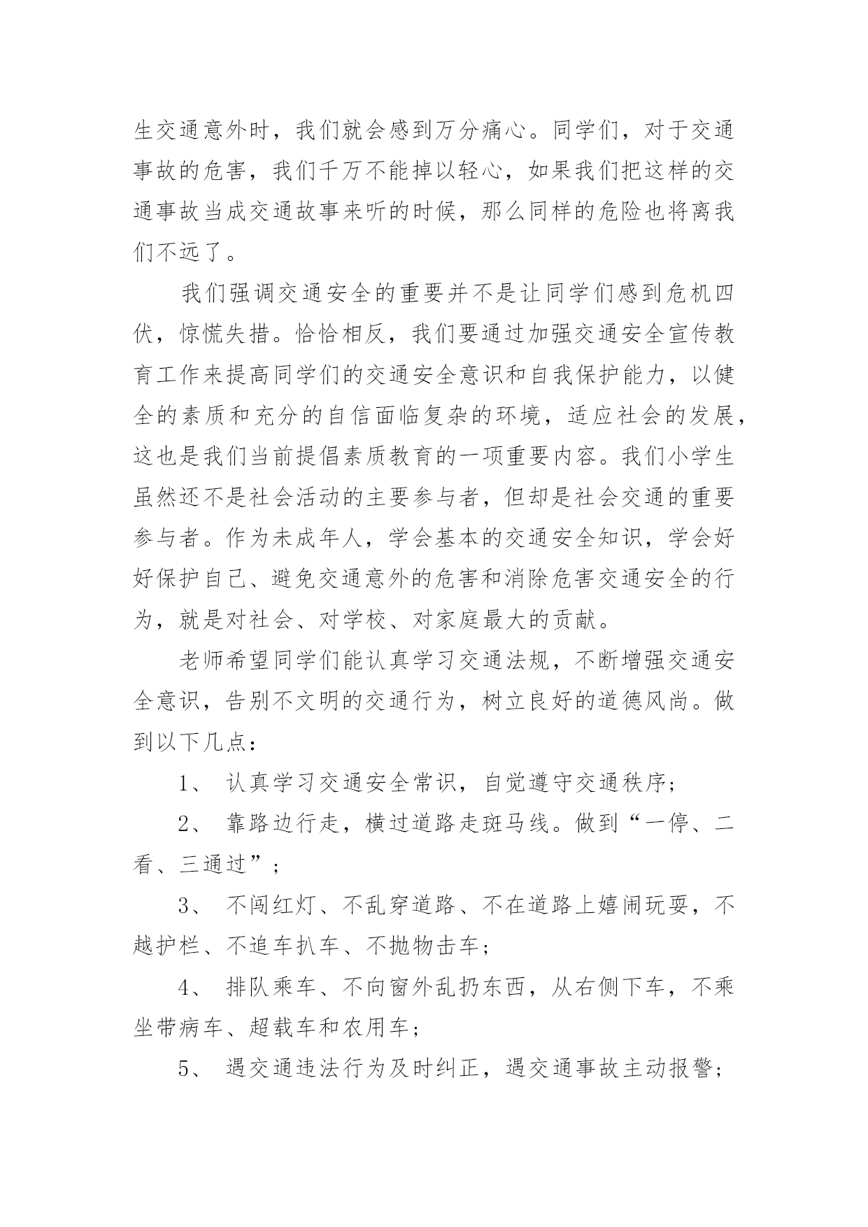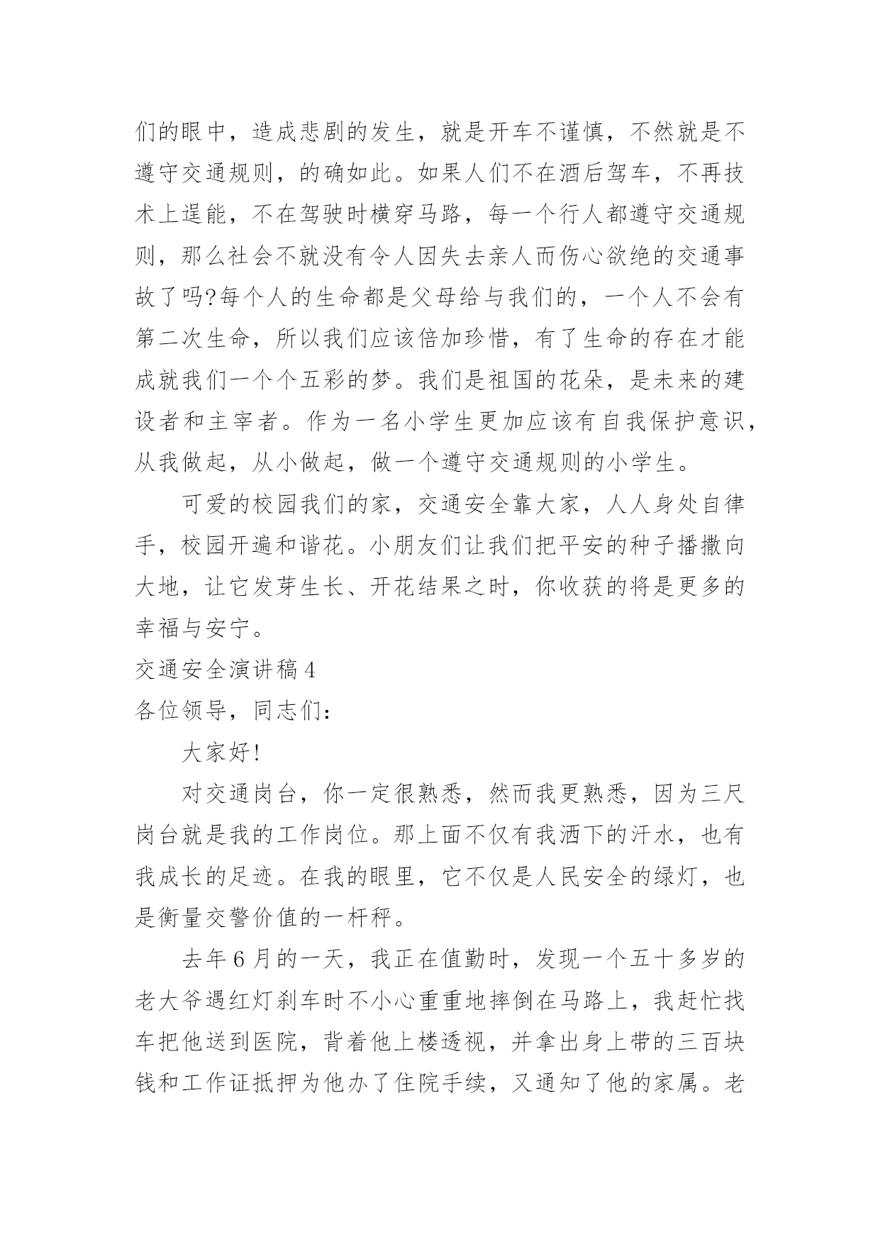 交通安全演讲稿交通安全演讲稿(共15篇)好的演讲稿可以引导听众,使听众能更好地理解演讲的内容。在学习、工作生活中,演讲稿对我们的作用越来越大,你写演讲稿时总是没有新意?以下是小编为大家收集的交通安全演讲稿,仅供参考,希望能够帮助到大家。交通安全演讲稿1亲爱的同学们:大家好!借着今天早自习的时间,我向同学们讲讲交通安全方面的知识以及有关如何提高未成年人自我保护能力的问题。同学们,你们目前承担着繁重的学习任务,将来还要肩负起比我们现在更为艰巨的建设祖国的神圣使命,因此,我作为老师,更作为你们的长辈,我能为你们做到的就是要给予你们更多更细的关爱,关心你们的健康成长,维护你们的合法权益。根据社会发展以及当前形势的'需要,学校一直把搞好交通安全工作当做我们的神圣职责。但是,我们应该清醒的认识到,由于经济的发展和车辆的猛增,我们面临的交通安全形势仍然是相当严峻和复杂的,不安全的因素时时在威胁着同学们的安全。大量的车祸让人触目惊心,血的教训在提醒着我们。每当看到小学生出现交通违法行为时,我们就会感到十分不安;每当看到小学生发生交通意外时,我们就会感到万分痛心。同学们,对于交通事故的危害,我们千万不能掉以轻心,如果我们把这样的交通事故当成交通故事来听的时候,那么同样的危险也将离我们不远了。我们强调交通安全的重要并不是让同学们感到危机四伏,惊慌失措。恰恰相反,我们要通过加强交通安全宣传教育工作来提高同学们的交通安全意识和自我保护能力,以健全的素质和充分的自信面临复杂的环境,适应社会的发展,这也是我们当前提倡素质教育的一项重要内容。我们小学生虽然还不是社会活动的主要参与者,但却是社会交通的重要参与者。作为未成年人,学会基本的交通安全知识,学会好好保护自己、避免交通意外的危害和消除危害交通安全的行为,就是对社会、对学校、对家庭最大的贡献。老师希望同学们能认真学习交通法规,不断增强交通安全意识,告别不文明的交通行为,树立良好的道德风尚。做到以下几点:1、认真学习交通安全常识,自觉遵守交通秩序;2、靠路边行走,横过道路走斑马线。做到“一停、二看、三通过”;3、不闯红灯、不乱穿道路、不在道路上嬉闹玩耍,不越护栏、不追车扒车、不抛物击车;4、排队乘车、不向窗外乱扔东西,从右侧下车,不乘坐带病车、超载车和农用车;5、遇交通违法行为及时纠正,遇交通事故主动报警;6、主动宣传交通安全法规,积极参加交通安全社会公益活动。同学们,让我们共同携起手来,以我们的真诚和汗水,为你们创造更美好的明天。最后,祝同学们在人生的旅途中,一路平安,学业有成。我的演讲到此完结。谢谢大家!交通安全演讲稿2亲爱的老师、同学们:大家好!随着科技的发展,交通变得越来越好,但由此引发的交通事故也增加了,所以同学们要时刻谨记“安全第一”,过马路时,做到一停、二看、三通过。我跟你们讲个交通故事:有一个小孩跟爸爸妈妈去倒垃圾,爸爸妈妈转过去倒垃圾,小孩在马路上窜来窜去,一辆大卡车开过来,那个小孩刚好站在路中间,汽车的轮胎刚好压在了孩子身上……这样的悲剧给整个家庭带来了巨大的`伤害。还有一次重大交通事故使很多鲜活的生命瞬间消失了。那是我在不久前的网络新闻报道上看到的。一辆小轿车和一辆大卡车追尾,致使大卡车失控,冲到了对面车道,结果与迎面而来的大客车撞了个正着,车窗上的玻璃碎片撒的满地都是,大客车整个车身翻了过来,已经是面目全非,很多人因为伤势太重抢救无效死亡。当时,看了这个新闻我心里产生了巨大的震撼,心里砰砰直跳,真是太可怕了。妈妈看到我这个情景,走过来说:“看看,这都是不遵守交通法规,超速造成的,还不知道以后还会发生多少这样的交通事故?”我看看妈妈,又看看这个新闻,自言自语道:“我一定要遵守交通法规”。从这几次交通事故上,我明白了遵守交通规则的重要性。作为小学生,更要自觉地遵守交通法规,比如:走路要走人行横道;有红绿灯的地方,要等到绿灯再走;不在马路上玩耍;不跨越护栏;下车时,要看看对面有没有来往车辆,确定安全再行走。同学们,让我们“你我手拉手,平安路上走”,在人生道路上走得更远、更幸福!交通安全演讲稿3各位老师,同学们大家好!我们不管是上学,还是放学时,马路上的车辆总是川流不息。这时都牵动着每一位爸爸、妈妈的心,马路上随时都有可能上演一幕幕惨剧。一个个鲜活的生命就消失在车轮之下,一阵阵欢声笑语埋没在刺耳的喇叭声中,一幅幅惨不忍睹的画面,一个个痛苦挣扎的表情,一声声呼天喊地的哭声,一句句引人深思的话语,唯独剩下的.是人类的痛惜!导致这悲剧发生的重要原因就是人们缺乏自我保护意识和交通安全知识,一起交通事故都在间接的拆散一个幸福的家庭,如果是我们再多加强交通防范意识,很多事故就可以避免发生,甚至不再发生。俗话说:安全在于提高警惕,事故出于麻痹大意。在人们的眼中,造成悲剧的发生,就是开车不谨慎,不然就