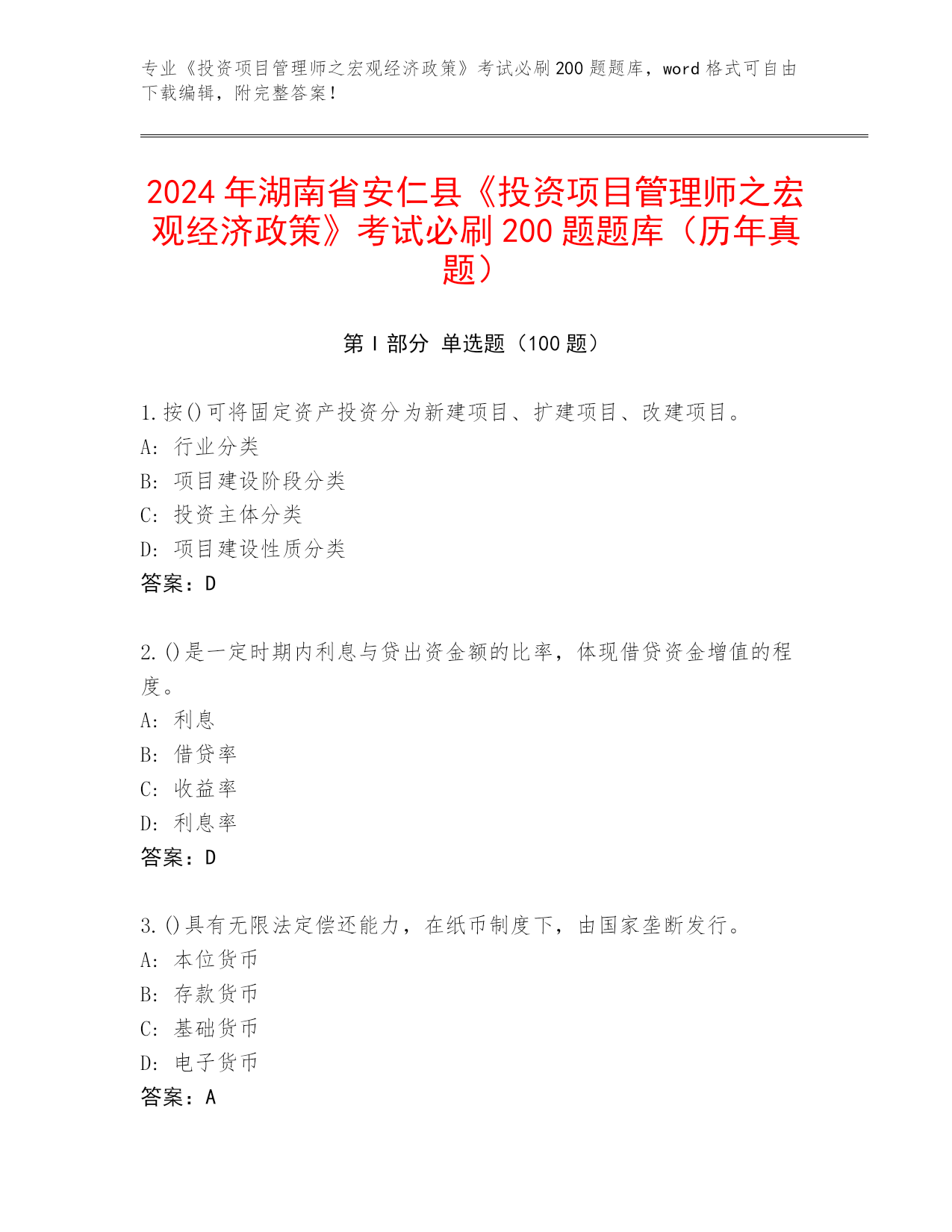 2024年湖南省安仁县《投资项目管理师之宏观经济政策》考试必刷200题真题带答案(最新)