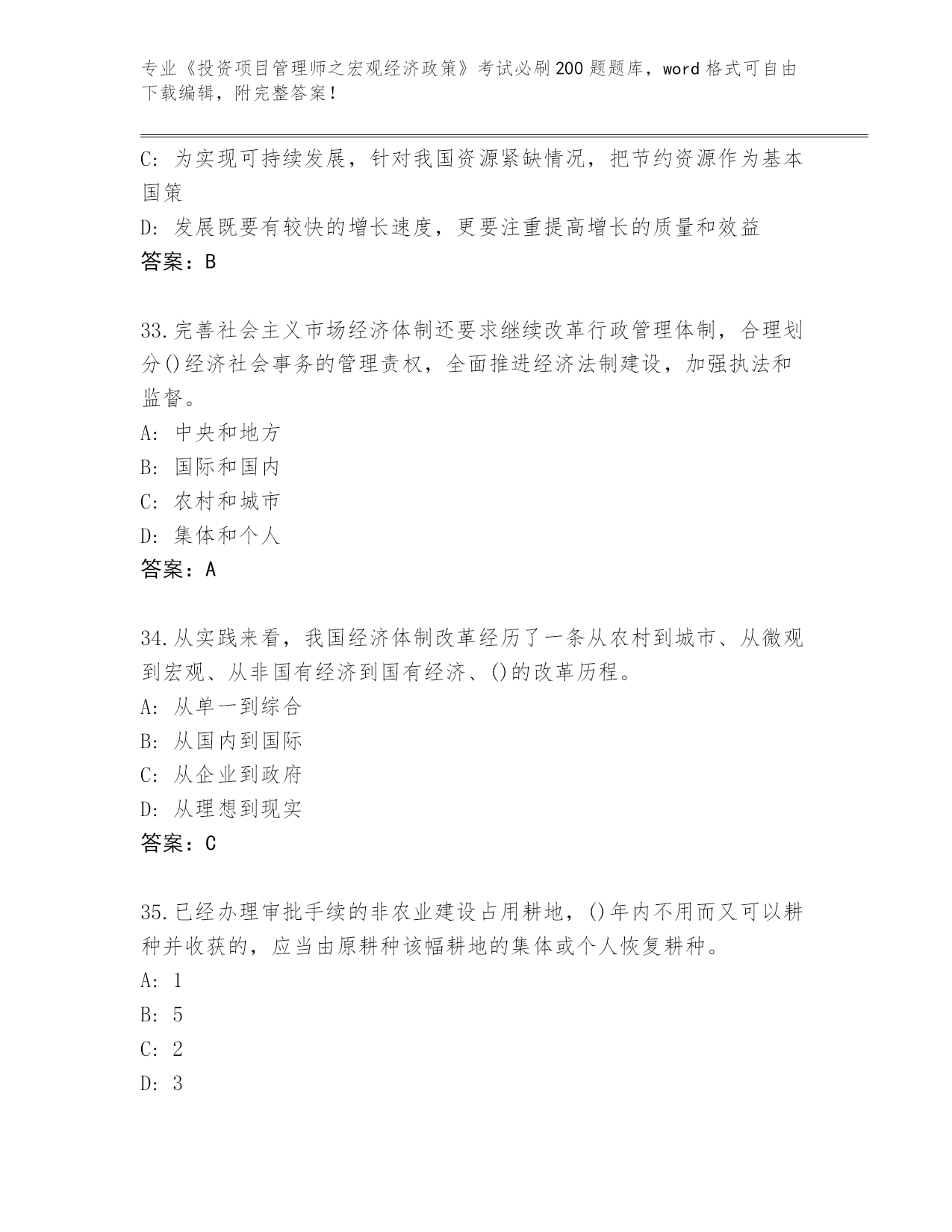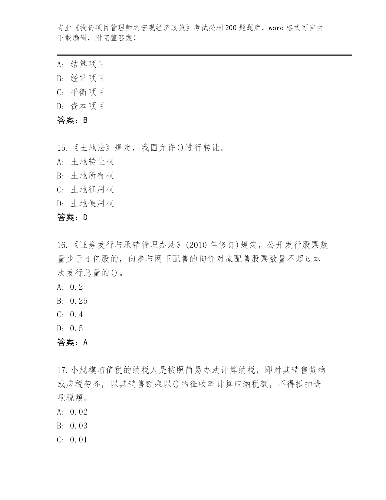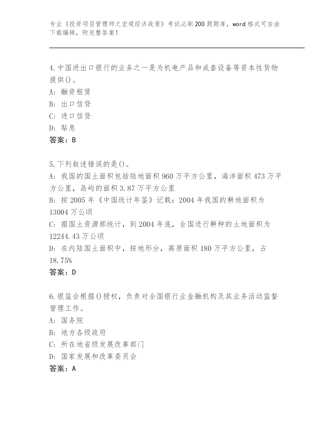 湖南省内部使用《投资项目管理师之宏观经济政策》资格考试必刷200题题库及答案(历年真题)