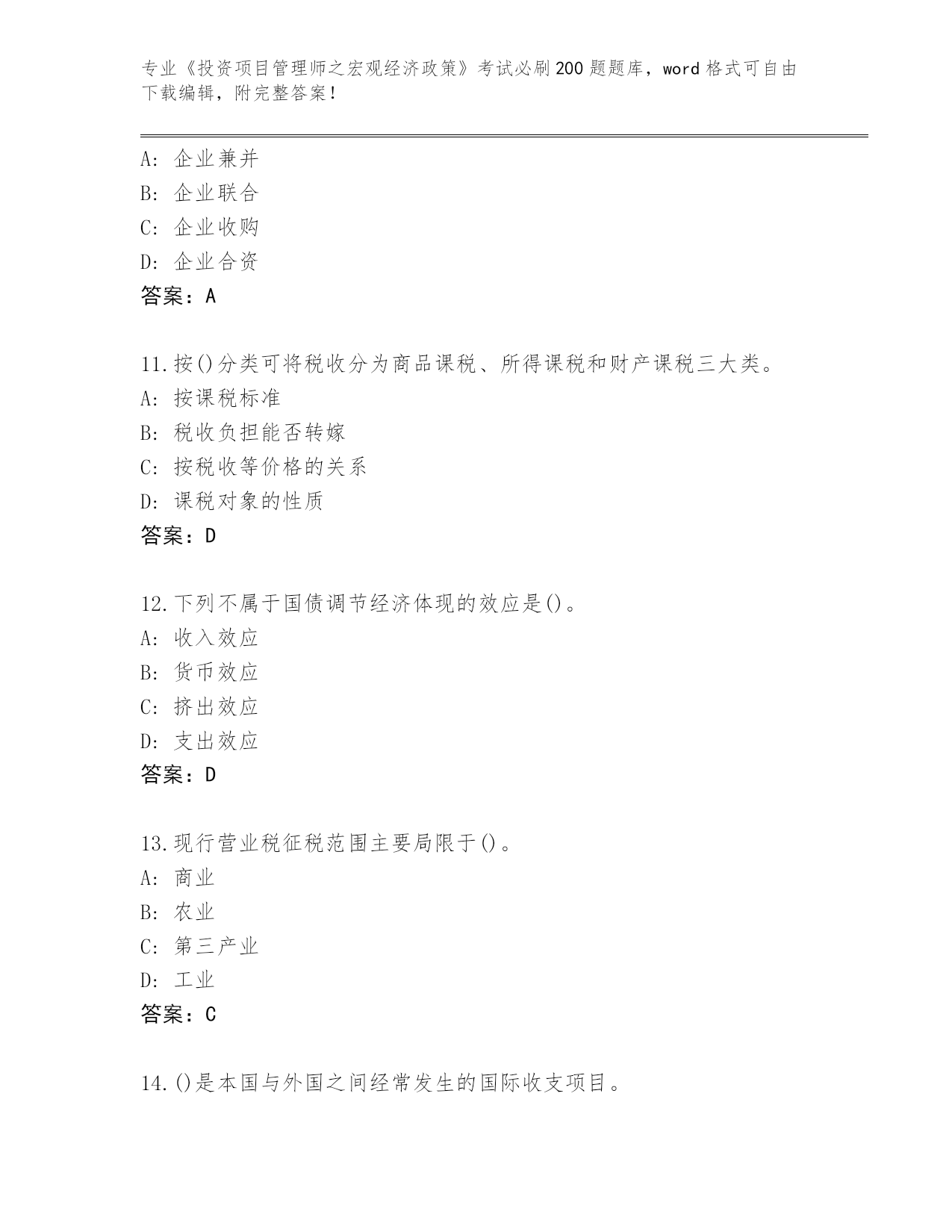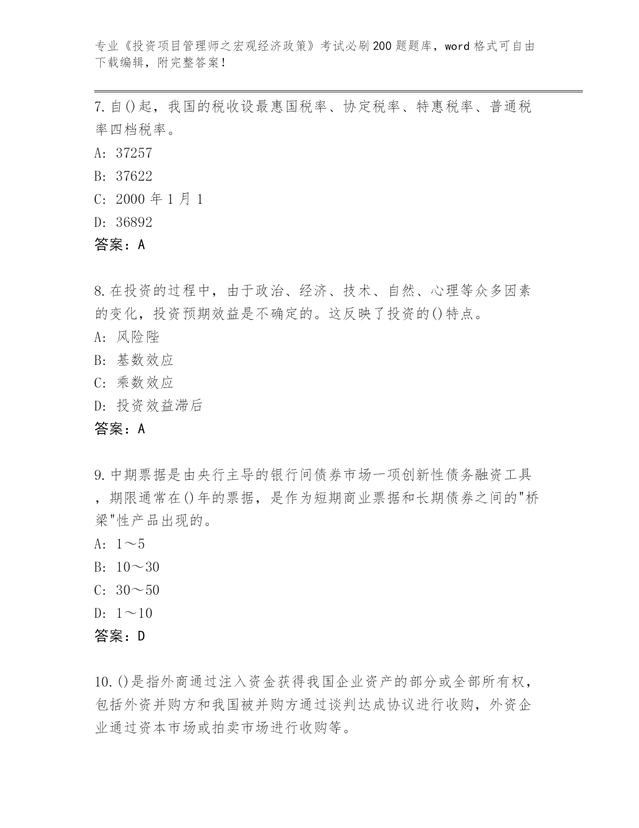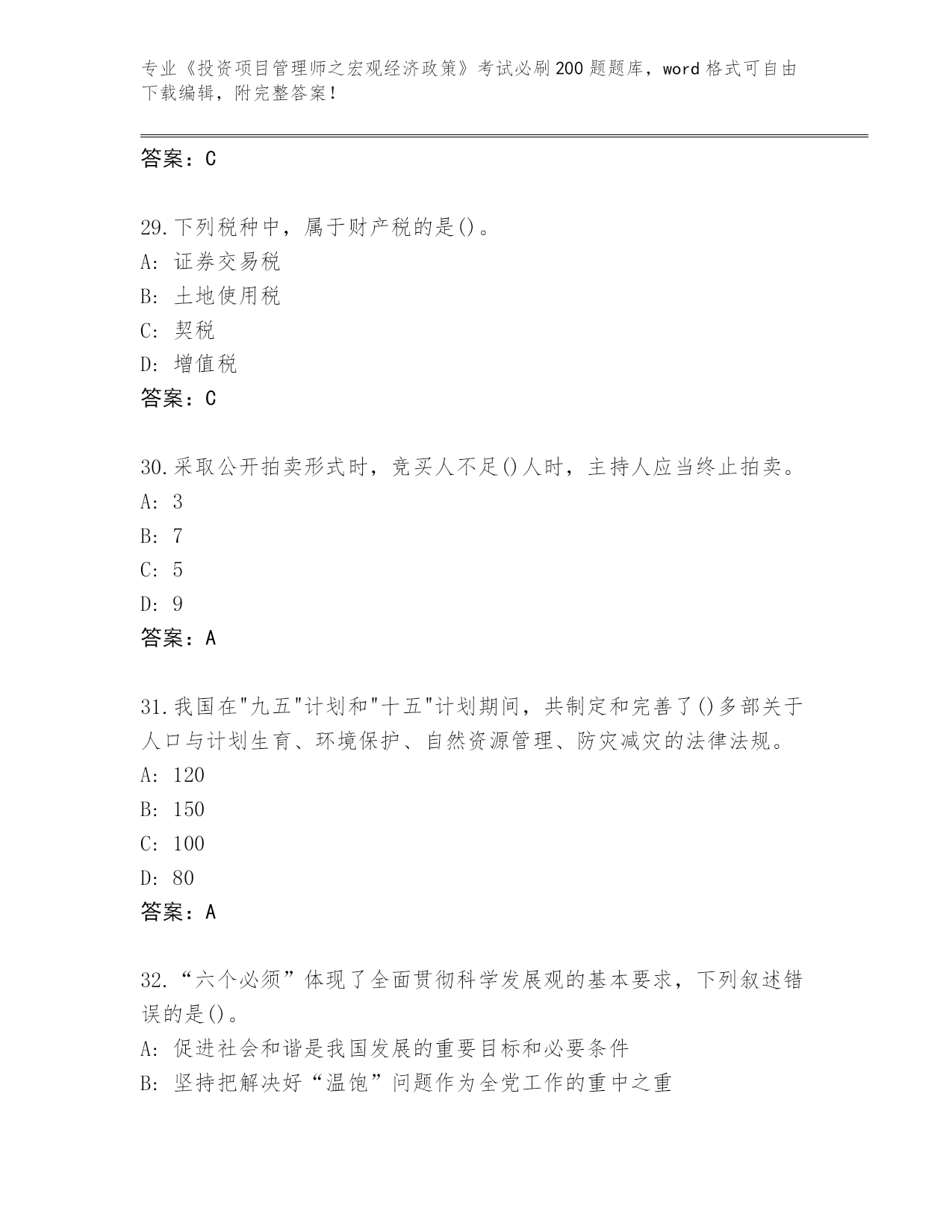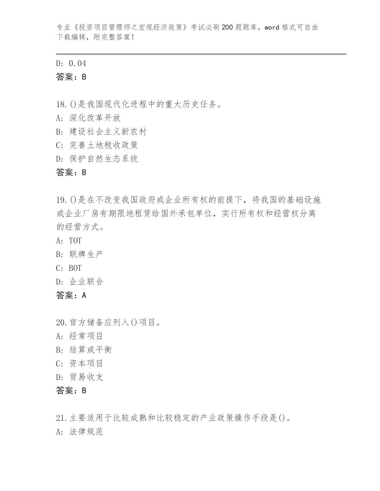 湖南省内部使用《投资项目管理师之宏观经济政策》资格考试必刷200题题库及答案(历年真题)