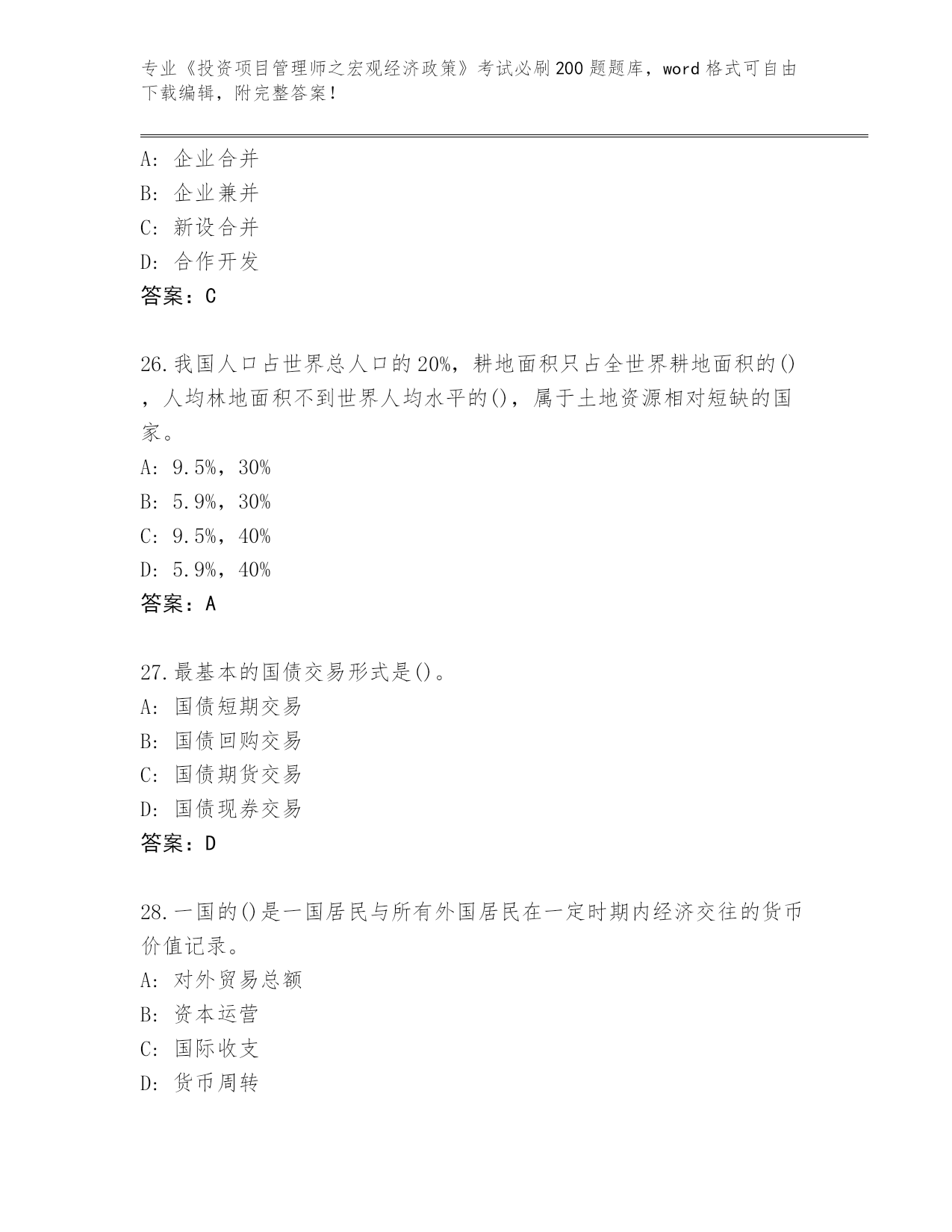 河北省高邑县《投资项目管理师之宏观经济政策》考试必刷200题真题题库【历年真题】