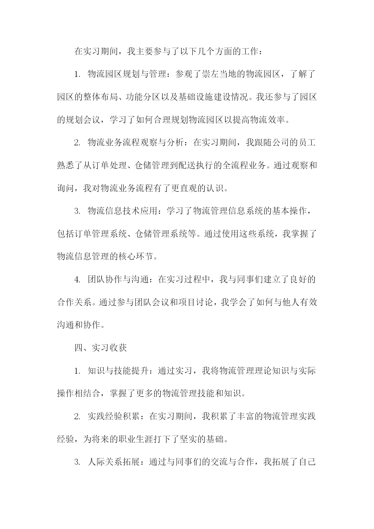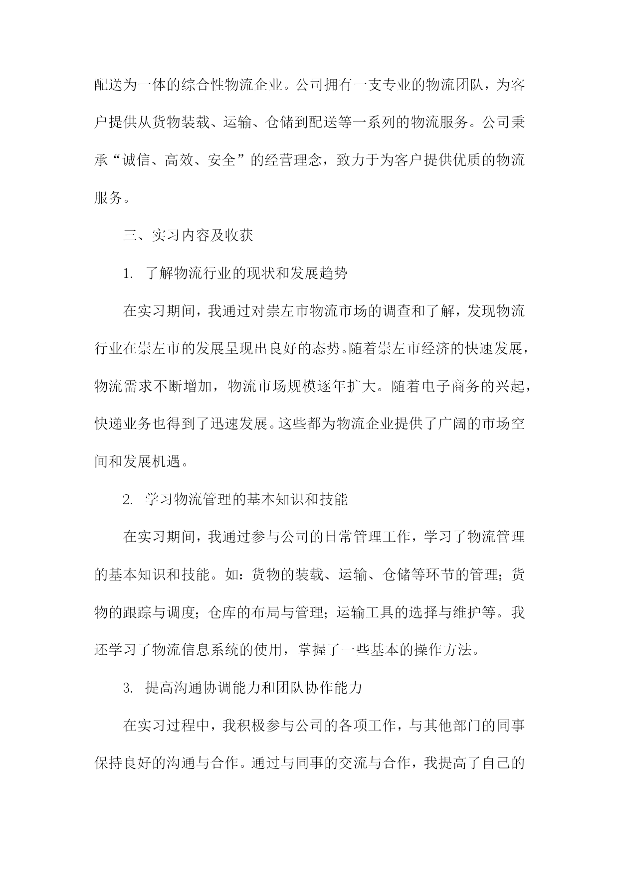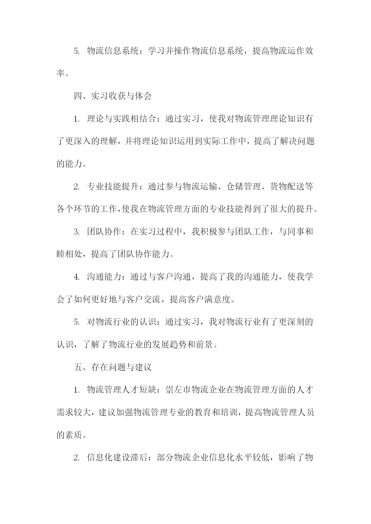 崇左物流管理实习报告总结一、实习背景与目的本次实习活动于XXXX年XX月至XXXX年XX月期间在崇左市某物流公司进行,旨在通过实践活动,深入了解物流管理运作流程,将理论知识与实际工作相结合,提高专业技能,为未来的职业发展打下坚实的基础。二、实习单位简介崇左市某物流公司是一家专业从事物流运输、仓储管理、货物配送等业务的综合性物流企业。公司拥有完善的物流设施、先进的物流技术和管理经验,是地区内物流行业的佼佼者。三、实习内容1.物流运输管理:参与货物运输的全过程管理,包括运输路线的规划、运输工具的选择、运输成本的核算等。2.仓储管理:了解并参与到仓库的货物入库、出库、盘点、保管等日常管理工作。3.货物配送:参与货物的配送工作,包括订单处理、货物分拣、包装、装运等。4.客户服务:协助处理客户咨询、投诉,维护客户关系。5.物流信息系统:学习并操作物流信息系统,提高物流运作效率。四、实习收获与体会1.理论与实践相结合:通过实习,使我对物流管理理论知识有了更深入的理解,并将理论知识运用到实际工作中,提高了解决问题的能力。2.专业技能提升:通过参与物流运输、仓储管理、货物配送等各个环节的工作,使我在物流管理方面的专业技能得到了很大的提升。3.团队协作:在实习过程中,我积极参与团队工作,与同事和睦相处,提高了团队协作能力。4.沟通能力:通过与客户沟通,提高了我的沟通能力,使我学会了如何更好地与客户交流,提高客户满意度。5.对物流行业的认识:通过实习,我对物流行业有了更深刻的认识,了解了物流行业的发展趋势和前景。五、存在问题与建议1.物流管理人才短缺:崇左市物流企业在物流管理方面的人才需求较大,建议加强物流管理专业的教育和培训,提高物流管理人员的素质。2.信息化建设滞后:部分物流企业信息化水平较低,影响了物流效率。建议加大信息化建设的投入,提高物流信息化水平。3.物流配送效率有待提高:崇左市物流配送效率仍有提升空间,建议优化配送路线,提高配送效率。六、结语通过这次实习,我收获了很多宝贵的经验,对物流管理有了更深入的了解。在未来的学习和工作中,我将继续努力,提高自己的专业技能,为物流行业的发展贡献自己的力量。感谢崇左市某物流公司给我这次难得的实习机会。崇左物流管理实习报告总结(1)一、引言二、实习目的1.将理论知识与实际操作相结合,加深对物流管理理论的理解。2.了解崇左当地物流行业的发展现状及未来趋势。3.学习物流管理工作中所需的技能和知识,提升自己的实践能力。4.培养独立分析问题、解决问题的能力,为未来的职业生涯打下基础。三、实习内容在实习期间,我主要参与了以下几个方面的工作:1.物流园区规划与管理:参观了崇左当地的物流园区,了解了园区的整体布局、功能分区以及基础设施建设情况。我还参与了园区的规划会议,学习了如何合理规划物流园区以提高物流效率。2.物流业务流程观察与分析:在实习期间,我跟随公司的员工熟悉了从订单处理、仓储管理到配送执行的全流程业务。通过观察和询问,我对物流业务流程有了更直观的认识。3.物流信息技术应用:学习了物流管理信息系统的基本操作,包括订单管理系统、仓储管理系统等。通过使用这些系统,我掌握了物流信息管理的核心环节。4.团队协作与沟通:在实习过程中,我与同事们建立了良好的合作关系。通过参与团队会议和项目讨论,我学会了如何与他人有效沟通和协作。四、实习收获1.知识与技能提升:通过实习,我将物流管理理论知识与实际操作相结合,掌握了更多的物流管理技能和知识。2.实践经验积累:在实习期间,我积累了丰富的物流管理实践经验,为将来的职业生涯打下了坚实的基础。3.人际关系拓展:通过与同事们的交流与合作,我拓展了自己的人际关系网络,为今后的发展奠定了良好基础。4.职业规划明确:通过实习,我对物流行业的发展有了更深入的了解,对自己的职业规划也更加明确。五、反思与展望回顾这次实习经历,我认为自己在以下几个方面还有待提高:1.分析问题能力:在面对问题时,我有时过于依赖他人的意见而缺乏独立思考的能力。我将加强自己的问题分析能力,学会独立解决问题。2.时间管理能力:在实习过程中,我发现自己在时间管理方面存在不足。为了更好地适应职场生活,我将努力提高自己的时间管理能力。3.沟通技巧:在与同事和客户的沟通中,我发现自己的表达能力还有待提高。为了提升自己的沟通技巧,我将多参加一些社交活动并学习相关技巧。崇左物流管理实习报告总结(2)一、前言二、实习单位简介崇左市某物流公司成立于20xx年,是一家集货物运输、仓储、配送为一体的综合性物流企业。公司拥有一支专业的物流团队,为客户提供从货物装载、运输、仓储到配送等一系列的物流服务。公司秉承“诚信、高效、安全”的经营理念,