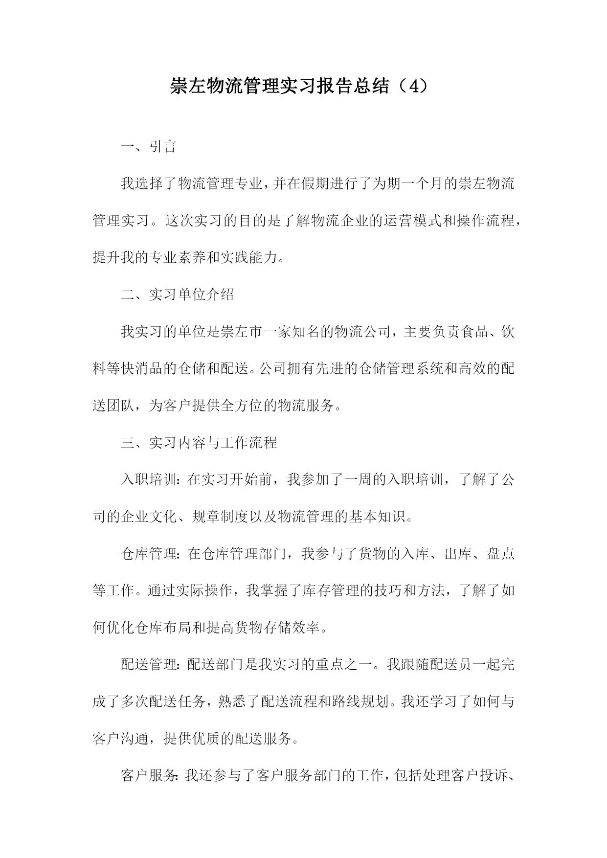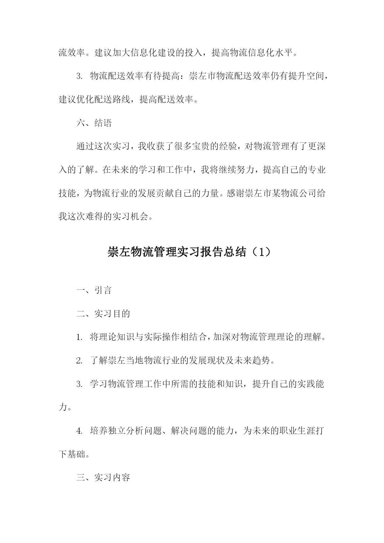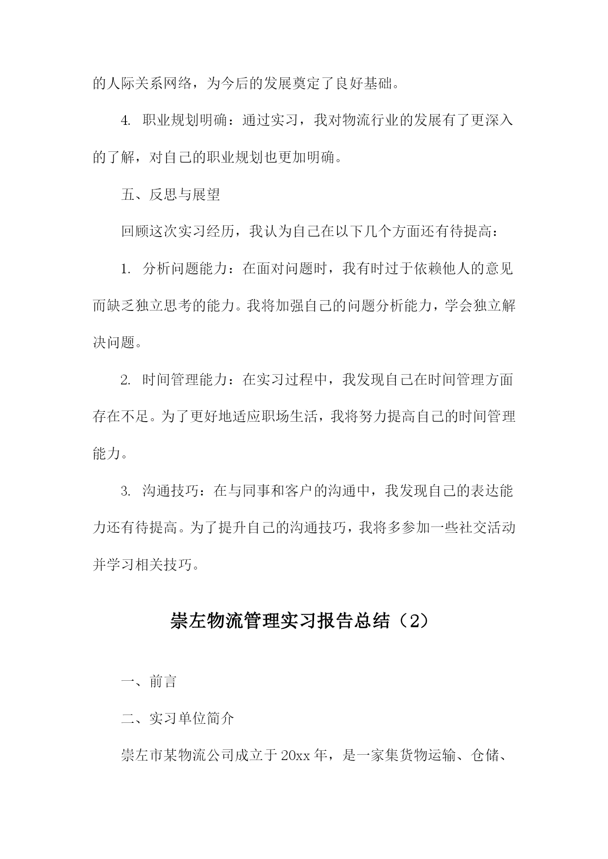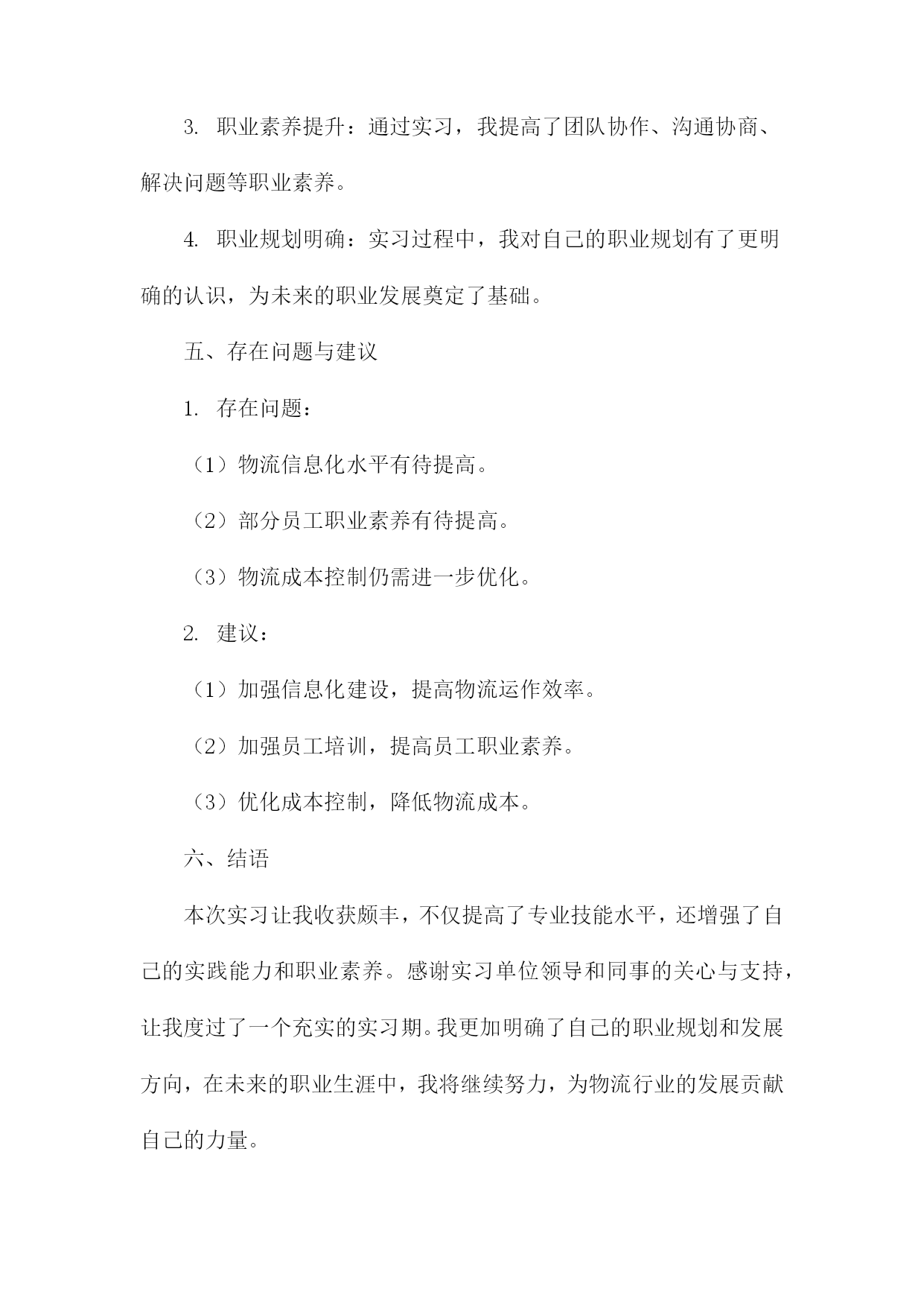 崇左物流管理实习报告总结一、实习背景与目的本次实习活动于XXXX年XX月至XXXX年XX月期间在崇左市某物流公司进行,旨在通过实践活动,深入了解物流管理运作流程,将理论知识与实际工作相结合,提高专业技能,为未来的职业发展打下坚实的基础。二、实习单位简介崇左市某物流公司是一家专业从事物流运输、仓储管理、货物配送等业务的综合性物流企业。公司拥有完善的物流设施、先进的物流技术和管理经验,是地区内物流行业的佼佼者。三、实习内容1.物流运输管理:参与货物运输的全过程管理,包括运输路线的规划、运输工具的选择、运输成本的核算等。2.仓储管理:了解并参与到仓库的货物入库、出库、盘点、保管等日常管理工作。3.货物配送:参与货物的配送工作,包括订单处理、货物分拣、包装、装运等。4.客户服务:协助处理客户咨询、投诉,维护客户关系。5.物流信息系统:学习并操作物流信息系统,提高物流运作效率。四、实习收获与体会1.理论与实践相结合:通过实习,使我对物流管理理论知识有了更深入的理解,并将理论知识运用到实际工作中,提高了解决问题的能力。2.专业技能提升:通过参与物流运输、仓储管理、货物配送等各个环节的工作,使我在物流管理方面的专业技能得到了很大的提升。3.团队协作:在实习过程中,我积极参与团队工作,与同事和睦相处,提高了团队协作能力。4.沟通能力:通过与客户沟通,提高了我的沟通能力,使我学会了如何更好地与客户交流,提高客户满意度。5.对物流行业的认识:通过实习,我对物流行业有了更深刻的认识,了解了物流行业的发展趋势和前景。五、存在问题与建议1.物流管理人才短缺:崇左市物流企业在物流管理方面的人才需求较大,建议加强物流管理专业的教育和培训,提高物流管理人员的素质。2.信息化建设滞后:部分物流企业信息化水平较低,影响了物流效率。建议加大信息化建设的投入,提高物流信息化水平。3.物流配送效率有待提高:崇左市物流配送效率仍有提升空间,建议优化配送路线,提高配送效率。六、结语通过这次实习,我收获了很多宝贵的经验,对物流管理有了更深入的了解。在未来的学习和工作中,我将继续努力,提高自己的专业技能,为物流行业的发展贡献自己的力量。感谢崇左市某物流公司给我这次难得的实习机会。崇左物流管理实习报告总结(1)一、引言二、实习目的1.将理论知识与实际操作相结合,加深对物流管理理论的理解。2.了解崇左当地物流行业的发展现状及未来趋势。3.学习物流管理工作中所需的技能和知识,提升自己的实践能力。4.培养独立分析问题、解决问题的能力,为未来的职业生涯打下基础。三、实习内容在实习期间,我主要参与了以下几个方面的工作:1.物流园区规划与管理:参观了崇左当地的物流园区,了解了园区的整体布局、功能分区以及基础设施建设情况。我还参与了园区的规划会议,学习了如何合理规划物流园区以提高物流效率。2.物流业务流程观察与分析:在实习期间,我跟随公司的员工熟悉了从订单处理、仓储管理到配送执行的全流程业务。通过观察和询问,我对物流业务流程有了更直观的认识。3.物流信息技术应用:学习了物流管理信息系统的基本操作,包括订单管理系统、仓储管理系统等。通过使用这些系统,我掌握了物流信息管理的核心环节。4.团队协作与沟通:在实习过程中,我与同事们建立了良好的合作关系。通过参与团队会议和项目讨论,我学会了如何与他人有效沟通和协作。四、实习收获1.知识与技能提升:通过实习,我将物流管理理论知识与实际操作相结合,掌握了更多的物流管理技能和知识。2.实践经验积累:在实习期间,我积累了丰富的物流管理实践经验,为将来的职业生涯打下了坚实的基础。3.人际关系拓展:通过与同事们的交流与合作,我拓展了自己的人际关系网络,为今后的发展奠定了良好基础。4.职业规划明确:通过实习,我对物流行业的发展有了更深入的了解,对自己的职业规划也更加明确。五、反思与展望回顾这次实习经历,我认为自己在以下几个方面还有待提高:1.分析问题能力:在面对问题时,我有时过于依赖他人的意见而缺乏独立思考的能力。我将加强自己的问题分析能力,学会独立解决问题。2.时间管理能力:在实习过程中,我发现自己在时间管理方面存在不足。为了更好地适应职场生活,我将努力提高自己的时间管理能力。3.沟通技巧:在与同事和客户的沟通中,我发现自己的表达能力还有待提高。为了提升自己的沟通技巧,我将多参加一些社交活动并学习相关技巧。崇左物流管理实习报告总结(2)一、前言二、实习单位简介崇左市某物流公司成立于20xx年,是一家集货物运输、仓储、配送为一体的综合性物流企业。公司拥有一支专业的物流团队,为客户提供从货物装载、运输、仓储到配送等一系列的物流服务。公司秉承“诚信、高效、安全”的经营理念,