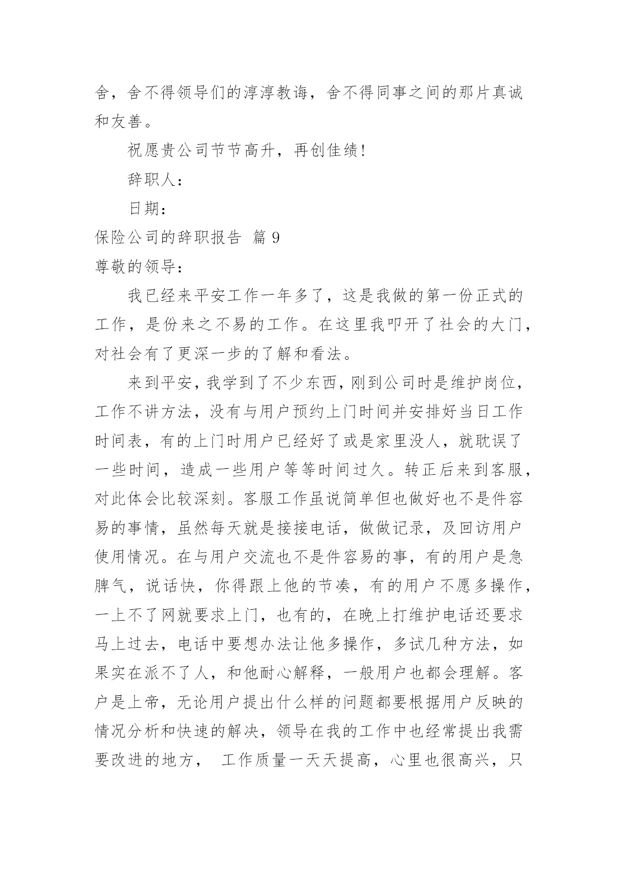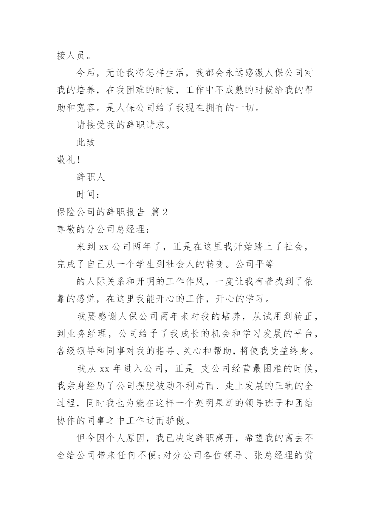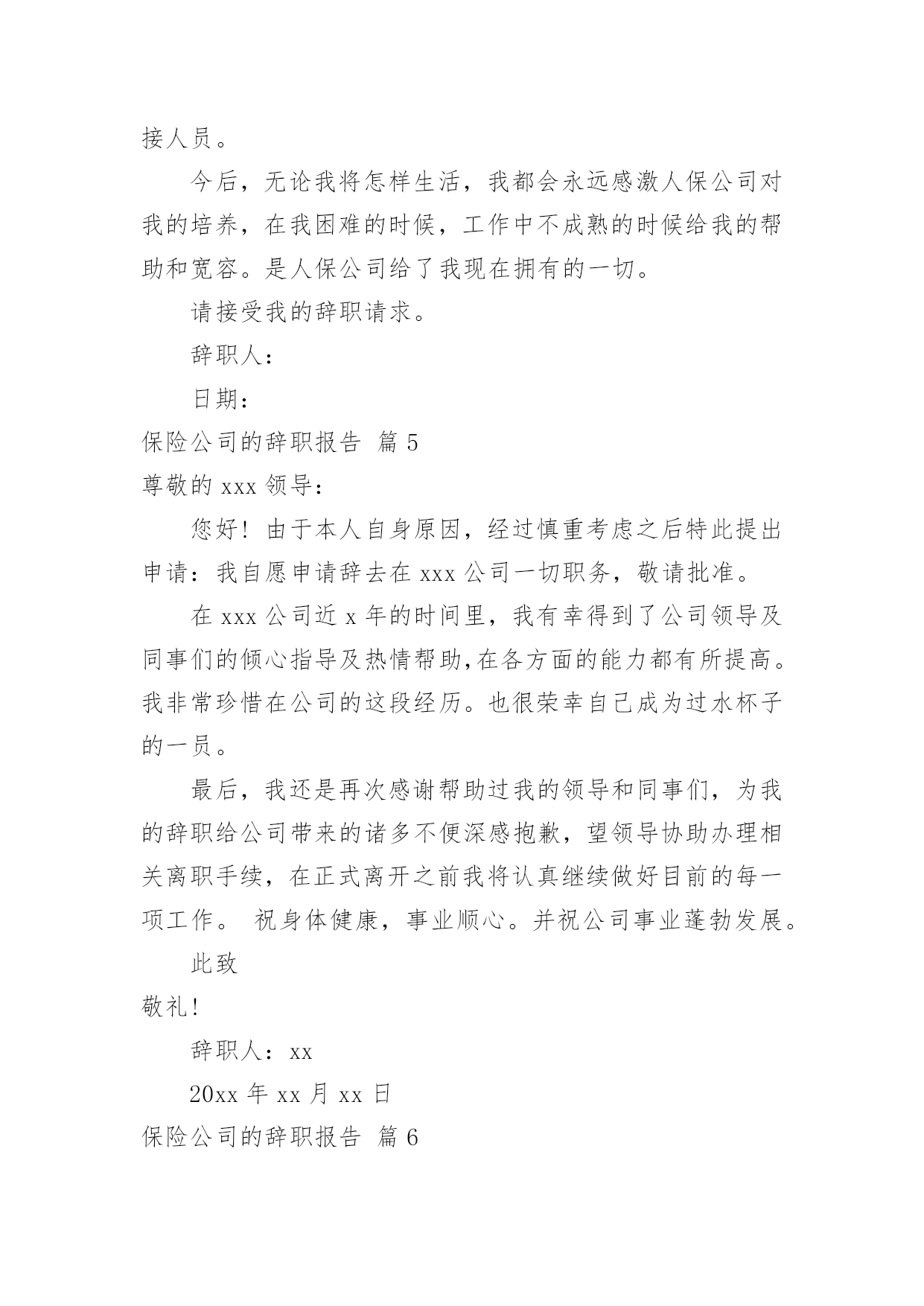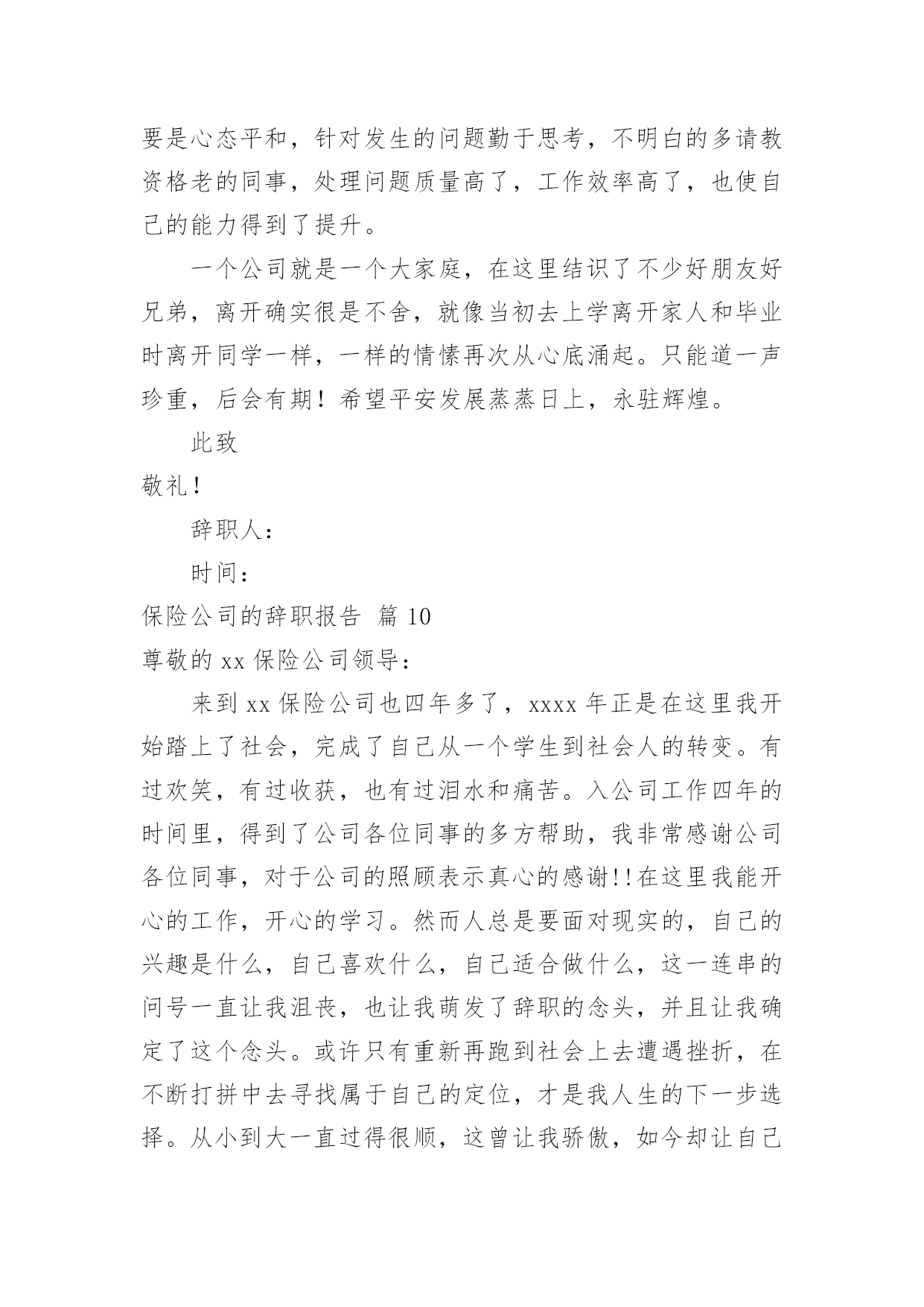保险公司的辞职报告保险公司的辞职报告模板合集10篇在当下社会,报告对我们来说并不陌生,其在写作上具有一定的窍门。写起报告来就毫无头绪?以下是小编收集整理的保险公司的辞职报告10篇,欢迎阅读,希望大家能够喜欢。保险公司的辞职报告篇1尊敬的分公司总经理:来到公司两年了,正是在这里我开始踏上了社会,完成了自己从一个学生到社会人的转变。公司平等的人际关系和开明的工作作风,一度让我有着找到了依靠的感觉,在这里我能开心的工作,开心的学习。我要感谢人保公司两年来对我的培养,从试用到转正,到业务经理,公司给予了我成长的机会和学习发展的平台,各级领导和同事对我的指导、关心和帮助,将使我受益终身。我从年进入公司,正是支公司经营最困难的时候,我亲身经历了公司摆脱被动不利局面、走上发展的正轨的全过程,同时我也为能在这样一个英明果断的领导班子和团结协作的同事之中工作过而骄傲。但今因个人原因,我已决定辞职离开,希望我的离去不会给公司带来任何不便;对分公司各位领导、张总经理的赏识与信任,我将终抱感激之情,也希望公司尽快给我安排交接人员。今后,无论我将怎样生活,我都会永远感激人保公司对我的培养,在我困难的时候,工作中不成熟的时候给我的帮助和宽容。是人保公司给了我现在拥有的一切。请接受我的辞职请求。此致敬礼!辞职人时间:保险公司的辞职报告篇2尊敬的分公司总经理:来到xx公司两年了,正是在这里我开始踏上了社会,完成了自己从一个学生到社会人的转变。公司平等的人际关系和开明的工作作风,一度让我有着找到了依靠的感觉,在这里我能开心的工作,开心的学习。我要感谢人保公司两年来对我的培养,从试用到转正,到业务经理,公司给予了我成长的机会和学习发展的平台,各级领导和同事对我的指导、关心和帮助,将使我受益终身。我从xx年进入公司,正是支公司经营最困难的时候,我亲身经历了公司摆脱被动不利局面、走上发展的正轨的全过程,同时我也为能在这样一个英明果断的领导班子和团结协作的同事之中工作过而骄傲。但今因个人原因,我已决定辞职离开,希望我的离去不会给公司带来任何不便;对分公司各位领导、张总经理的赏识与信任,我将终抱感激之情,也希望公司尽快给我安排交接人员。今后,无论我将怎样生活,我都会永远感激人保公司对我的培养,在我困难的时候,工作中不成熟的时候给我的帮助和宽容。是人保公司给了我现在拥有的一切。请接受我的辞职请求。此致敬礼!申请人:年月日保险公司的辞职报告篇3尊敬的平安保险公司的领导:来到平安保险公司也四年多了,xx年正是在这里我开始踏上了社会,完成了自己从一个学生到社会人的转变。有过欢笑,有过收获,也有过泪水和痛苦。入公司工作四年的时间里,得到了公司各位同事的多方帮助,我非常感谢公司各位同事,对于公司的照顾表示真心的感谢!!在这里我能开心的工作,开心的学习。然而人总是要面对现实的,自己的兴趣是什么,自己喜欢什么,自己适合做什么,这一连串的问号一直让我沮丧,也让我萌发了辞职的念头,并且让我确定了这个念头。或许只有重新再跑到社会上去遭遇挫折,在不断打拼中去寻找属于自己的定位,才是我人生的下一步选择。从小到大一直过得很顺,这曾让我骄傲,如今却让自己深深得痛苦,不能自拔,也许人真的要学会慢慢长大。目前劳动合同已临近到期,因此我申请提前终止劳动合同,请领导给予批准,并请给予办理养老金、劳动保险以及其他相关工作等事宜。离开这个公司,离开这些曾经同事,很舍不得,舍不得领导们的淳淳教诲,舍不得同事之间的那片真诚和友善。辞职人:xxx20xx年xx月xx日保险公司的辞职报告篇4尊敬的××分公司总经理:来到人保公司两年了,正是在这里我开始踏上了社会,完成了自己从一个学生到社会人的转变。公司平等的人际关系和开明的工作作风,一度让我有着找到了依靠的感觉,在这里我能开心的工作,开心的学习。我要感谢人保公司两年来对我的培养,从试用到转正,到业务经理,公司给予了我成长的机会和学习发展的平台,各级领导和同事对我的指导、关心和帮助,将使我受益终身。我从XX年进入公司,正是××支公司经营最困难的时候,我亲身经历了公司摆脱被动不利局面、走上发展的正轨的全过程,同时我也为能在这样一个英明果断的领导班子和团结协作的同事之中工作过而骄傲。但今因个人原因,我已决定辞职离开,希望我的离去不会给公司带来任何不便;对分公司各位领导、张总经理的赏识与信任,我将终抱感激之情,也希望公司尽快给我安排交接人员。今后,无论我将怎样生活,我都会永远感激人保公司对我的培养,在我困难的时候,工作中不成熟的时候给我的帮助和宽容。是人保公司给了我现在拥有的一切。请接受我的辞职请求。辞职人:日期:保险公司的辞职报告篇5尊敬的xxx领导:您好!由于本人自身原因,经过慎重考虑之后特此提出申请:我自愿申请辞去在xxx公司一切职务,敬请批准。在xxx公司近x年的时