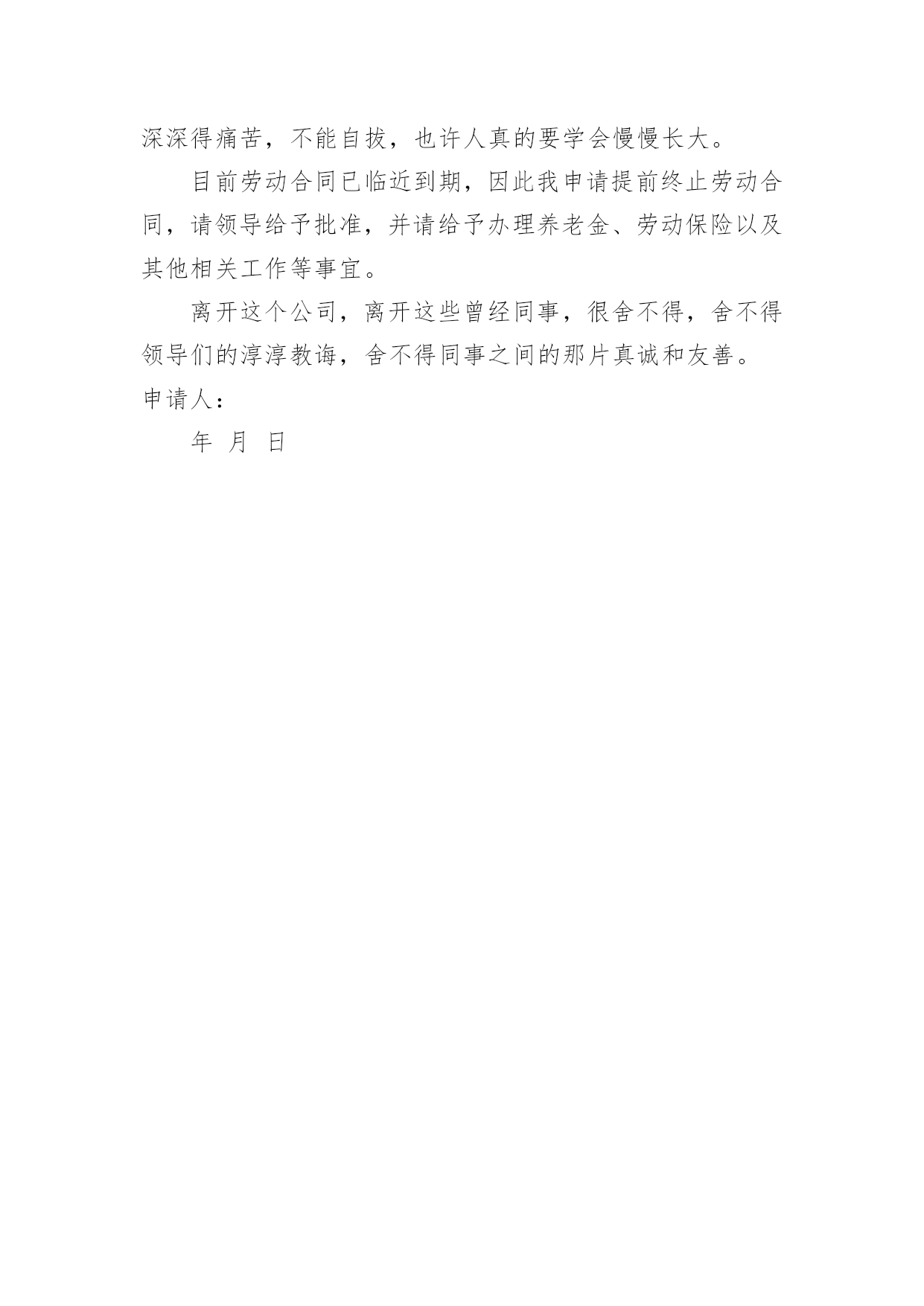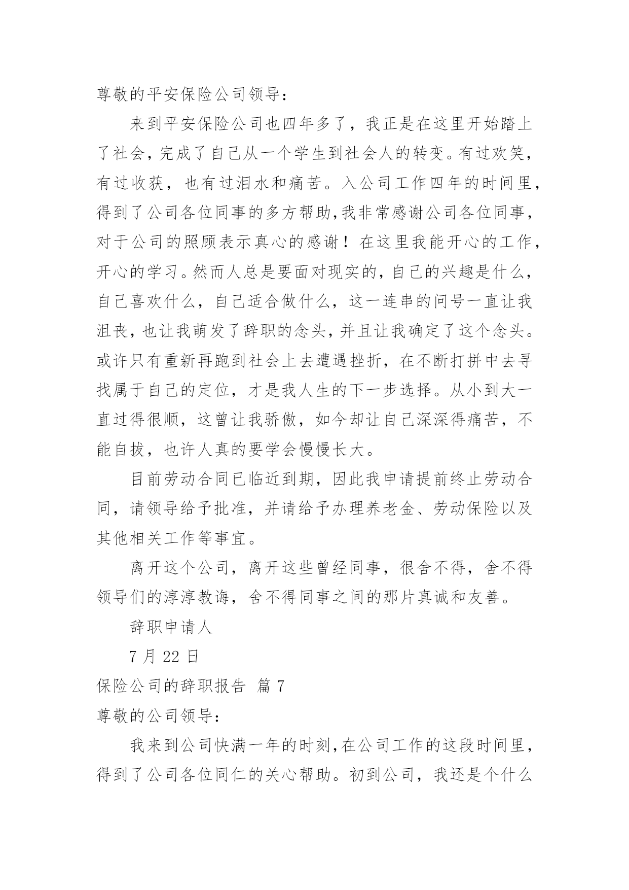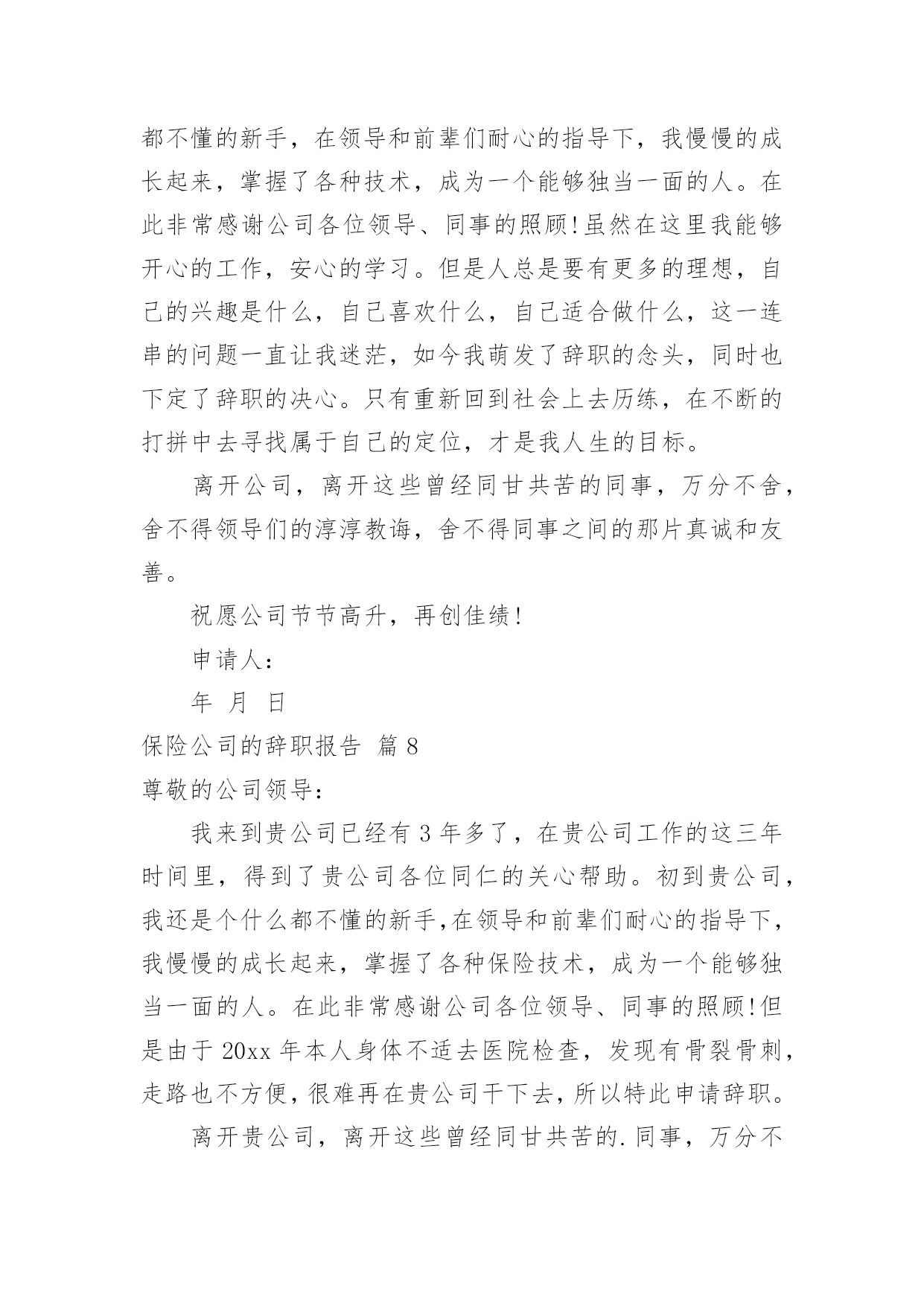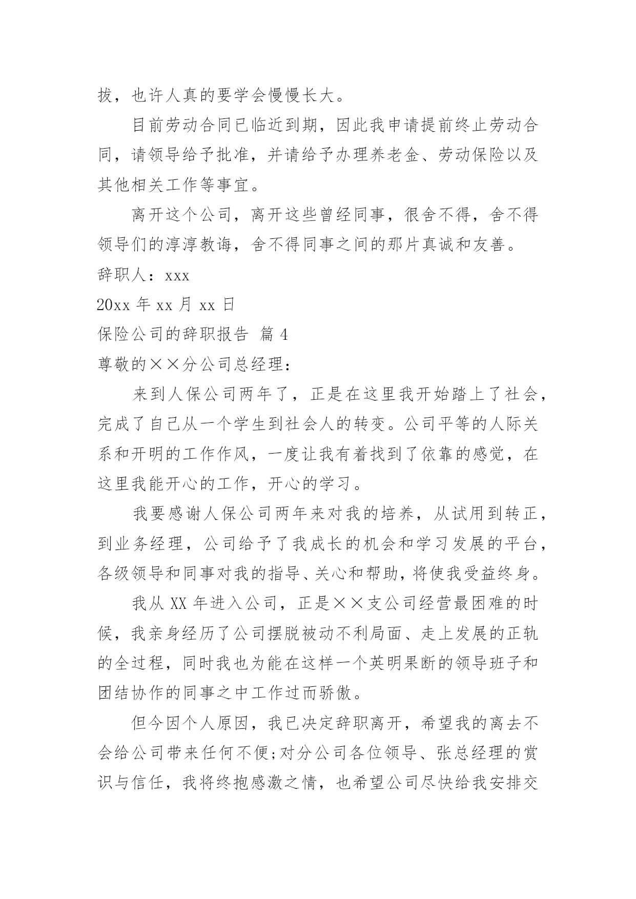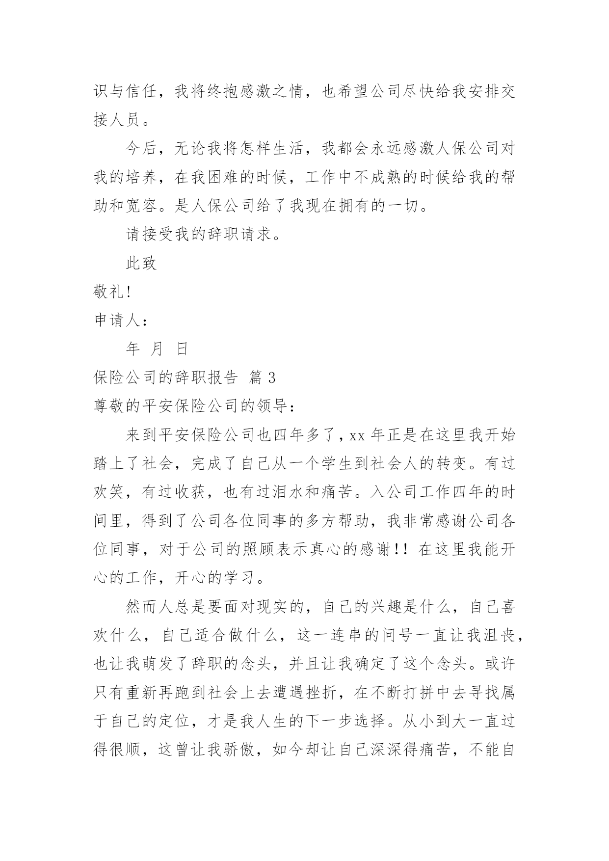 保险公司的辞职报告保险公司的辞职报告模板合集10篇在当下社会,报告对我们来说并不陌生,其在写作上具有一定的窍门。写起报告来就毫无头绪?以下是小编收集整理的保险公司的辞职报告10篇,欢迎阅读,希望大家能够喜欢。保险公司的辞职报告篇1尊敬的分公司总经理:来到公司两年了,正是在这里我开始踏上了社会,完成了自己从一个学生到社会人的转变。公司平等的人际关系和开明的工作作风,一度让我有着找到了依靠的感觉,在这里我能开心的工作,开心的学习。我要感谢人保公司两年来对我的培养,从试用到转正,到业务经理,公司给予了我成长的机会和学习发展的平台,各级领导和同事对我的指导、关心和帮助,将使我受益终身。我从年进入公司,正是支公司经营最困难的时候,我亲身经历了公司摆脱被动不利局面、走上发展的正轨的全过程,同时我也为能在这样一个英明果断的领导班子和团结协作的同事之中工作过而骄傲。但今因个人原因,我已决定辞职离开,希望我的离去不会给公司带来任何不便;对分公司各位领导、张总经理的赏识与信任,我将终抱感激之情,也希望公司尽快给我安排交接人员。今后,无论我将怎样生活,我都会永远感激人保公司对我的培养,在我困难的时候,工作中不成熟的时候给我的帮助和宽容。是人保公司给了我现在拥有的一切。请接受我的辞职请求。此致敬礼!辞职人时间:保险公司的辞职报告篇2尊敬的分公司总经理:来到xx公司两年了,正是在这里我开始踏上了社会,完成了自己从一个学生到社会人的转变。公司平等的人际关系和开明的工作作风,一度让我有着找到了依靠的感觉,在这里我能开心的工作,开心的学习。我要感谢人保公司两年来对我的培养,从试用到转正,到业务经理,公司给予了我成长的机会和学习发展的平台,各级领导和同事对我的指导、关心和帮助,将使我受益终身。我从xx年进入公司,正是支公司经营最困难的时候,我亲身经历了公司摆脱被动不利局面、走上发展的正轨的全过程,同时我也为能在这样一个英明果断的领导班子和团结协作的同事之中工作过而骄傲。但今因个人原因,我已决定辞职离开,希望我的离去不会给公司带来任何不便;对分公司各位领导、张总经理的赏识与信任,我将终抱感激之情,也希望公司尽快给我安排交接人员。今后,无论我将怎样生活,我都会永远感激人保公司对我的培养,在我困难的时候,工作中不成熟的时候给我的帮助和宽容。是人保公司给了我现在拥有的一切。请接受我的辞职请求。此致敬礼!申请人:年月日保险公司的辞职报告篇3尊敬的平安保险公司的领导:来到平安保险公司也四年多了,xx年正是在这里我开始踏上了社会,完成了自己从一个学生到社会人的转变。有过欢笑,有过收获,也有过泪水和痛苦。入公司工作四年的时间里,得到了公司各位同事的多方帮助,我非常感谢公司各位同事,对于公司的照顾表示真心的感谢!!在这里我能开心的工作,开心的学习。然而人总是要面对现实的,自己的兴趣是什么,自己喜欢什么,自己适合做什么,这一连串的问号一直让我沮丧,也让我萌发了辞职的念头,并且让我确定了这个念头。或许只有重新再跑到社会上去遭遇挫折,在不断打拼中去寻找属于自己的定位,才是我人生的下一步选择。从小到大一直过得很顺,这曾让我骄傲,如今却让自己深深得痛苦,不能自拔,也许人真的要学会慢慢长大。目前劳动合同已临近到期,因此我申请提前终止劳动合同,请领导给予批准,并请给予办理养老金、劳动保险以及其他相关工作等事宜。离开这个公司,离开这些曾经同事,很舍不得,舍不得领导们的淳淳教诲,舍不得同事之间的那片真诚和友善。辞职人:xxx20xx年xx月xx日保险公司的辞职报告篇4尊敬的××分公司总经理:来到人保公司两年了,正是在这里我开始踏上了社会,完成了自己从一个学生到社会人的转变。公司平等的人际关系和开明的工作作风,一度让我有着找到了依靠的感觉,在这里我能开心的工作,开心的学习。我要感谢人保公司两年来对我的培养,从试用到转正,到业务经理,公司给予了我成长的机会和学习发展的平台,各级领导和同事对我的指导、关心和帮助,将使我受益终身。我从XX年进入公司,正是××支公司经营最困难的时候,我亲身经历了公司摆脱被动不利局面、走上发展的正轨的全过程,同时我也为能在这样一个英明果断的领导班子和团结协作的同事之中工作过而骄傲。但今因个人原因,我已决定辞职离开,希望我的离去不会给公司带来任何不便;对分公司各位领导、张总经理的赏识与信任,我将终抱感激之情,也希望公司尽快给我安排交接人员。今后,无论我将怎样生活,我都会永远感激人保公司对我的培养,在我困难的时候,工作中不成熟的时候给我的帮助和宽容。是人保公司给了我现在拥有的一切。请接受我的辞职请求。辞职人:日期:保险公司的辞职报告篇5尊敬的xxx领导:您好!由于本人自身原因,经过慎重考虑之后特此提出申请:我自愿申请辞去在xxx公司一切职务,敬请批准。在xxx公司近x年的时