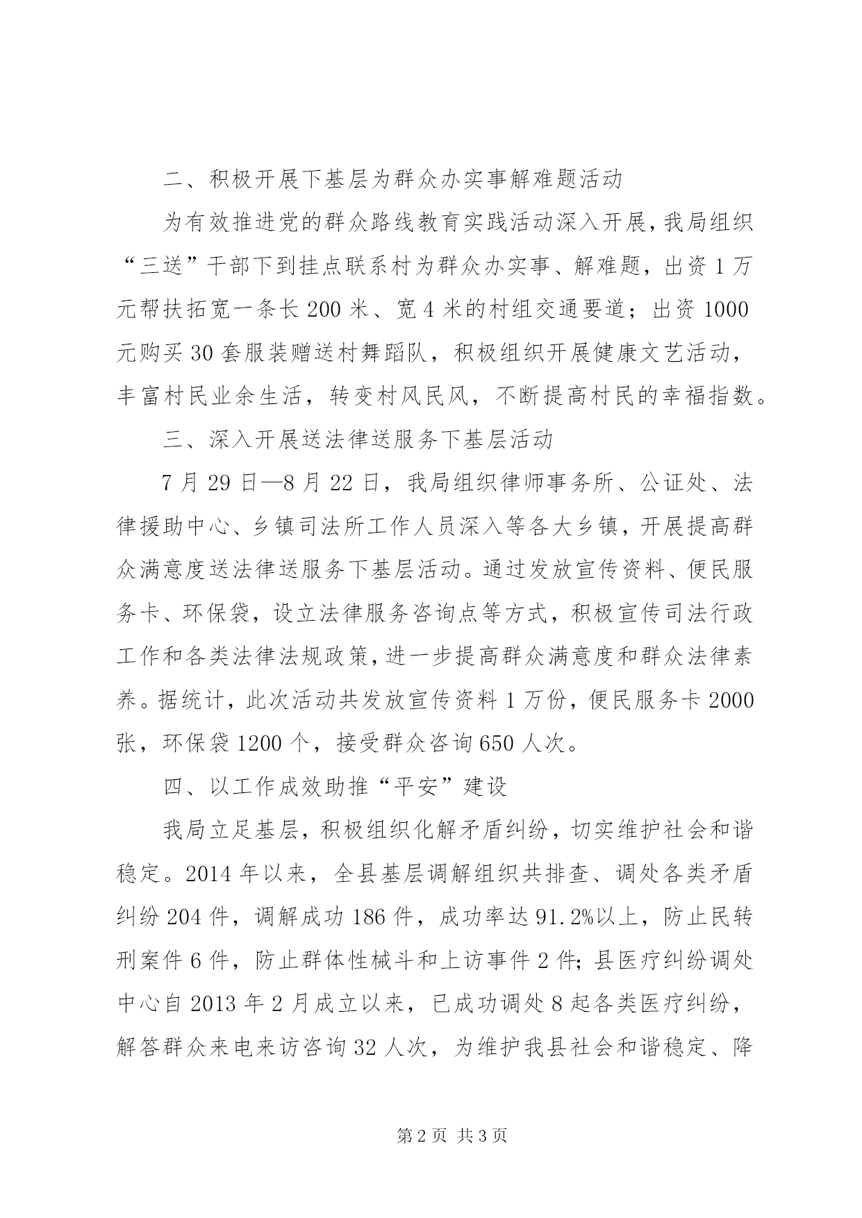 第PAGE\*Arabic\*MERGEFORMAT3页共NUMPAGES\*MERGEFORMAT3页司法局服务群工作汇报为认真贯彻落实好党的群众路线教育实践活动,主动联系、服务群众,打通服务群众最后一公里,切实解决群众意识淡薄、不接地气等问题,我局多措并举,积极作为,现将相关整改落实情况汇报如下:一、以便民服务卡为媒介,主动联系、服务群众为充分发挥司法行政工作职能作用,服务县委、县政府工作大局,服务广大人民群众,切实提高群众对司法行政工作的知晓率和满意度,我局编印了5万份《便民服务卡》,通过组织局机关干部到各单位、各部门、各学校、大型超市以及电信、移动、邮政营业厅等送卡上门,“三送”干部进村入户、干警下乡走访调查、送法律送服务下基层等方式,免费发放给广大干部职工、城乡居民,积极主动联系、服务群众,为群众提供优质、高效的法律服务。小小的便民服务卡受到了广大干部群众的欢迎,自发放便民服务卡以来,群众来电来访咨询量明显增加,我们与群众的距离不断拉近,活动成效不断显现。据统计,我县律师事务所、公证处、法律援助中心和司法鉴定中心等部门,接受干部群众来电咨询量比发卡前同期增长了214%。今年以来,共接受各类法律咨询1706人次,办理法律援助案件127件,办理各类公证298件,受理委托并作出司法鉴定报告案件342件。二、积极开展下基层为群众办实事解难题活动为有效推进党的群众路线教育实践活动深入开展,我局组织“三送”干部下到挂点联系村为群众办实事、解难题,出资1万元帮扶拓宽一条长200米、宽4米的村组交通要道;出资1000元购买30套服装赠送村舞蹈队,积极组织开展健康文艺活动,丰富村民业余生活,转变村风民风,不断提高村民的幸福指数。三、深入开展送法律送服务下基层活动7月29日—8月22日,我局组织律师事务所、公证处、法律援助中心、乡镇司法所工作人员深入等各大乡镇,开展提高群众满意度送法律送服务下基层活动。通过发放宣传资料、便民服务卡、环保袋,设立法律服务咨询点等方式,积极宣传司法行政工作和各类法律法规政策,进一步提高群众满意度和群众法律素养。据统计,此次活动共发放宣传资料1万份,便民服务卡2000张,环保袋1200个,接受群众咨询650人次。四、以工作成效助推“平安”建设我局立足基层,积极组织化解矛盾纠纷,切实维护社会和谐稳定。2014年以来,全县基层调解组织共排查、调处各类矛盾纠纷204件,调解成功186件,成功率达91.2%以上,防止民转刑案件6件,防止群体性械斗和上访事件2件;县医疗纠纷调处中心自2013年2月成立以来,已成功调处8起各类医疗纠纷,解答群众来电来访咨询32人次,为维护我县社会和谐稳定、降低违法犯罪率取得了良好的工作成效。
