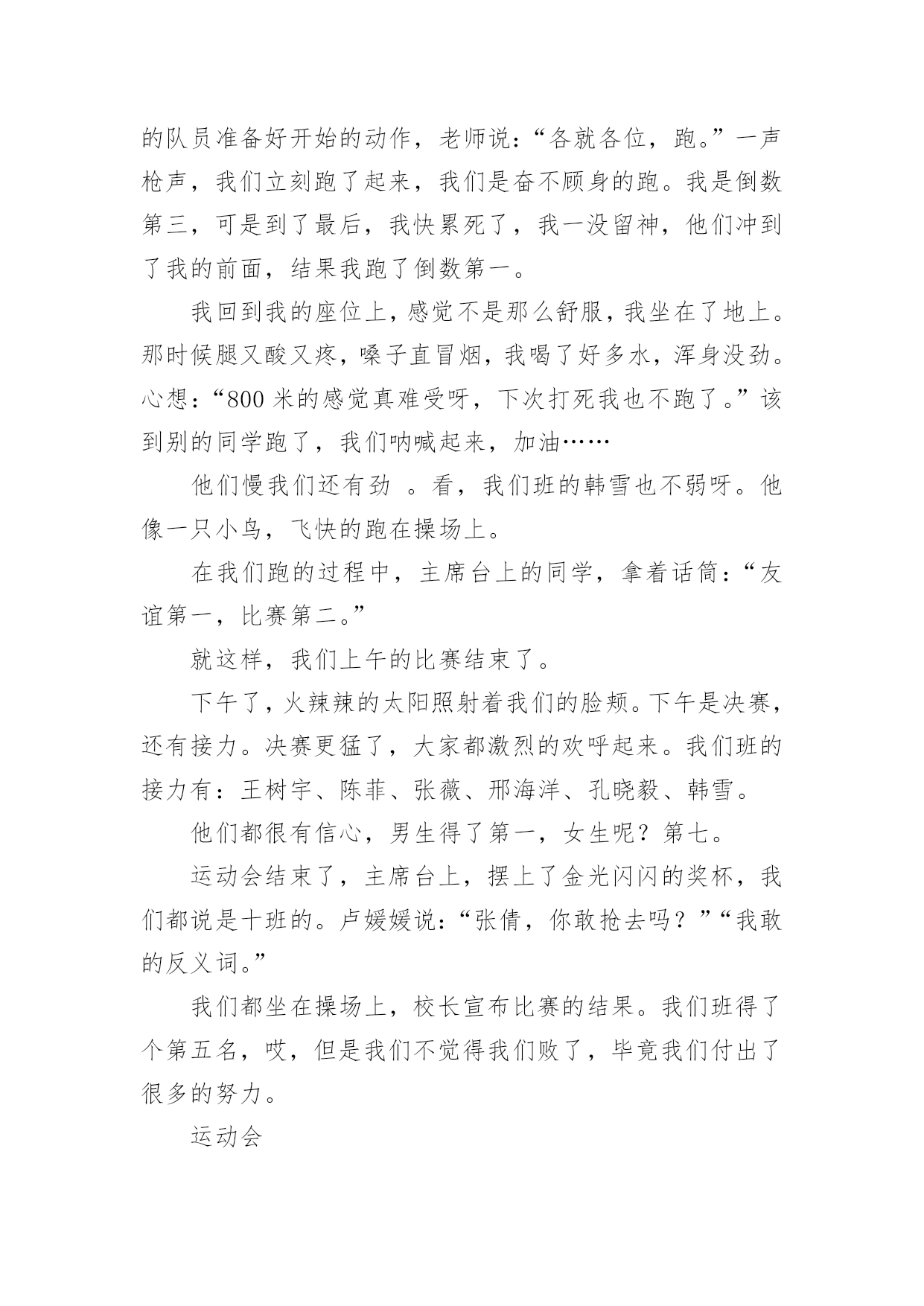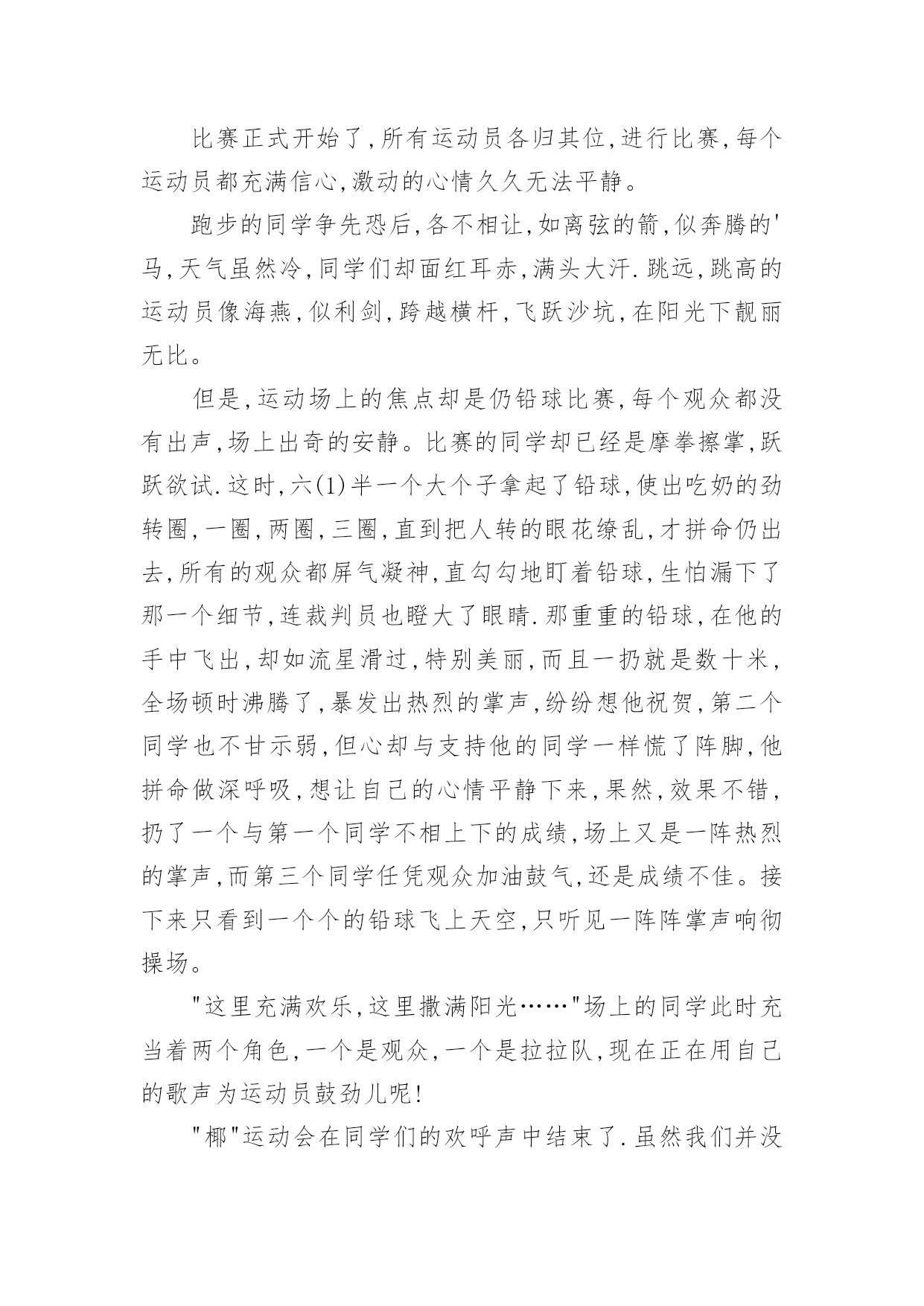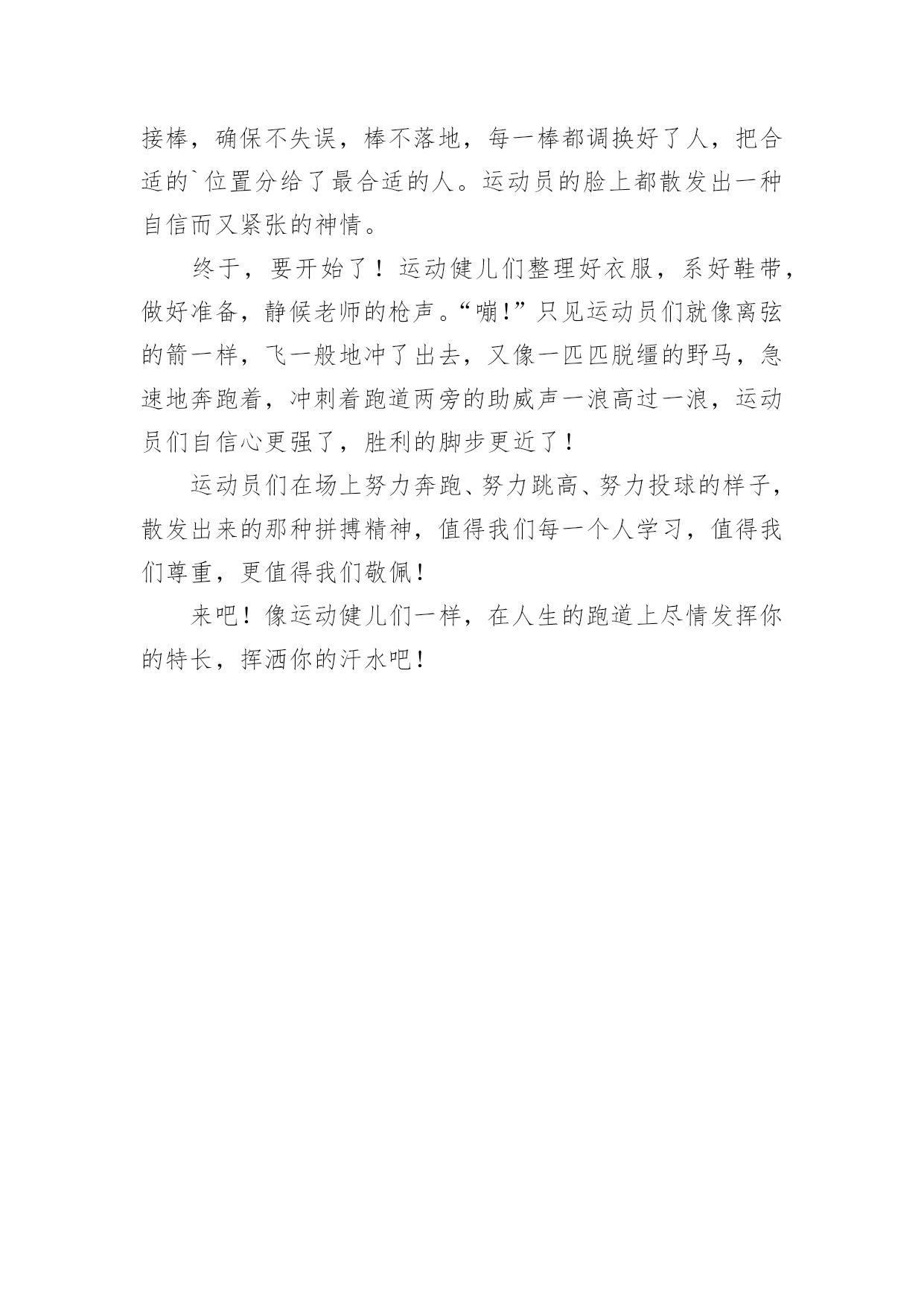 运动会作文实用的运动会作文汇总5篇在平平淡淡的学习、工作、生活中,大家都不可避免地会接触到作文吧,借助作文人们可以实现文化交流的目的。你知道作文怎样才能写的好吗?下面是小编整理的运动会作文5篇,仅供参考,大家一起来看看吧。运动会作文篇1在阳光明媚的星期五,我们学校迎来了一年一度的运动会。我们满脸的喜悦,我们来到操场上,运动员出列,他们踏着铿锵有力的步伐甩着整齐肩膀,喊着响亮的口号,昂首挺胸的走在操场上。首先我们先升国旗,然后,校长宣布20xx年实验小学春季田径运动会开始。我们学校跑步好的有:张晓彤、如月、还有我不认识的一个人,他的外号叫黑八。等等。运动会的项目有:100米、200米、400米、800米,还有铅球、跳高跳远……我们班100米有:邢海洋、裴云霄、王树宇、孔晓毅,200米有:韩雪等,400米有:韩雪等等,800米有:我、韩雪、孙家龙、陈明凯。100米的开始了,我们看到自己班的同学,大家大喊起来:“加油…”到800米的跑了,我心惊胆战的。我和其他的队员准备好开始的动作,老师说:“各就各位,跑。”一声枪声,我们立刻跑了起来,我们是奋不顾身的跑。我是倒数第三,可是到了最后,我快累死了,我一没留神,他们冲到了我的前面,结果我跑了倒数第一。我回到我的座位上,感觉不是那么舒服,我坐在了地上。那时候腿又酸又疼,嗓子直冒烟,我喝了好多水,浑身没劲。心想:“800米的感觉真难受呀,下次打死我也不跑了。”该到别的同学跑了,我们呐喊起来,加油……他们慢我们还有劲。看,我们班的韩雪也不弱呀。他像一只小鸟,飞快的跑在操场上。在我们跑的过程中,主席台上的同学,拿着话筒:“友谊第一,比赛第二。”就这样,我们上午的比赛结束了。下午了,火辣辣的太阳照射着我们的脸颊。下午是决赛,还有接力。决赛更猛了,大家都激烈的欢呼起来。我们班的接力有:王树宇、陈菲、张薇、邢海洋、孔晓毅、韩雪。他们都很有信心,男生得了第一,女生呢?第七。运动会结束了,主席台上,摆上了金光闪闪的奖杯,我们都说是十班的。卢媛媛说:“张倩,你敢抢去吗?”“我敢的反义词。”我们都坐在操场上,校长宣布比赛的结果。我们班得了个第五名,哎,但是我们不觉得我们败了,毕竟我们付出了很多的努力。运动会在阳光明媚的星期五,我们学校迎来了一年一度的运动会。我们满脸的喜悦,我们来到操场上,运动员出列,他们踏着铿锵有力的步伐甩着整齐肩膀,喊着响亮的口号,昂首挺胸的走在操场上。首先我们先升国旗,然后,校长宣布20xx年实验小学春季田径运动会开始。我们学校跑步好的有:张晓彤、如月、还有我不认识的一个人,他的外号叫黑八。等等。运动会的项目有:100米、200米、400米、800米,还有铅球、跳高跳远……我们班100米有:邢海洋、裴云霄、王树宇、孔晓毅,200米有:韩雪等,400米有:韩雪等等,800米有:我、韩雪、孙家龙、陈明凯。100米的开始了,我们看到自己班的同学,大家大喊起来:“加油…”到800米的跑了,我心惊胆战的。我和其他的'队员准备好开始的动作,老师说:“各就各位,跑。”一声枪声,我们立刻跑了起来,我们是奋不顾身的跑。我是倒数第三,可是到了最后,我快累死了,我一没留神,他们冲到了我的前面,结果我跑了倒数第一。我回到我的座位上,感觉不是那么舒服,我坐在了地上。那时候腿又酸又疼,嗓子直冒烟,我喝了好多水,浑身没劲。心想:“800米的感觉真难受呀,下次打死我也不跑了。”该到别的同学跑了,我们呐喊起来,加油……他们慢我们还有劲。看,我们班的韩雪也不弱呀。他像一只小鸟,飞快的跑在操场上。在我们跑的过程中,主席台上的同学,拿着话筒:“友谊第一,比赛第二。”就这样,我们上午的比赛结束了。下午了,火辣辣的太阳照射着我们的脸颊。下午是决赛,还有接力。决赛更猛了,大家都激烈的欢呼起来。我们班的接力有:王树宇、陈菲、张薇、邢海洋、孔晓毅、韩雪。他们都很有信心,男生得了第一,女生呢?第七。运动会结束了,主席台上,摆上了金光闪闪的奖杯,我们都说是十班的。卢媛媛说:“张倩,你敢抢去吗?”“我敢的反义词。”我们都坐在操场上,校长宣布比赛的结果。我们班得了个第五名,哎,但是我们不觉得我们败了,毕竟我们付出了很多的努力。俗话说得好:“失败乃成功之母。”这真是一次快乐的运动会呀!运动会作文篇2又是一年一度的春季运动会,我们体育健儿怀着必胜的信心,雄赳赳气昂昂地来到了战场。风轻轻地拂过我们面颊,灿烂的阳光透过快消失的晨雾,一缕缕地照射着校园。运动会开始了,每个运动员的心不由得收紧了。过了好长一段时间,传来了一个激动的.声音:“XXX破记录了!”听到这如雷贯耳的消息,我的心受到了震撼:我们象纬一定能赢!在后来的比赛中,我又听到了一个个喜讯,现在我的心中只有一个字:胜不知不觉的,轮到我推铅球了。我拿起沉甸甸的铅球,摆好姿势,可心中却像踹着一只