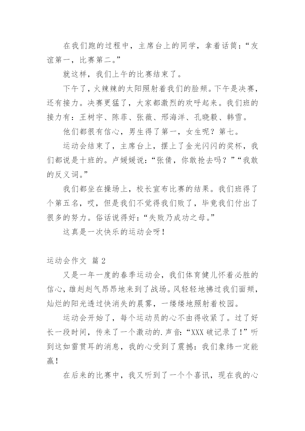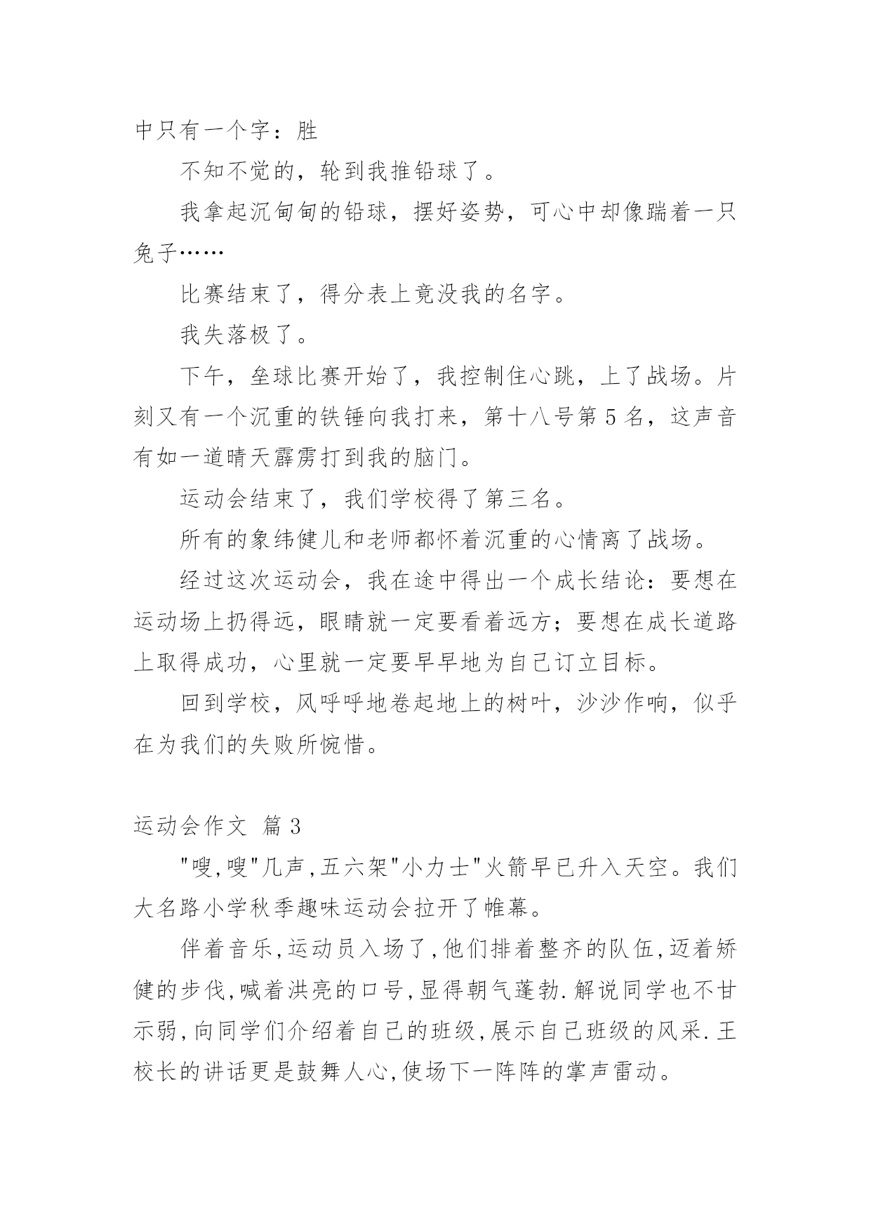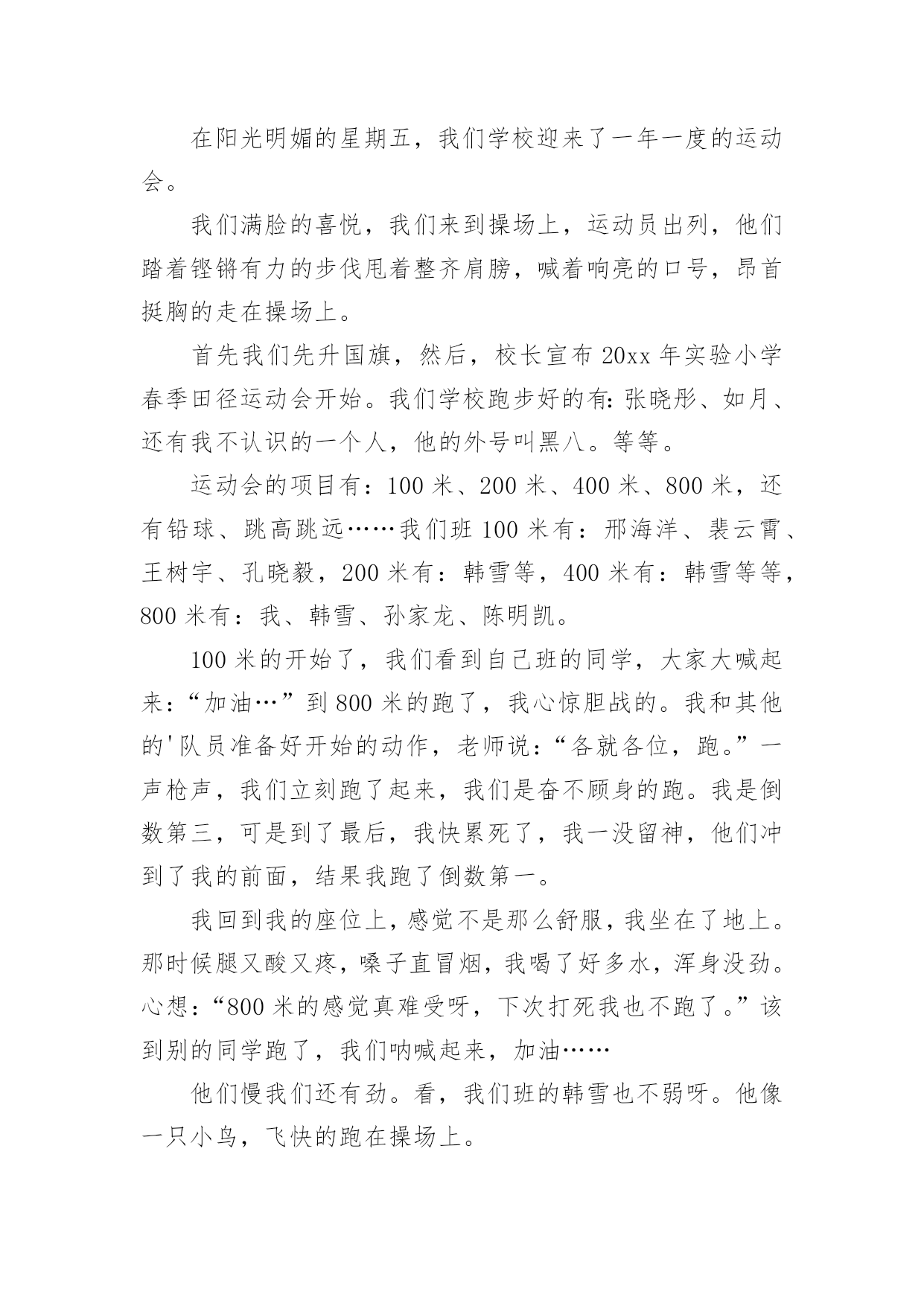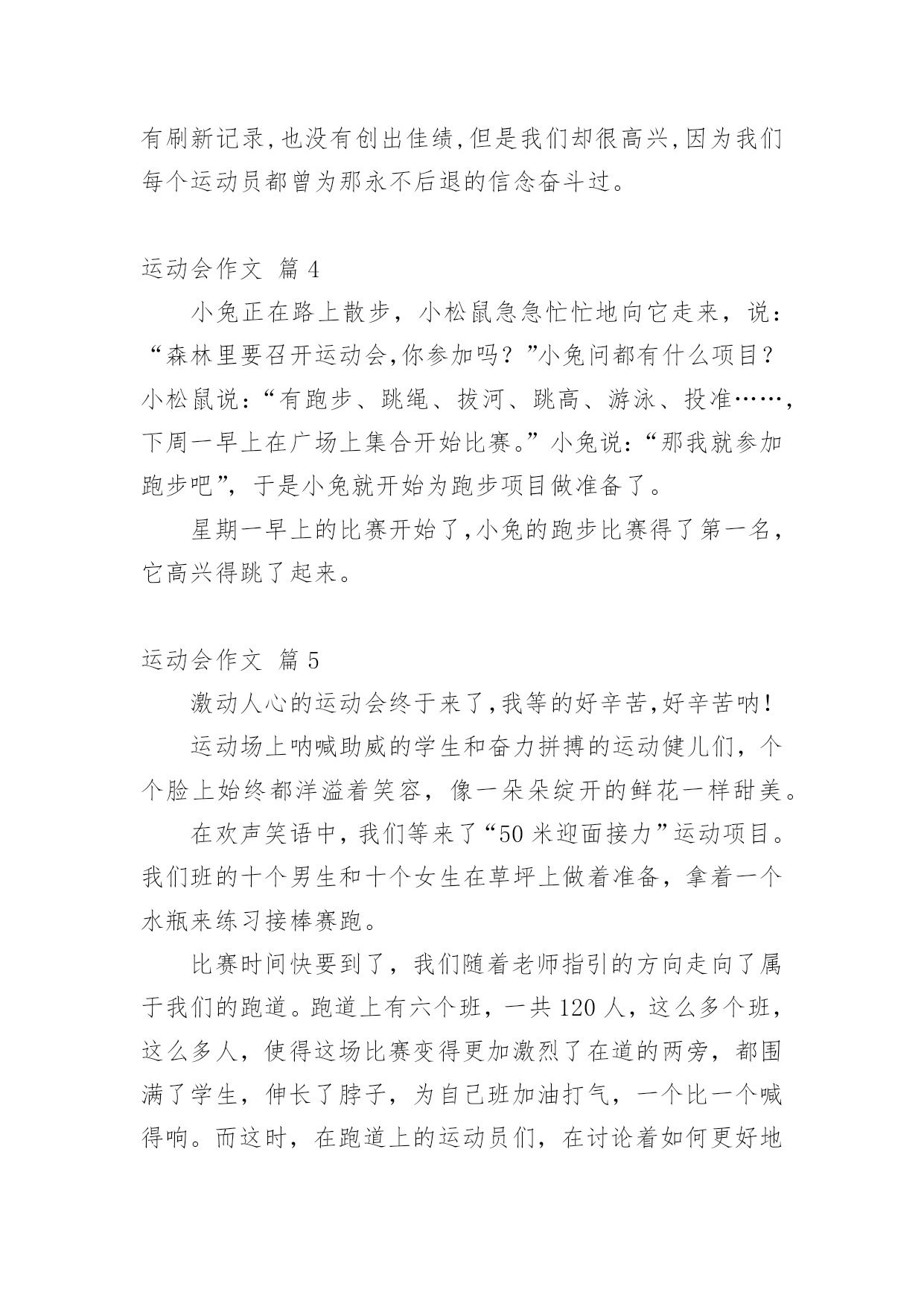 运动会作文实用的运动会作文汇总5篇在平平淡淡的学习、工作、生活中,大家都不可避免地会接触到作文吧,借助作文人们可以实现文化交流的目的。你知道作文怎样才能写的好吗?下面是小编整理的运动会作文5篇,仅供参考,大家一起来看看吧。运动会作文篇1在阳光明媚的星期五,我们学校迎来了一年一度的运动会。我们满脸的喜悦,我们来到操场上,运动员出列,他们踏着铿锵有力的步伐甩着整齐肩膀,喊着响亮的口号,昂首挺胸的走在操场上。首先我们先升国旗,然后,校长宣布20xx年实验小学春季田径运动会开始。我们学校跑步好的有:张晓彤、如月、还有我不认识的一个人,他的外号叫黑八。等等。运动会的项目有:100米、200米、400米、800米,还有铅球、跳高跳远……我们班100米有:邢海洋、裴云霄、王树宇、孔晓毅,200米有:韩雪等,400米有:韩雪等等,800米有:我、韩雪、孙家龙、陈明凯。100米的开始了,我们看到自己班的同学,大家大喊起来:“加油…”到800米的跑了,我心惊胆战的。我和其他的队员准备好开始的动作,老师说:“各就各位,跑。”一声枪声,我们立刻跑了起来,我们是奋不顾身的跑。我是倒数第三,可是到了最后,我快累死了,我一没留神,他们冲到了我的前面,结果我跑了倒数第一。我回到我的座位上,感觉不是那么舒服,我坐在了地上。那时候腿又酸又疼,嗓子直冒烟,我喝了好多水,浑身没劲。心想:“800米的感觉真难受呀,下次打死我也不跑了。”该到别的同学跑了,我们呐喊起来,加油……他们慢我们还有劲。看,我们班的韩雪也不弱呀。他像一只小鸟,飞快的跑在操场上。在我们跑的过程中,主席台上的同学,拿着话筒:“友谊第一,比赛第二。”就这样,我们上午的比赛结束了。下午了,火辣辣的太阳照射着我们的脸颊。下午是决赛,还有接力。决赛更猛了,大家都激烈的欢呼起来。我们班的接力有:王树宇、陈菲、张薇、邢海洋、孔晓毅、韩雪。他们都很有信心,男生得了第一,女生呢?第七。运动会结束了,主席台上,摆上了金光闪闪的奖杯,我们都说是十班的。卢媛媛说:“张倩,你敢抢去吗?”“我敢的反义词。”我们都坐在操场上,校长宣布比赛的结果。我们班得了个第五名,哎,但是我们不觉得我们败了,毕竟我们付出了很多的努力。运动会在阳光明媚的星期五,我们学校迎来了一年一度的运动会。我们满脸的喜悦,我们来到操场上,运动员出列,他们踏着铿锵有力的步伐甩着整齐肩膀,喊着响亮的口号,昂首挺胸的走在操场上。首先我们先升国旗,然后,校长宣布20xx年实验小学春季田径运动会开始。我们学校跑步好的有:张晓彤、如月、还有我不认识的一个人,他的外号叫黑八。等等。运动会的项目有:100米、200米、400米、800米,还有铅球、跳高跳远……我们班100米有:邢海洋、裴云霄、王树宇、孔晓毅,200米有:韩雪等,400米有:韩雪等等,800米有:我、韩雪、孙家龙、陈明凯。100米的开始了,我们看到自己班的同学,大家大喊起来:“加油…”到800米的跑了,我心惊胆战的。我和其他的'队员准备好开始的动作,老师说:“各就各位,跑。”一声枪声,我们立刻跑了起来,我们是奋不顾身的跑。我是倒数第三,可是到了最后,我快累死了,我一没留神,他们冲到了我的前面,结果我跑了倒数第一。我回到我的座位上,感觉不是那么舒服,我坐在了地上。那时候腿又酸又疼,嗓子直冒烟,我喝了好多水,浑身没劲。心想:“800米的感觉真难受呀,下次打死我也不跑了。”该到别的同学跑了,我们呐喊起来,加油……他们慢我们还有劲。看,我们班的韩雪也不弱呀。他像一只小鸟,飞快的跑在操场上。在我们跑的过程中,主席台上的同学,拿着话筒:“友谊第一,比赛第二。”就这样,我们上午的比赛结束了。下午了,火辣辣的太阳照射着我们的脸颊。下午是决赛,还有接力。决赛更猛了,大家都激烈的欢呼起来。我们班的接力有:王树宇、陈菲、张薇、邢海洋、孔晓毅、韩雪。他们都很有信心,男生得了第一,女生呢?第七。运动会结束了,主席台上,摆上了金光闪闪的奖杯,我们都说是十班的。卢媛媛说:“张倩,你敢抢去吗?”“我敢的反义词。”我们都坐在操场上,校长宣布比赛的结果。我们班得了个第五名,哎,但是我们不觉得我们败了,毕竟我们付出了很多的努力。俗话说得好:“失败乃成功之母。”这真是一次快乐的运动会呀!运动会作文篇2又是一年一度的春季运动会,我们体育健儿怀着必胜的信心,雄赳赳气昂昂地来到了战场。风轻轻地拂过我们面颊,灿烂的阳光透过快消失的晨雾,一缕缕地照射着校园。运动会开始了,每个运动员的心不由得收紧了。过了好长一段时间,传来了一个激动的.声音:“XXX破记录了!”听到这如雷贯耳的消息,我的心受到了震撼:我们象纬一定能赢!在后来的比赛中,我又听到了一个个喜讯,现在我的心中只有一个字:胜不知不觉的,轮到我推铅球了。我拿起沉甸甸的铅球,摆好姿势,可心中却像踹着一只