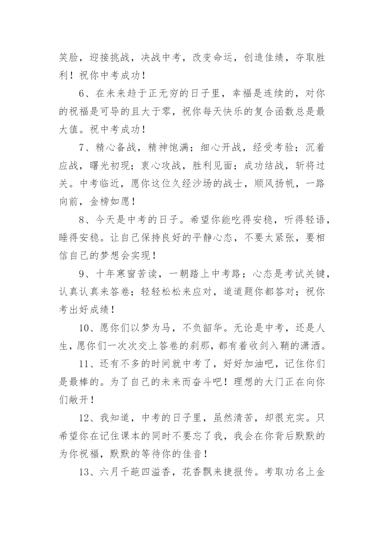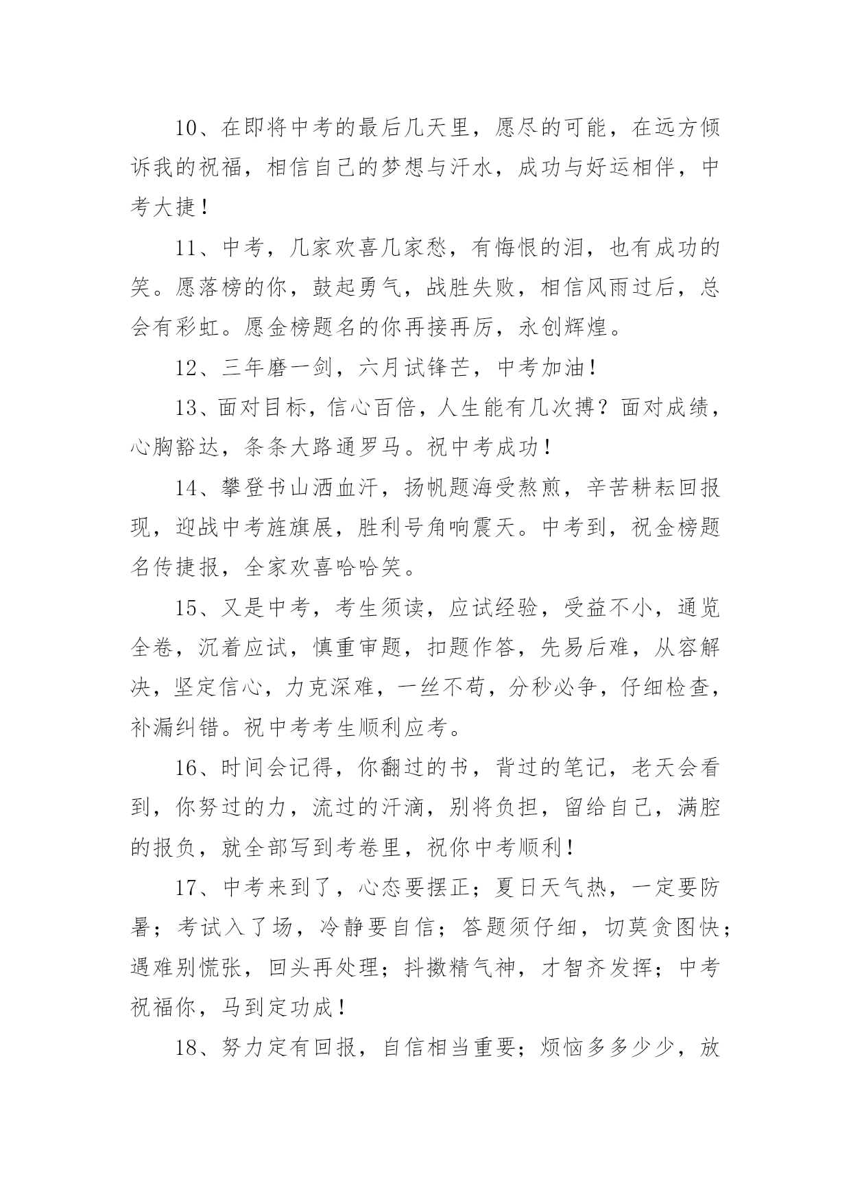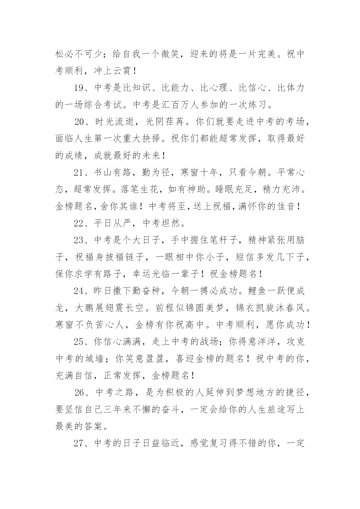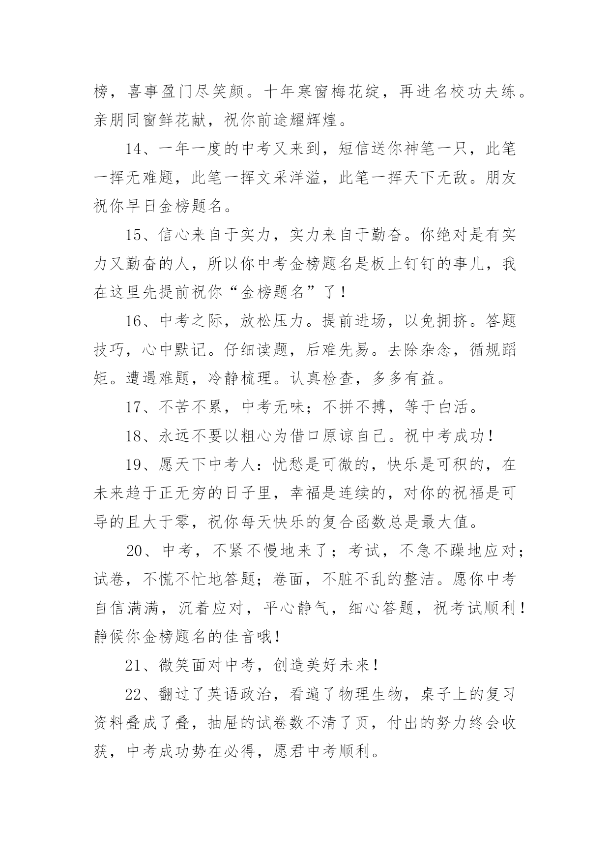 为中考孩子加油的话语为中考孩子加油的话语(精选400句)随着在线社交网络的爆炸式增长,大家最不陌生的就是话语了吧,话语是指与社会权力关系相互缠绕的具体言语方式。想发话语却总是不知道怎么组织语言?下面是小编整理的为中考孩子加油的话语(精选400句),希望对大家有所帮助。为中考孩子加油的话语11、自信,是成功的一半;平淡,是成功的驿站;努力,是成功的积淀;祝福,是成功的先决条件。自信的你在我的祝福下,定会在中考中摘取桂冠,努力吧朋友。2、又是一年中考季,学业收获金色季,十年苦读功夫深,满怀信心前应考,平和心态不紧张,控制情绪免慌乱,考完一门忘一门,尽量放松思下科,好好休息觉儿美,一举高分必定你!祝中考顺利。3、紧张无济于事,何不放手去搏。临时莫抱佛脚,自信胜券在握。人生道路万千,咋走都是生活。轻松面对考验,论心不论功过。祝你中考顺利!4、中考在即,送去祝福,祝你在考场上,自信稳扎稳打,思路翻江倒海,智慧龙飞凤舞,大脑活蹦乱跳,心态四平八稳,钢笔翻飞疾书,成绩名列前茅,理想近在眼前。5、坚持数年,苦读多年,只为今朝,保平常心,扬起笑脸,迎接挑战,决战中考,改变命运,创造佳绩,夺取胜利!祝你中考成功!6、在未来趋于正无穷的日子里,幸福是连续的,对你的祝福是可导的且大于零,祝你每天快乐的复合函数总是最大值。祝中考成功!7、精心备战,精神饱满;细心开战,经受考验;沉着应战,曙光初现;衷心攻战,胜利见面;成功结战,斩将过关。中考临近,愿你这位久经沙场的战士,顺风扬帆,一路向前,金榜如愿!8、今天是中考的日子。希望你能吃得安稳,听得轻语,睡得安稳。让自己保持良好的平静心态,不要太紧张,要相信自己的梦想会实现!9、十年寒窗苦读,一朝踏上中考路;心态是考试关键,认真认真来答卷;轻轻松松来应对,道道题你都答对;祝你考出好成绩!10、愿你们以梦为马,不负韶华。无论是中考,还是人生,愿你们一次次交上答卷的刹那,都有着收剑入鞘的潇洒。11、还有不多的时间就中考了,好好加油吧,记住你们是最棒的。为了自己的未来而奋斗吧!理想的大门正在向你们敞开!12、我知道,中考的日子里,虽然清苦,却很充实。只希望你在记住课本的同时不要忘了我,我会在你背后默默的为你祝福,默默的等待你的佳音!13、六月千葩四溢香,花香飘来捷报传。考取功名上金榜,喜事盈门尽笑颜。十年寒窗梅花绽,再进名校功夫练。亲朋同窗鲜花献,祝你前途耀辉煌。14、一年一度的中考又来到,短信送你神笔一只,此笔一挥无难题,此笔一挥文采洋溢,此笔一挥天下无敌。朋友祝你早日金榜题名。15、信心来自于实力,实力来自于勤奋。你绝对是有实力又勤奋的人,所以你中考金榜题名是板上钉钉的事儿,我在这里先提前祝你“金榜题名”了!16、中考之际,放松压力。提前进场,以免拥挤。答题技巧,心中默记。仔细读题,后难先易。去除杂念,循规蹈矩。遭遇难题,冷静梳理。认真检查,多多有益。17、不苦不累,中考无味;不拼不搏,等于白活。18、永远不要以粗心为借口原谅自己。祝中考成功!19、愿天下中考人:忧愁是可微的,快乐是可积的,在未来趋于正无穷的日子里,幸福是连续的,对你的祝福是可导的且大于零,祝你每天快乐的复合函数总是最大值。20、中考,不紧不慢地来了;考试,不急不躁地应对;试卷,不慌不忙地答题;卷面,不脏不乱的整洁。愿你中考自信满满,沉着应对,平心静气,细心答题,祝考试顺利!静候你金榜题名的佳音哦!21、微笑面对中考,创造美好未来!22、翻过了英语政治,看遍了物理生物,桌子上的复习资料叠成了叠,抽屉的试卷数不清了页,付出的努力终会收获,中考成功势在必得,愿君中考顺利。23、拼搏中考,今生无悔;爬过初三,追求卓越!24、中考即将来临,展示自我的时刻:有信心而无胆怯,有动力而无压力,莫紧张无焦虑,答题迅速不慌乱!愿你马到成功,金笔提名!25、中考的硝烟战场,辉煌的成绩,初三六班,更强的意志,准备中考,初三无悔!26、中考是一个实现人生梦想的.省力杠杆,此时是你撬动它的最佳时机,加油吧,以后你的人生将会呈弧线上升。27、祈愿女儿中考顺顺利利,考到理想高中。28、今天多一份拼搏明天多几份欢笑。祝中考顺利,金榜题名!29、给你一份信心,送你一份决心,要对自己放心,面对考题平常心,要把自己关心,注意考前身心,考试保证全心全意,中考考试,祝你成功!30、奋斗不息,锲而不舍的精神是伟人最闪耀之处,这不由得让我鼓起斗志,为我明年的中考鼓劲。31、枕戈待旦,决战中考,奋战百日,我必成功。必胜,必胜,必胜!32、所谓强者,拼的不是力气,也不是技巧,而是心态。踏踏实实努力,轻轻松松面对。将颤抖关在门外,让信心装满胸怀,中考尽力发挥,愿你载誉归来!33、斗志昂扬,百炼成钢。百天冲刺之际,让我们一起,站在新起点,迎接新挑战,创造新成绩,中考一定赢!34、天高任鸟飞,海