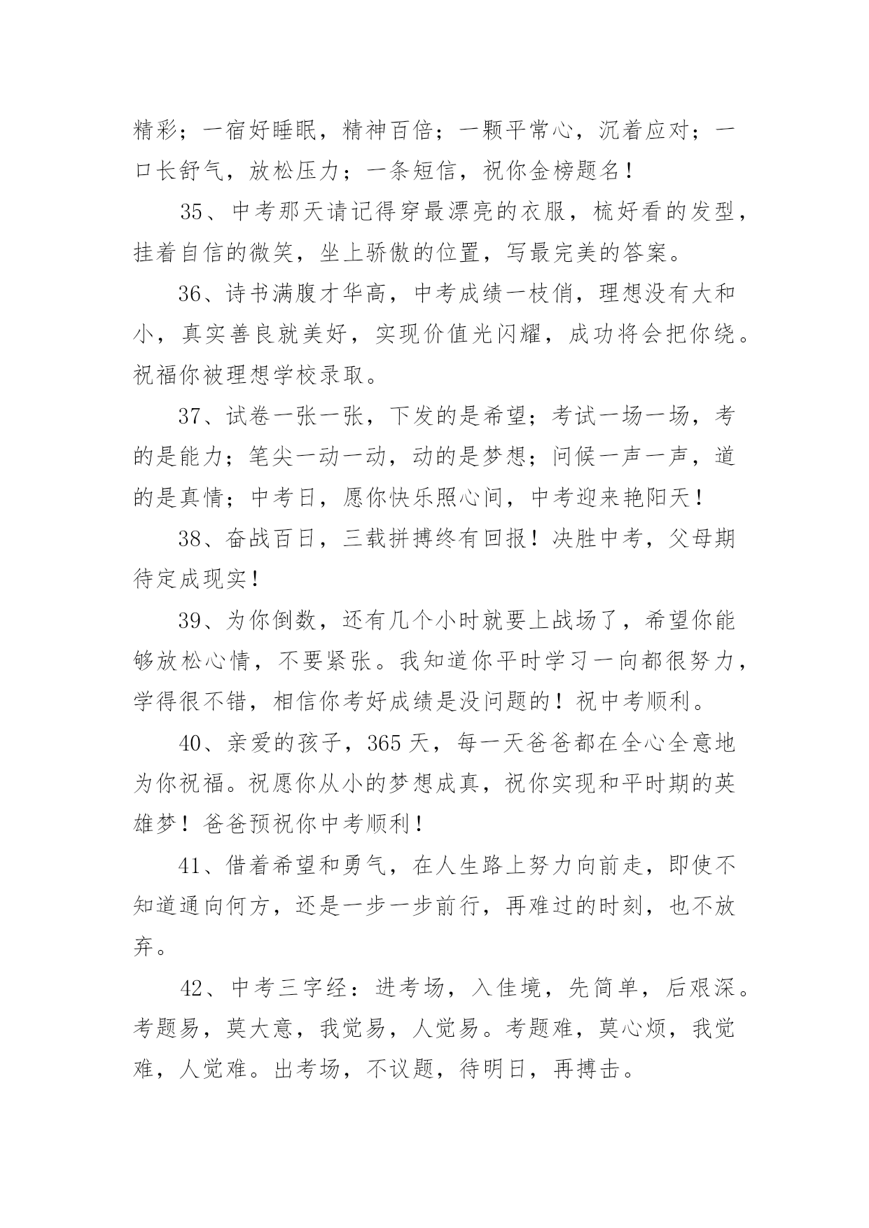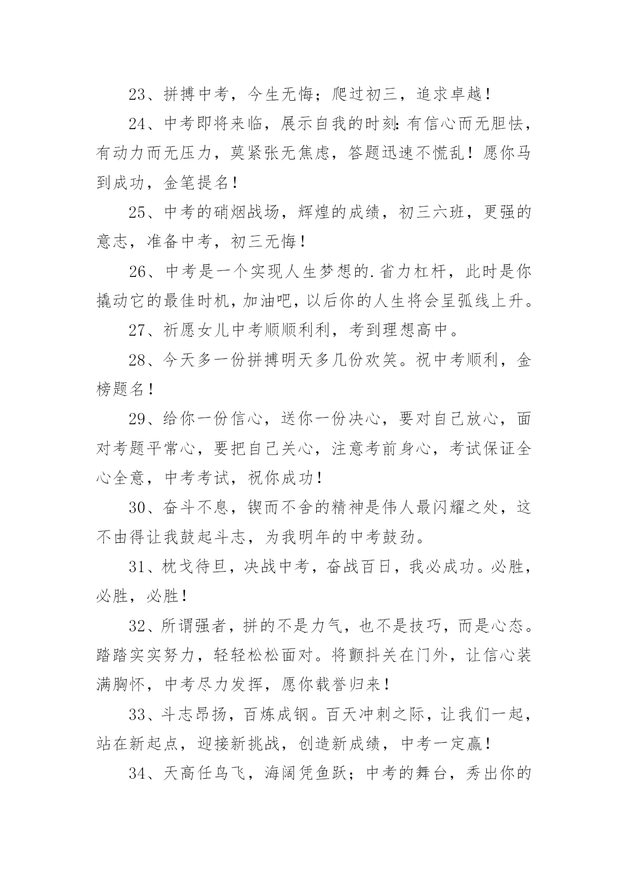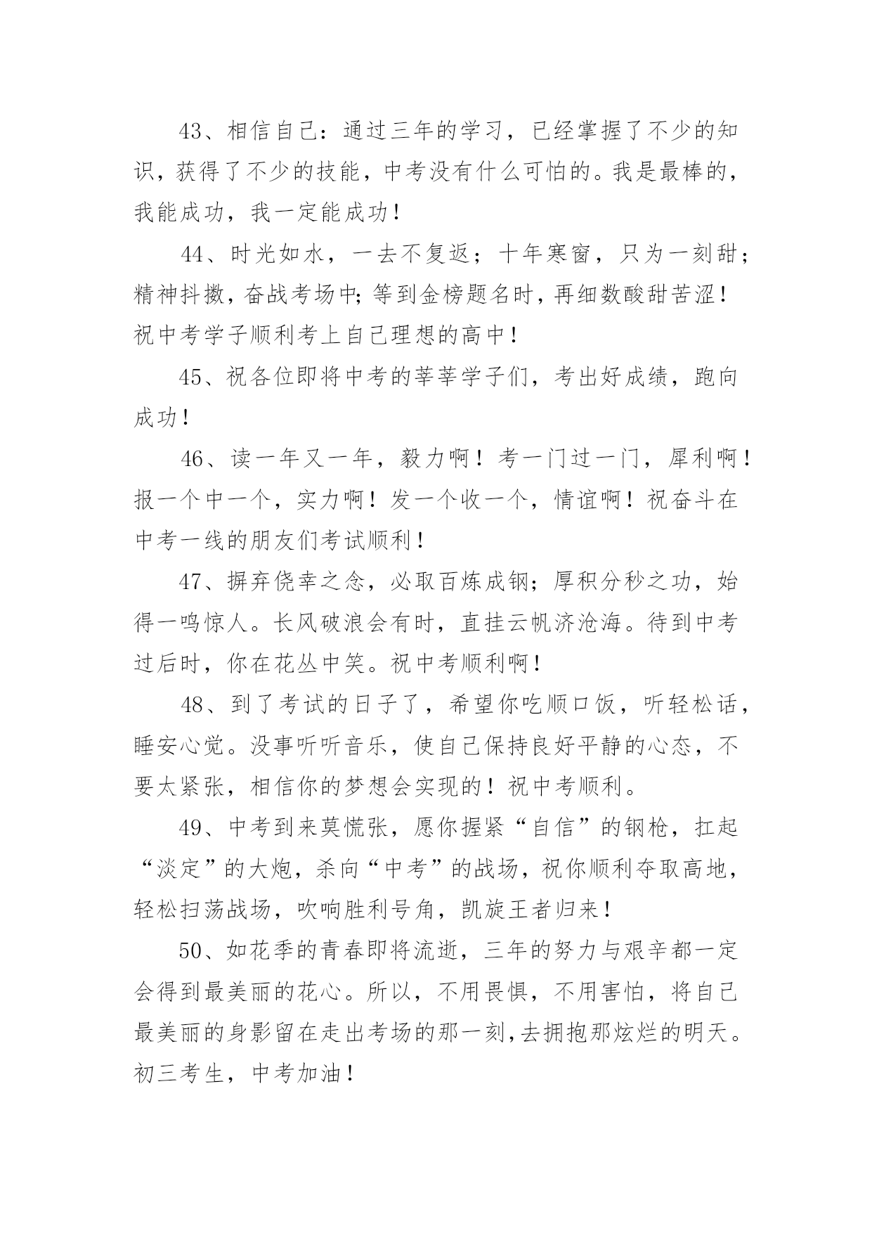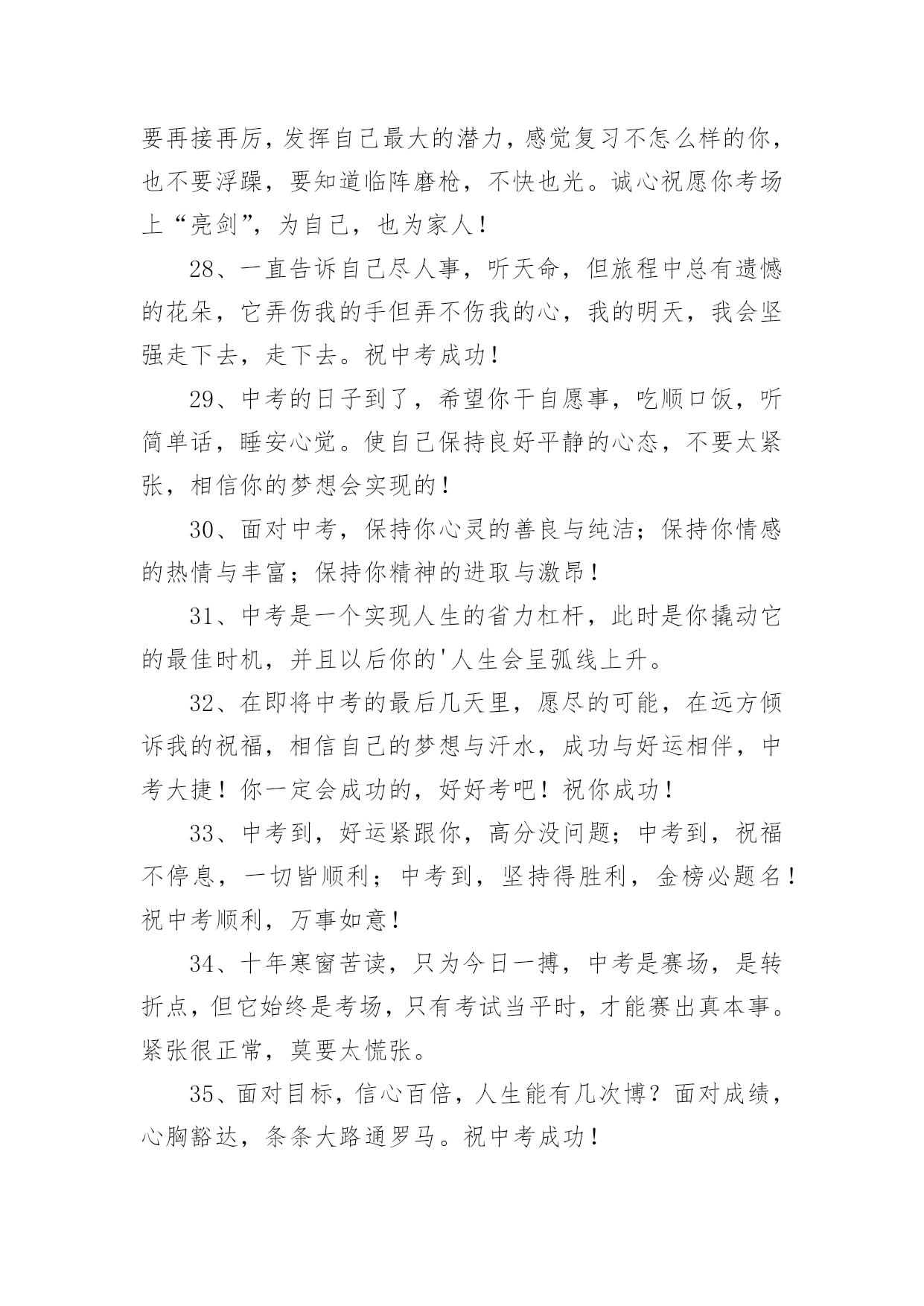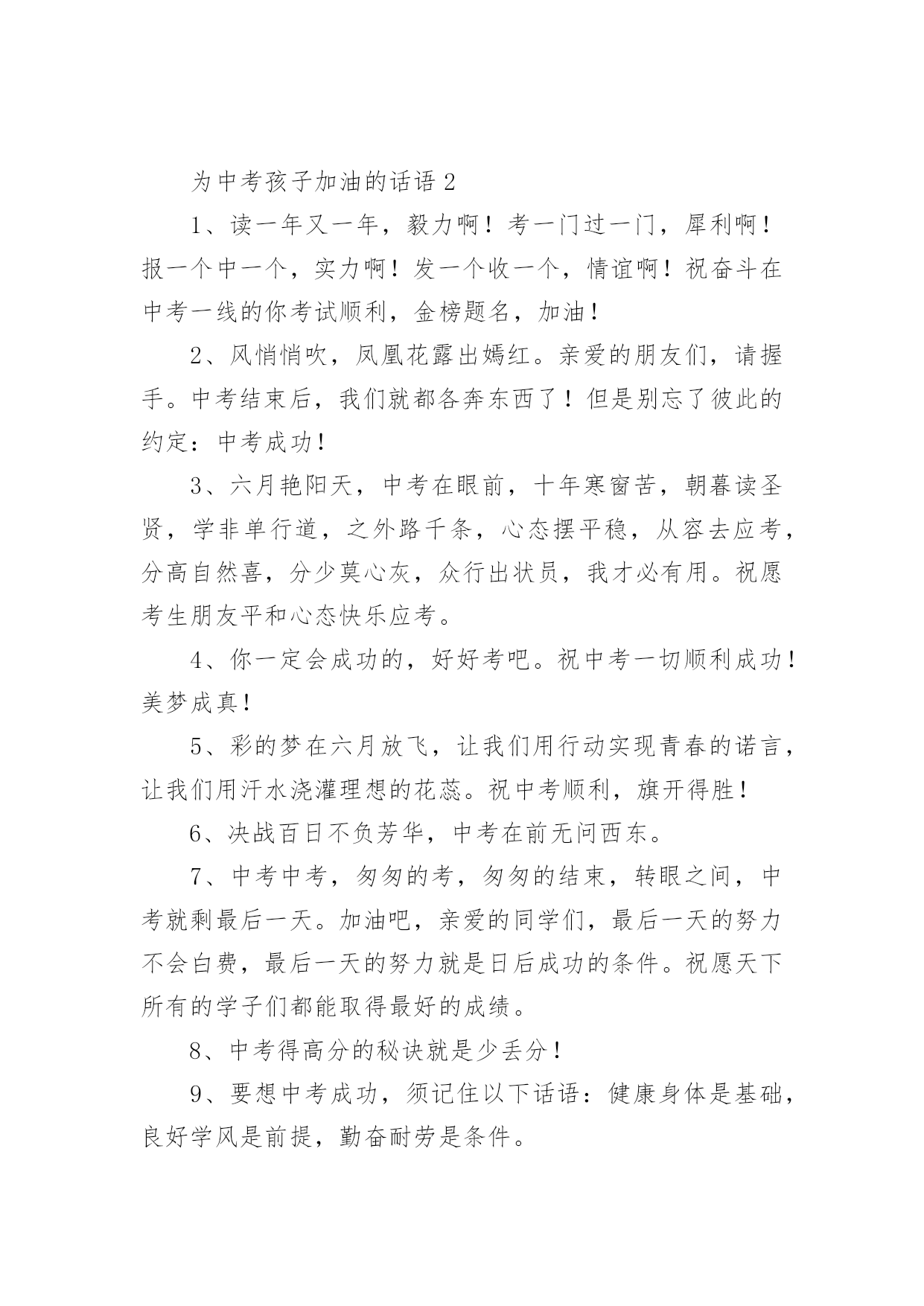 为中考孩子加油的话语为中考孩子加油的话语(精选400句)随着在线社交网络的爆炸式增长,大家最不陌生的就是话语了吧,话语是指与社会权力关系相互缠绕的具体言语方式。想发话语却总是不知道怎么组织语言?下面是小编整理的为中考孩子加油的话语(精选400句),希望对大家有所帮助。为中考孩子加油的话语11、自信,是成功的一半;平淡,是成功的驿站;努力,是成功的积淀;祝福,是成功的先决条件。自信的你在我的祝福下,定会在中考中摘取桂冠,努力吧朋友。2、又是一年中考季,学业收获金色季,十年苦读功夫深,满怀信心前应考,平和心态不紧张,控制情绪免慌乱,考完一门忘一门,尽量放松思下科,好好休息觉儿美,一举高分必定你!祝中考顺利。3、紧张无济于事,何不放手去搏。临时莫抱佛脚,自信胜券在握。人生道路万千,咋走都是生活。轻松面对考验,论心不论功过。祝你中考顺利!4、中考在即,送去祝福,祝你在考场上,自信稳扎稳打,思路翻江倒海,智慧龙飞凤舞,大脑活蹦乱跳,心态四平八稳,钢笔翻飞疾书,成绩名列前茅,理想近在眼前。5、坚持数年,苦读多年,只为今朝,保平常心,扬起笑脸,迎接挑战,决战中考,改变命运,创造佳绩,夺取胜利!祝你中考成功!6、在未来趋于正无穷的日子里,幸福是连续的,对你的祝福是可导的且大于零,祝你每天快乐的复合函数总是最大值。祝中考成功!7、精心备战,精神饱满;细心开战,经受考验;沉着应战,曙光初现;衷心攻战,胜利见面;成功结战,斩将过关。中考临近,愿你这位久经沙场的战士,顺风扬帆,一路向前,金榜如愿!8、今天是中考的日子。希望你能吃得安稳,听得轻语,睡得安稳。让自己保持良好的平静心态,不要太紧张,要相信自己的梦想会实现!9、十年寒窗苦读,一朝踏上中考路;心态是考试关键,认真认真来答卷;轻轻松松来应对,道道题你都答对;祝你考出好成绩!10、愿你们以梦为马,不负韶华。无论是中考,还是人生,愿你们一次次交上答卷的刹那,都有着收剑入鞘的潇洒。11、还有不多的时间就中考了,好好加油吧,记住你们是最棒的。为了自己的未来而奋斗吧!理想的大门正在向你们敞开!12、我知道,中考的日子里,虽然清苦,却很充实。只希望你在记住课本的同时不要忘了我,我会在你背后默默的为你祝福,默默的等待你的佳音!13、六月千葩四溢香,花香飘来捷报传。考取功名上金榜,喜事盈门尽笑颜。十年寒窗梅花绽,再进名校功夫练。亲朋同窗鲜花献,祝你前途耀辉煌。14、一年一度的中考又来到,短信送你神笔一只,此笔一挥无难题,此笔一挥文采洋溢,此笔一挥天下无敌。朋友祝你早日金榜题名。15、信心来自于实力,实力来自于勤奋。你绝对是有实力又勤奋的人,所以你中考金榜题名是板上钉钉的事儿,我在这里先提前祝你“金榜题名”了!16、中考之际,放松压力。提前进场,以免拥挤。答题技巧,心中默记。仔细读题,后难先易。去除杂念,循规蹈矩。遭遇难题,冷静梳理。认真检查,多多有益。17、不苦不累,中考无味;不拼不搏,等于白活。18、永远不要以粗心为借口原谅自己。祝中考成功!19、愿天下中考人:忧愁是可微的,快乐是可积的,在未来趋于正无穷的日子里,幸福是连续的,对你的祝福是可导的且大于零,祝你每天快乐的复合函数总是最大值。20、中考,不紧不慢地来了;考试,不急不躁地应对;试卷,不慌不忙地答题;卷面,不脏不乱的整洁。愿你中考自信满满,沉着应对,平心静气,细心答题,祝考试顺利!静候你金榜题名的佳音哦!21、微笑面对中考,创造美好未来!22、翻过了英语政治,看遍了物理生物,桌子上的复习资料叠成了叠,抽屉的试卷数不清了页,付出的努力终会收获,中考成功势在必得,愿君中考顺利。23、拼搏中考,今生无悔;爬过初三,追求卓越!24、中考即将来临,展示自我的时刻:有信心而无胆怯,有动力而无压力,莫紧张无焦虑,答题迅速不慌乱!愿你马到成功,金笔提名!25、中考的硝烟战场,辉煌的成绩,初三六班,更强的意志,准备中考,初三无悔!26、中考是一个实现人生梦想的.省力杠杆,此时是你撬动它的最佳时机,加油吧,以后你的人生将会呈弧线上升。27、祈愿女儿中考顺顺利利,考到理想高中。28、今天多一份拼搏明天多几份欢笑。祝中考顺利,金榜题名!29、给你一份信心,送你一份决心,要对自己放心,面对考题平常心,要把自己关心,注意考前身心,考试保证全心全意,中考考试,祝你成功!30、奋斗不息,锲而不舍的精神是伟人最闪耀之处,这不由得让我鼓起斗志,为我明年的中考鼓劲。31、枕戈待旦,决战中考,奋战百日,我必成功。必胜,必胜,必胜!32、所谓强者,拼的不是力气,也不是技巧,而是心态。踏踏实实努力,轻轻松松面对。将颤抖关在门外,让信心装满胸怀,中考尽力发挥,愿你载誉归来!33、斗志昂扬,百炼成钢。百天冲刺之际,让我们一起,站在新起点,迎接新挑战,创造新成绩,中考一定赢!34、天高任鸟飞,海