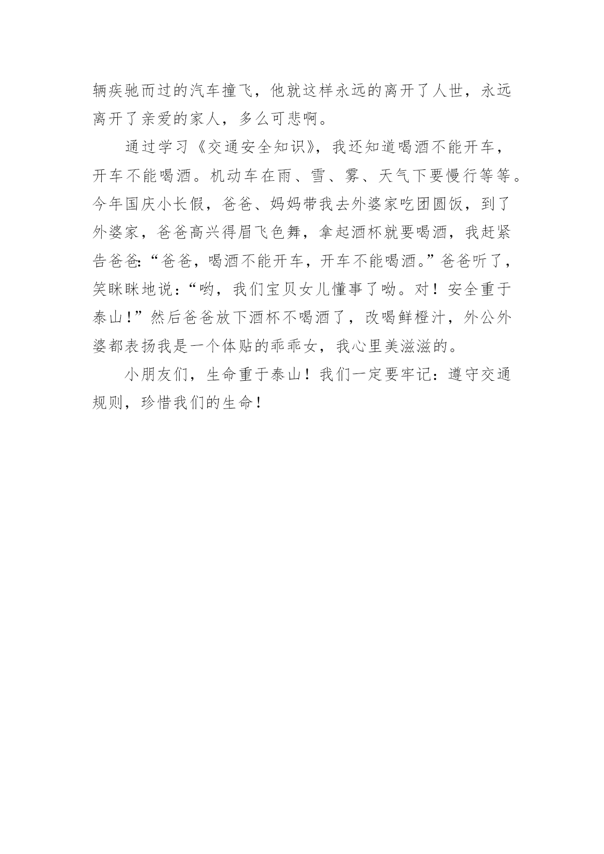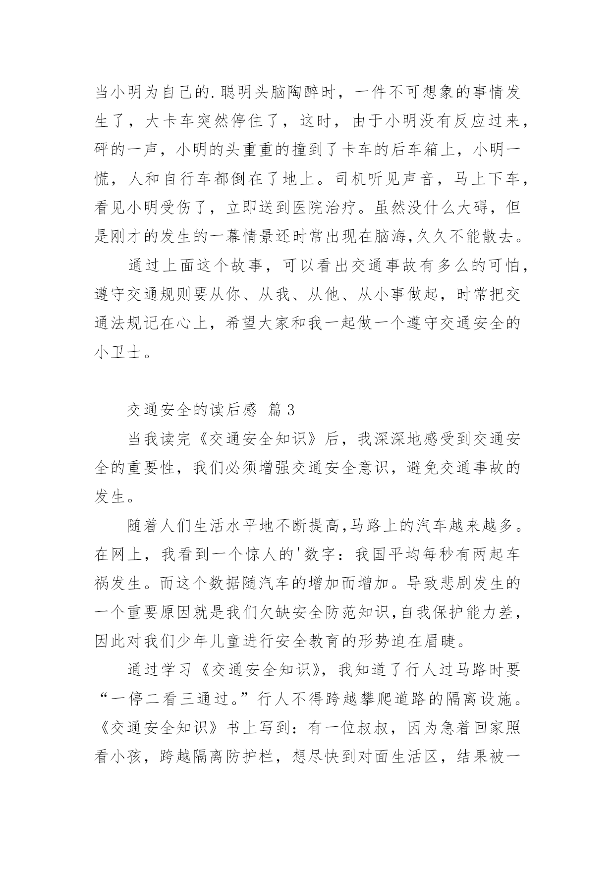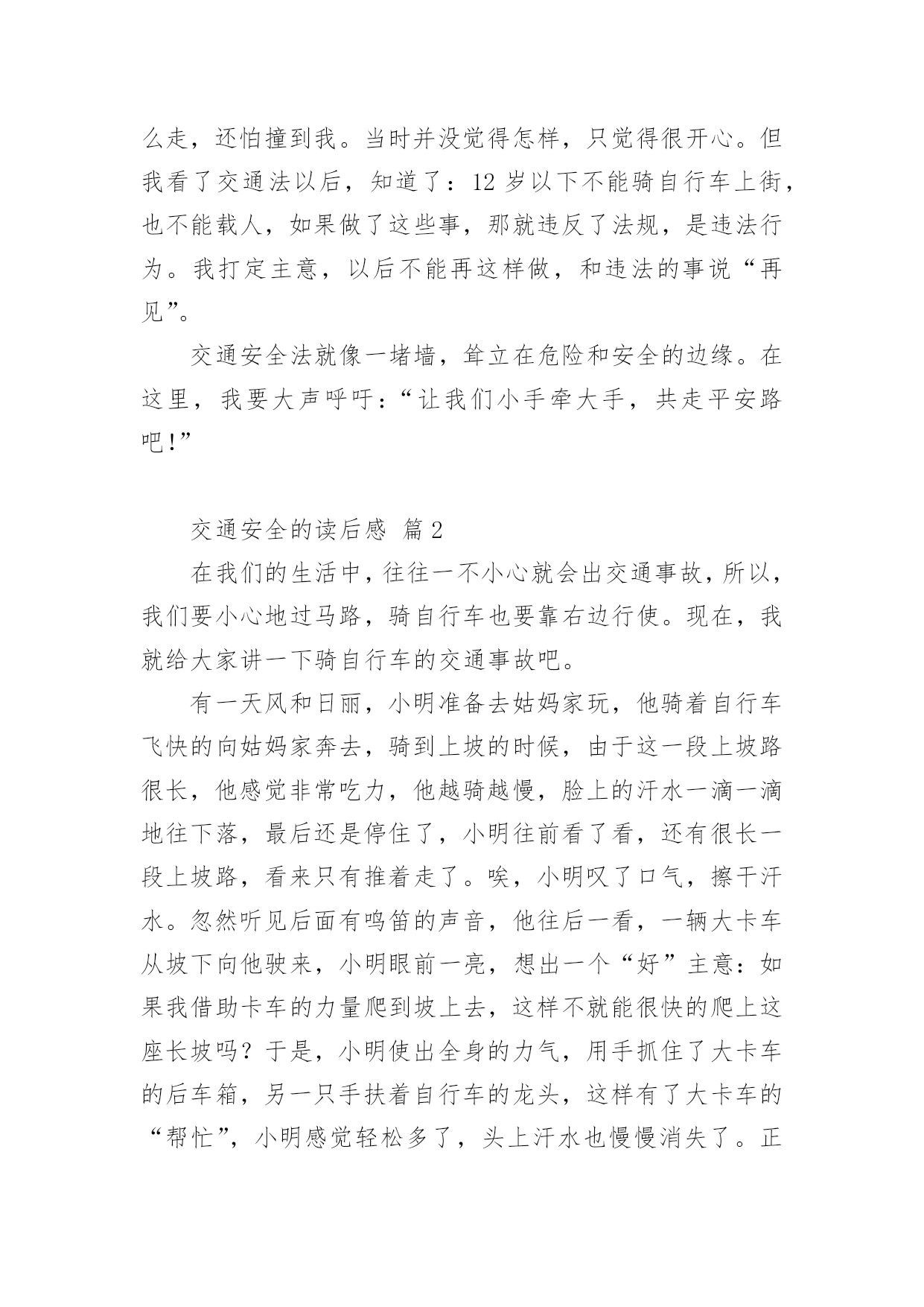 交通安全的读后感当看完一本著作后,大家心中一定有很多感想,这时最关键的读后感不能忘了哦。那么你会写读后感吗?以下是小编为大家整理的交通安全的读后感,欢迎大家分享。交通安全的读后感篇1“一慢二看三通行”、“红灯停,绿灯行”这些儿歌时刻提醒我们青少年牢记交通法规,遵守交通法规,避免发生。小时候,听了这些童谣,我都会莫名其妙的有一种害怕出门的感觉;那是因为自己并不真正的了解交通安全的`含义。直到今天,我终于知道了交通安全的含义。为了维护道路交通秩序,预防和减少,保护人身安全,提高通行效率;道路交通法在交通安全方面对车和人制定了一系列的法律规定,其中让我感触最深的是第四节:行人和乘车人通行规定。这一节告诉我们遵守交通法规,就是要求我们做到行人走路要走人行道,没有人行道必须靠路边走;过马路时,要走有斑马线的地方,注意来往的车辆,遵守交通信号指示灯或交警的指挥,在通过未画人行横道的地方,不要突然猛跑、后退;不准穿越车行道和铁路道口的护栏;还要认识一些交通标志。看着交通法规,我忽然想起了一件事……以前我很喜欢骑自行车,经常骑着自行车猛冲猛撞,还载着朋友上街,开玩笑似的拐来拐去,让后面的车辆不知怎么走,还怕撞到我。当时并没觉得怎样,只觉得很开心。但我看了交通法以后,知道了:12岁以下不能骑自行车上街,也不能载人,如果做了这些事,那就违反了法规,是违法行为。我打定主意,以后不能再这样做,和违法的事说“再见”。交通安全法就像一堵墙,耸立在危险和安全的边缘。在这里,我要大声呼吁:“让我们小手牵大手,共走平安路吧!”交通安全的读后感篇2在我们的生活中,往往一不小心就会出交通事故,所以,我们要小心地过马路,骑自行车也要靠右边行使。现在,我就给大家讲一下骑自行车的交通事故吧。有一天风和日丽,小明准备去姑妈家玩,他骑着自行车飞快的向姑妈家奔去,骑到上坡的时候,由于这一段上坡路很长,他感觉非常吃力,他越骑越慢,脸上的汗水一滴一滴地往下落,最后还是停住了,小明往前看了看,还有很长一段上坡路,看来只有推着走了。唉,小明叹了口气,擦干汗水。忽然听见后面有鸣笛的声音,他往后一看,一辆大卡车从坡下向他驶来,小明眼前一亮,想出一个“好”主意:如果我借助卡车的力量爬到坡上去,这样不就能很快的爬上这座长坡吗?于是,小明使出全身的力气,用手抓住了大卡车的后车箱,另一只手扶着自行车的龙头,这样有了大卡车的“帮忙”,小明感觉轻松多了,头上汗水也慢慢消失了。正当小明为自己的.聪明头脑陶醉时,一件不可想象的事情发生了,大卡车突然停住了,这时,由于小明没有反应过来,砰的一声,小明的头重重的撞到了卡车的后车箱上,小明一慌,人和自行车都倒在了地上。司机听见声音,马上下车,看见小明受伤了,立即送到医院治疗。虽然没什么大碍,但是刚才的发生的一幕情景还时常出现在脑海,久久不能散去。通过上面这个故事,可以看出交通事故有多么的可怕,遵守交通规则要从你、从我、从他、从小事做起,时常把交通法规记在心上,希望大家和我一起做一个遵守交通安全的小卫士。交通安全的读后感篇3当我读完《交通安全知识》后,我深深地感受到交通安全的重要性,我们必须增强交通安全意识,避免交通事故的发生。随着人们生活水平地不断提高,马路上的汽车越来越多。在网上,我看到一个惊人的'数字:我国平均每秒有两起车祸发生。而这个数据随汽车的增加而增加。导致悲剧发生的一个重要原因就是我们欠缺安全防范知识,自我保护能力差,因此对我们少年儿童进行安全教育的形势迫在眉睫。通过学习《交通安全知识》,我知道了行人过马路时要“一停二看三通过。”行人不得跨越攀爬道路的隔离设施。《交通安全知识》书上写到:有一位叔叔,因为急着回家照看小孩,跨越隔离防护栏,想尽快到对面生活区,结果被一辆疾驰而过的汽车撞飞,他就这样永远的离开了人世,永远离开了亲爱的家人,多么可悲啊。通过学习《交通安全知识》,我还知道喝酒不能开车,开车不能喝酒。机动车在雨、雪、雾、天气下要慢行等等。今年国庆小长假,爸爸、妈妈带我去外婆家吃团圆饭,到了外婆家,爸爸高兴得眉飞色舞,拿起酒杯就要喝酒,我赶紧告爸爸:“爸爸,喝酒不能开车,开车不能喝酒。”爸爸听了,笑眯眯地说:“哟,我们宝贝女儿懂事了呦。对!安全重于泰山!”然后爸爸放下酒杯不喝酒了,改喝鲜橙汁,外公外婆都表扬我是一个体贴的乖乖女,我心里美滋滋的。小朋友们,生命重于泰山!我们一定要牢记:遵守交通规则,珍惜我们的生命!