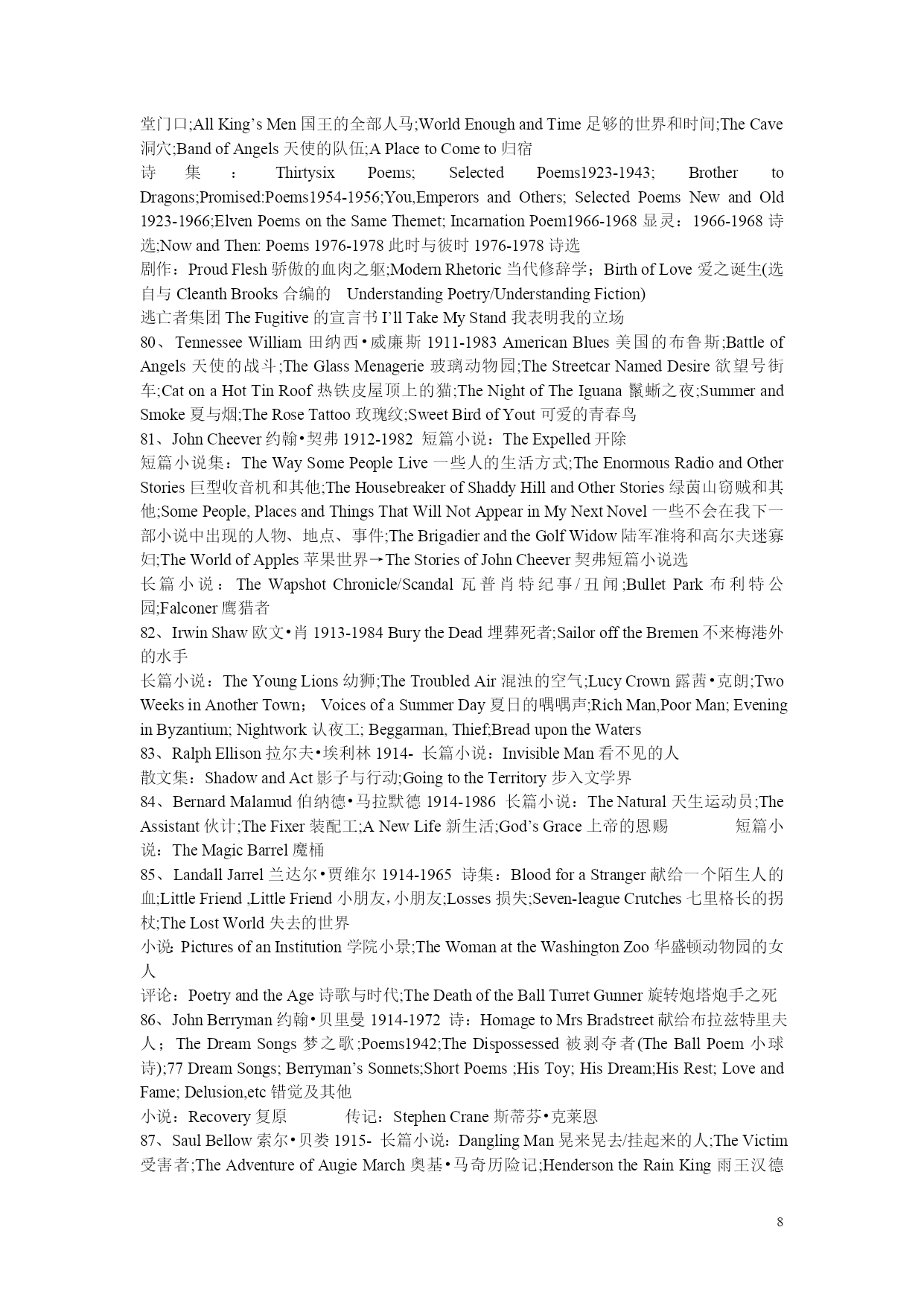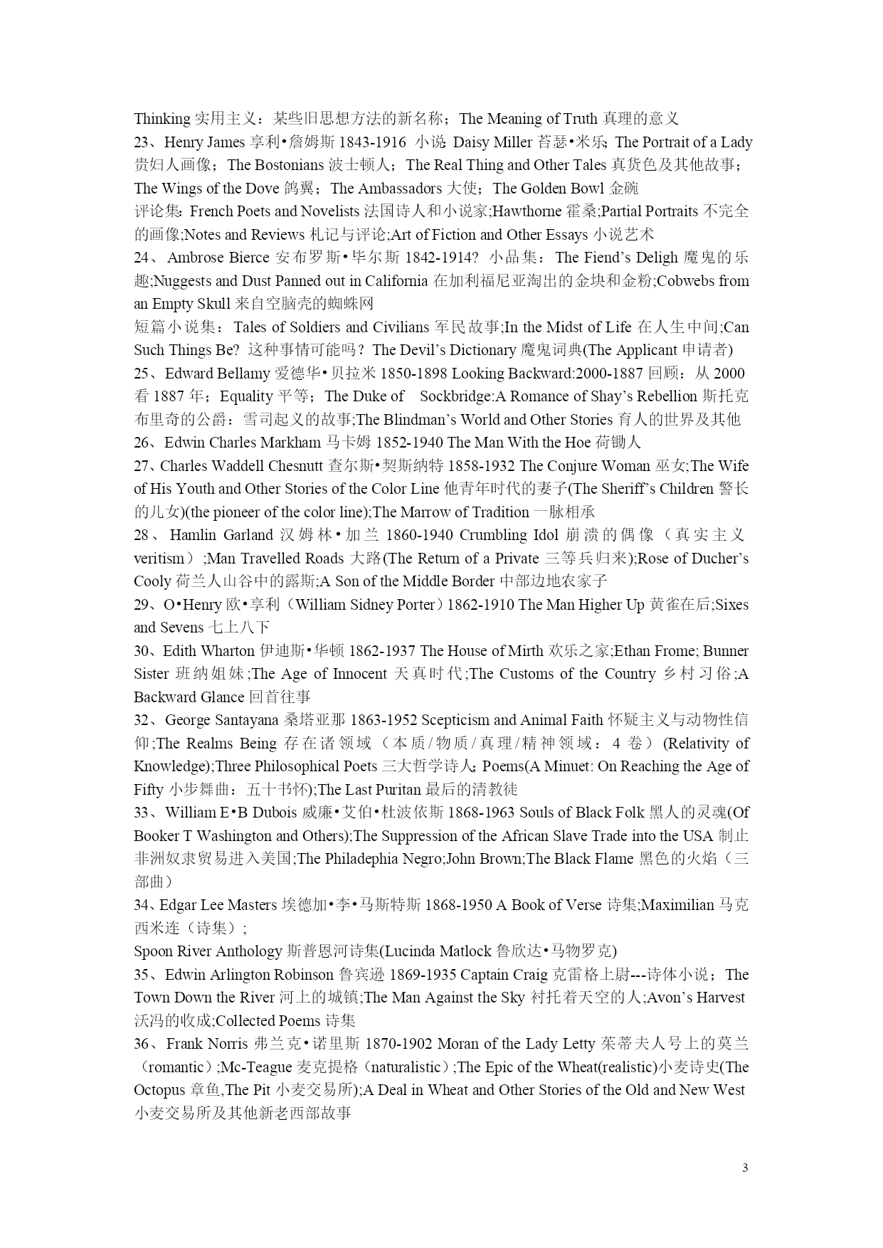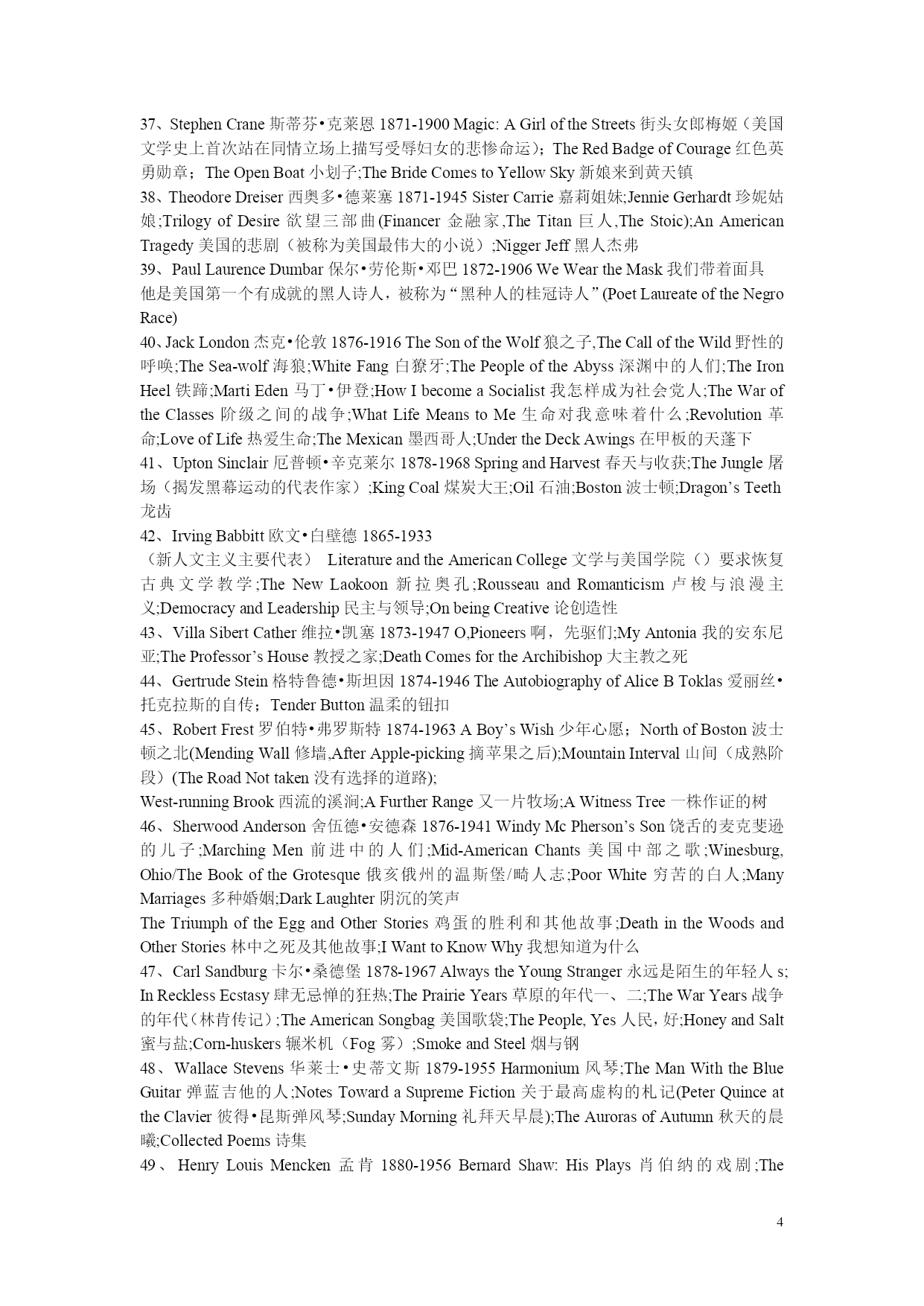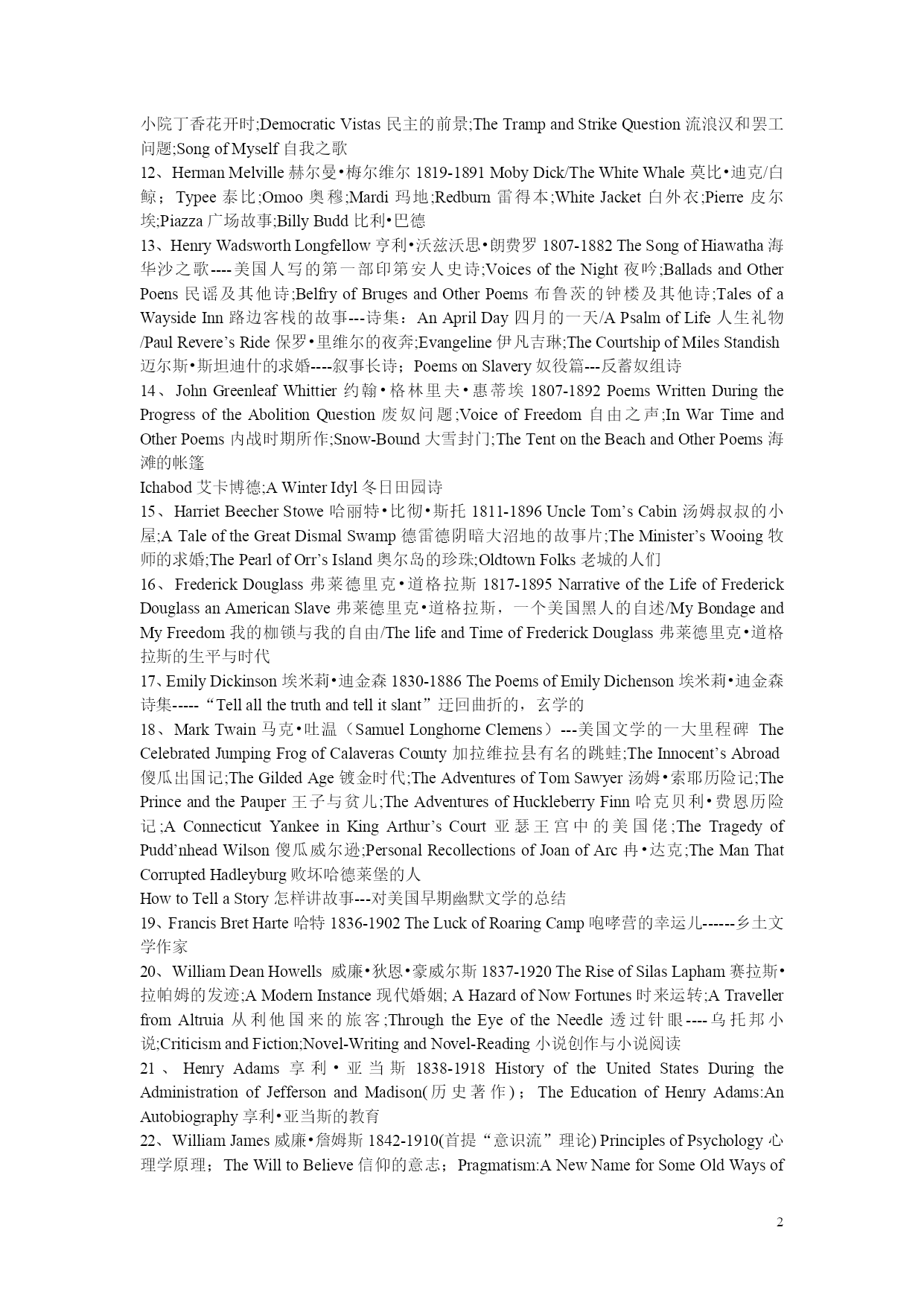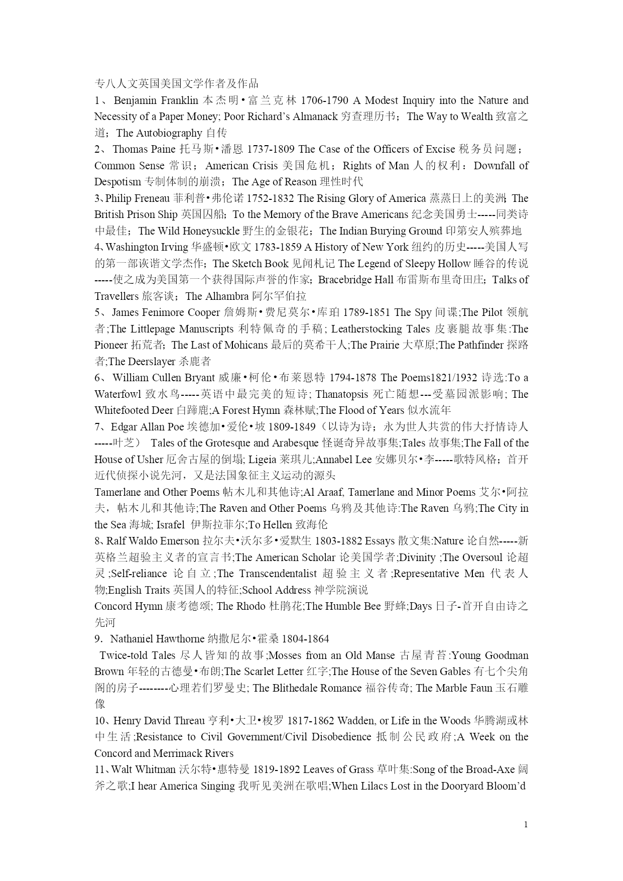 PAGEPAGE12专八人文英国美国文学作者及作品1、BenjaminFranklin本杰明•富兰克林1706-1790AModestInquiryintotheNatureandNecessityofaPaperMoney;PoorRichard’sAlmanack穷查理历书;TheWaytoWealth致富之道;TheAutobiography自传2、ThomasPaine托马斯•潘恩1737-1809TheCaseoftheOfficersofExcise税务员问题;CommonSense常识;AmericanCrisis美国危机;RightsofMan人的权利:DownfallofDespotism专制体制的崩溃;TheAgeofReason理性时代3、PhilipFreneau菲利普•弗伦诺1752-1832TheRisingGloryofAmerica蒸蒸日上的美洲;TheBritishPrisonShip英国囚船;TotheMemoryoftheBraveAmericans纪念美国勇士-----同类诗中最佳;TheWildHoneysuckle野生的金银花;TheIndianBuryingGround印第安人殡葬地4、WashingtonIrving华盛顿•欧文1783-1859AHistoryofNewYork纽约的历史-----美国人写的第一部诙谐文学杰作;TheSketchBook见闻札记TheLegendofSleepyHollow睡谷的传说-----使之成为美国第一个获得国际声誉的作家;BracebridgeHall布雷斯布里奇田庄;TalksofTravellers旅客谈;TheAlhambra阿尔罕伯拉5、JamesFenimoreCooper詹姆斯•费尼莫尔•库珀1789-1851TheSpy间谍;ThePilot领航者;TheLittlepageManuscripts利特佩奇的手稿;LeatherstockingTales皮裹腿故事集:ThePioneer拓荒者;TheLastofMohicans最后的莫希干人;ThePrairie大草原;ThePathfinder探路者;TheDeerslayer杀鹿者6、WilliamCullenBryant威廉•柯伦•布莱恩特1794-1878ThePoems1821/1932诗选:ToaWaterfowl致水鸟-----英语中最完美的短诗;Thanatopsis死亡随想---受墓园派影响;TheWhitefootedDeer白蹄鹿;AForestHymn森林赋;TheFloodofYears似水流年7、EdgarAllanPoe埃德加•爱伦•坡1809-1849(以诗为诗;永为世人共赏的伟大抒情诗人-----叶芝)TalesoftheGrotesqueandArabesque怪诞奇异故事集;Tales故事集;TheFalloftheHouseofUsher厄舍古屋的倒塌;Ligeia莱琪儿;AnnabelLee安娜贝尔•李-----歌特风格;首开近代侦探小说先河,又是法国象征主义运动的源头TamerlaneandOtherPoems帖木儿和其他诗;AlAraaf,TamerlaneandMinorPoems艾尔•阿拉夫,帖木儿和其他诗;TheRavenandOtherPoems乌鸦及其他诗:TheRaven乌鸦;TheCityintheSea海城;Israfel伊斯拉菲尔;ToHellen致海伦8、RalfWaldoEmerson拉尔夫•沃尔多•爱默生1803-1882Essays散文集:Nature论自然-----新英格兰超验主义者的宣言书;TheAmericanScholar论美国学者;Divinity;TheOversoul论超灵;Self-reliance论自立;TheTranscendentalist超验主义者;RepresentativeMen代表人物;EnglishTraits英国人的特征;SchoolAddress神学院演说ConcordHymn康考德颂;TheRhodo杜鹃花;TheHumbleBee野蜂;Days日子-首开自由诗之先河9.NathanielHawthorne纳撒尼尔•霍桑1804-1864Twice-toldTales尽人皆知的故事;MossesfromanOldManse古屋青苔:YoungGoodmanBrown年轻的古德曼•布朗;TheScarletLetter红字;TheHouseoftheSevenGables有七个尖角阁的房子--------心理若们罗曼史;TheBlithedaleRomance福谷传奇;TheMarbleFaun玉石雕像10、HenryDav