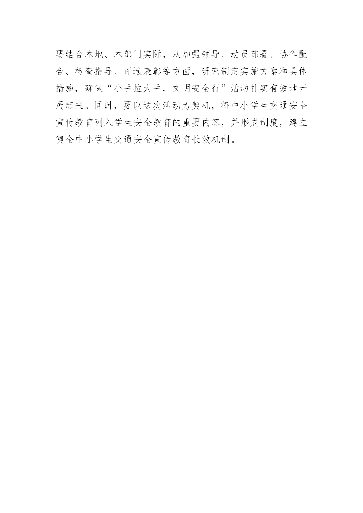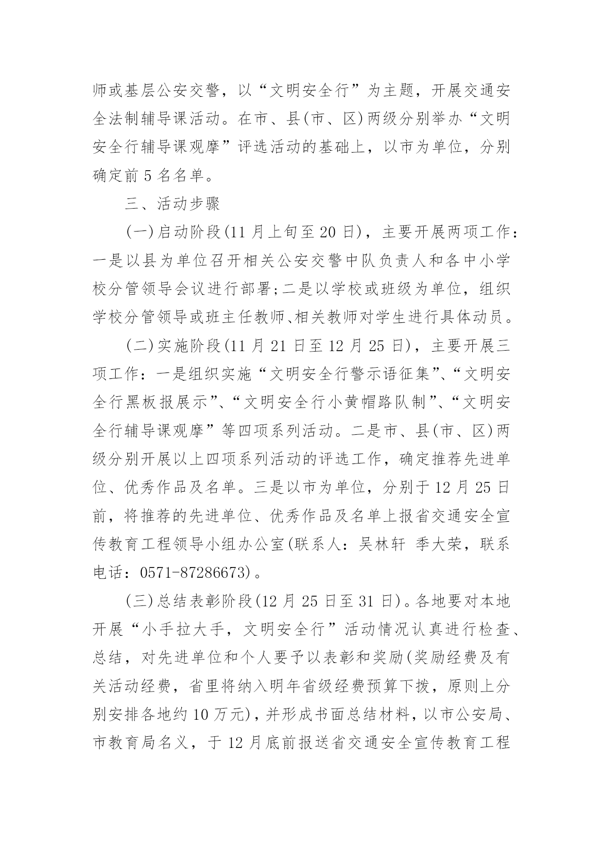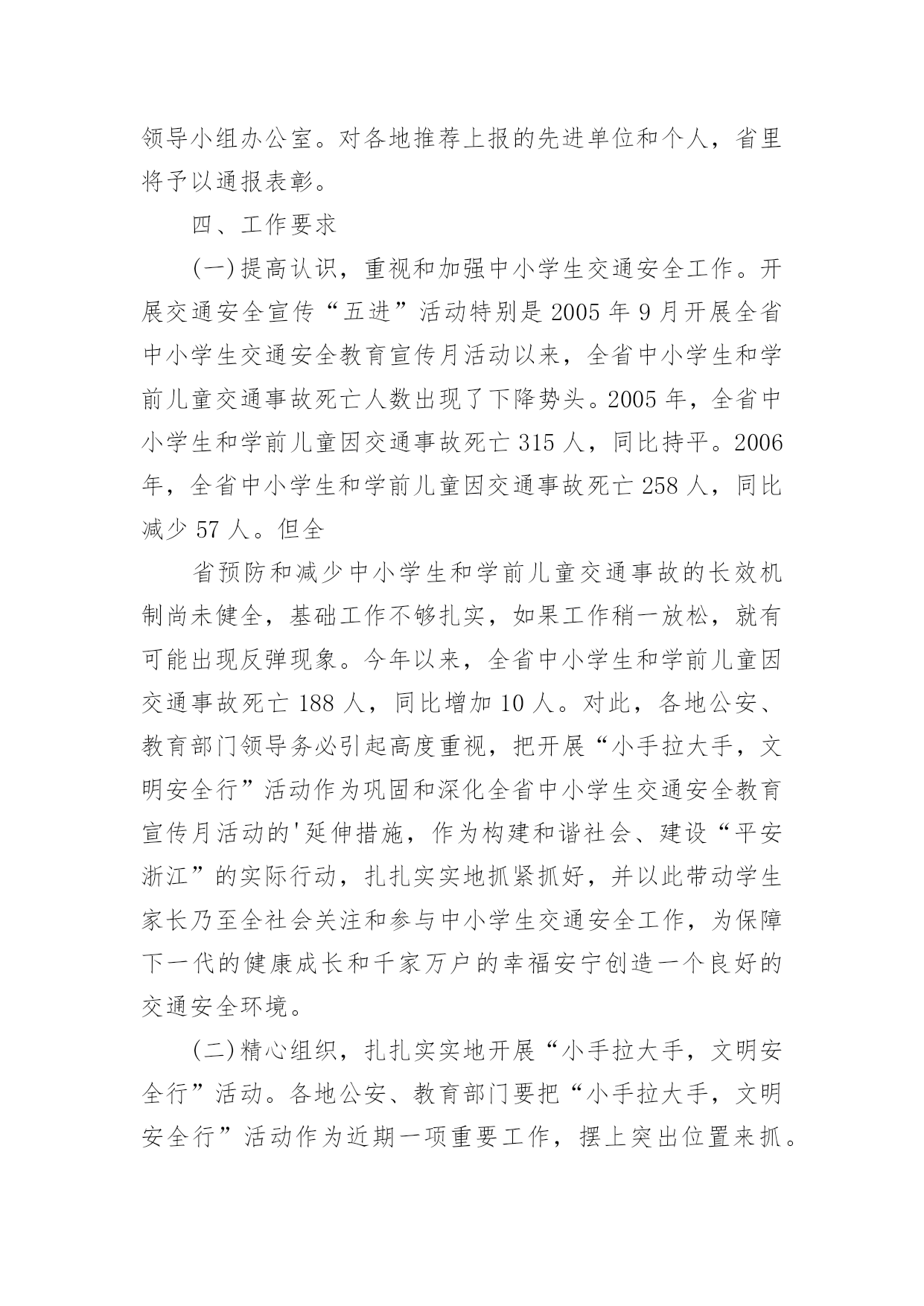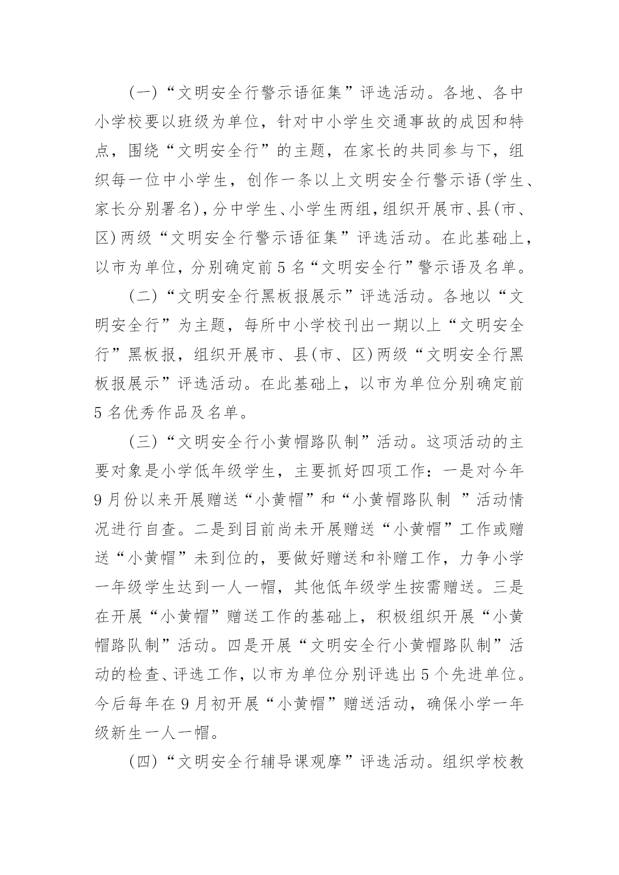 交通安全黑板报资料内容交通安全黑板报资料内容为进一步加强全省中小学生交通安全宣传教育工作,增强交通安全法治意识和文明交通意识,提高交通安全自我防护能力,预防和减少学生交通事故,决定于今年11月至12月,开展以“小手拉大手,文明安全行”为主题的全省中小学生交通安全宣传教育活动(简称“小手拉大手,文明安全行”活动)。一、指导思想坚持“以人为本”、“安全第一”的原则,以“安全乘车、安全骑车、安全走路”养成教育为主线,以深化交通安全宣传“进学校”活动为载体,集中开展“文明安全行警示语征集”、“文明安全行黑板报展示”、“文明安全行小黄帽路队制”、“文明安全行辅导课观摩”等评选活动,营造中小学校交通安全宣传教育的浓厚氛围,进一步推进全省中小学生交通安全宣传教育工作,增强交通安全法治意识和文明交通意识,提高交通安全认知能力和自我防护能力,进而影响和推进学生家长乃至社会公众对中小学生交通安全的重视和关注,进一步保障中小学生出行安全,最大限度减少中小学生交通事故的发生。二、活动时间和内容全省“小手拉大手,文明安全行”活动从20XX年11月上旬启动,至12月底结束。主要组织开展四项系列活动:(一)“文明安全行警示语征集”评选活动。各地、各中小学校要以班级为单位,针对中小学生交通事故的成因和特点,围绕“文明安全行”的主题,在家长的共同参与下,组织每一位中小学生,创作一条以上文明安全行警示语(学生、家长分别署名),分中学生、小学生两组,组织开展市、县(市、区)两级“文明安全行警示语征集”评选活动。在此基础上,以市为单位,分别确定前5名“文明安全行”警示语及名单。(二)“文明安全行黑板报展示”评选活动。各地以“文明安全行”为主题,每所中小学校刊出一期以上“文明安全行”黑板报,组织开展市、县(市、区)两级“文明安全行黑板报展示”评选活动。在此基础上,以市为单位分别确定前5名优秀作品及名单。(三)“文明安全行小黄帽路队制”活动。这项活动的主要对象是小学低年级学生,主要抓好四项工作:一是对今年9月份以来开展赠送“小黄帽”和“小黄帽路队制”活动情况进行自查。二是到目前尚未开展赠送“小黄帽”工作或赠送“小黄帽”未到位的,要做好赠送和补赠工作,力争小学一年级学生达到一人一帽,其他低年级学生按需赠送。三是在开展“小黄帽”赠送工作的基础上,积极组织开展“小黄帽路队制”活动。四是开展“文明安全行小黄帽路队制”活动的检查、评选工作,以市为单位分别评选出5个先进单位。今后每年在9月初开展“小黄帽”赠送活动,确保小学一年级新生一人一帽。(四)“文明安全行辅导课观摩”评选活动。组织学校教师或基层公安交警,以“文明安全行”为主题,开展交通安全法制辅导课活动。在市、县(市、区)两级分别举办“文明安全行辅导课观摩”评选活动的基础上,以市为单位,分别确定前5名名单。三、活动步骤(一)启动阶段(11月上旬至20日),主要开展两项工作:一是以县为单位召开相关公安交警中队负责人和各中小学校分管领导会议进行部署;二是以学校或班级为单位,组织学校分管领导或班主任教师、相关教师对学生进行具体动员。(二)实施阶段(11月21日至12月25日),主要开展三项工作:一是组织实施“文明安全行警示语征集”、“文明安全行黑板报展示”、“文明安全行小黄帽路队制”、“文明安全行辅导课观摩”等四项系列活动。二是市、县(市、区)两级分别开展以上四项系列活动的评选工作,确定推荐先进单位、优秀作品及名单。三是以市为单位,分别于12月25日前,将推荐的先进单位、优秀作品及名单上报省交通安全宣传教育工程领导小组办公室(联系人:吴林轩季大荣,联系电话:0571-87286673)。(三)总结表彰阶段(12月25日至31日)。各地要对本地开展“小手拉大手,文明安全行”活动情况认真进行检查、总结,对先进单位和个人要予以表彰和奖励(奖励经费及有关活动经费,省里将纳入明年省级经费预算下拨,原则上分别安排各地约10万元),并形成书面总结材料,以市公安局、市教育局名义,于12月底前报送省交通安全宣传教育工程领导小组办公室。对各地推荐上报的先进单位和个人,省里将予以通报表彰。四、工作要求(一)提高认识,重视和加强中小学生交通安全工作。开展交通安全宣传“五进”活动特别是2005年9月开展全省中小学生交通安全教育宣传月活动以来,全省中小学生和学前儿童交通事故死亡人数出现了下降势头。2005年,全省中小学生和学前儿童因交通事故死亡315人,同比持平。2006年,全省中小学生和学前儿童因交通事故死亡258人,同比减少57人。但全省预防和减少中小学生和学前儿童交通事故的长效机制尚未健全,基础工作不够扎实,如果工作稍一放松,就有可能出现反弹现象。今年以来,全省中小学生和学前儿童因交通事故死亡188人,同比增加10人。对此,各地公安、教育部门领导务必