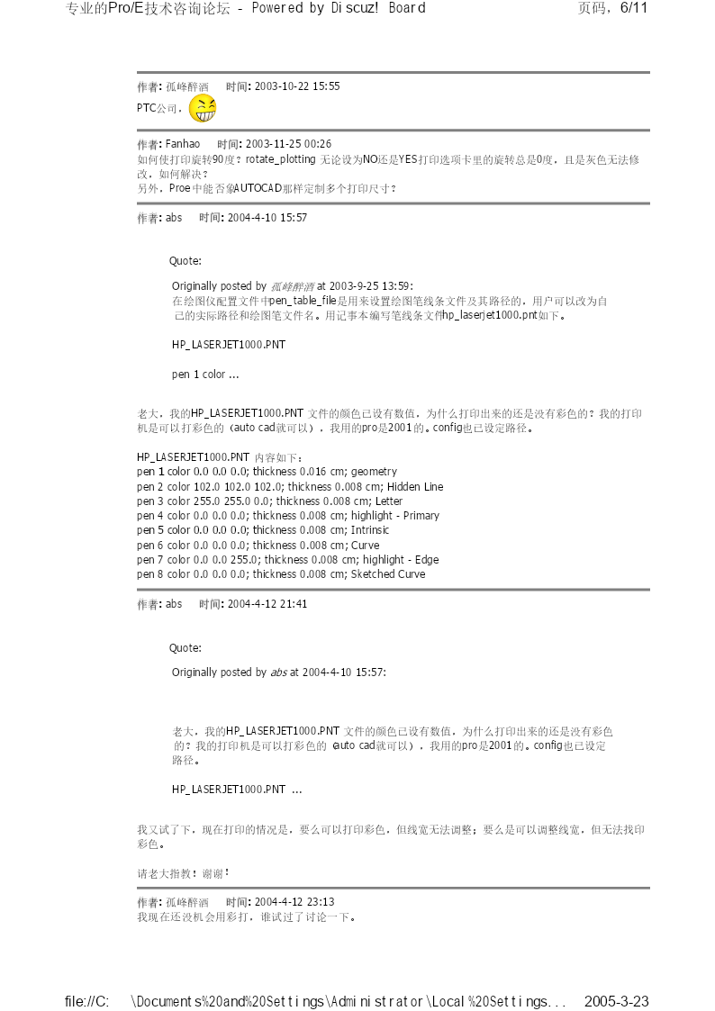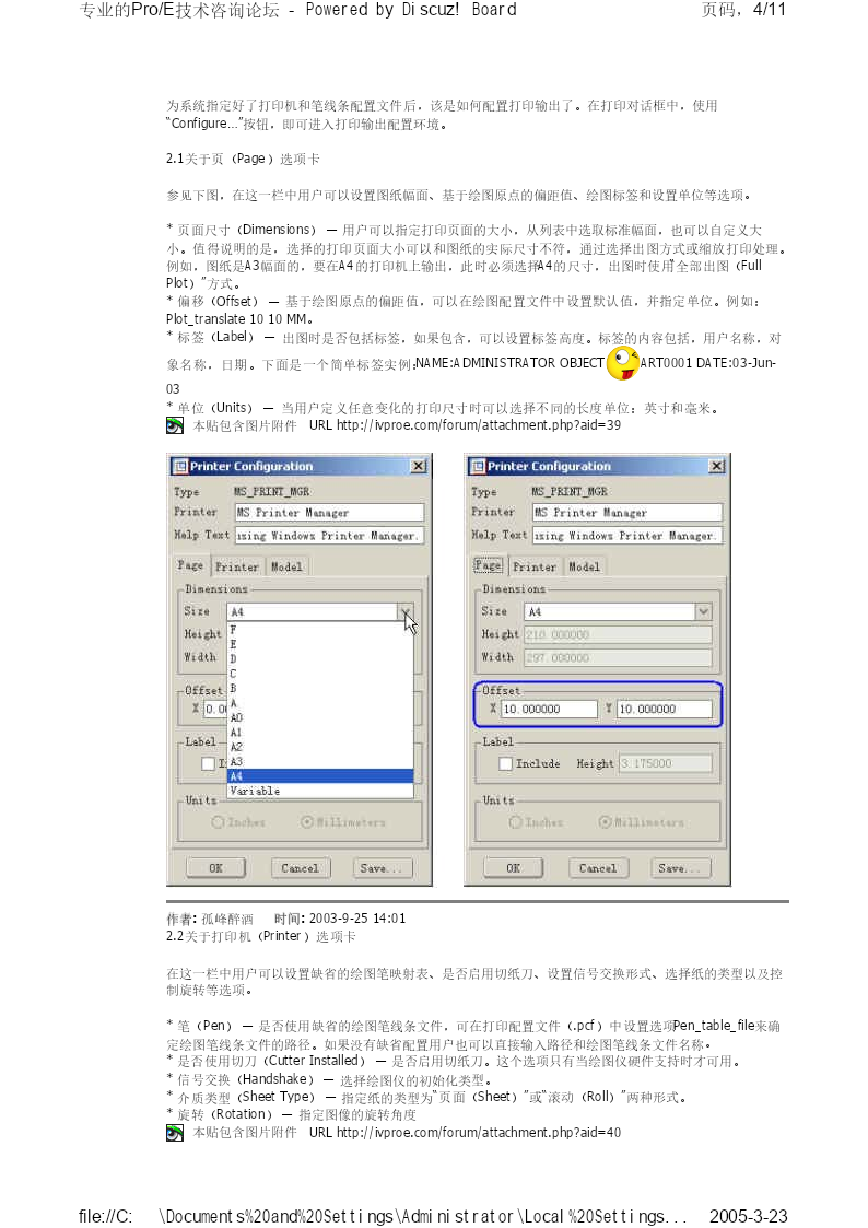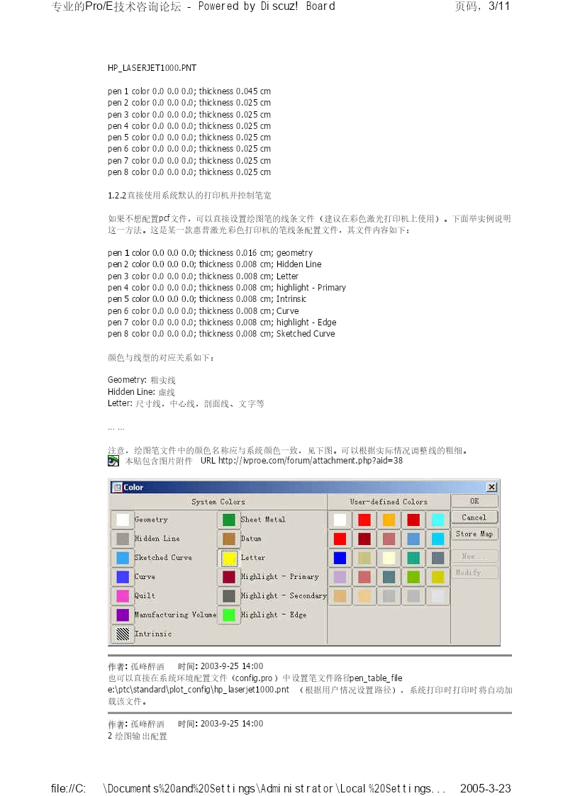 专业的Pro/E技术咨询论坛-PoweredbyDiscuz!Board页码,1/11标题:[教程]绘图打印与打印机配置[打印本页]作者:孤峰醉酒时间:2003-9-2513:58标题:[教程]绘图打印与打印机配置转载请注明出处、作者。by孤峰醉酒欢迎来到孤峰在线:http://ivproe.com/无论是零件(Part)模式、装配(Assembly)模式还是在工程图(Drawing)中,都可以进行文件打印操作,执行下拉菜单文件(File)>打印(Print)…另外,使用Pro/BATCH可以批量打印绘图文件,而不必每次都从交互菜单选择和设置。批命令文件包含一系列要打印的对象,可创建出图文件并脱机打印。在学习绘图打印配置之前先了解关于打印的一些说明。*隐藏线在屏幕上显示为灰色,在图纸上输出时为虚线。*Pro/ENGINEER软件系统输出线型时,如果是系统提供的线型将按照图纸页面的大小缩放打印,但是用户定义的图线种类不能缩放打印。可设置系统环境配置文件选项USE_SOFTWARE_LINEFONTS的值为YES,以确保绘图仪完全按照Pro/ENGINEER软件中出现的形式打印线型。*打印着色模型时,不能使用“MSPrinterMaganer”生成的打印机。*当剖面(CROSSSEC)菜单激活时,可从“零件”或“组件”模式打印剖面。1设置打印机1.1软件可识别的标准打印机Pro/ENGINEER软件系统对很多常用的打印机都可以自动识别并通过打印菜单直接选取,配置完成后可直接打印,见下图。本贴包含图片附件URLhttp://ivproe.com/forum/attachment.php?aid=36作者:孤峰醉酒时间:2003-9-2513:591.2添加系统打印机对于很多Pro/ENGINEER软件不能自动识别的打印机并不在它的打印机列表里,可以采用以下两种方法实现file://C:\Documents%20and%20Settings\Administrator\Local%20Settings...2005-3-23专业的Pro/E技术咨询论坛-PoweredbyDiscuz!Board页码,2/11绘图打印。1.2.1建立打印机配置文件Pro/ENGINEER软件系统默认的打印机配置文件放在目录.\text\plot_config\下面,是扩展名为.pcf的纯文本文件。如果用户需要添加系统打印机,则建立一个打印机配置文件存放在该目录中,但为了方便管理,一般情况下用户自建的配置文件存放在用户自己的标准目录库中,并在系统环境配置文件(config.pro)中设置选项pro_plot_config_dir的值,指定pcf文件的存储路径,例如保存路径为E:\ptc\standard\plot_config\。系统自动装载该配置文件到打印列表中供用户选择。系统中可以同时存在多个打印配置文件(包括用户自建的),需要时可从列表中直接选取,见下图。能在该列表中显示的配置文件必须定义其中的选项button_name的值,例如:MSPrinterManager。关于配置文件的内容在下面有详细介绍。本贴包含图片附件URLhttp://ivproe.com/forum/attachment.php?aid=37作者:孤峰醉酒时间:2003-9-2513:59用记事本建立pcf文件如下:MS_PRINT_MGR.PCFplotterms_print_mgrbutton_namemsprintermanagerbutton_helpprintusingwindowsprintermanagerplot_handshakesoftwaredefaultallow_file_namingyesdelete_after_plottingnointerface_quality3defaultplot_destinationprinterdefaultpaper_sizea4defaultpen_slew15pen_table_filee:\ptc\standard\plot_config\hp_laserjet1000.pntplot_sheetscurrentdefaultplot_accesscreateplot_clipnoplot_drawing_formatyesplot_labelnoplot_layercurrentplot_linestyle_scale.25plot_namesnoplot_segmentednoplotter_commandwindows_