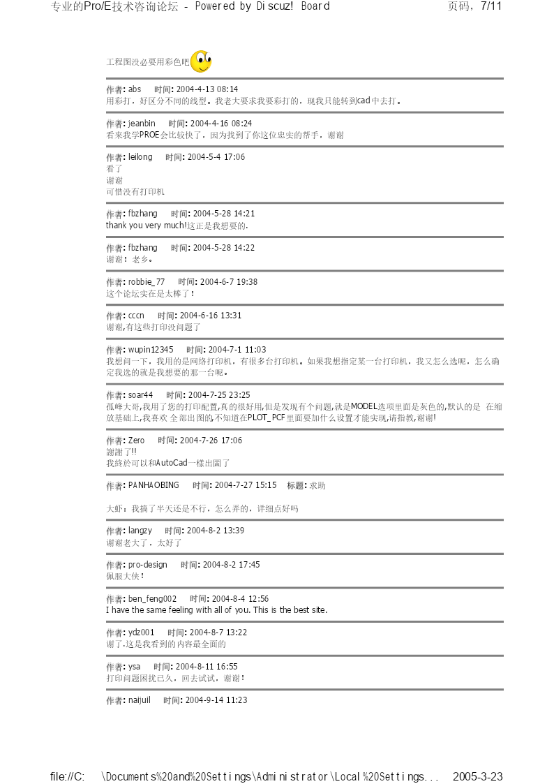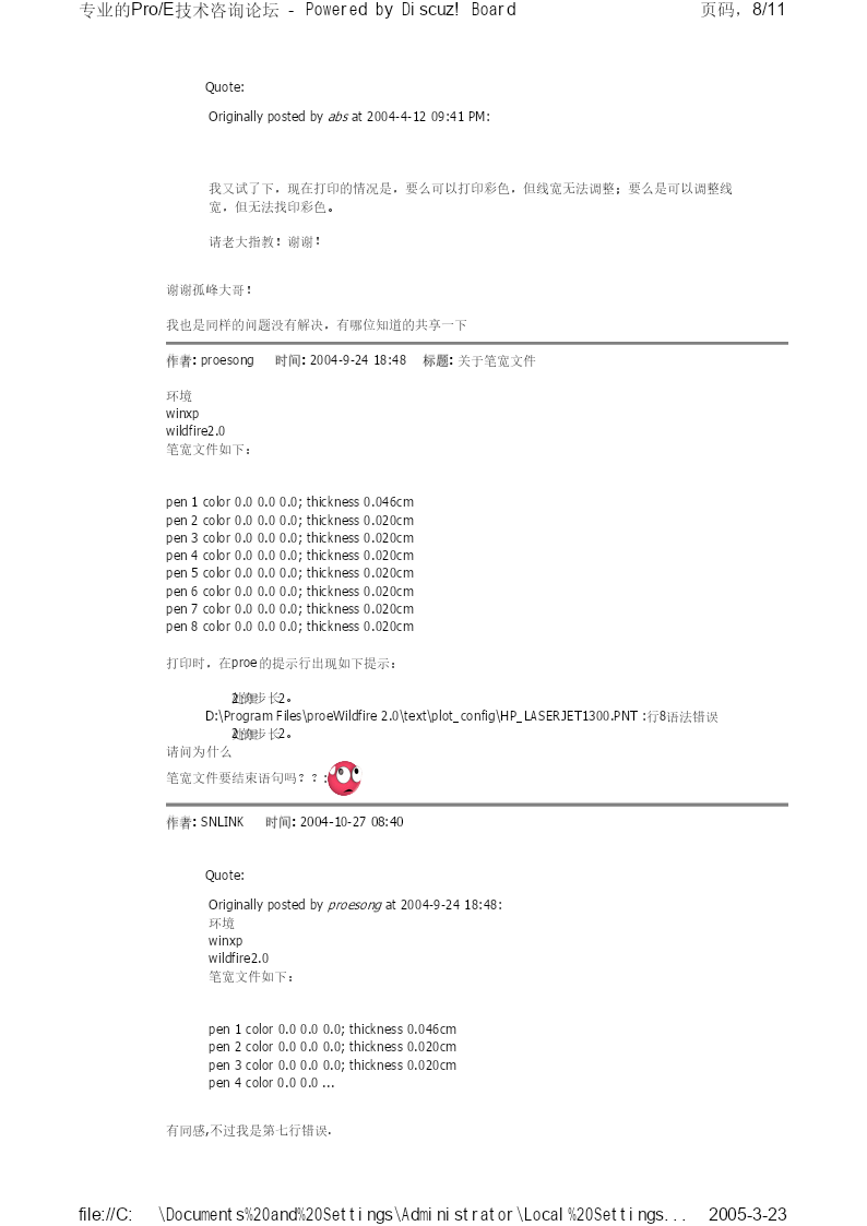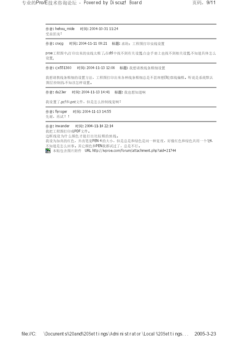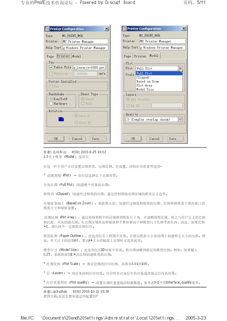 专业的Pro/E技术咨询论坛-PoweredbyDiscuz!Board页码,1/11标题:[教程]绘图打印与打印机配置[打印本页]作者:孤峰醉酒时间:2003-9-2513:58标题:[教程]绘图打印与打印机配置转载请注明出处、作者。by孤峰醉酒欢迎来到孤峰在线:http://ivproe.com/无论是零件(Part)模式、装配(Assembly)模式还是在工程图(Drawing)中,都可以进行文件打印操作,执行下拉菜单文件(File)>打印(Print)…另外,使用Pro/BATCH可以批量打印绘图文件,而不必每次都从交互菜单选择和设置。批命令文件包含一系列要打印的对象,可创建出图文件并脱机打印。在学习绘图打印配置之前先了解关于打印的一些说明。*隐藏线在屏幕上显示为灰色,在图纸上输出时为虚线。*Pro/ENGINEER软件系统输出线型时,如果是系统提供的线型将按照图纸页面的大小缩放打印,但是用户定义的图线种类不能缩放打印。可设置系统环境配置文件选项USE_SOFTWARE_LINEFONTS的值为YES,以确保绘图仪完全按照Pro/ENGINEER软件中出现的形式打印线型。*打印着色模型时,不能使用“MSPrinterMaganer”生成的打印机。*当剖面(CROSSSEC)菜单激活时,可从“零件”或“组件”模式打印剖面。1设置打印机1.1软件可识别的标准打印机Pro/ENGINEER软件系统对很多常用的打印机都可以自动识别并通过打印菜单直接选取,配置完成后可直接打印,见下图。本贴包含图片附件URLhttp://ivproe.com/forum/attachment.php?aid=36作者:孤峰醉酒时间:2003-9-2513:591.2添加系统打印机对于很多Pro/ENGINEER软件不能自动识别的打印机并不在它的打印机列表里,可以采用以下两种方法实现file://C:\Documents%20and%20Settings\Administrator\Local%20Settings...2005-3-23专业的Pro/E技术咨询论坛-PoweredbyDiscuz!Board页码,2/11绘图打印。1.2.1建立打印机配置文件Pro/ENGINEER软件系统默认的打印机配置文件放在目录.\text\plot_config\下面,是扩展名为.pcf的纯文本文件。如果用户需要添加系统打印机,则建立一个打印机配置文件存放在该目录中,但为了方便管理,一般情况下用户自建的配置文件存放在用户自己的标准目录库中,并在系统环境配置文件(config.pro)中设置选项pro_plot_config_dir的值,指定pcf文件的存储路径,例如保存路径为E:\ptc\standard\plot_config\。系统自动装载该配置文件到打印列表中供用户选择。系统中可以同时存在多个打印配置文件(包括用户自建的),需要时可从列表中直接选取,见下图。能在该列表中显示的配置文件必须定义其中的选项button_name的值,例如:MSPrinterManager。关于配置文件的内容在下面有详细介绍。本贴包含图片附件URLhttp://ivproe.com/forum/attachment.php?aid=37作者:孤峰醉酒时间:2003-9-2513:59用记事本建立pcf文件如下:MS_PRINT_MGR.PCFplotterms_print_mgrbutton_namemsprintermanagerbutton_helpprintusingwindowsprintermanagerplot_handshakesoftwaredefaultallow_file_namingyesdelete_after_plottingnointerface_quality3defaultplot_destinationprinterdefaultpaper_sizea4defaultpen_slew15pen_table_filee:\ptc\standard\plot_config\hp_laserjet1000.pntplot_sheetscurrentdefaultplot_accesscreateplot_clipnoplot_drawing_formatyesplot_labelnoplot_layercurrentplot_linestyle_scale.25plot_namesnoplot_segmentednoplotter_commandwindows_