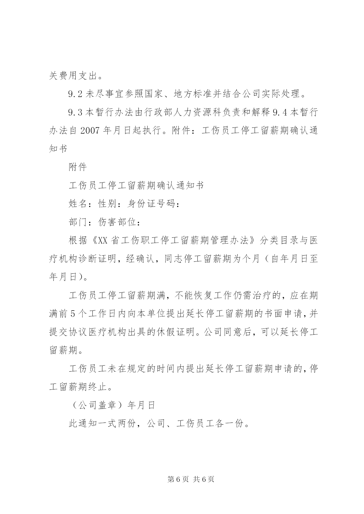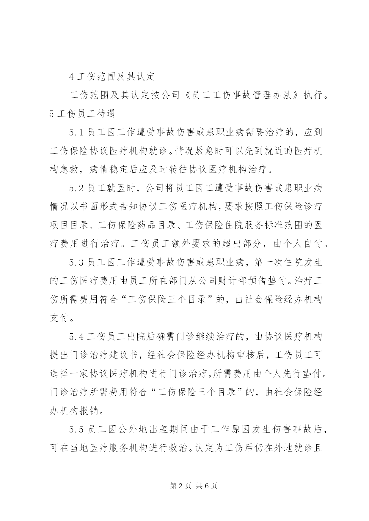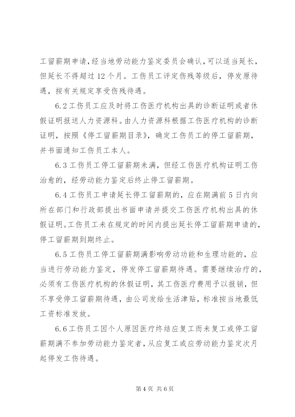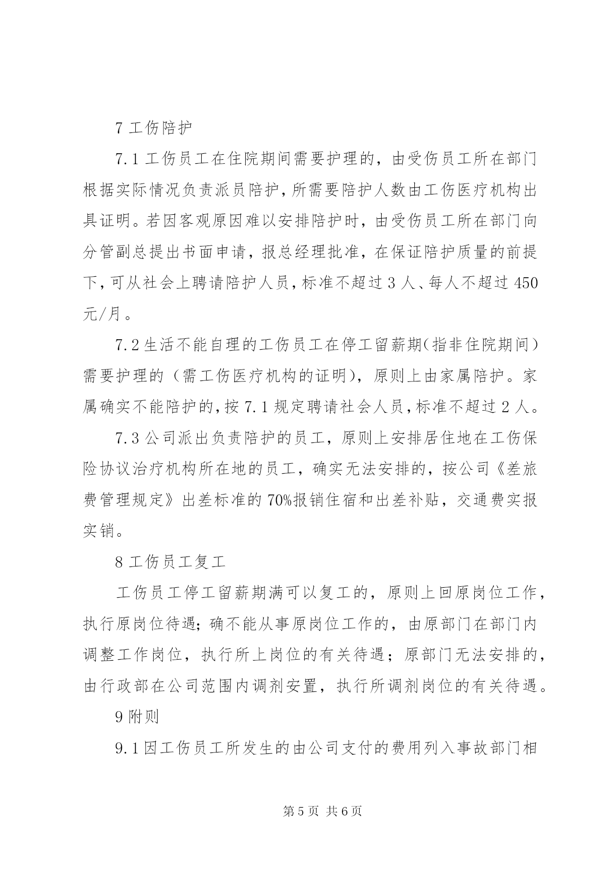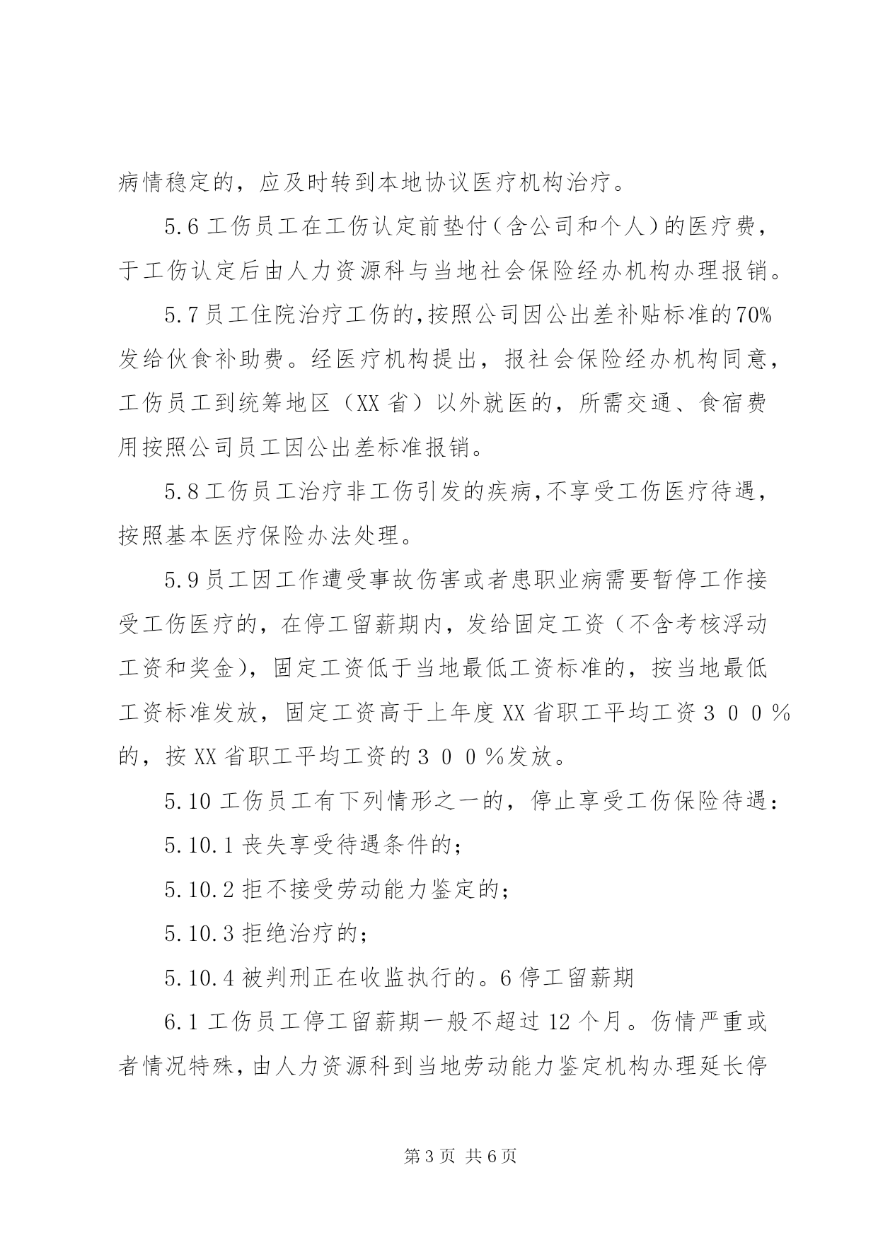 第PAGE\*Arabic\*MERGEFORMAT6页共NUMPAGES\*MERGEFORMAT6页工伤保险管理办法工伤保险暂行管理办法1范围针对员工因工遭受事故伤害或患职业病,治疗期间有关待遇制定本办法。本办法适用于公司因工遭受事故伤害或患职业病的员工。2原则2.1公司按照国家、省、当地的有关规定并结合公司实际,为员工办理工伤保险,必要时为员工办理商业团体意外保险。2.2商业团体意外保险作为工伤保险的补充,由公司支配。2.3工伤保险和商业团体意外保险有关待遇不重复享受。3部门职责3.1行政部人力资源科(下称人力资源科)负责公司员工各项工伤保险待遇的办理以及工伤医疗费的结算报销工作;负责定期组织公司工伤员工进行劳动能力鉴定。3.2安全环保科参与组织工伤发生后的救治工作,负责提供办理工伤认定和劳动能力鉴定所需的资料,负责对工伤事故进行调查、分析与处理。3.3事故责任部门和行政部医务室负责工伤员工救治工作。3.4行政部医务室负责建立因工作遭受事故伤害或者患职业病人员医疗管理档案,对停止工作接受工伤医疗职工的治疗方案、病情发展、治疗结果等情况进行跟踪调查。4工伤范围及其认定工伤范围及其认定按公司《员工工伤事故管理办法》执行。5工伤员工待遇5.1员工因工作遭受事故伤害或患职业病需要治疗的,应到工伤保险协议医疗机构就诊。情况紧急时可以先到就近的医疗机构急救,病情稳定后应及时转往协议医疗机构治疗。5.2员工就医时,公司将员工因工遭受事故伤害或患职业病情况以书面形式告知协议工伤医疗机构,要求按照工伤保险诊疗项目目录、工伤保险药品目录、工伤保险住院服务标准范围的医疗费用进行治疗。工伤员工额外要求的超出部分,由个人自付。5.3员工因工作遭受事故伤害或患职业病,第一次住院发生的工伤医疗费用由员工所在部门从公司财计部预借垫付。治疗工伤所需费用符合“工伤保险三个目录”的,由社会保险经办机构支付。5.4工伤员工出院后确需门诊继续治疗的,由协议医疗机构提出门诊治疗建议书,经社会保险经办机构审核后,工伤员工可选择一家协议医疗机构进行门诊治疗,所需费用由个人先行垫付。门诊治疗所需费用符合“工伤保险三个目录”的,由社会保险经办机构报销。5.5员工因公外地出差期间由于工作原因发生伤害事故后,可在当地医疗服务机构进行救治。认定为工伤后仍在外地就诊且病情稳定的,应及时转到本地协议医疗机构治疗。5.6工伤员工在工伤认定前垫付(含公司和个人)的医疗费,于工伤认定后由人力资源科与当地社会保险经办机构办理报销。5.7员工住院治疗工伤的,按照公司因公出差补贴标准的70%发给伙食补助费。经医疗机构提出,报社会保险经办机构同意,工伤员工到统筹地区(XX省)以外就医的,所需交通、食宿费用按照公司员工因公出差标准报销。5.8工伤员工治疗非工伤引发的疾病,不享受工伤医疗待遇,按照基本医疗保险办法处理。5.9员工因工作遭受事故伤害或者患职业病需要暂停工作接受工伤医疗的,在停工留薪期内,发给固定工资(不含考核浮动工资和奖金),固定工资低于当地最低工资标准的,按当地最低工资标准发放,固定工资高于上年度XX省职工平均工资300%的,按XX省职工平均工资的300%发放。5.10工伤员工有下列情形之一的,停止享受工伤保险待遇:5.10.1丧失享受待遇条件的;5.10.2拒不接受劳动能力鉴定的;5.10.3拒绝治疗的;5.10.4被判刑正在收监执行的。6停工留薪期6.1工伤员工停工留薪期一般不超过12个月。伤情严重或者情况特殊,由人力资源科到当地劳动能力鉴定机构办理延长停工留薪期申请,经当地劳动能力鉴定委员会确认,可以适当延长,但延长不得超过12个月。工伤员工评定伤残等级后,停发原待遇,按有关规定享受伤残待遇。6.2工伤员工应及时将工伤医疗机构出具的诊断证明或者休假证明报送人力资源科。由人力资源科根据工伤医疗机构的诊断证明,按照《停工留薪期目录》,确定工伤员工的停工留薪期,并书面通知工伤员工本人。6.3工伤员工停工留薪期未满,但经工伤医疗机构证明工伤治愈的,经劳动能力鉴定后终止停工留薪期。6.4工伤员工申请延长停工留薪期的,应在期满前5日内向所在部门和行政部提出书面申请并提交工伤医疗机构出具的休假证明。工伤员工未在规定的时间内提出延长停工留薪期申请的,停工留薪期到期终止。6.5工伤员工停工留薪期满影响劳动功能和生理功能的,应当进行劳动能力鉴定,停发停工留薪期待遇。需要继续治疗的,必须有工伤医疗机构的休假证明,其工伤医疗费用予以报销,但不享受停工留薪期待遇,由公司发给生活津贴,标准按当地最低工资标准发放。6.6工伤员工因个人原因医疗终结应复工而未复工或停工留薪期满不参加劳动能力鉴定者,从应复工或应劳动能力鉴定次月起停发工伤待遇。7工伤陪护7.1工伤员工在住院期间需要护理的