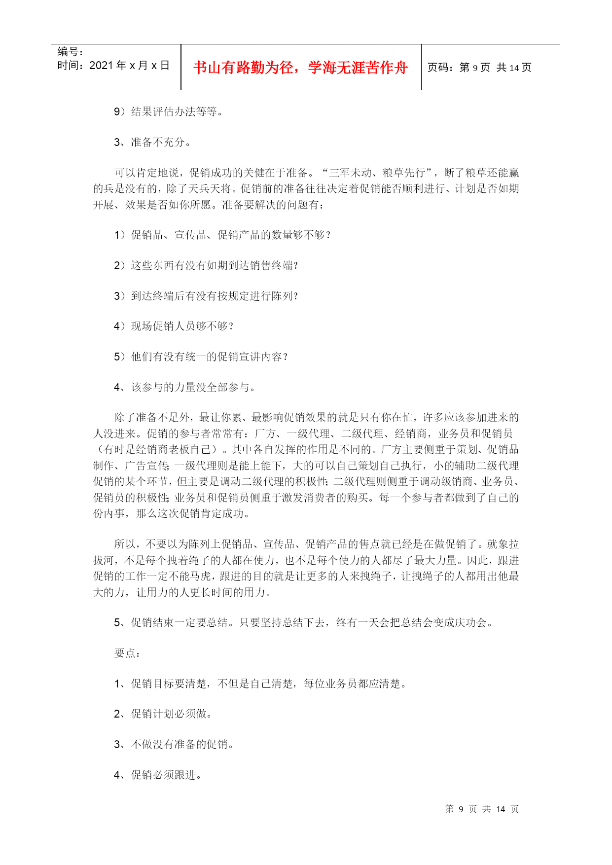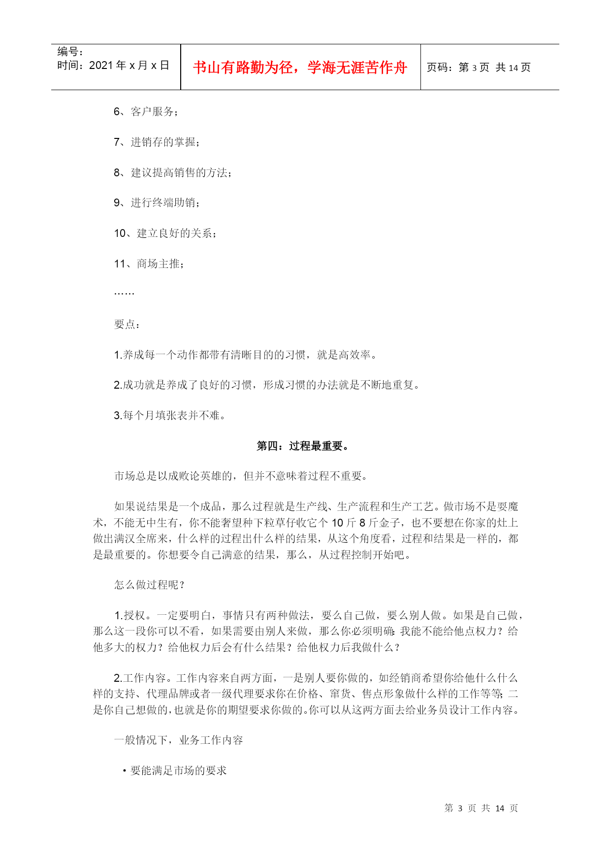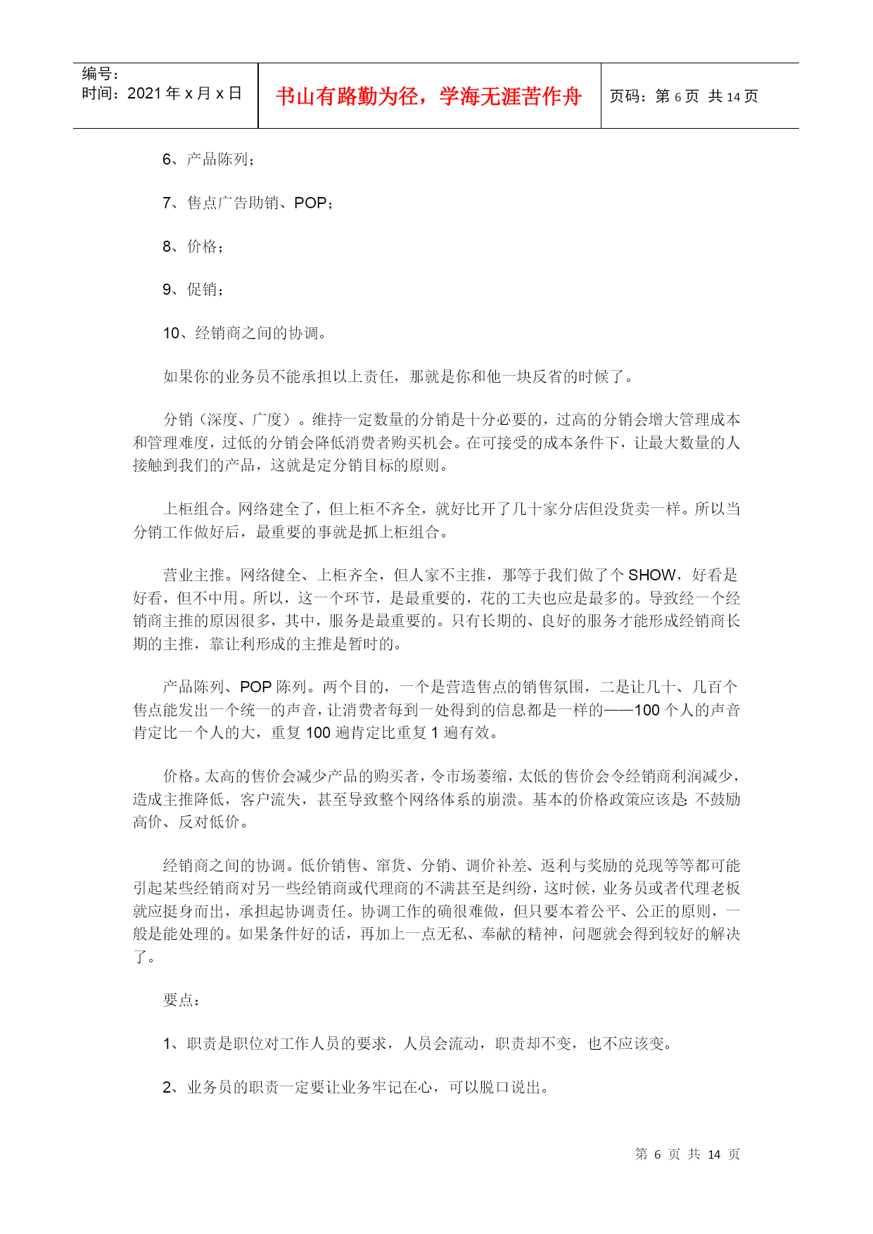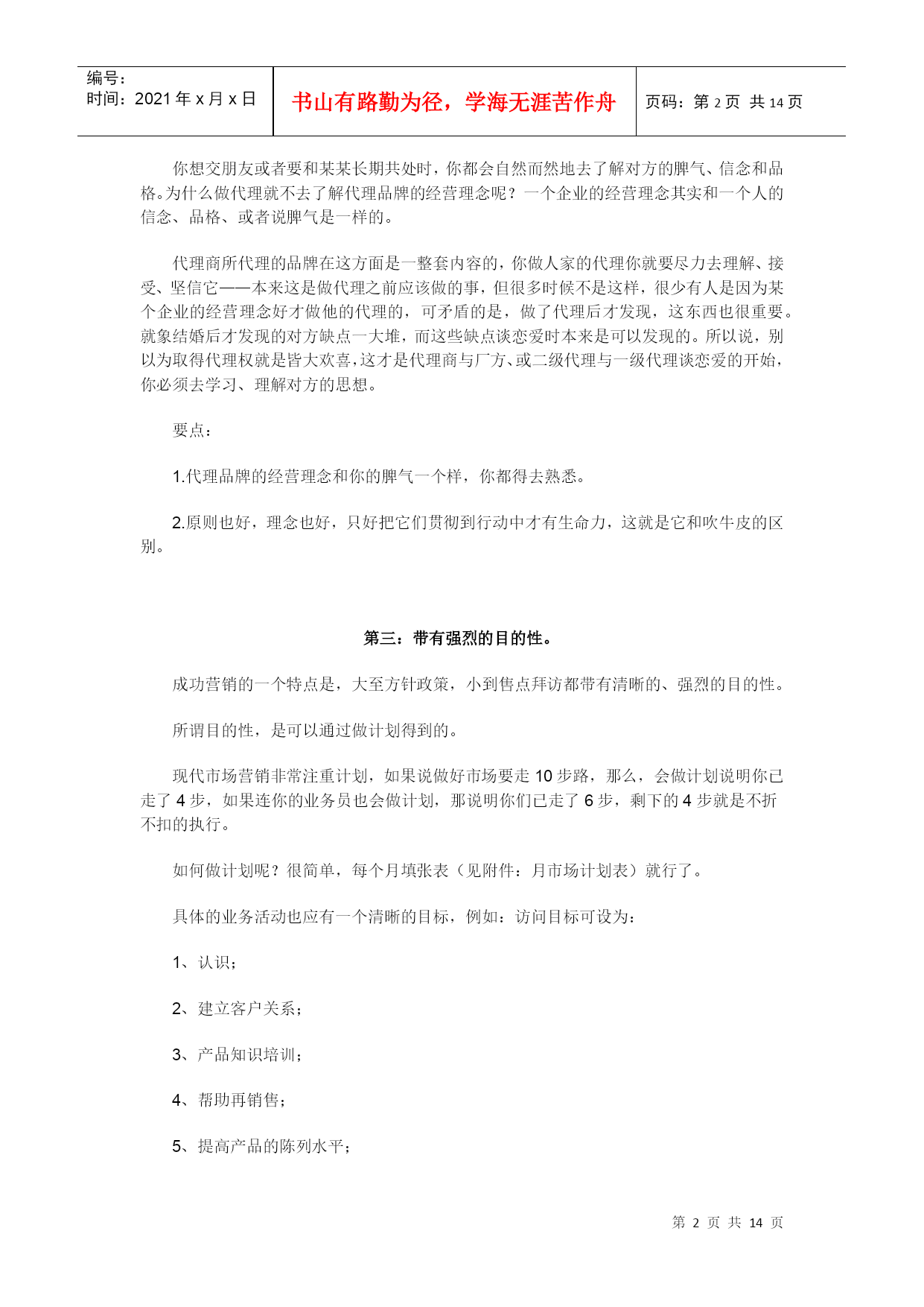 编号:时间:2021年x月x日书山有路勤为径,学海无涯苦作舟页码:第PAGE14页共NUMPAGES14页第PAGE\*MERGEFORMAT14页共NUMPAGES\*MERGEFORMAT14页优秀代理商的基本功目录市场是你的孩子HYPERLINK"xxemktxx/article/52/5273-2.html"要学习代理品牌的经营理念HYPERLINK"xxemktxx/article/52/5273-3.html"带有强烈的目的性HYPERLINK"xxemktxx/article/52/5273-4.html"过程最重要HYPERLINK"xxemktxx/article/52/5273-5.html"会总结的人才是聪明人HYPERLINK"xxemktxx/article/52/5273-6.html"业务员的职责HYPERLINK"xxemktxx/article/52/5273-7.html"工作流程HYPERLINK"xxemktxx/article/52/5273-8.html"促销HYPERLINK"xxemktxx/article/52/5273-9.html"关注竞争品牌HYPERLINK"xxemktxx/article/52/5273-10.html"沟通制度化有的人做代理好象只做两件事:搞定代理权、送货收款。如果做市场只是送货收款,那就和养孩子只是管吃管住一个样——孩子不是喂大的,而是养大的。所谓养,就是你要爱他,关心他,教育他,引导他。父母都关心孩子的体质,代理商则应该关心所辖市场的健康。让市场健康的方法很多,其中不乏高招,但我觉得,有些基本功是不得不练的。这些基本功可以分为两种,一种是虚的,讲究观念、观点的树立与提高;一种是实的,讲究具体操作的高效率、规范化、专业性。有心的代理应该从虚实两方面去进行自我提高、自我发展。第一:市场是你的孩子。你可以对代理什么品牌进行选择,但对市场你是没得选的,你最大的财富、最大的未来是你的市场。市场是就你的孩子。正如你看重的是某品牌的产品、服务,该品牌看重的归根结底却只有一点,就是你所在区域的市场。如果有一天你在你的区域市场上不再有优势,品牌可能就会移情别恋了。既然市场是你的孩子,就需要你去管他、爱他、呵护他。如果不管你的孩子,他会变成野孩子,打架(砸价)、闹事(窜货),甚至认他人为父。子不教、父之过,一切孩子的错,都是你的无能与愚蠢。要点:1.市场是你的——不是任何其它人的,自己的东西自己爱、自己的事情自己管,不要老是奢望别人(厂方、一级代理、)替你搞定什么什么,也别老是说要别人替你做了什么以后你才去做什么,这和别人给你钱后你才给自己的孩子衣服穿一个样,说不通。2.市场是你的孩子——怎么对待孩子,你不能不弄清楚,爱他但不溺爱他,疼他但要管他。第二:要学习代理品牌的经营理念。你想交朋友或者要和某某长期共处时,你都会自然而然地去了解对方的脾气、信念和品格。为什么做代理就不去了解代理品牌的经营理念呢?一个企业的经营理念其实和一个人的信念、品格、或者说脾气是一样的。代理商所代理的品牌在这方面是一整套内容的,你做人家的代理你就要尽力去理解、接受、坚信它——本来这是做代理之前应该做的事,但很多时候不是这样,很少有人是因为某个企业的经营理念好才做他的代理的,可矛盾的是,做了代理后才发现,这东西也很重要。就象结婚后才发现的对方缺点一大堆,而这些缺点谈恋爱时本来是可以发现的。所以说,别以为取得代理权就是皆大欢喜,这才是代理商与厂方、或二级代理与一级代理谈恋爱的开始,你必须去学习、理解对方的思想。要点:1.代理品牌的经营理念和你的脾气一个样,你都得去熟悉。2.原则也好,理念也好,只好把它们贯彻到行动中才有生命力,这就是它和吹牛皮的区别。第三:带有强烈的目的性。成功营销的一个特点是,大至方针政策,小到售点拜访都带有清晰的、强烈的目的性。所谓目的性,是可以通过做计划得到的。现代市场营销非常注重计划,如果说做好市场要走10步路,那么,会做计划说明你已走了4步,如果连你的业务员也会做计划,那说明你们已走了6步,剩下的4步就是不折不扣的执行。如何做计划呢?很简单,每个月填张表(见附件:月市场计划表)就行了。具体的业务活动也应有一个清晰的目标,例如:访问目标可设为:1、认识;2、建立客户关系;3、产品知识培训;4、帮助再销售;5、提高产品的陈列水平;6、客户服务;7、进销存的掌握;8、建议提高销售的方法;9、进行终端助销;10、建立良好的关系;11、商场主推;……要点:1.养成每一个动作都带有清晰目的的习惯,就是高效率。2.