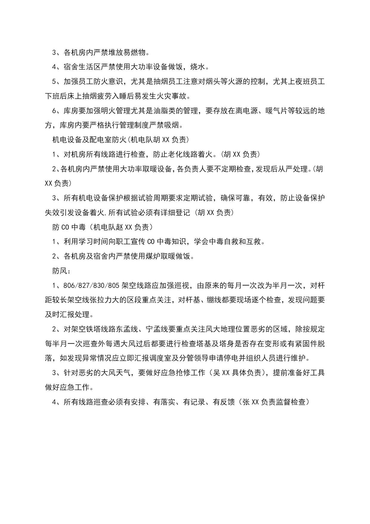 煤矿机电队冬季“四防”安全措施内容机电队冬季“四防”安全内容一、概述为了确保矿井安全过冬,保障职工安全生活,结合我矿实际情况,对我矿防寒防冻、防火、防CO中毒、防风工作进行安排部署。二、具体内容防寒防冻:主通风机房1、主通风机蝶阀加热器、稀有泵加热器可靠运行,温度低于20度时应加盖棉保温,防止蝶阀结冰和稀油泵油体冷凝。2、主通风机主体下方积水应及时清理防止结冰,备用风机内部应加强检查清理,防止风叶等部件出现结冰现象。3、机房内室要检查门窗密闭情况若有损坏应及时更换确保室内密闭良好4、李家山风机房值班人员要注意对生活用水管路的保护,防止水管冻裂,保证生活水正常供水。空压机房1、空压机储气罐室排污阀应用棉布包裹防止结冰无法开启,遇到受冻无法开启时严禁蛮力强制开启,必须用热水对排污阀浇灌加热待解冻后缓慢开启。2、检查沿途压风管路有无积水结冰现象,有的应及时将其清理,并用棉布包裹,防止冰体堆积堵塞或冻坏管理。3、空压机房内室要检查门窗密闭情况若有损坏应及时更换确保室内密闭良好生活防冻:(机电队赵XX负责)1、所有涉及供暖宿舍及场所,发现暖气管路破裂或暖气不能正常供暖,要及时上报机修车间。防火:日常防火1、对所有员工进行培训保证所有岗位人员都会正确使用灭火器2、各岗位场所必须配备数量足够、安全有效的灭火器、消防沙、消防斧、消防锹。3、各机房内严禁堆放易燃物。4、宿舍生活区严禁使用大功率设备做饭,烧水。5、加强员工防火意识,尤其是抽烟员工注意对烟头等火源的控制,尤其上夜班员工下班后床上抽烟疲劳入睡后易发生火灾事故。6、库房要加强明火管理尤其是油脂类的管理,要存放在离电源、暖气片等较远的地方,库房内要严格执行管理制度严禁吸烟。机电设备及配电室防火(机电队胡XX负责)1、对机房所有线路进行检查,防止老化线路着火。(胡XX负责)2、各机房内严禁使用大功率取暖设备,各负责人要不定期检查,发现后从严处理。(胡XX负责)3、所有机电设备保护根据试验周期要求定期试验,确保可靠,有效,防止设备保护失效引发设备着火,所有试验必须有详细登记(胡XX负责)防CO中毒(机电队赵XX负责)1、利用学习时间向职工宣传CO中毒知识,学会中毒自救和互救。2、各机房及宿舍内严禁使用煤炉取暖做饭。防风:1、806/827/830/805架空线路应加强巡视,由原来的每月一次改为半月一次,对杆距较长架空线张拉力大的区段重点关注,对杆基、绷线都要现场逐个检查,发现问题要及时汇报处理。2、对架空铁塔线路东孟线、宁孟线要重点关注风大地理位置恶劣的区域,除按规定每半月一次巡查外每遇大风过后都要进行检查塔基及塔身是否存在变形或有紧固件脱落,如发现异常情况应立即汇报调度室及分管领导申请停电并组织人员进行维护。3、针对恶劣的大风天气,要做好应急抢修工作(吴XX具体负责),提前准备好工具做好应急工作。4、所有线路巡查必须有安排、有落实、有记录、有反馈(张XX负责监督检查)