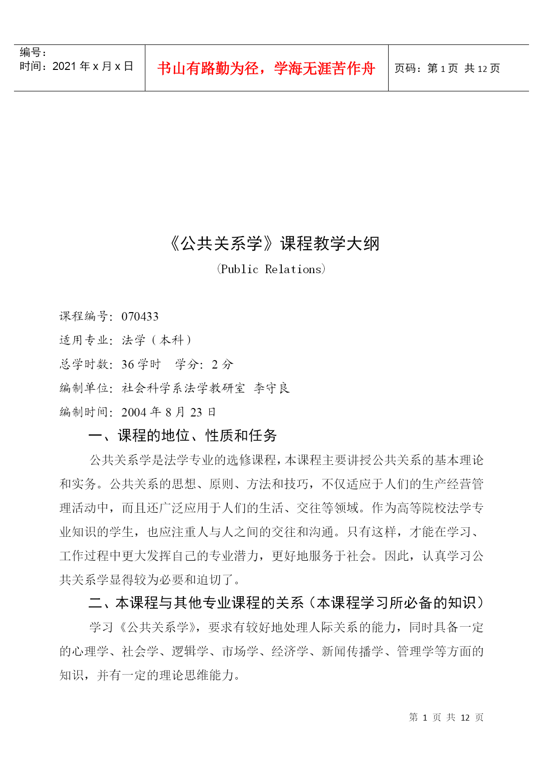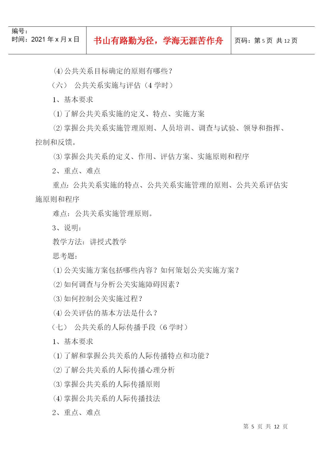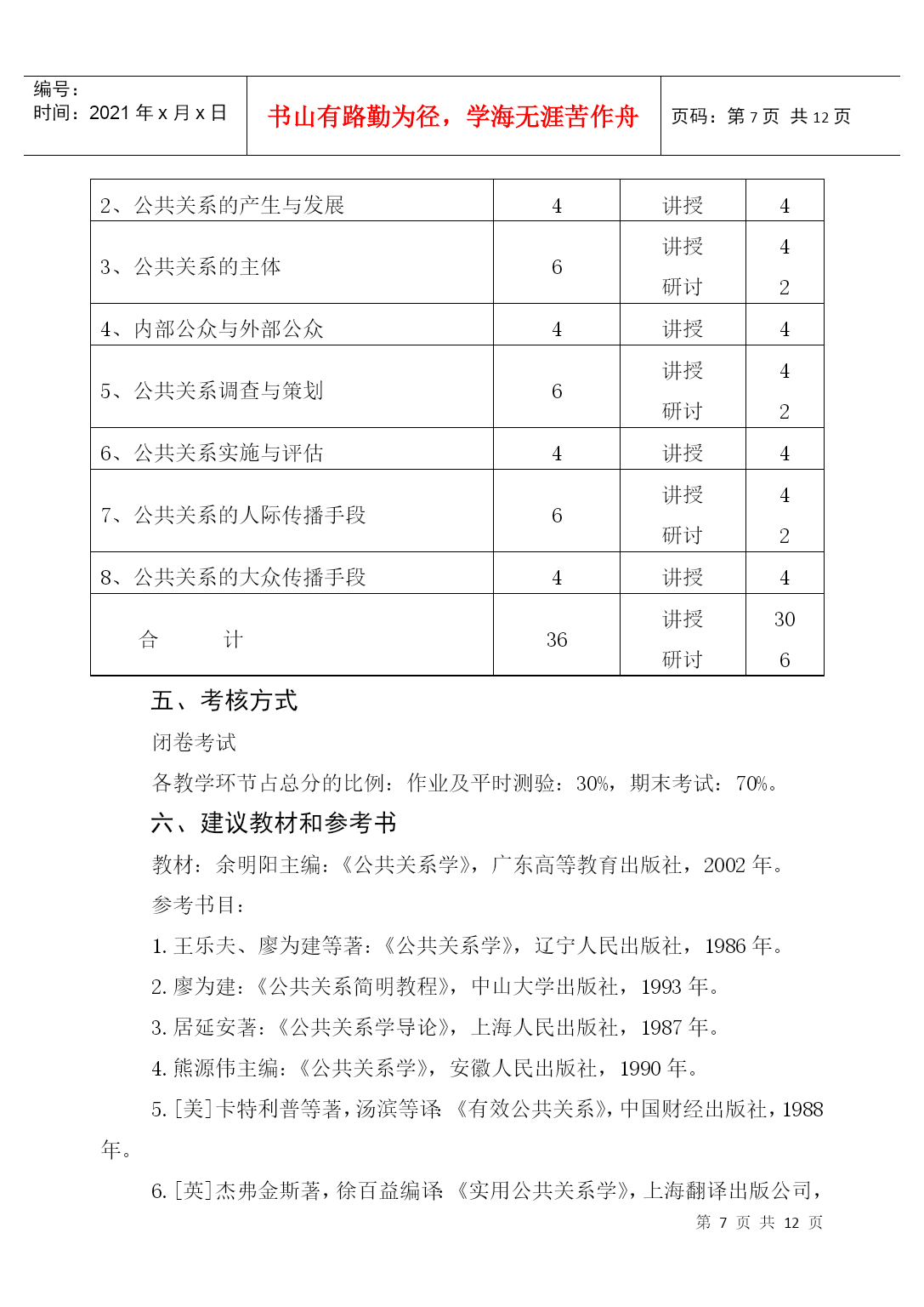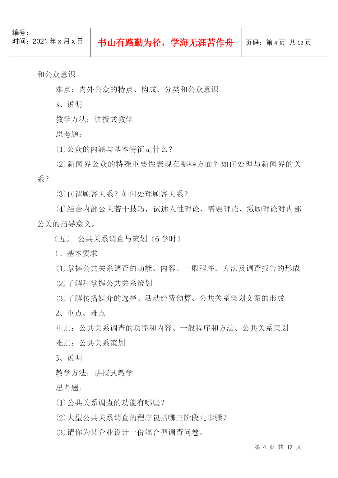 编号:时间:2021年x月x日书山有路勤为径,学海无涯苦作舟页码:第PAGE12页共NUMPAGES12页第PAGE\*MERGEFORMAT12页共NUMPAGES\*MERGEFORMAT12页HYPERLINK"xxxx/"《公共关系学》课程教学大纲(PublicRelations)课程编号:070433适用专业:法学(本科)总学时数:36学时学分:2分编制单位:社会科学系法学教研室李守良编制时间:2004年8月23日一、课程的地位、性质和任务公共关系学是法学专业的选修课程,本课程主要讲授公共关系的基本理论和实务。公共关系的思想、原则、方法和技巧,不仅适应于人们的生产经营管理活动中,而且还广泛应用于人们的生活、交往等领域。作为高等院校法学专业知识的学生,也应注重人与人之间的交往和沟通。只有这样,才能在学习、工作过程中更大发挥自己的专业潜力,更好地服务于社会。因此,认真学习公共关系学显得较为必要和迫切了。二、本课程与其他专业课程的关系(本课程学习所必备的知识)学习《公共关系学》,要求有较好地处理人际关系的能力,同时具备一定的心理学、社会学、逻辑学、市场学、经济学、新闻传播学、管理学等方面的知识,并有一定的理论思维能力。三、教学内容、学时安排和基本要求公共关系概述(2学时)1、基本要求(1)了解和掌握公共关系的涵义、构成要素和特征(2)了解公共关系的功能2、重点、难点重点:公共关系的涵义、构成要素和特征难点:公共关系的涵义。3、说明教学方法:讲授法教学思考题:(1)如何看待人们对公共关系涵义的争议?(2)为什么说组织形象是公共关系理论的核心概念?(3)公共关系三大构成要素之间的关系是什么?(1)试分析目前社会上对公共关系的曲解,误解及其原因。公共关系的产生与发展(4学时)1、基本要求(1)了解公共关系的起源和发展(2)了解和掌握公共关系兴起和发展的一般社会历史条件(3)了解现代公共关系和当代公共关系2、重点、难点重点:公共关系兴起和发展的一般社会历史条件难点:现代公共关系和当代公共关系3、说明:教学方法:讲授式教学思考题:(1)“报刊宣传”与“揭丑运动”对现代公共关系的产生有什么意义?(2)现代公共关系的不同发展阶段各有什么特点?(3)公共关系事业怎样迎接未来的挑战?公共关系的主体(6学时)1、基本要求(1)掌握公共关系主体的界定、分类和特征(2)了解和掌握公共关系主体的三种形式(3)了解和掌握公共关系从业人员的素质、培养、考核和管理2、重点、难点重点:公共关系主体的界定、分类和特征以及公共关系主体的三种形式难点:公共关系主体的三种形式3、说明:教学方法:讲授式、研讨式教学思考题:(1)什么是公共关系主体?它有哪些特征?(2)比较公共关系部与公共关系公司各自的优势和不足。(3)如何理解公共关系部的地位和职能?内部公众与外部公众(4学时)1、基本要求(1)掌握公众的内涵、特征、地位和分类(2)了解和掌握内外公众的特点、构成、分类、公众意见以及内外部公众的具体公关实务。2、重点、难点重点:公众的内涵、特征、地位和分类以及内外公众的特点、构成、分类和公众意识难点:内外公众的特点、构成、分类和公众意识3、说明教学方法:讲授式教学思考题:(1)公众的内涵与基本特征是什么?(2)新闻界公众的特殊重要性表现在哪些方面?如何处理与新闻界的关系?(3)何谓顾客关系?如何处理顾客关系?(4)结合内部公关若干技巧,试述人性理论、需要理论、激励理论对内部公关的指导意义。公共关系调查与策划(6学时)1、基本要求(1)掌握公共关系调查的功能、内容、一般程序、方法及调查报告的形成(2)了解和掌握公共关系策划(3)了解传播媒介的选择、活动经费预算、公共关系策划文案的形成2、重点、难点重点:公共关系调查的功能和内容、一般程序和方法、公共关系策划难点:公共关系策划3、说明教学方法:讲授式教学思考题:(1)公共关系调查的功能有哪些?(2)大型公共关系调查的程序包括哪三阶段九步骤?(3)请你为某企业设计一份混合型调查问卷。(4)公共关系目标确定的原则有哪些?公共关系实施与评估(4学时)1、基本要求(1)了解公共关系实施的定义、特点、实施方案(2)掌握公共关系实施管理原则、人员培训、调查与试验、领导和指挥、控制和反馈。(3)掌握公共关系的定义、作用、评估方案、实施原则和程序2、重点、难点重点:公共关系实施的特点、公共关系实施管理的原则、公共关系评估实施原则和程序难点:公共关系实施管理原则。3、说明:教学方法:讲授式教学思考题:(