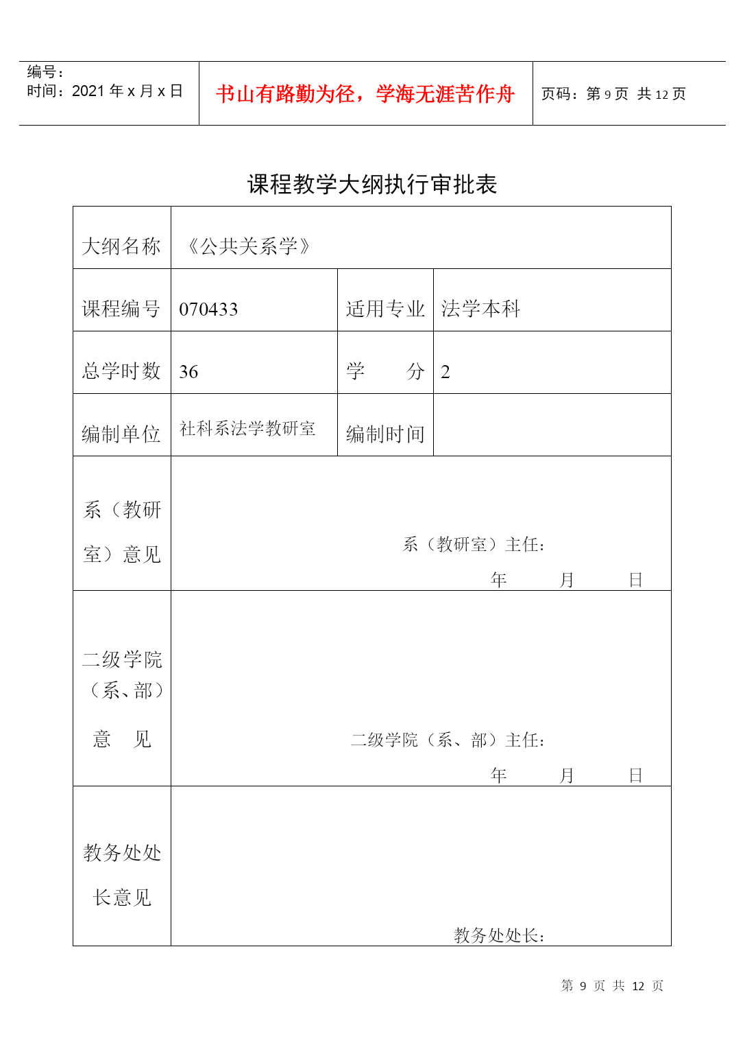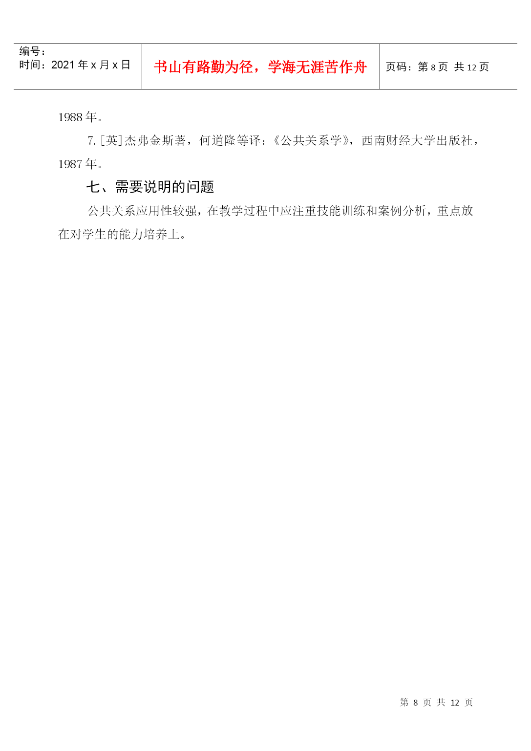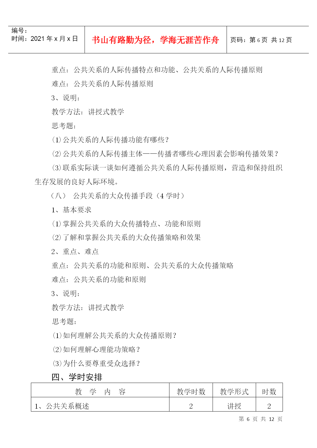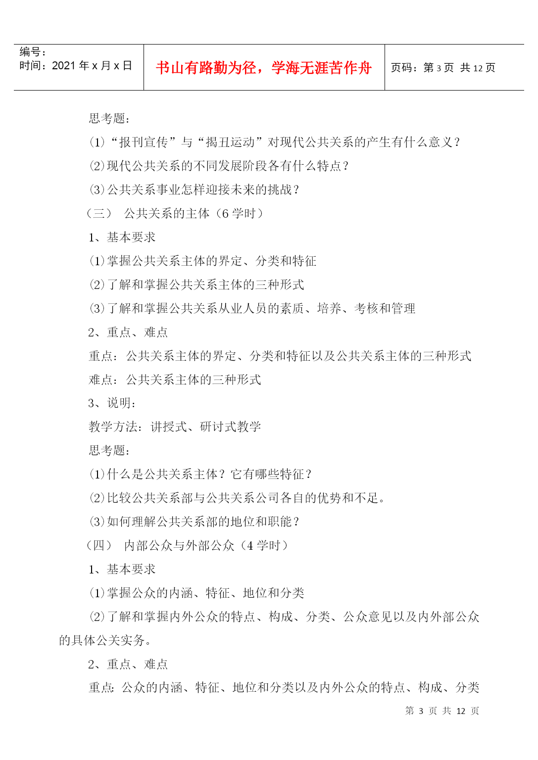 编号:时间:2021年x月x日书山有路勤为径,学海无涯苦作舟页码:第PAGE12页共NUMPAGES12页第PAGE\*MERGEFORMAT12页共NUMPAGES\*MERGEFORMAT12页HYPERLINK"xxxx/"《公共关系学》课程教学大纲(PublicRelations)课程编号:070433适用专业:法学(本科)总学时数:36学时学分:2分编制单位:社会科学系法学教研室李守良编制时间:2004年8月23日一、课程的地位、性质和任务公共关系学是法学专业的选修课程,本课程主要讲授公共关系的基本理论和实务。公共关系的思想、原则、方法和技巧,不仅适应于人们的生产经营管理活动中,而且还广泛应用于人们的生活、交往等领域。作为高等院校法学专业知识的学生,也应注重人与人之间的交往和沟通。只有这样,才能在学习、工作过程中更大发挥自己的专业潜力,更好地服务于社会。因此,认真学习公共关系学显得较为必要和迫切了。二、本课程与其他专业课程的关系(本课程学习所必备的知识)学习《公共关系学》,要求有较好地处理人际关系的能力,同时具备一定的心理学、社会学、逻辑学、市场学、经济学、新闻传播学、管理学等方面的知识,并有一定的理论思维能力。三、教学内容、学时安排和基本要求公共关系概述(2学时)1、基本要求(1)了解和掌握公共关系的涵义、构成要素和特征(2)了解公共关系的功能2、重点、难点重点:公共关系的涵义、构成要素和特征难点:公共关系的涵义。3、说明教学方法:讲授法教学思考题:(1)如何看待人们对公共关系涵义的争议?(2)为什么说组织形象是公共关系理论的核心概念?(3)公共关系三大构成要素之间的关系是什么?(1)试分析目前社会上对公共关系的曲解,误解及其原因。公共关系的产生与发展(4学时)1、基本要求(1)了解公共关系的起源和发展(2)了解和掌握公共关系兴起和发展的一般社会历史条件(3)了解现代公共关系和当代公共关系2、重点、难点重点:公共关系兴起和发展的一般社会历史条件难点:现代公共关系和当代公共关系3、说明:教学方法:讲授式教学思考题:(1)“报刊宣传”与“揭丑运动”对现代公共关系的产生有什么意义?(2)现代公共关系的不同发展阶段各有什么特点?(3)公共关系事业怎样迎接未来的挑战?公共关系的主体(6学时)1、基本要求(1)掌握公共关系主体的界定、分类和特征(2)了解和掌握公共关系主体的三种形式(3)了解和掌握公共关系从业人员的素质、培养、考核和管理2、重点、难点重点:公共关系主体的界定、分类和特征以及公共关系主体的三种形式难点:公共关系主体的三种形式3、说明:教学方法:讲授式、研讨式教学思考题:(1)什么是公共关系主体?它有哪些特征?(2)比较公共关系部与公共关系公司各自的优势和不足。(3)如何理解公共关系部的地位和职能?内部公众与外部公众(4学时)1、基本要求(1)掌握公众的内涵、特征、地位和分类(2)了解和掌握内外公众的特点、构成、分类、公众意见以及内外部公众的具体公关实务。2、重点、难点重点:公众的内涵、特征、地位和分类以及内外公众的特点、构成、分类和公众意识难点:内外公众的特点、构成、分类和公众意识3、说明教学方法:讲授式教学思考题:(1)公众的内涵与基本特征是什么?(2)新闻界公众的特殊重要性表现在哪些方面?如何处理与新闻界的关系?(3)何谓顾客关系?如何处理顾客关系?(4)结合内部公关若干技巧,试述人性理论、需要理论、激励理论对内部公关的指导意义。公共关系调查与策划(6学时)1、基本要求(1)掌握公共关系调查的功能、内容、一般程序、方法及调查报告的形成(2)了解和掌握公共关系策划(3)了解传播媒介的选择、活动经费预算、公共关系策划文案的形成2、重点、难点重点:公共关系调查的功能和内容、一般程序和方法、公共关系策划难点:公共关系策划3、说明教学方法:讲授式教学思考题:(1)公共关系调查的功能有哪些?(2)大型公共关系调查的程序包括哪三阶段九步骤?(3)请你为某企业设计一份混合型调查问卷。(4)公共关系目标确定的原则有哪些?公共关系实施与评估(4学时)1、基本要求(1)了解公共关系实施的定义、特点、实施方案(2)掌握公共关系实施管理原则、人员培训、调查与试验、领导和指挥、控制和反馈。(3)掌握公共关系的定义、作用、评估方案、实施原则和程序2、重点、难点重点:公共关系实施的特点、公共关系实施管理的原则、公共关系评估实施原则和程序难点:公共关系实施管理原则。3、说明:教学方法:讲授式教学思考题:(
